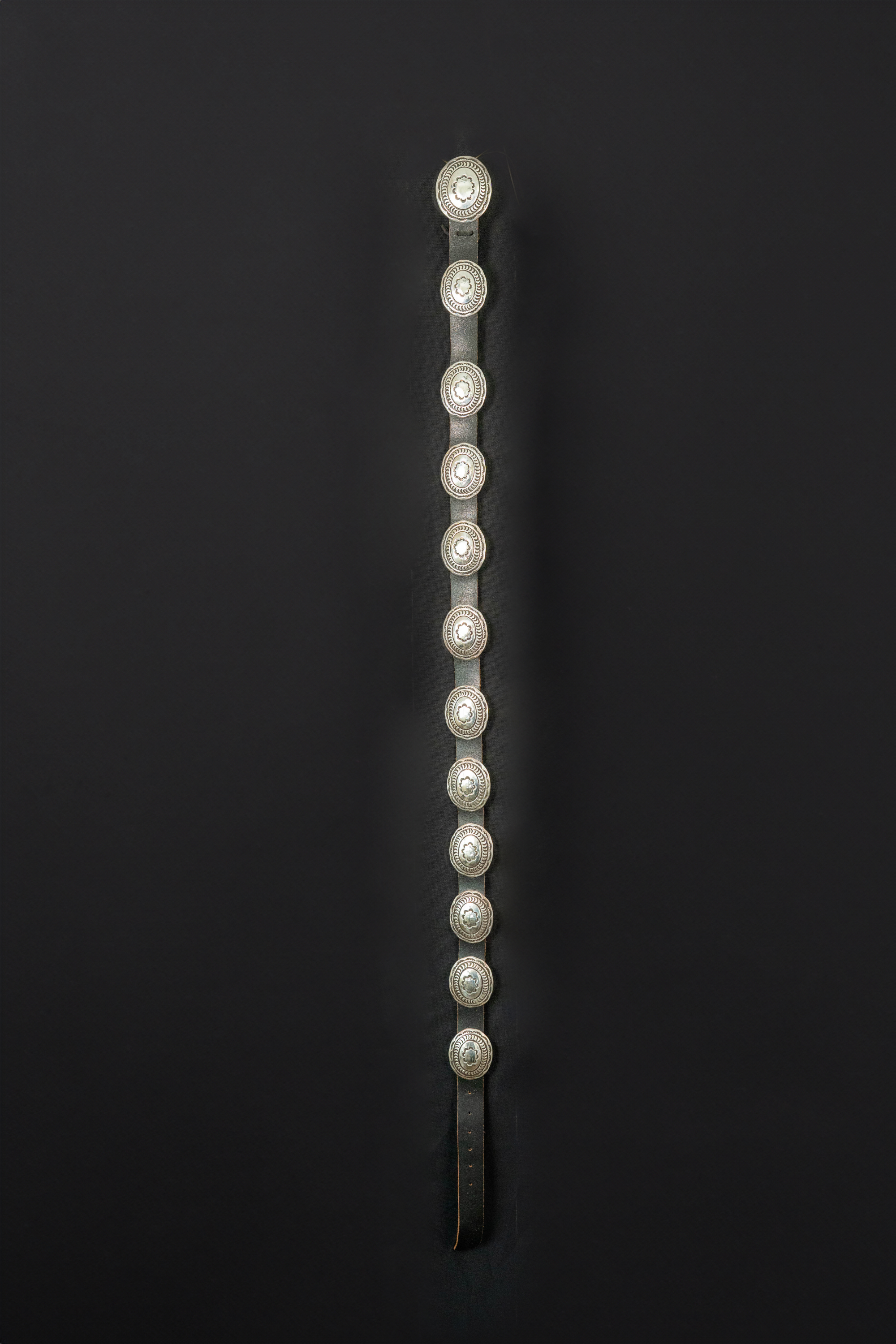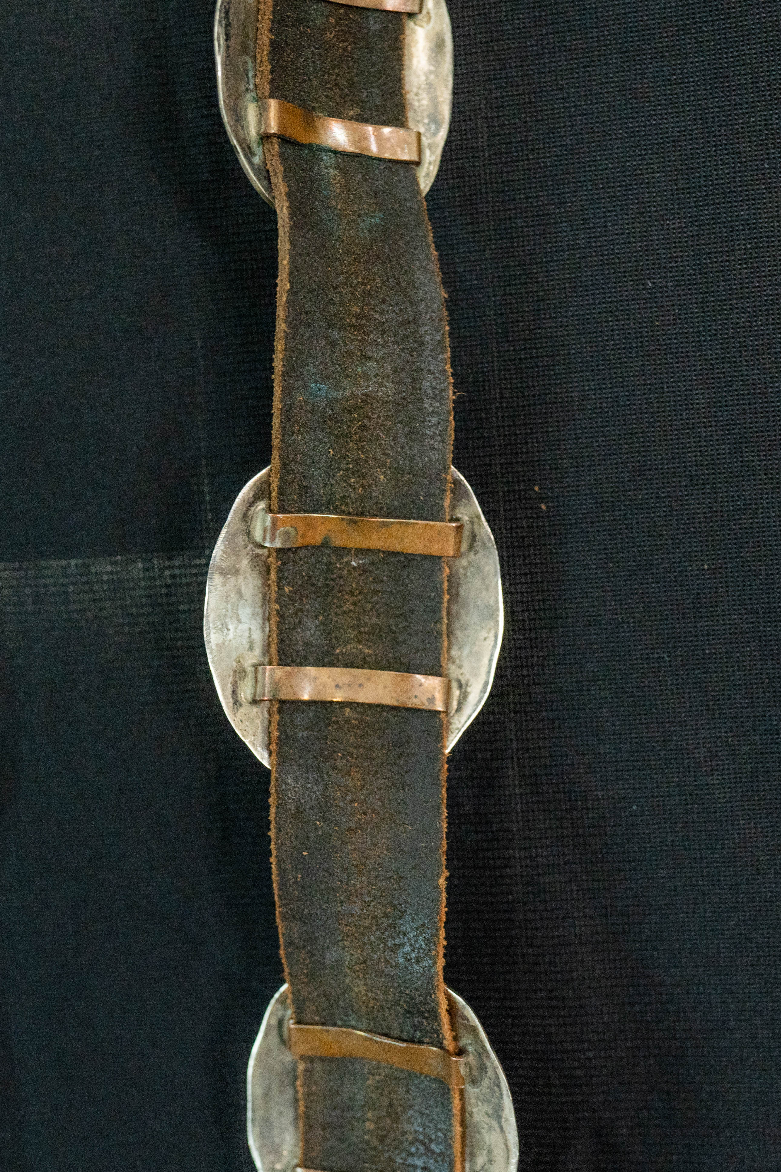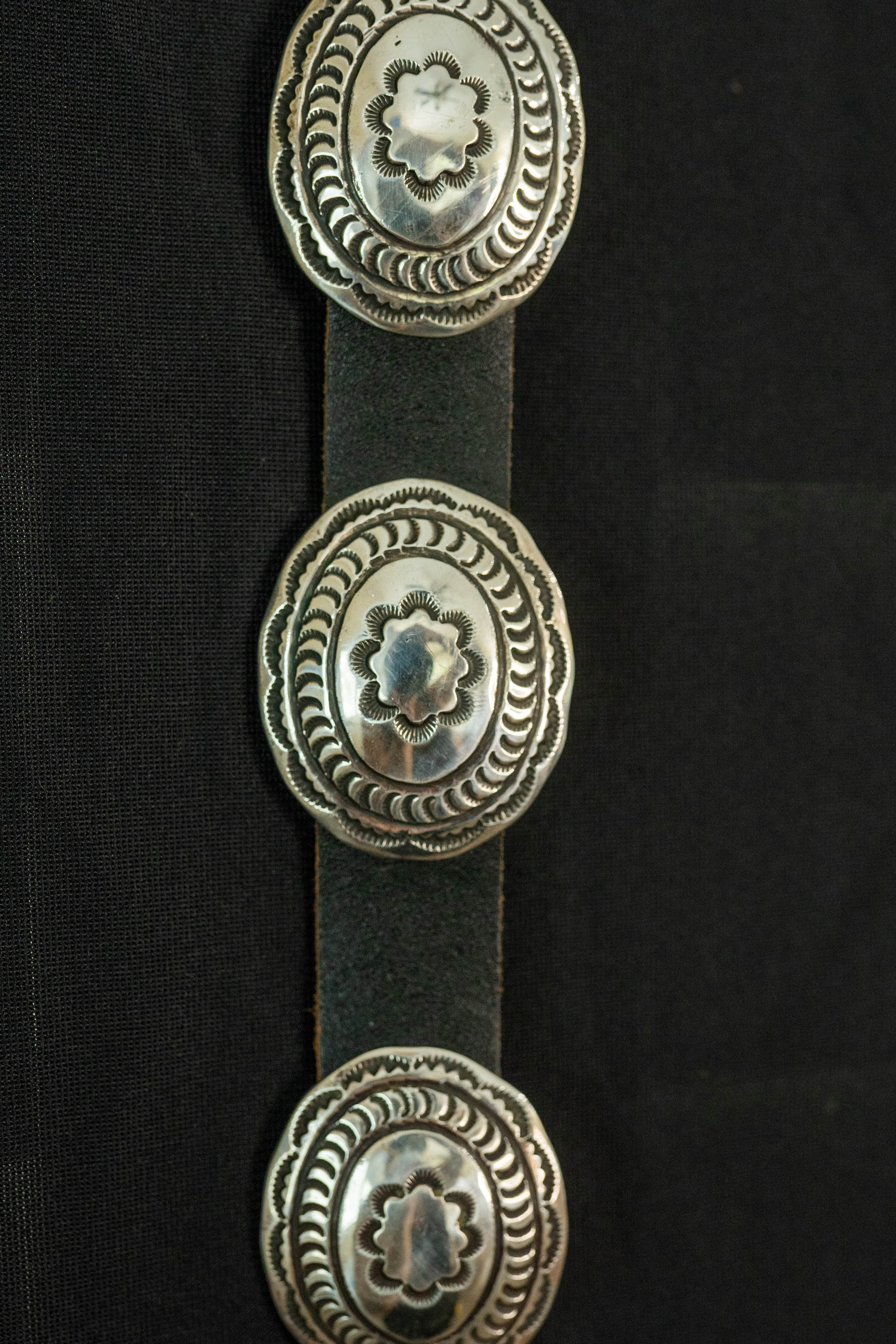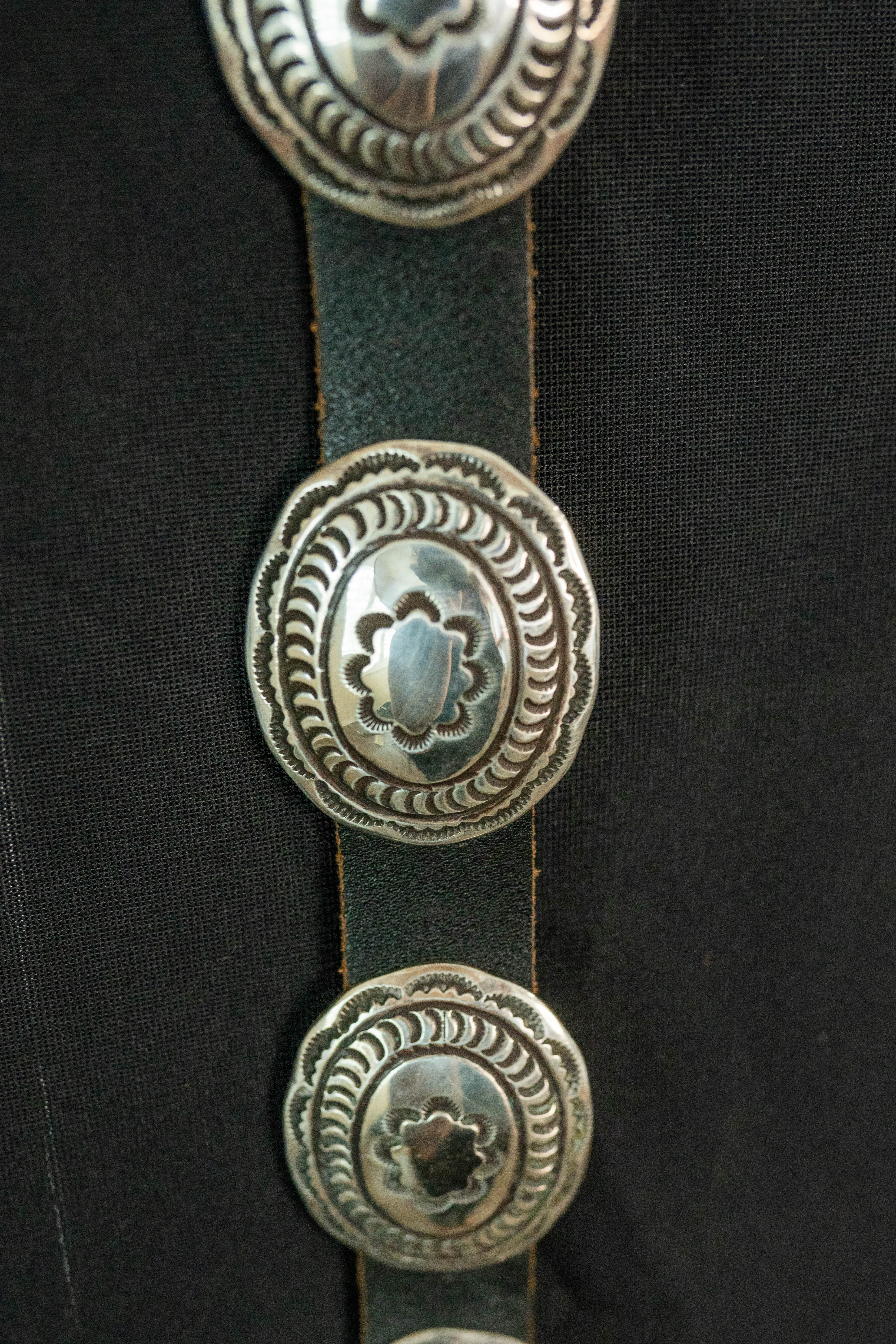 Native American Navajo vintage circa 1960 Stunning Sterling Silver Concho Belt with (11) Concho’s and (1) Belt buckle hand tooled hand carved handstanped on a black leather strap with natural patina OAL 44″ Conchos measure L 1 3/4″ x 2″ Buckle measures L 2″ x 2 3/8″ w 298 g