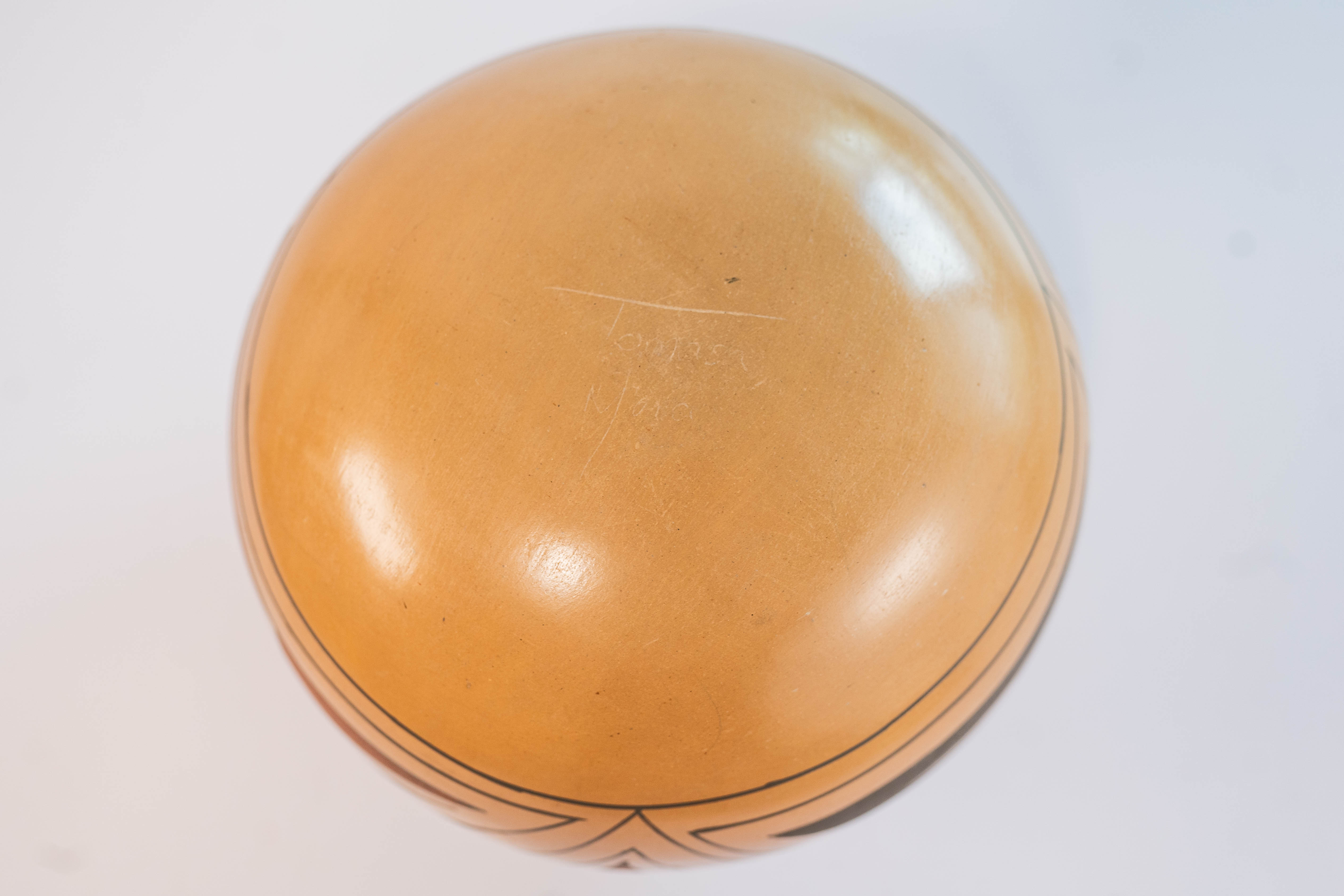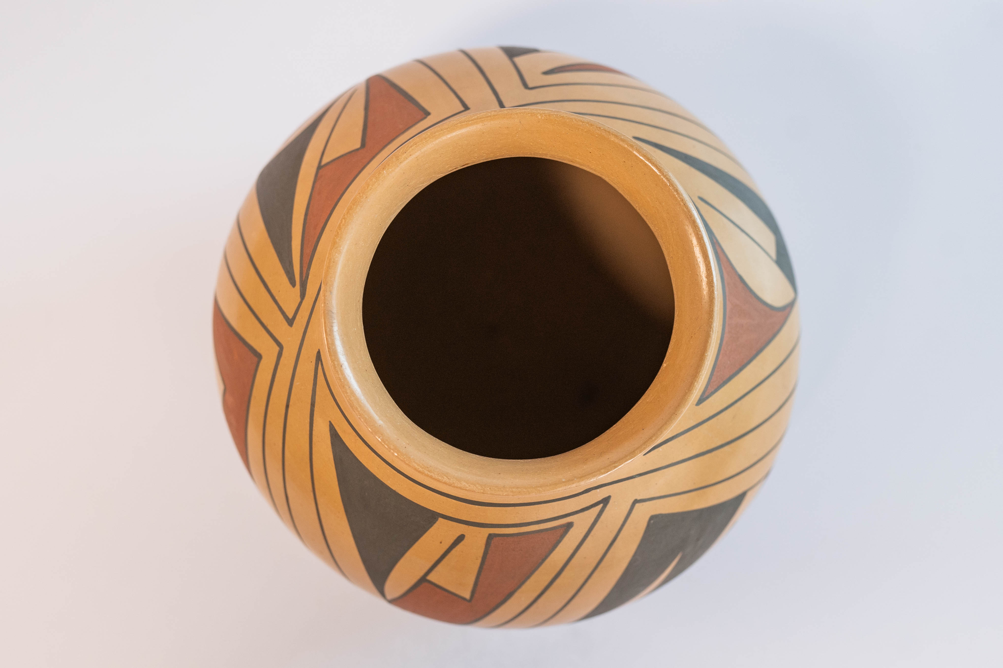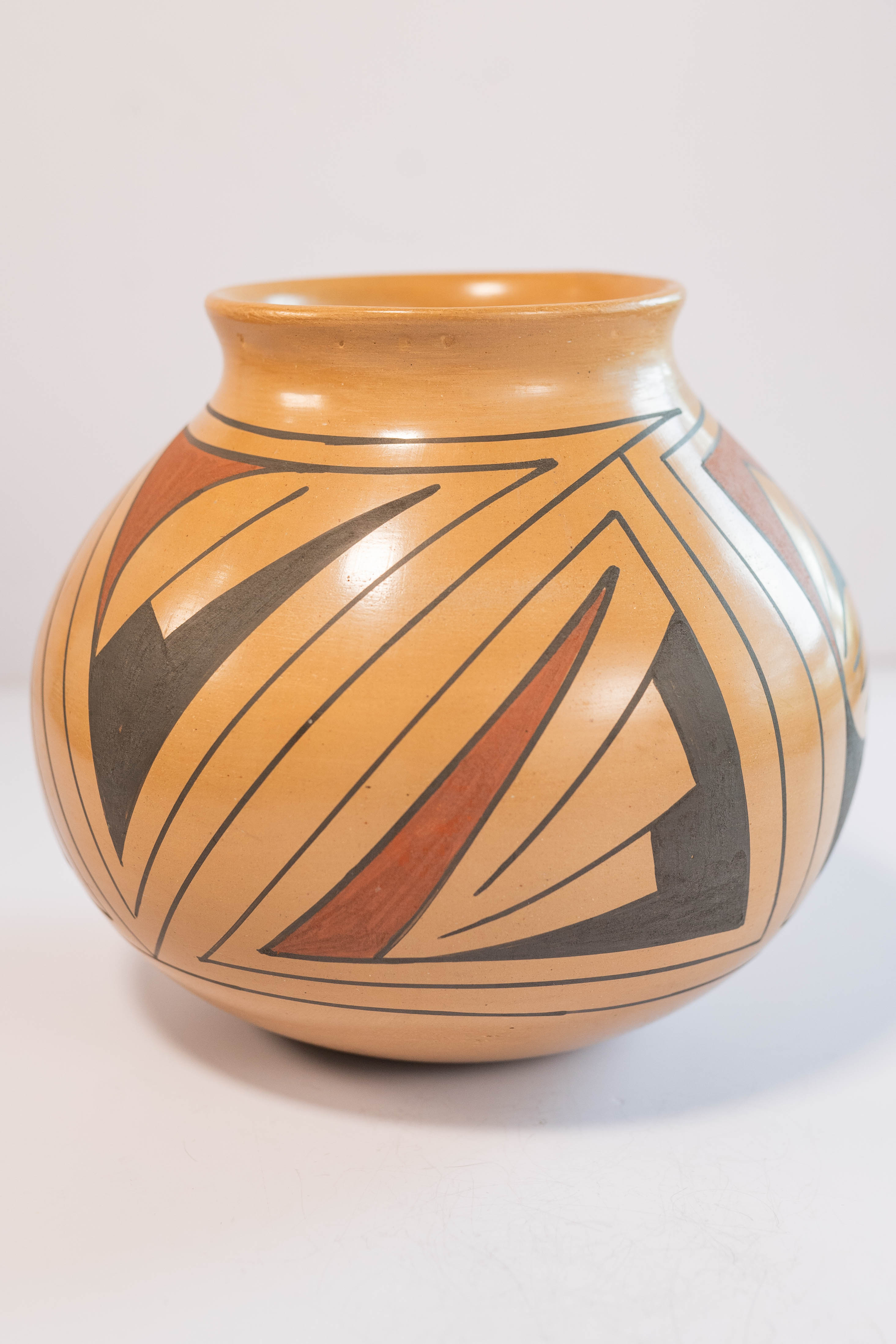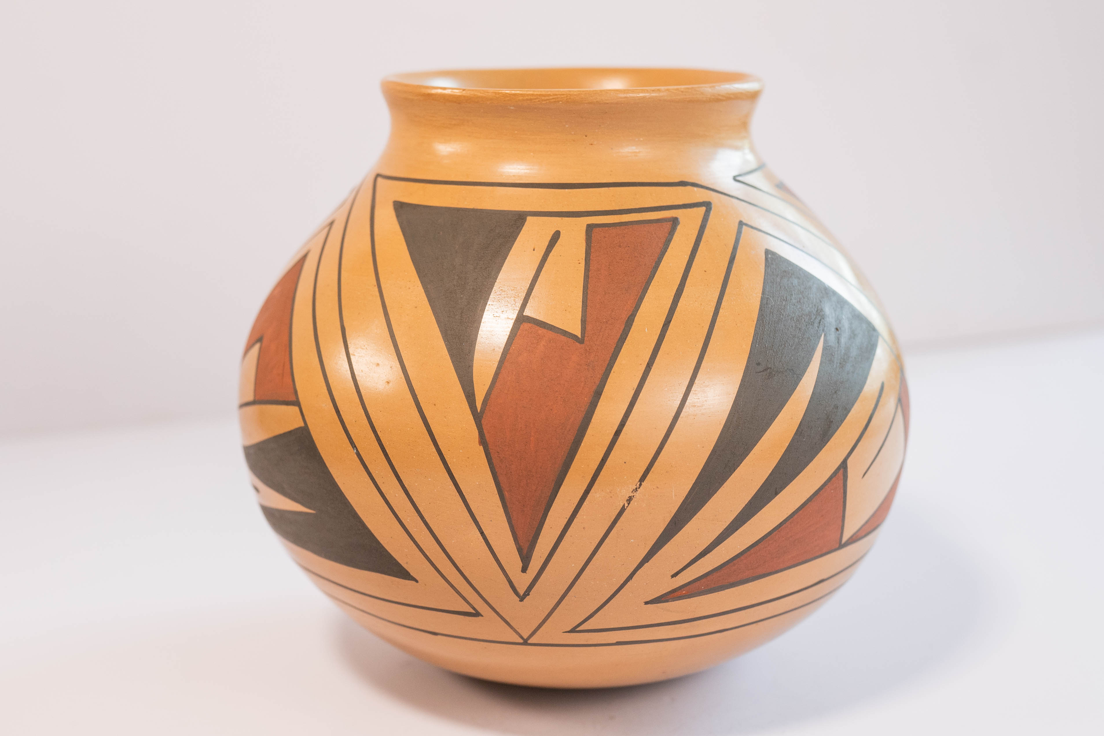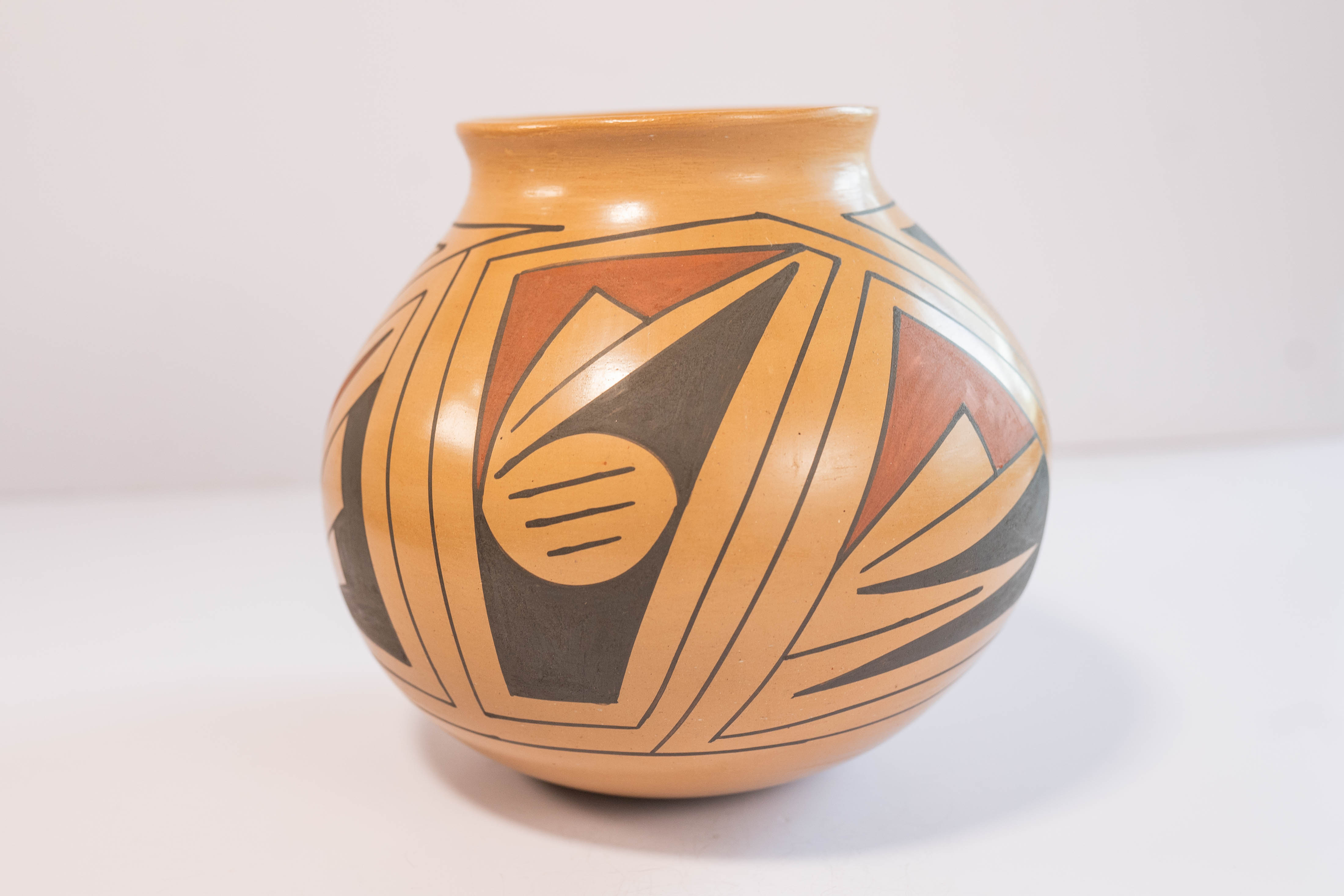 Native American Hopi Beautiful vintage hand coiled hand-painted rounded bottom pot, height 5 inch diameter 19 and 7/8 inch.