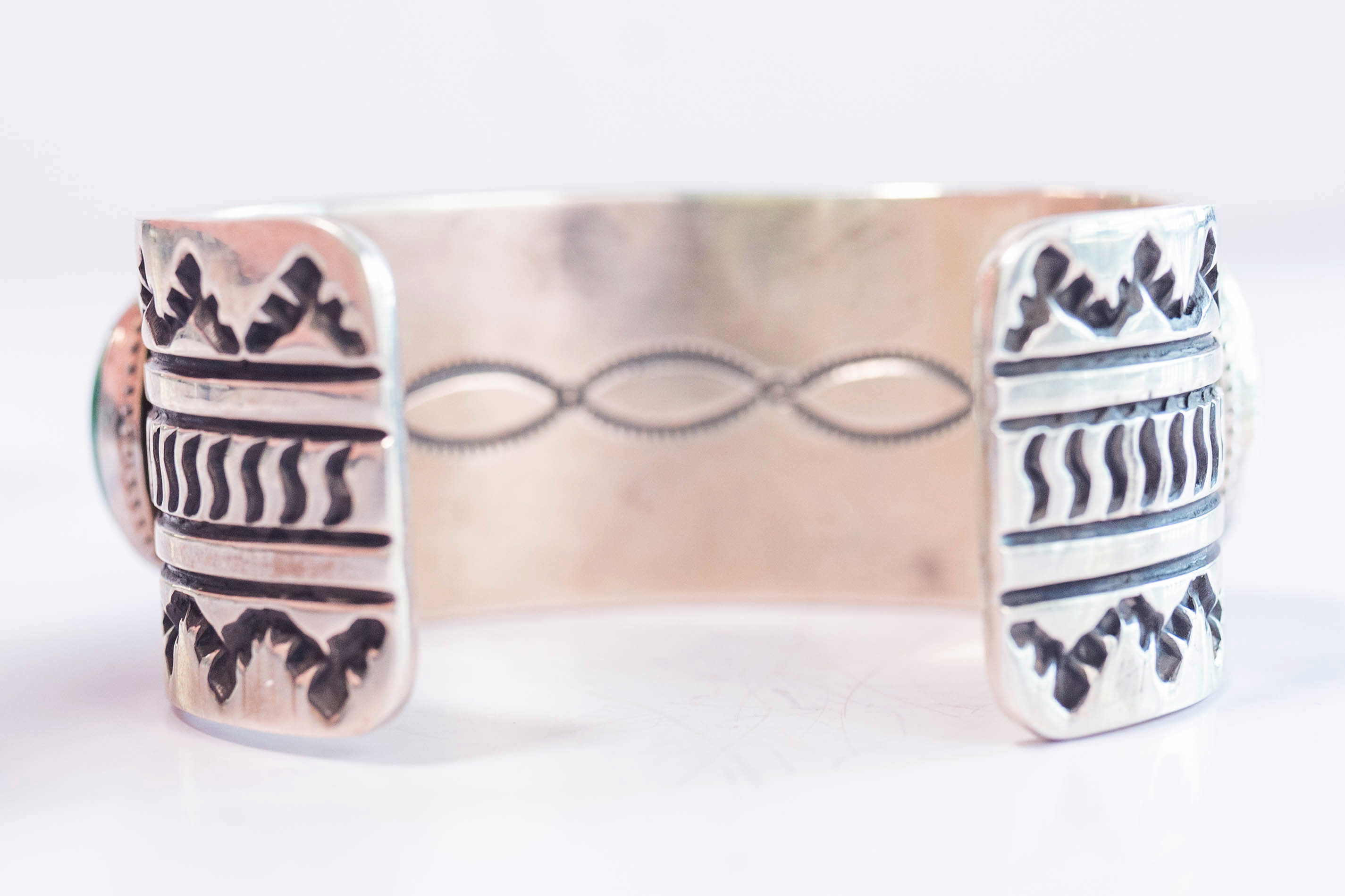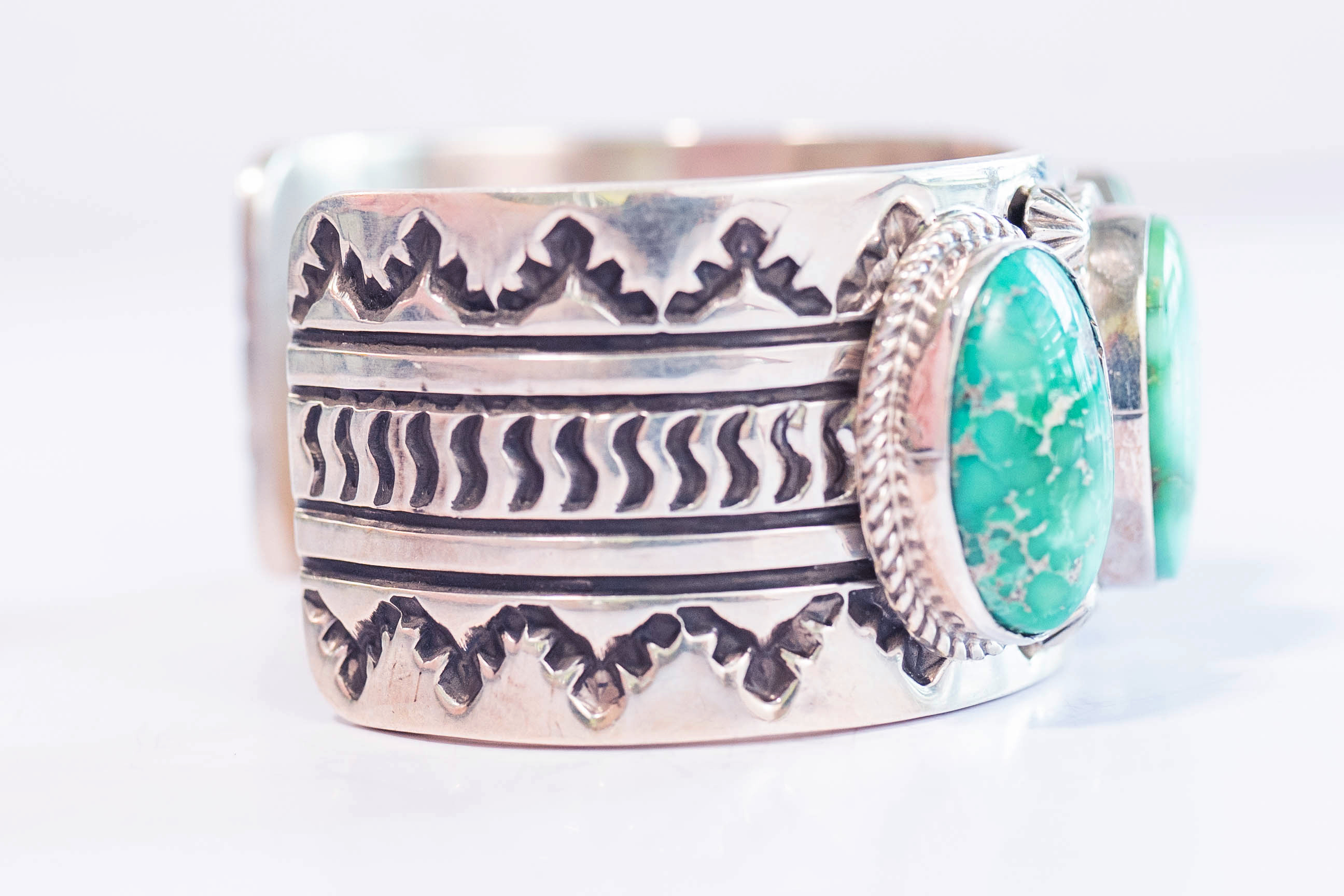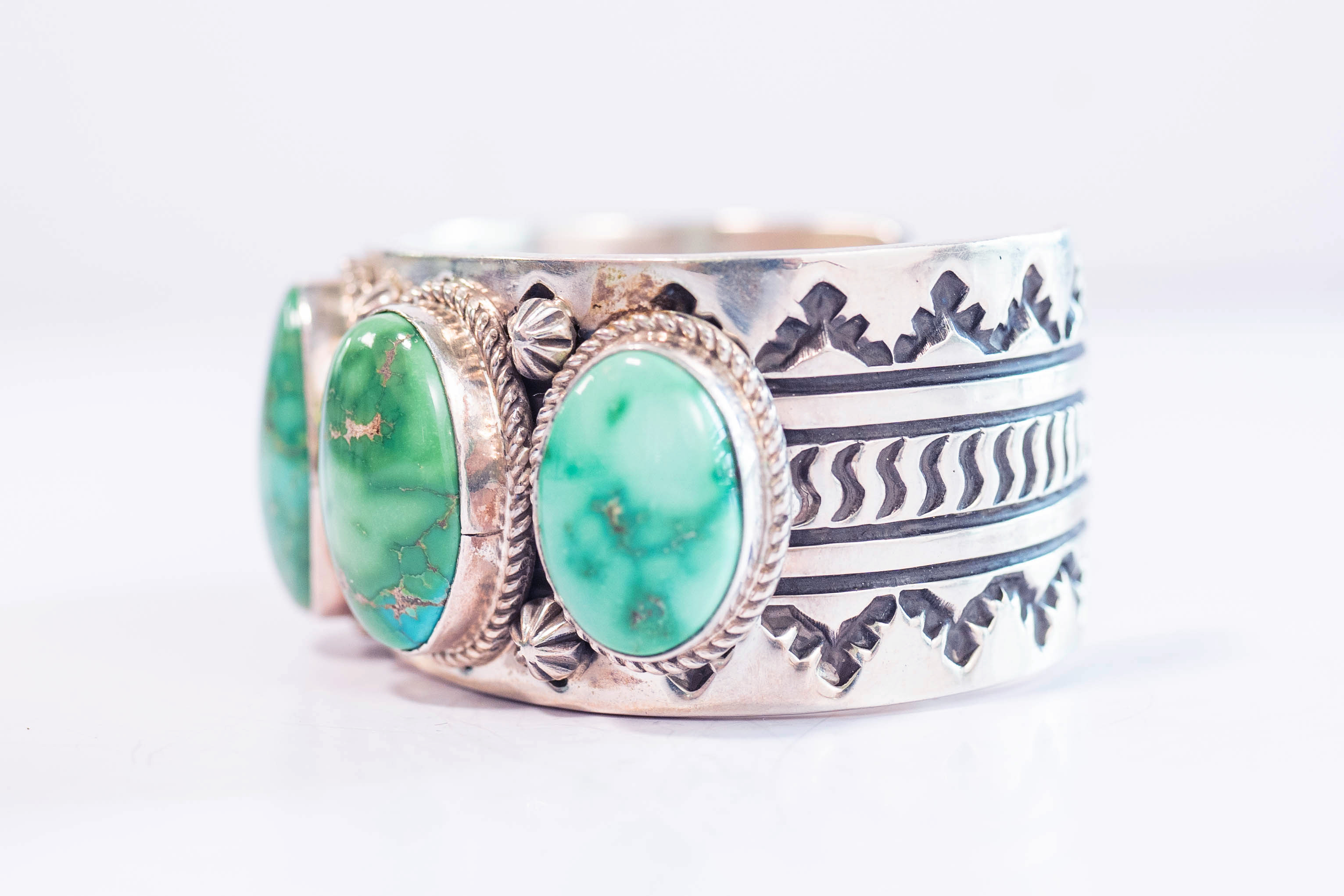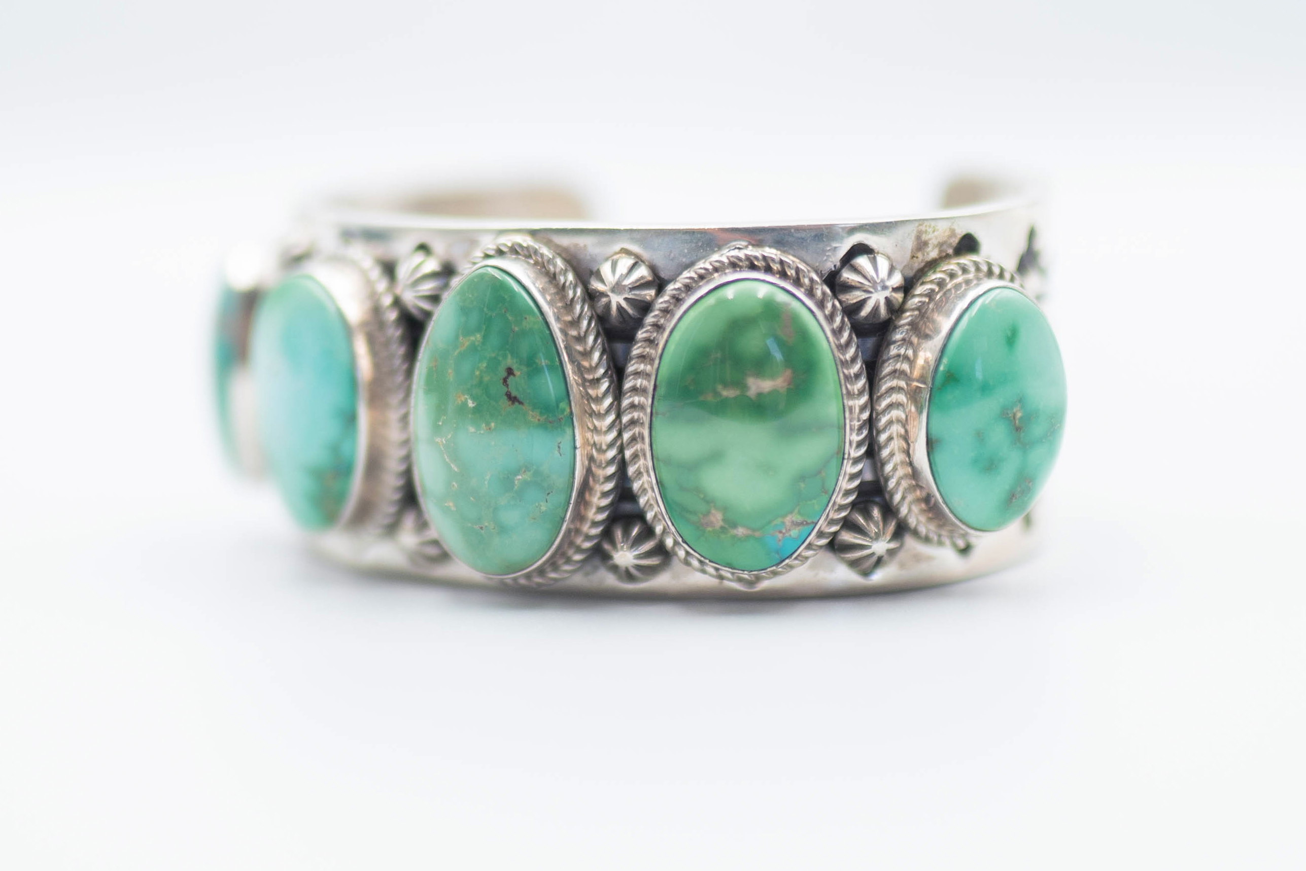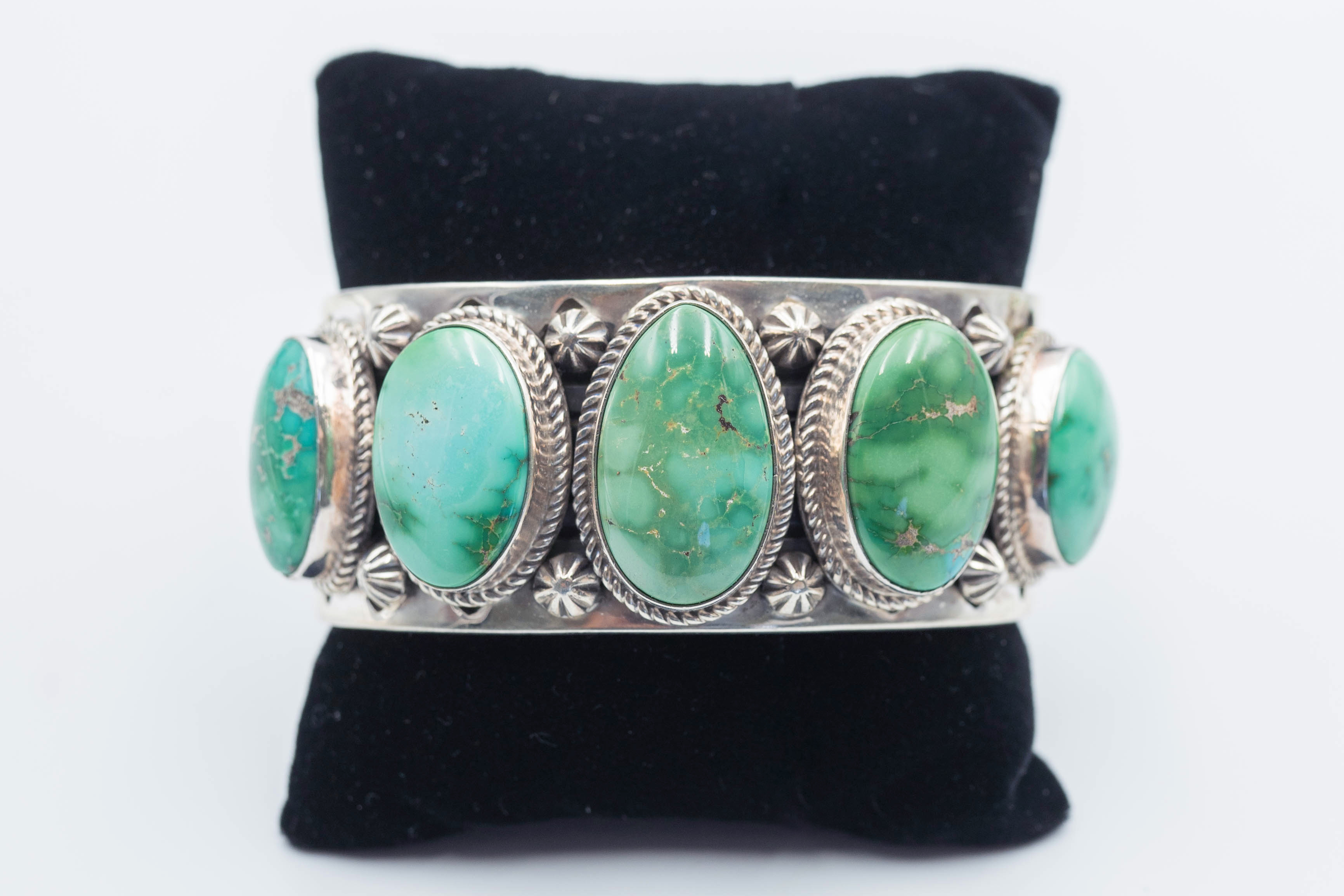 Delbert Delgarito Master Silversmith Native American Navajo sterling silver Sonoran gold Turquoise cuff bracelet with (5) oval gemstones with a beautiful light green hue with gold matrix set in twisted wire bezel settings with star appliques and hand stamped design. Size 7″ Width 1 3/8″ Gap 1 3/8 gemstones range from 7/8″ to 1 1/8″ Signed D. Delgarito 159gr