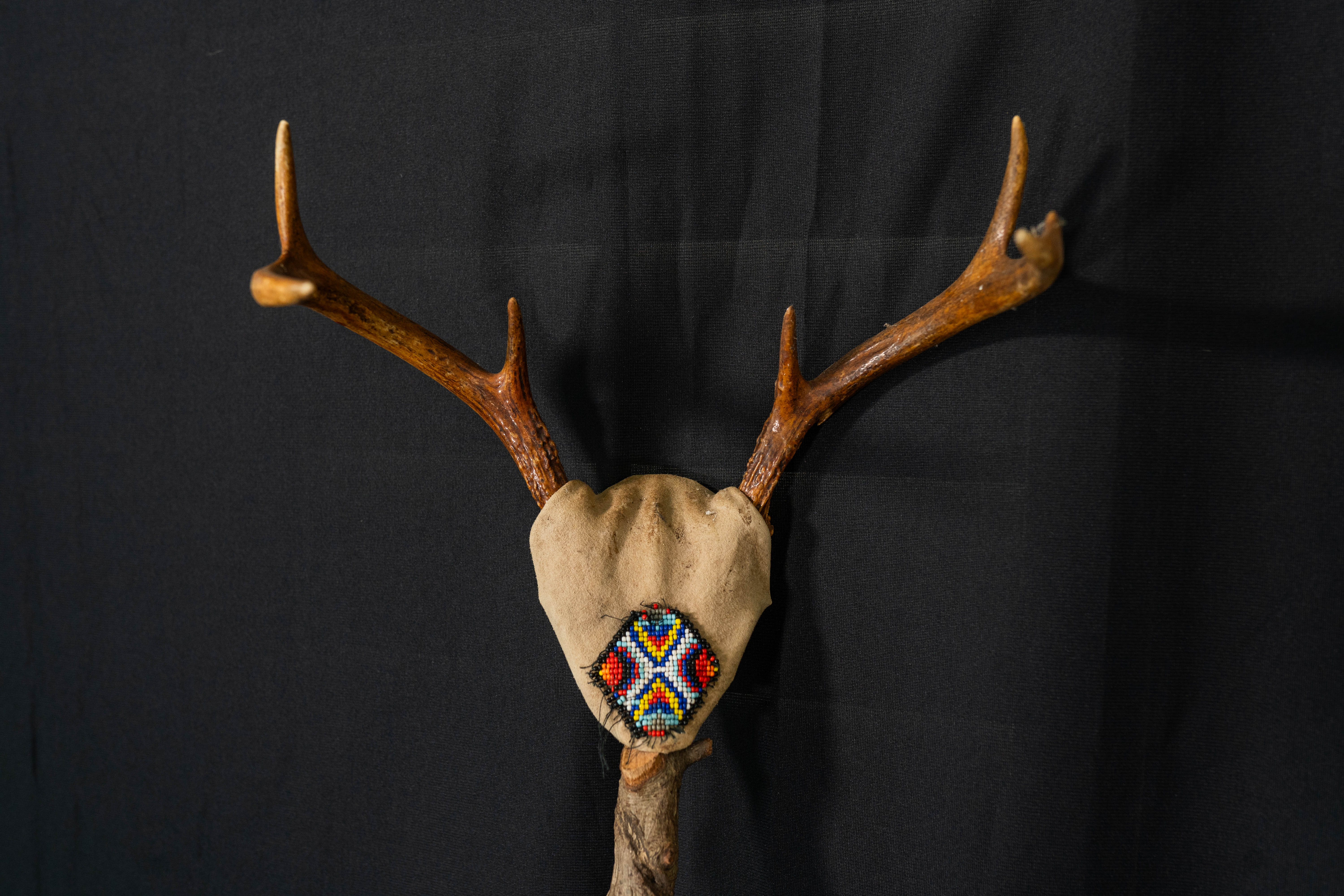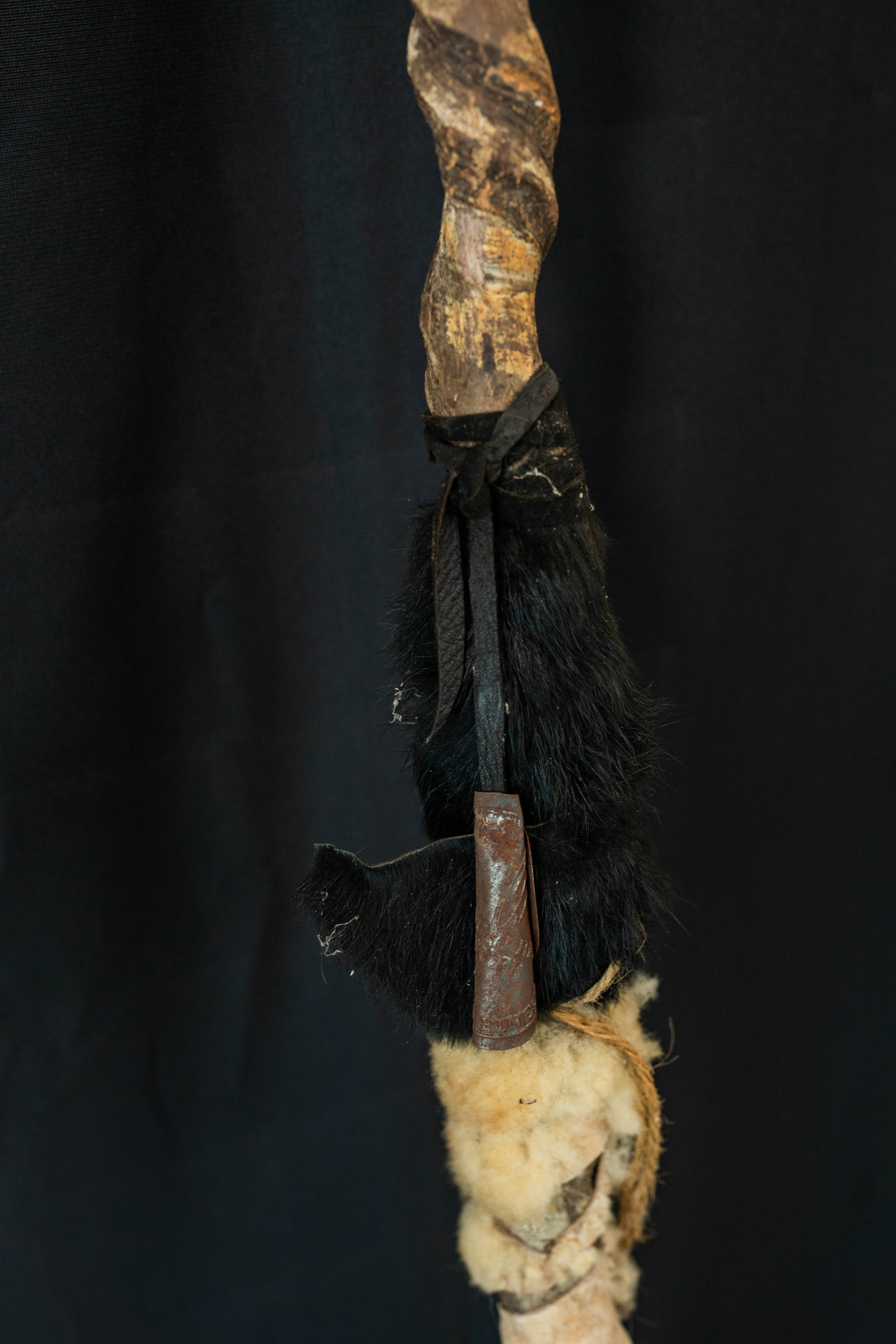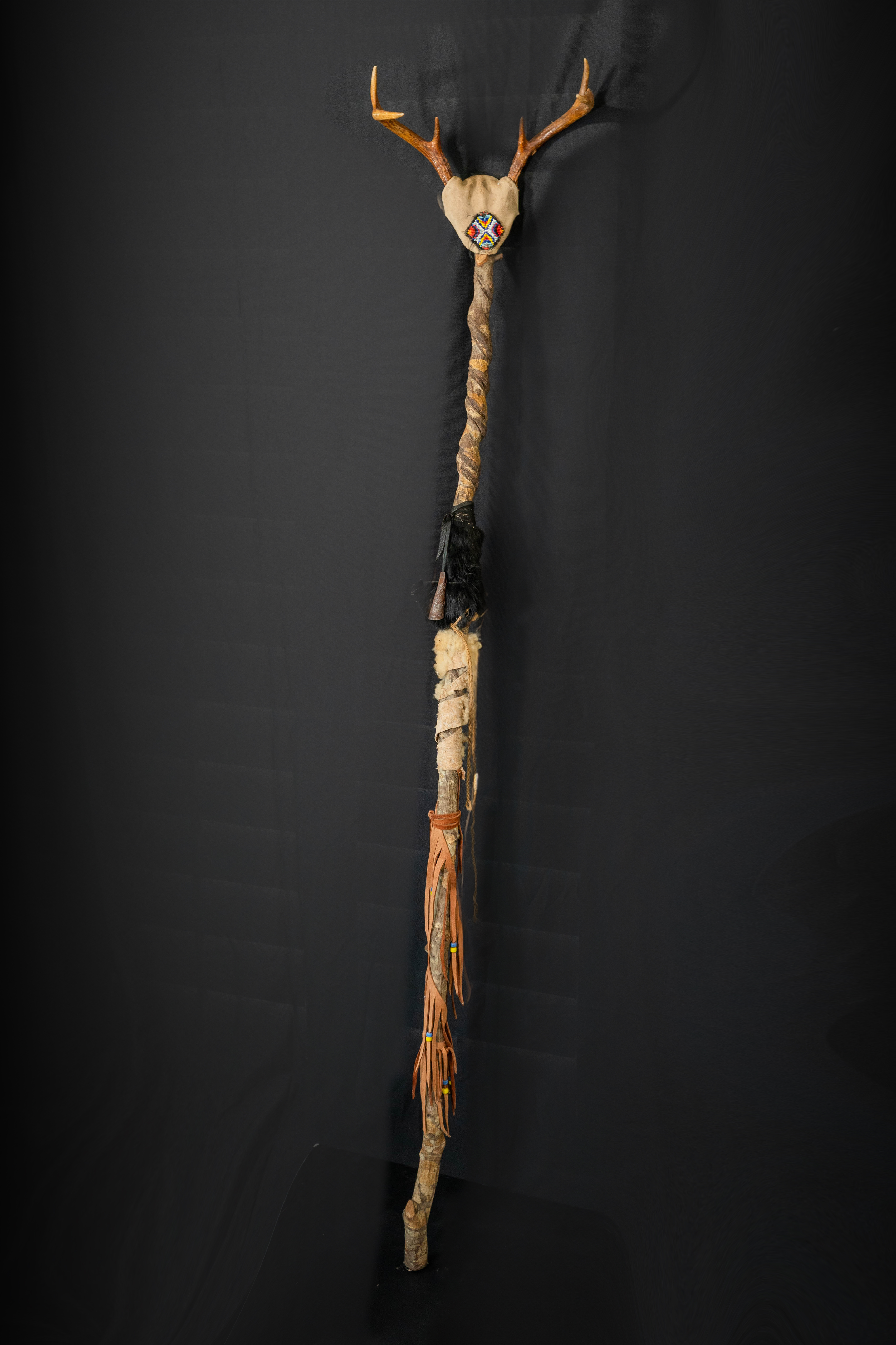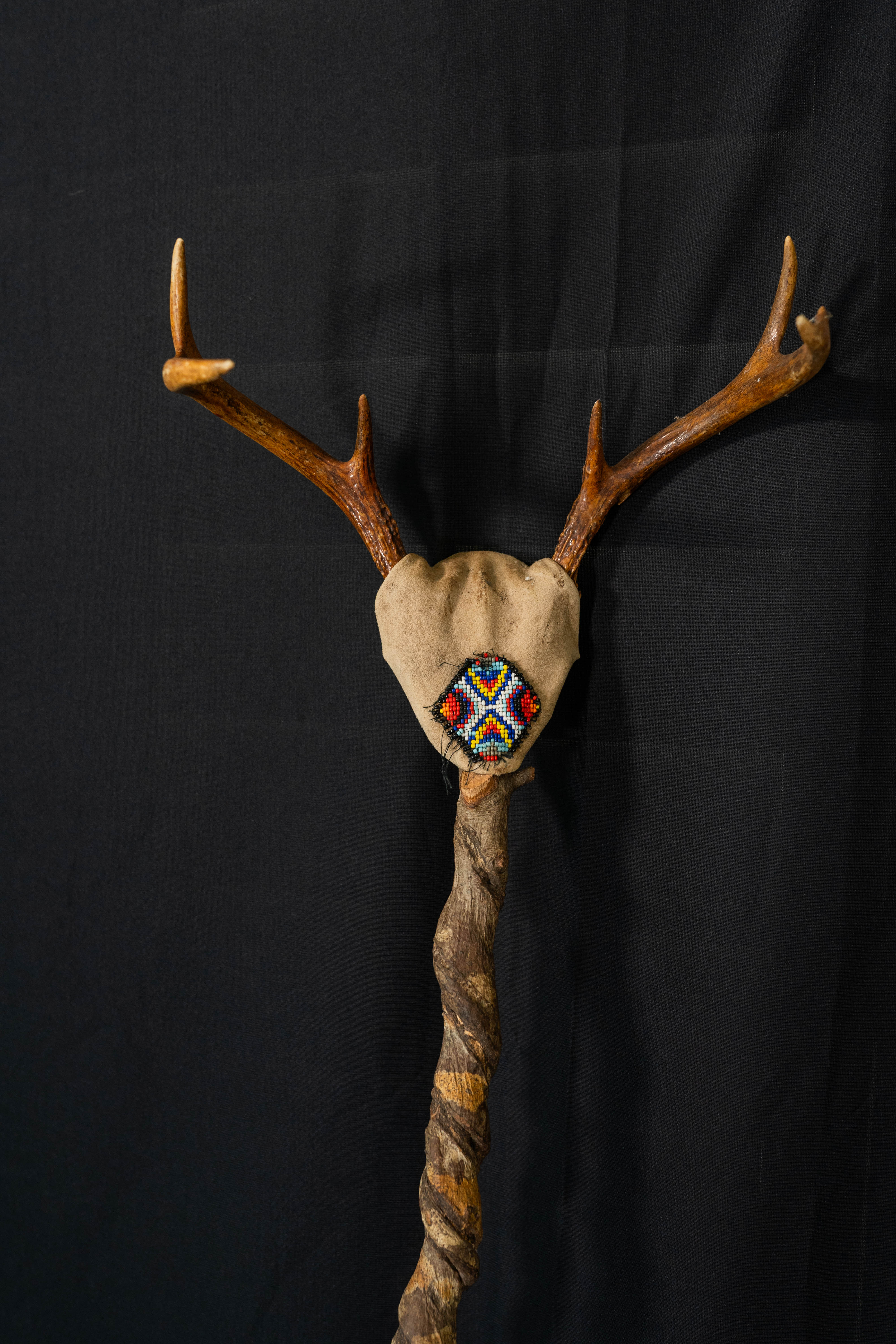 Native American Vintage medicine man deer horn staff old thick vine beaded head. Accentuated with fur and leather the antlers are that of a six point buck white tail deer. Length 65″ x 4″ diameter