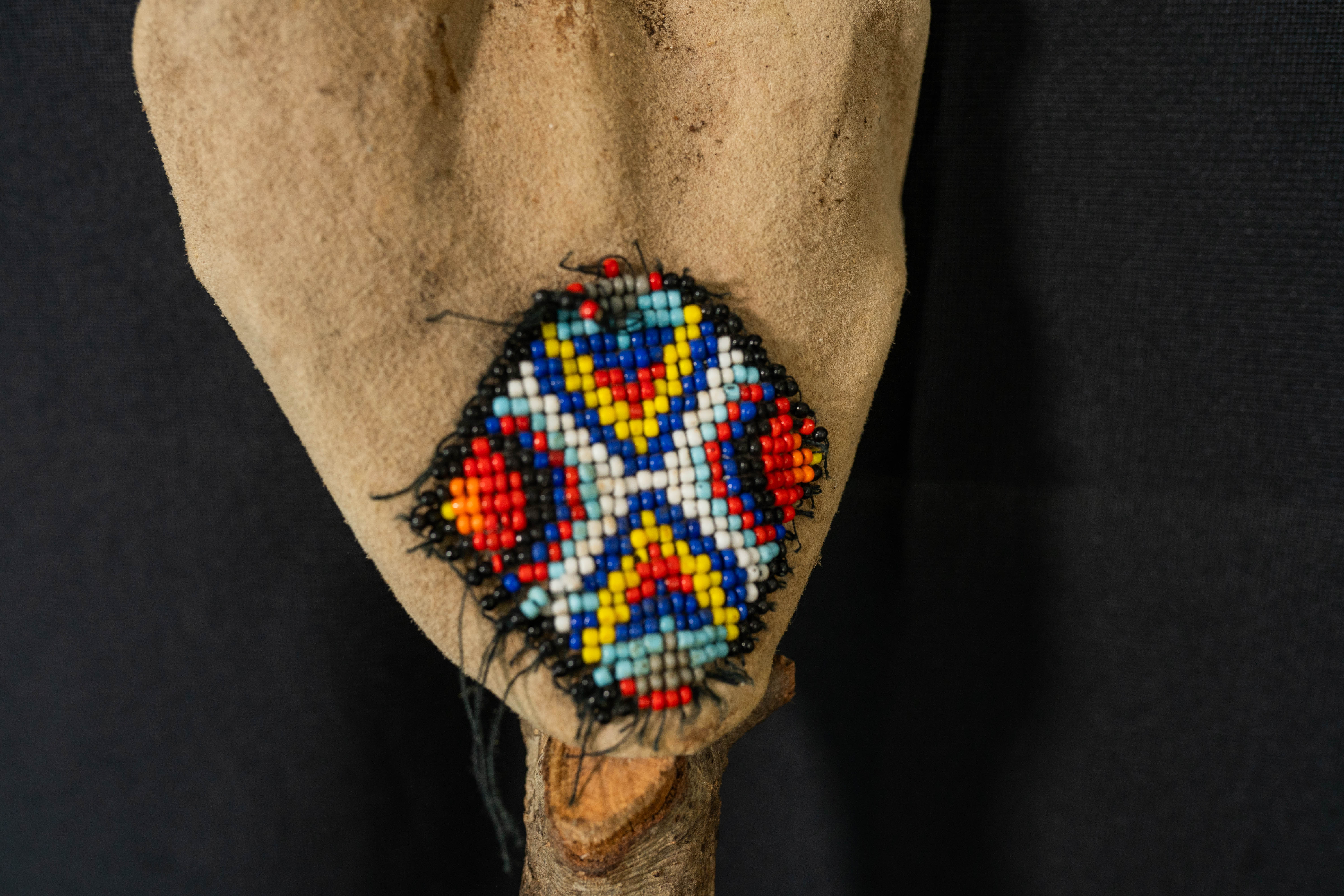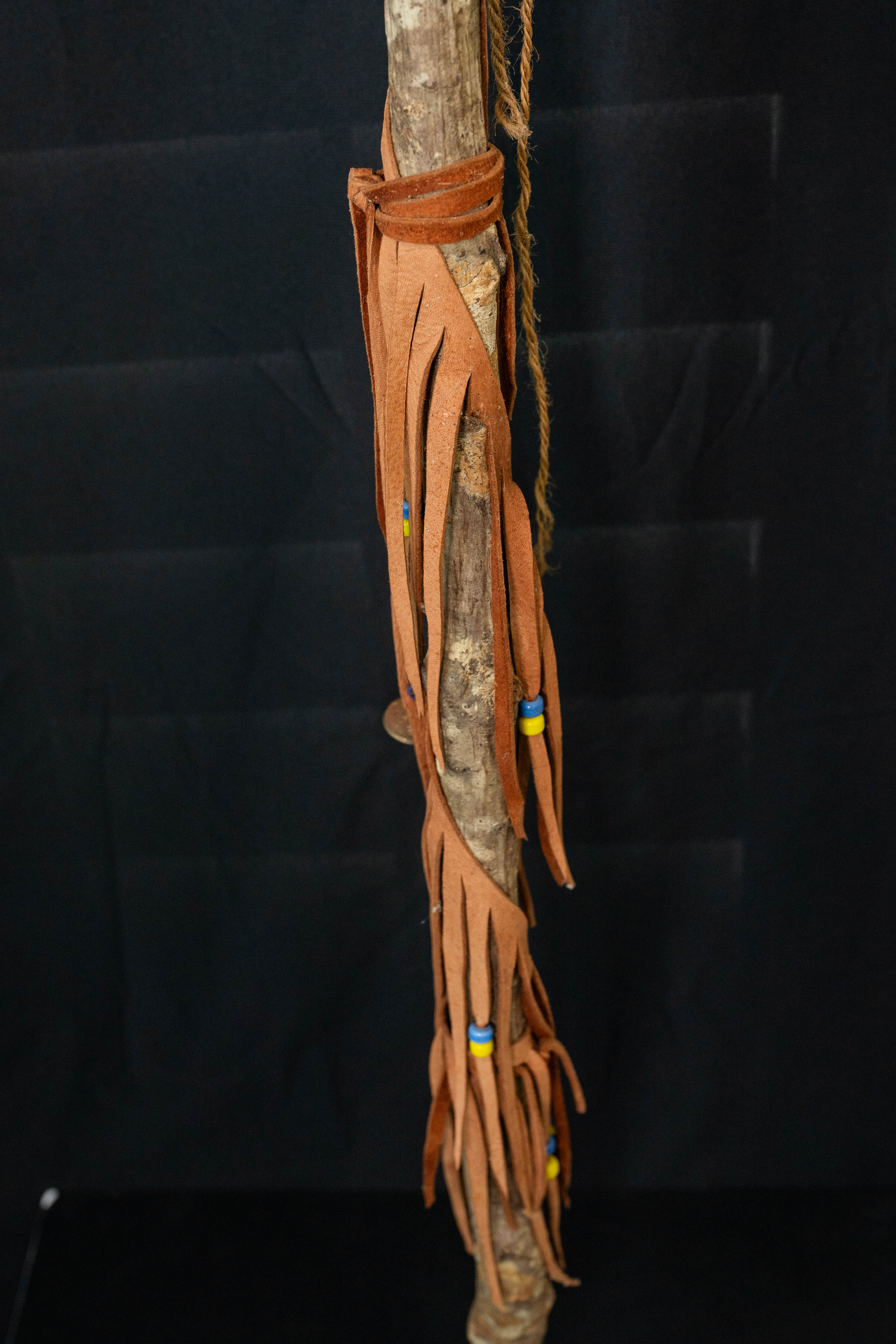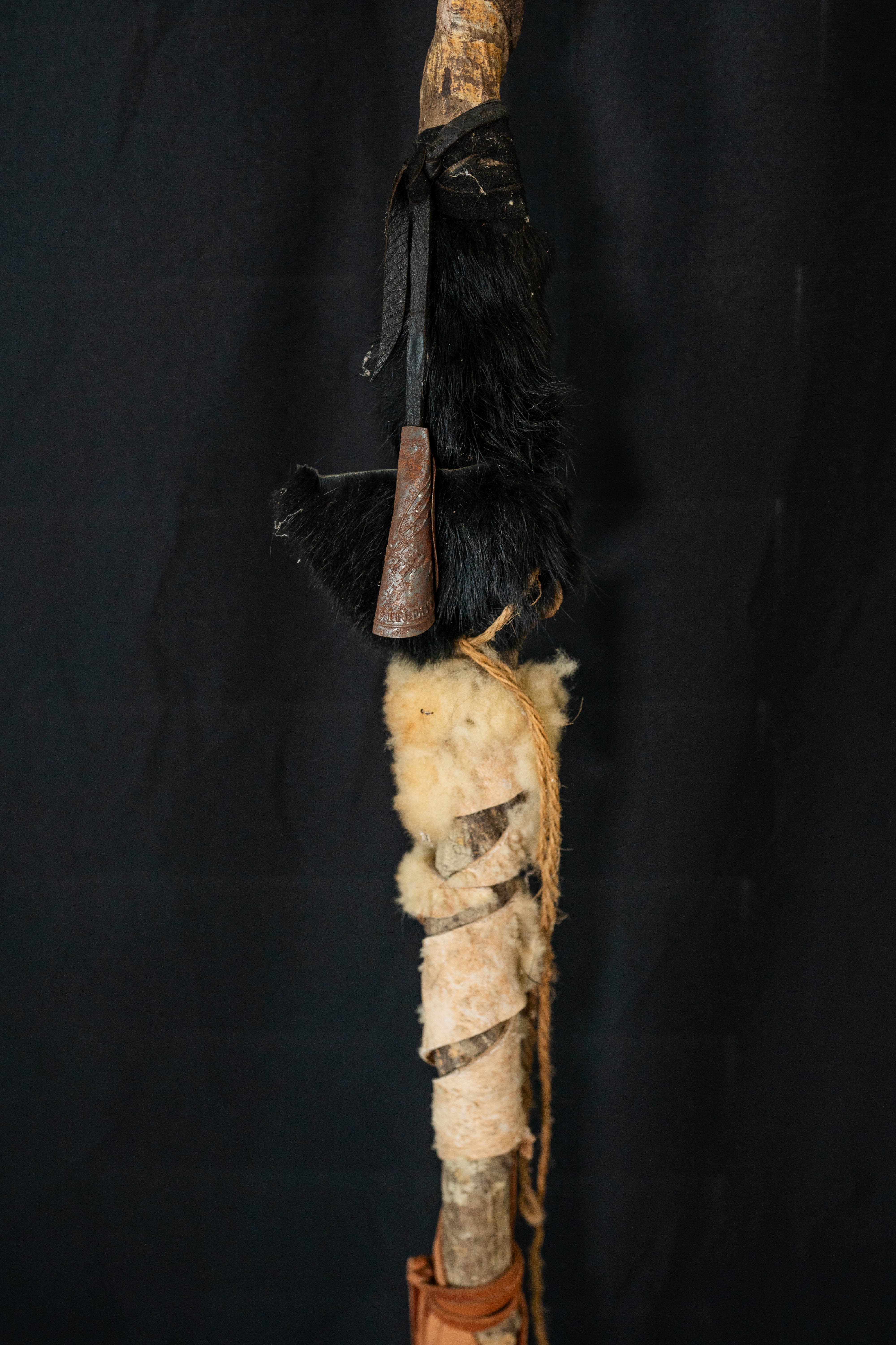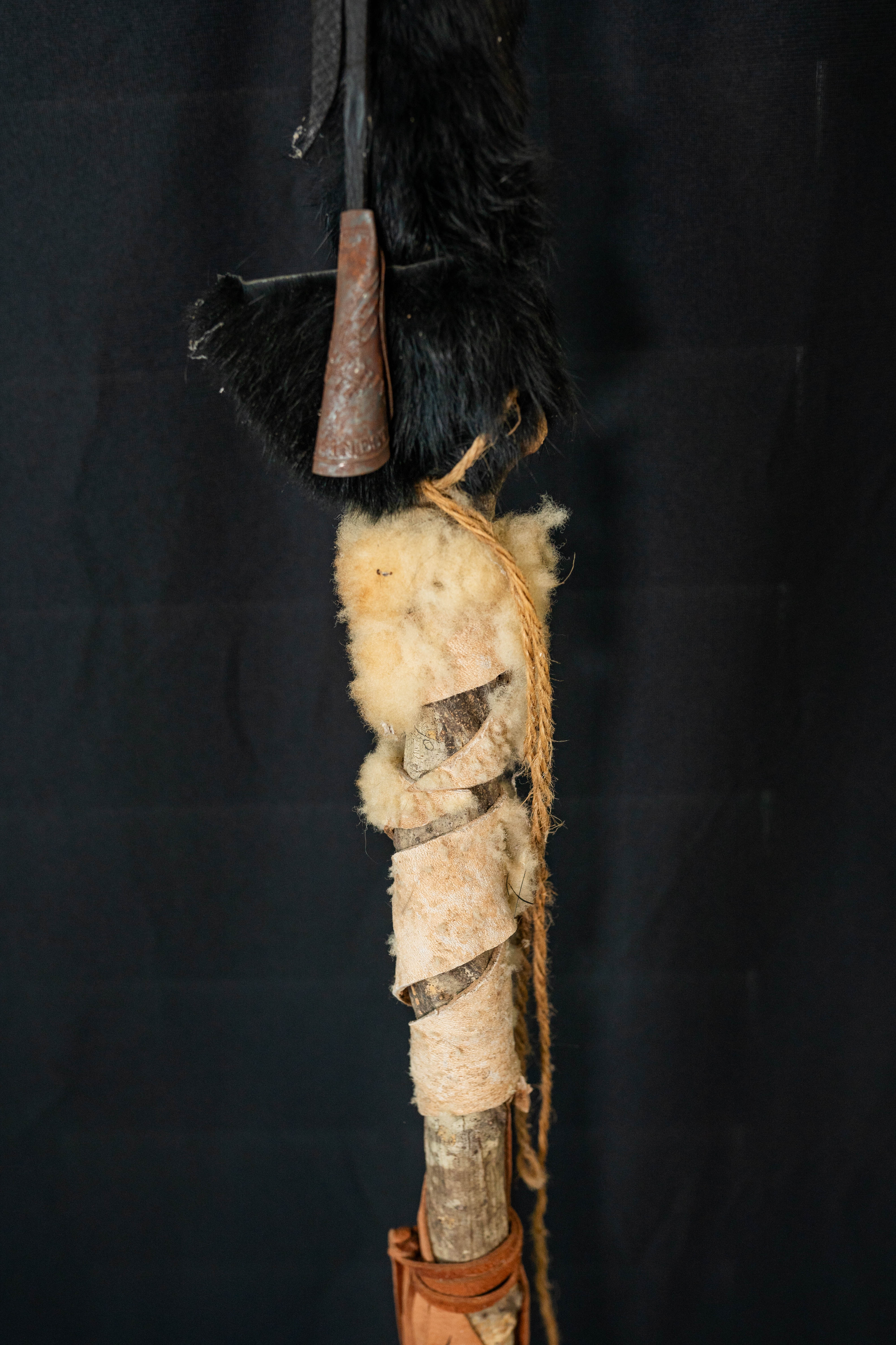 Native American Vintage medicine man deer horn staff old thick vine beaded head. Accentuated with fur and leather the antlers are that of a six point buck white tail deer. Length 65″ x 4″ diameter