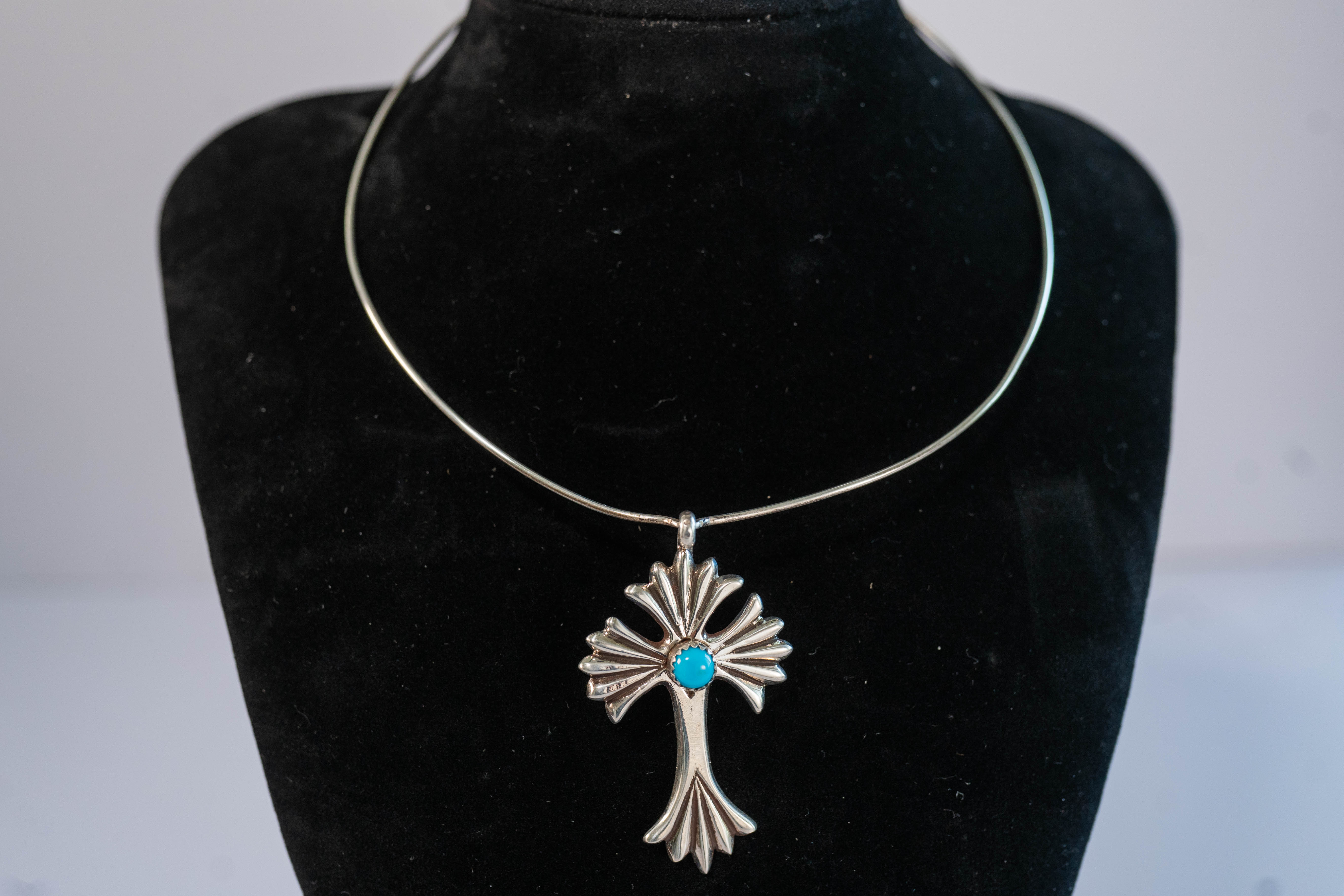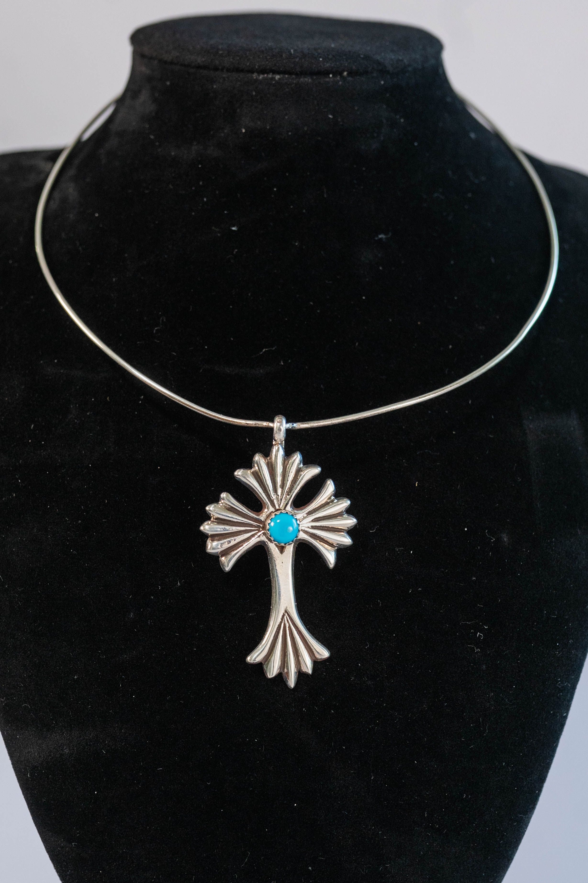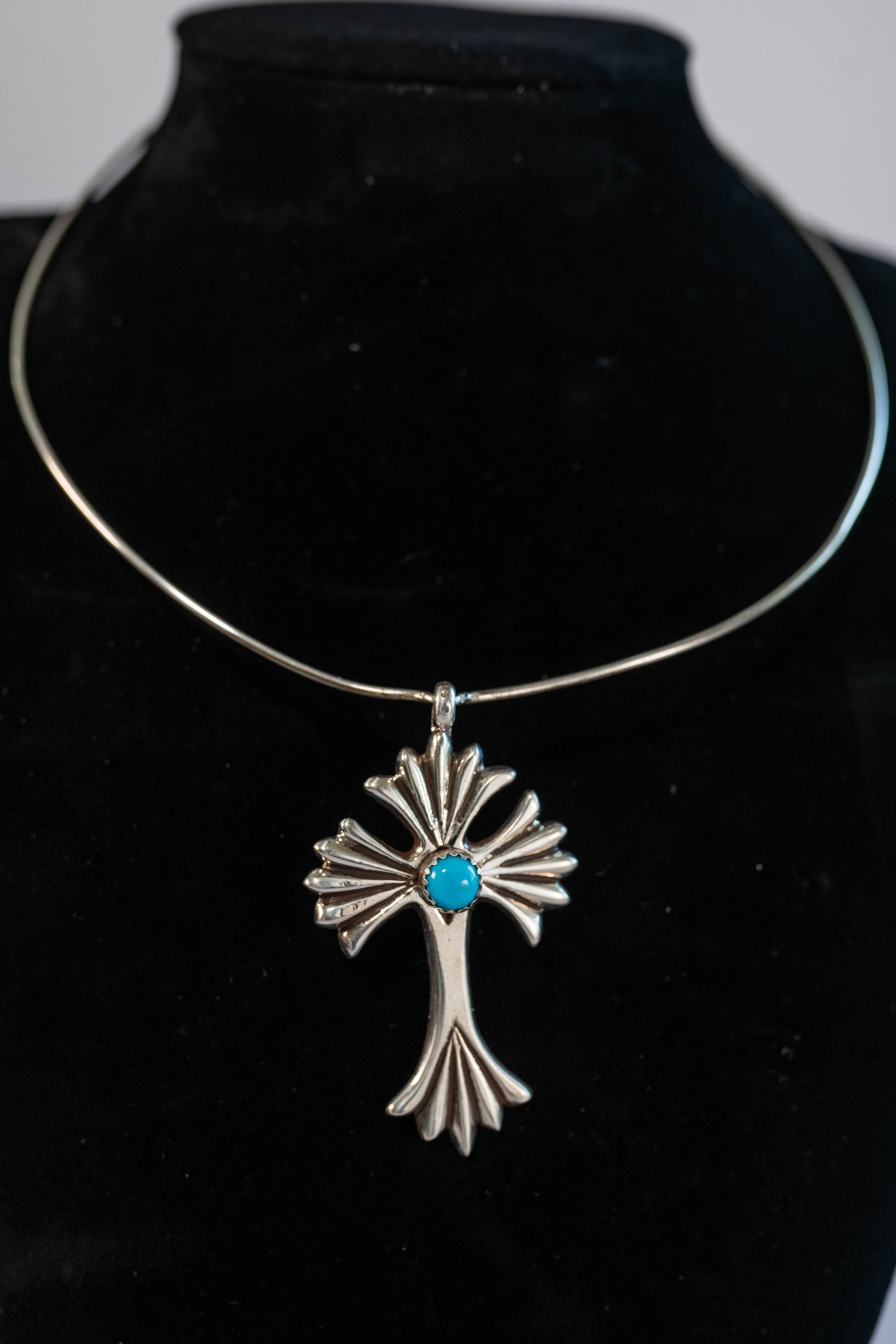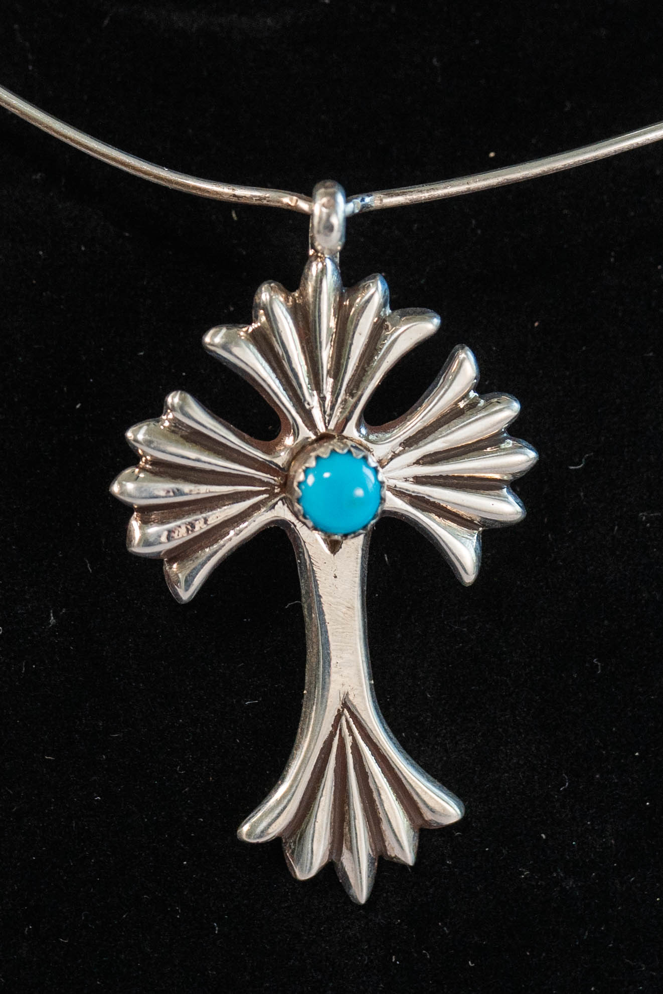 Native American Navajo Beautiful sterling silver cross pendant with AAAA grade sleeping beauty turquoise 6 mm center stone on sterling silver slide 16″. Pendant measures L 2 1/4″x 1 1/4″ W Artist Jamison Kee 16g