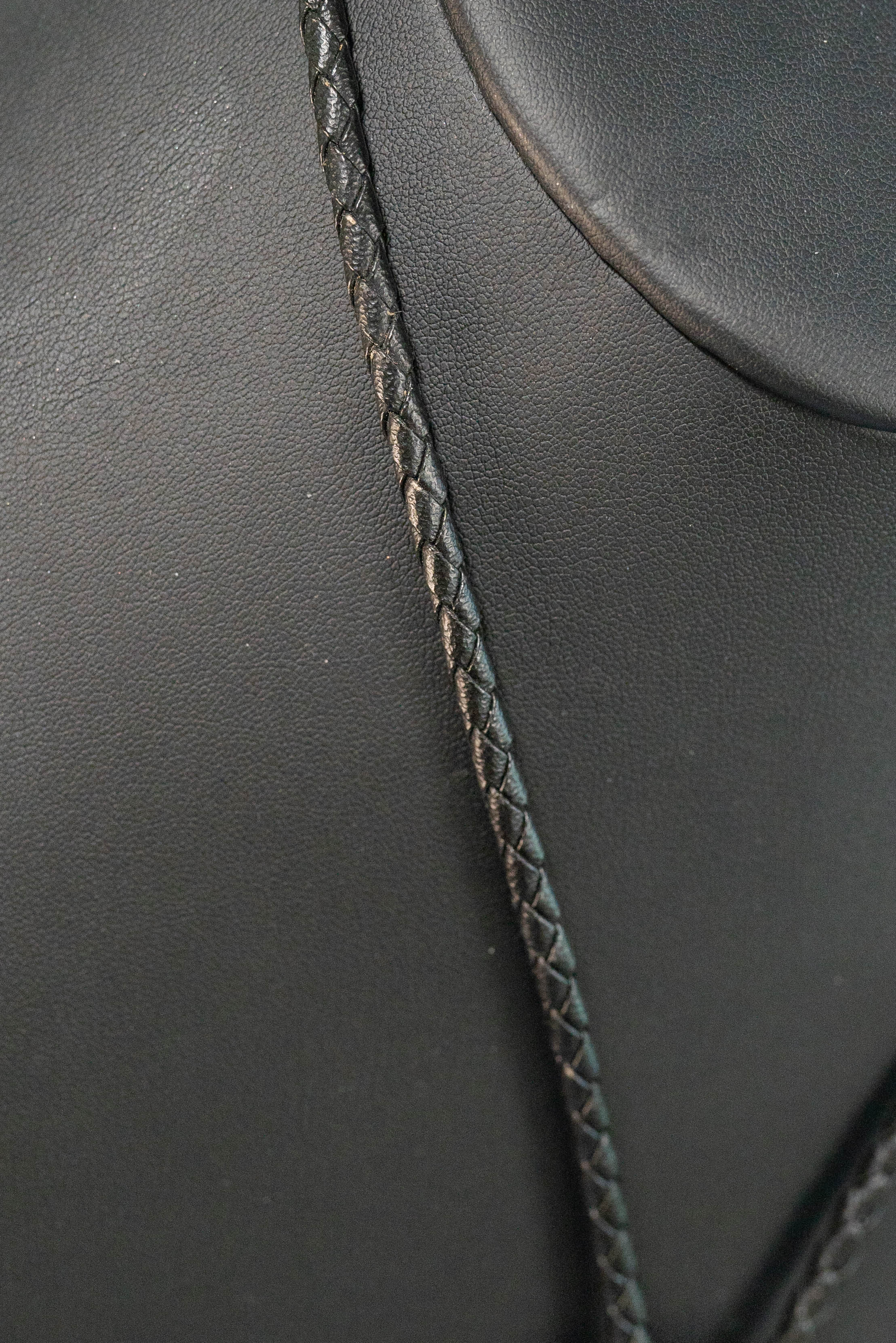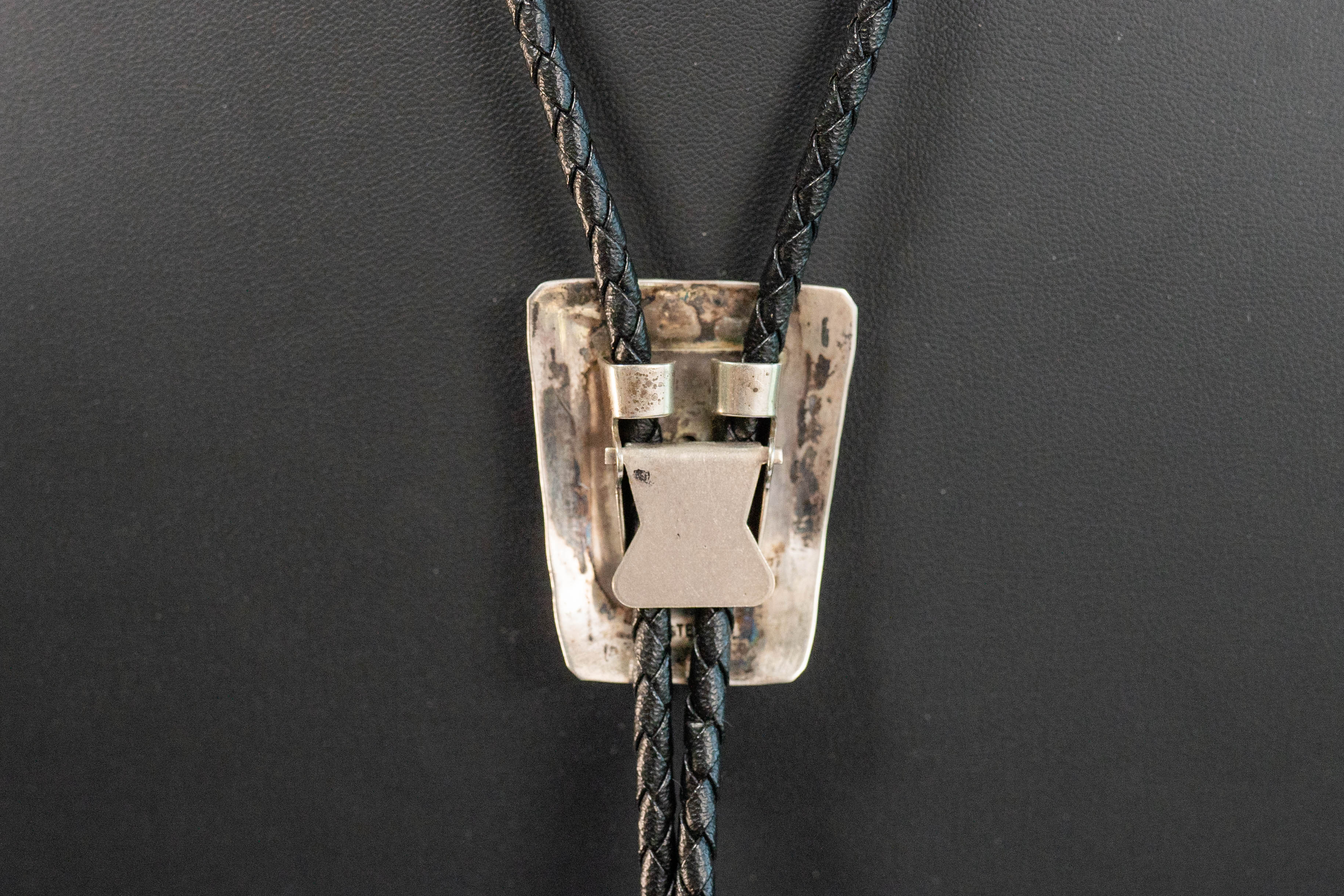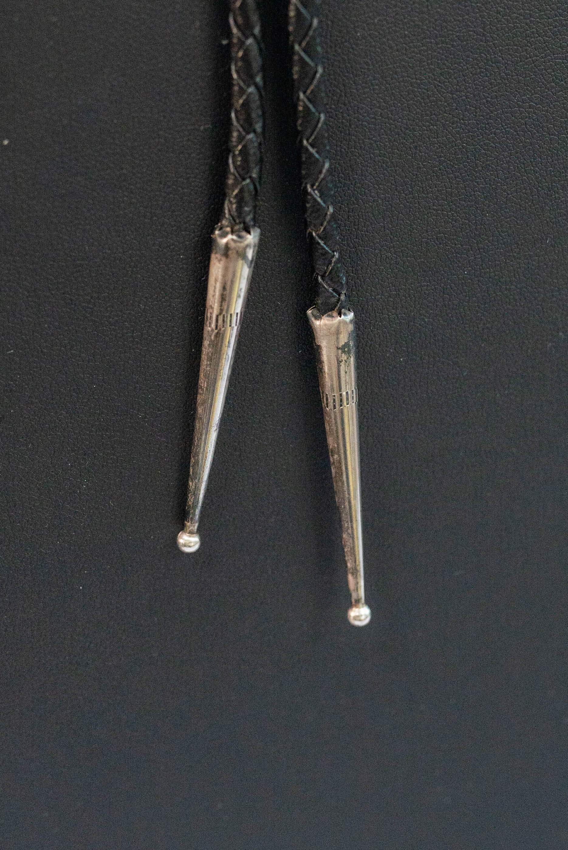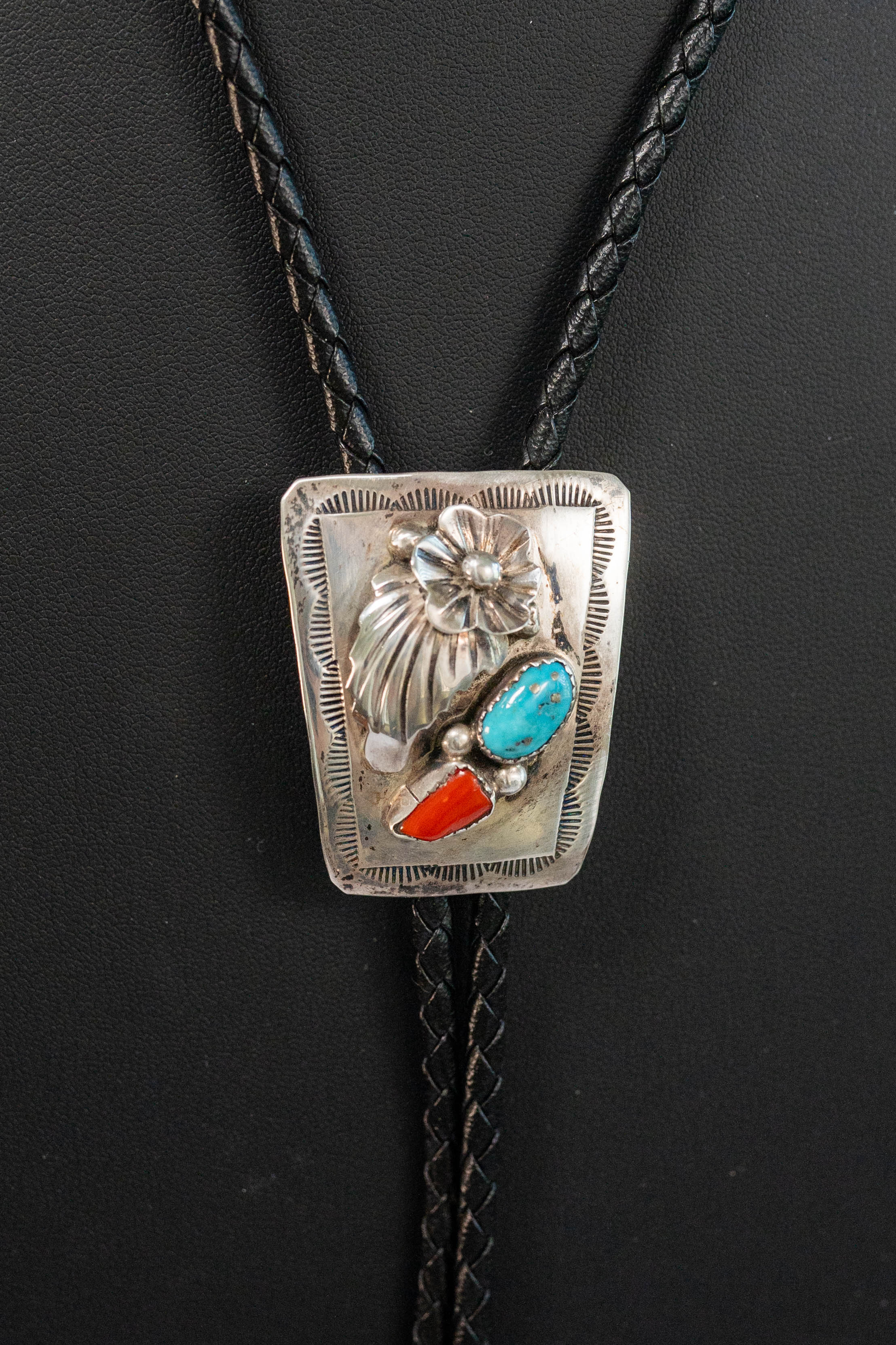 Native American Navajo vintage sterling silver bolo with a Kingman Turquoise gemstone set above a Mediterranean Coral gemstone with a hand tooled floral, leaf and berry design motif. The bolo is L 1 3/4″ x W 1 1/4″. The sterling silver tips are 1 1/2 ” long on a black twisted leather cord. O.A.L. 36″