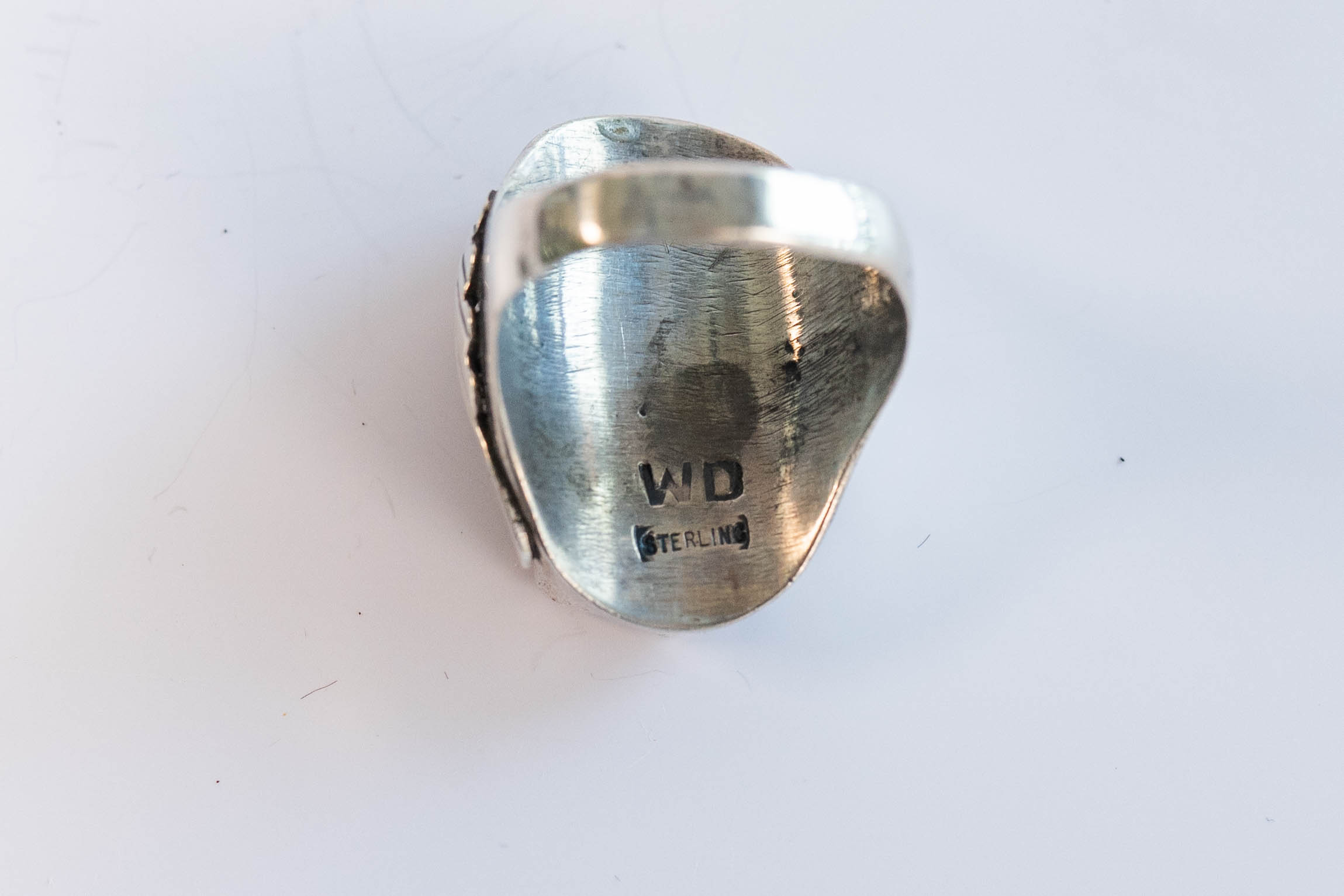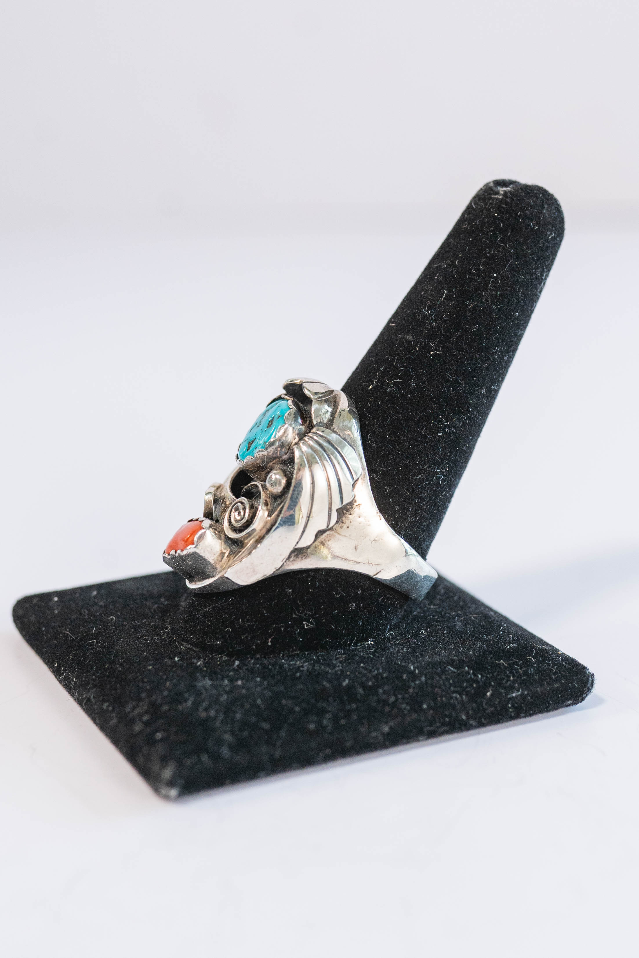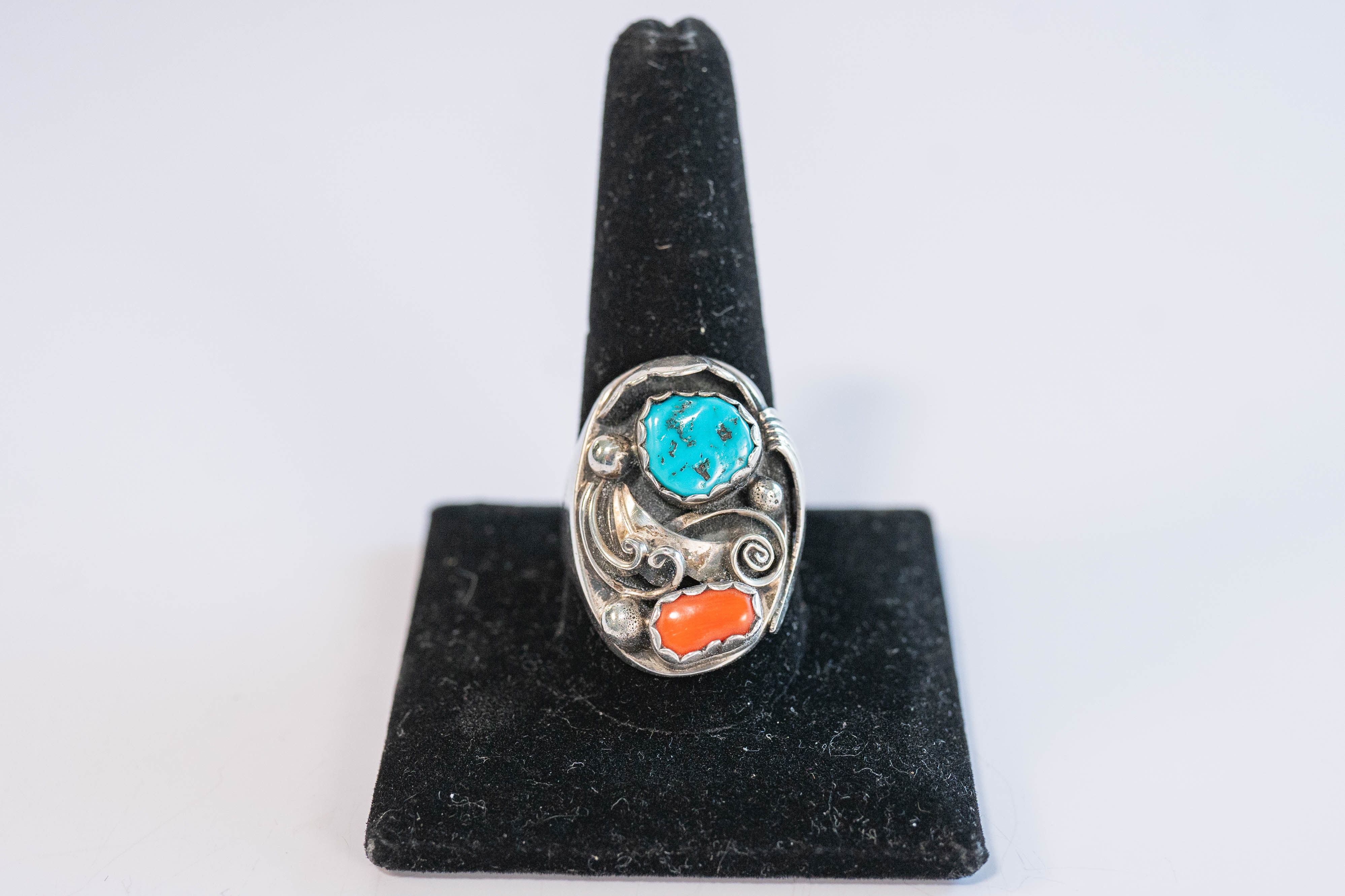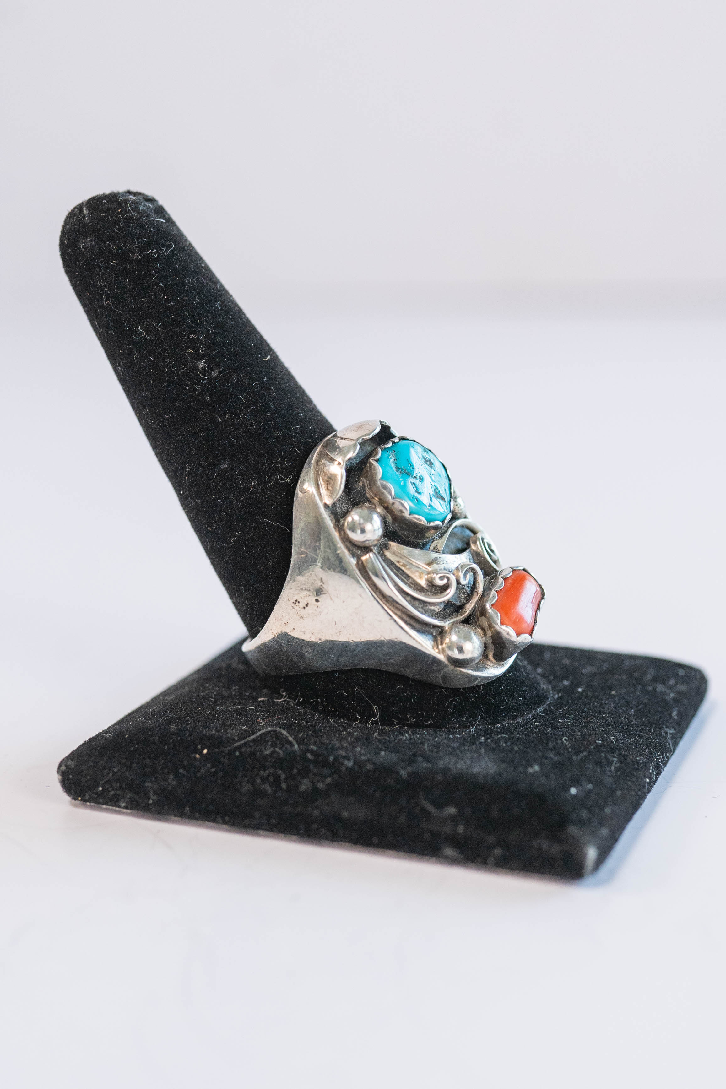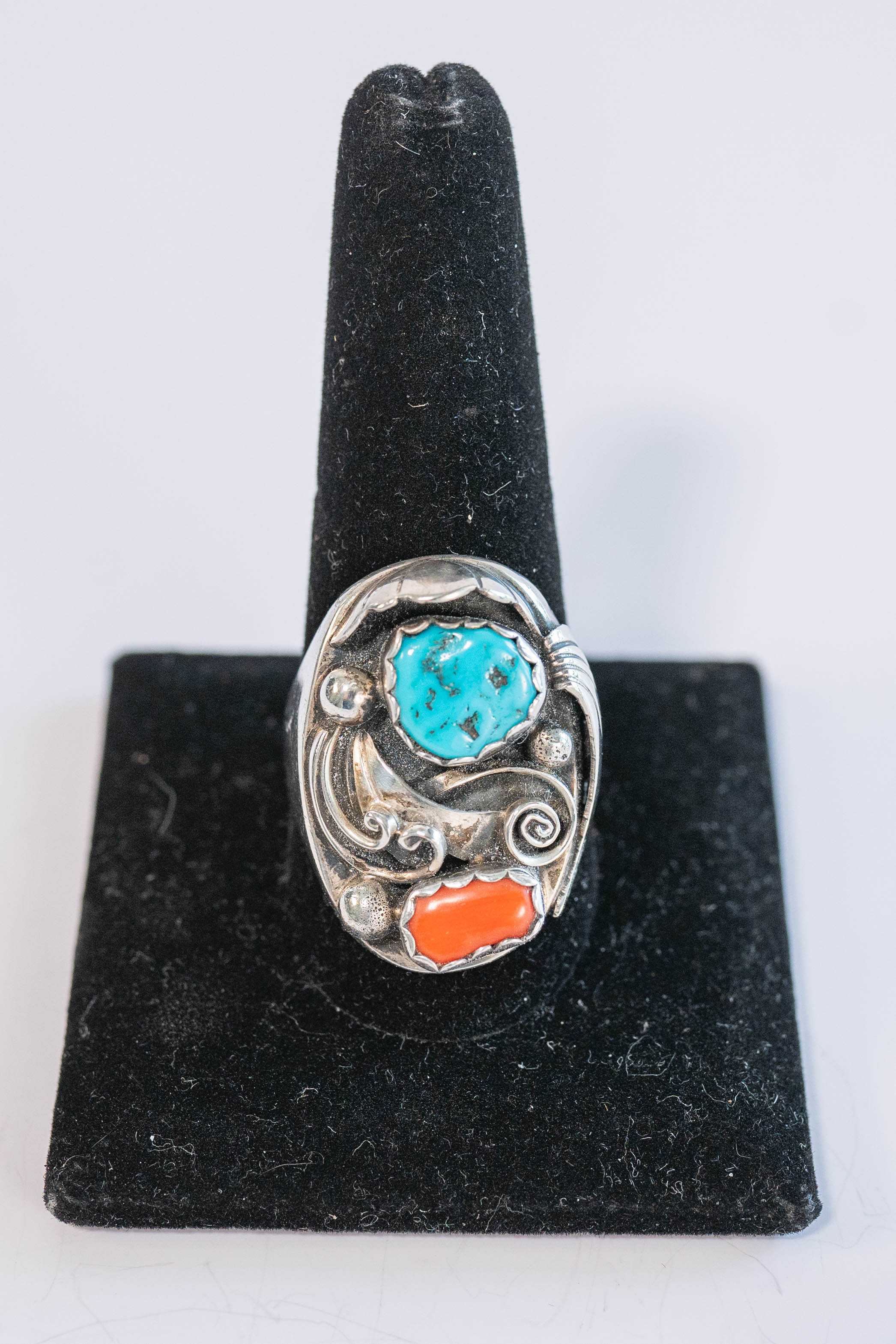 Native American Navajo artist David Whitegoat sterling silver vintage ring with leaf, vines and berry motif with Kingman Turquoise and Mediterranean Coral gemstones. Size 11 1/2. L 1 1/8″ x W 7/8″.