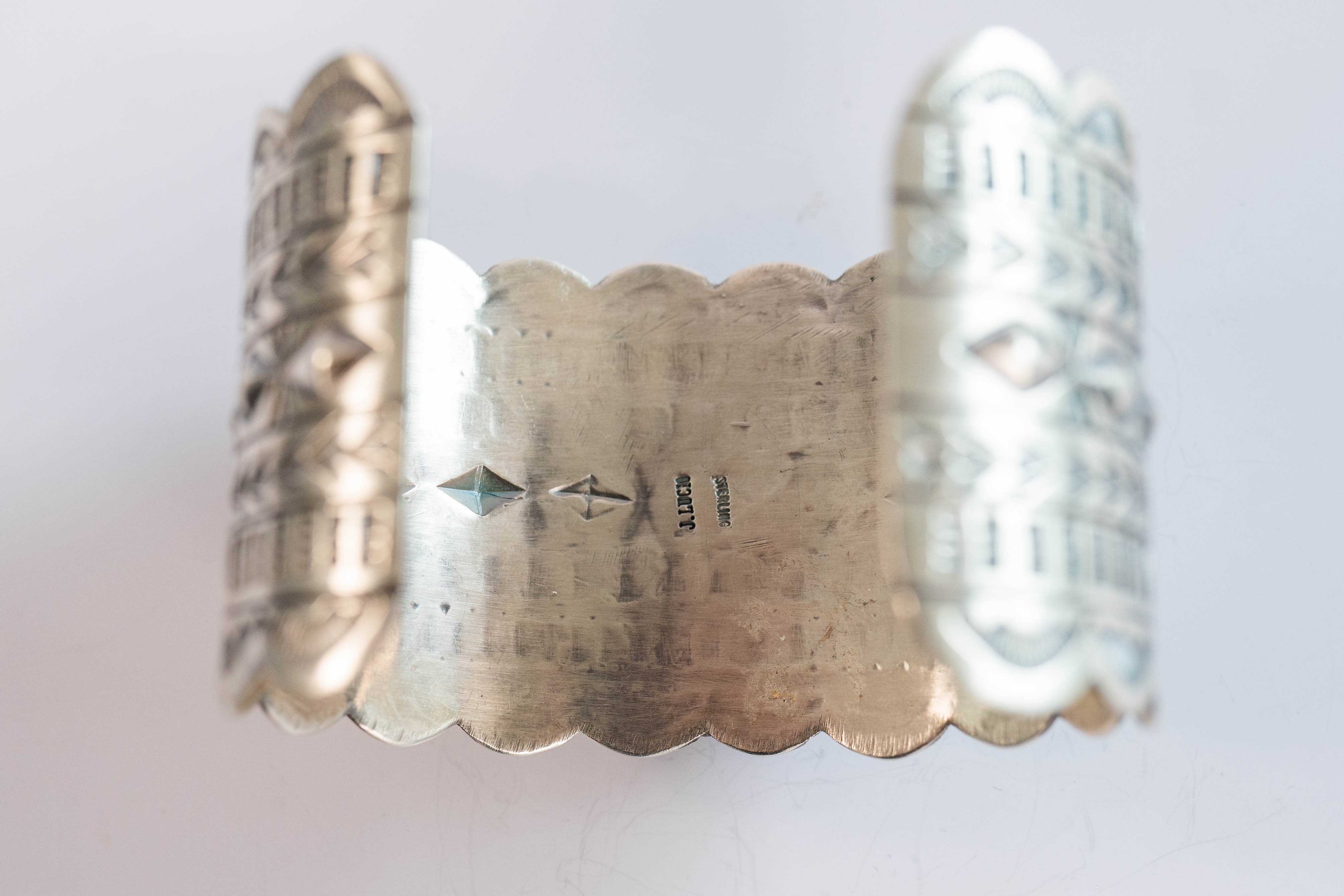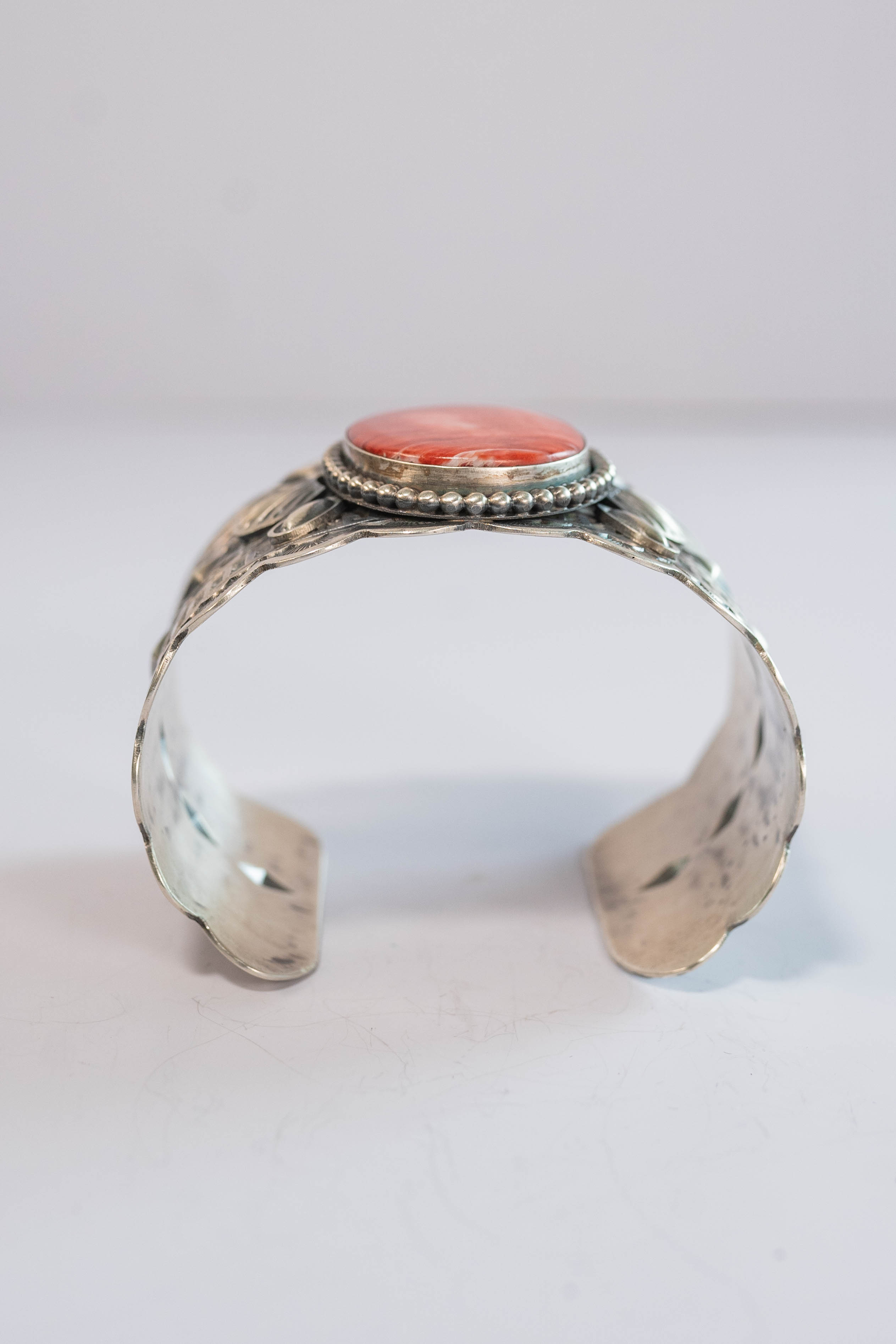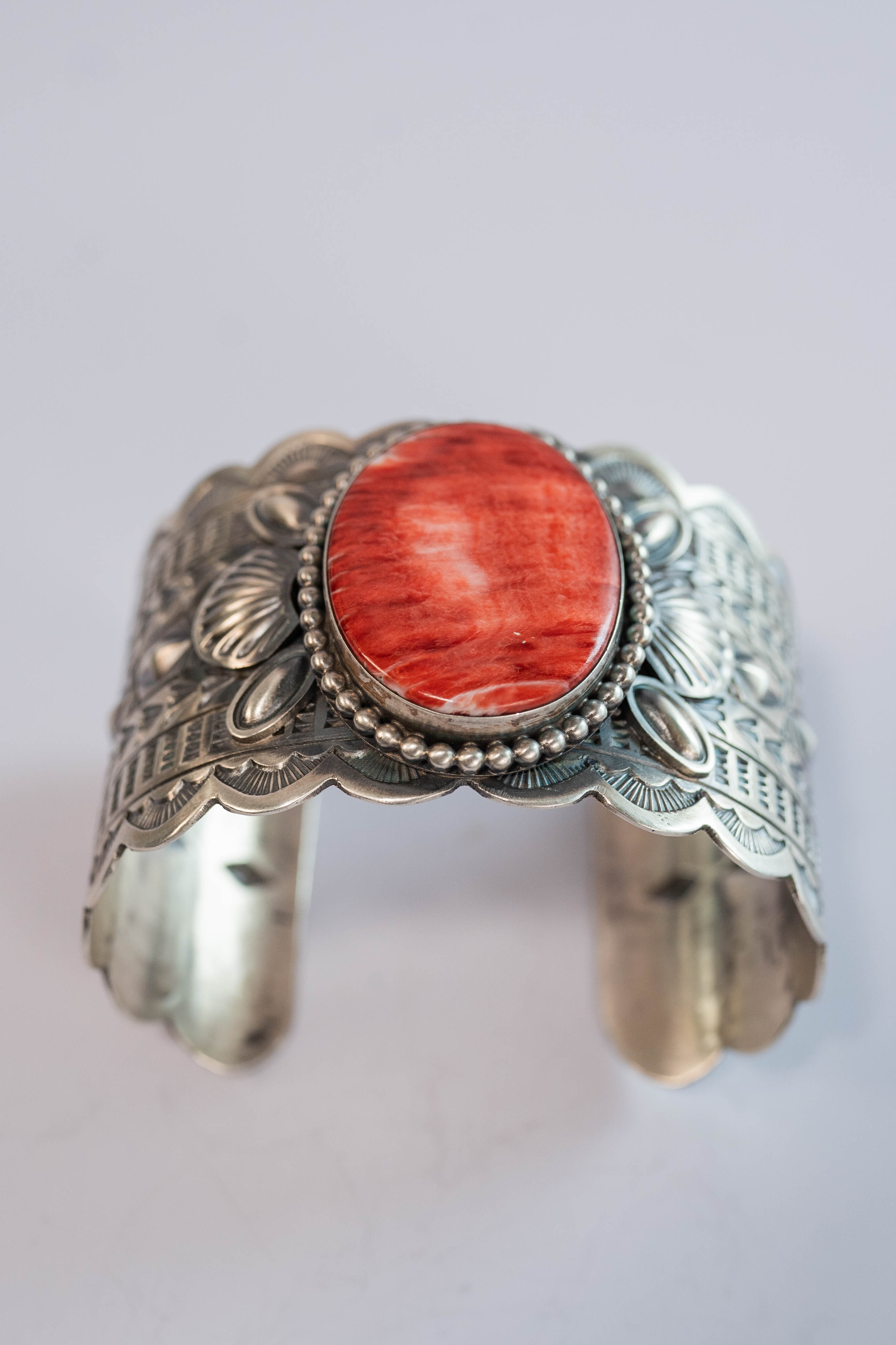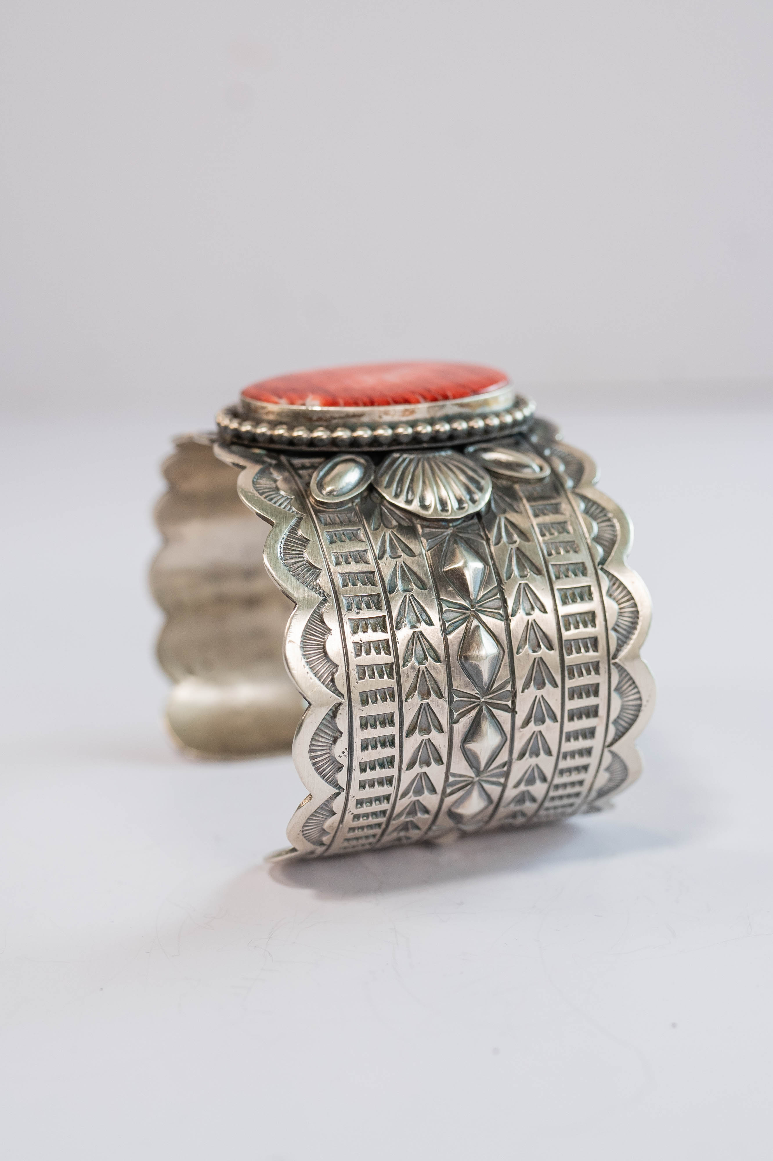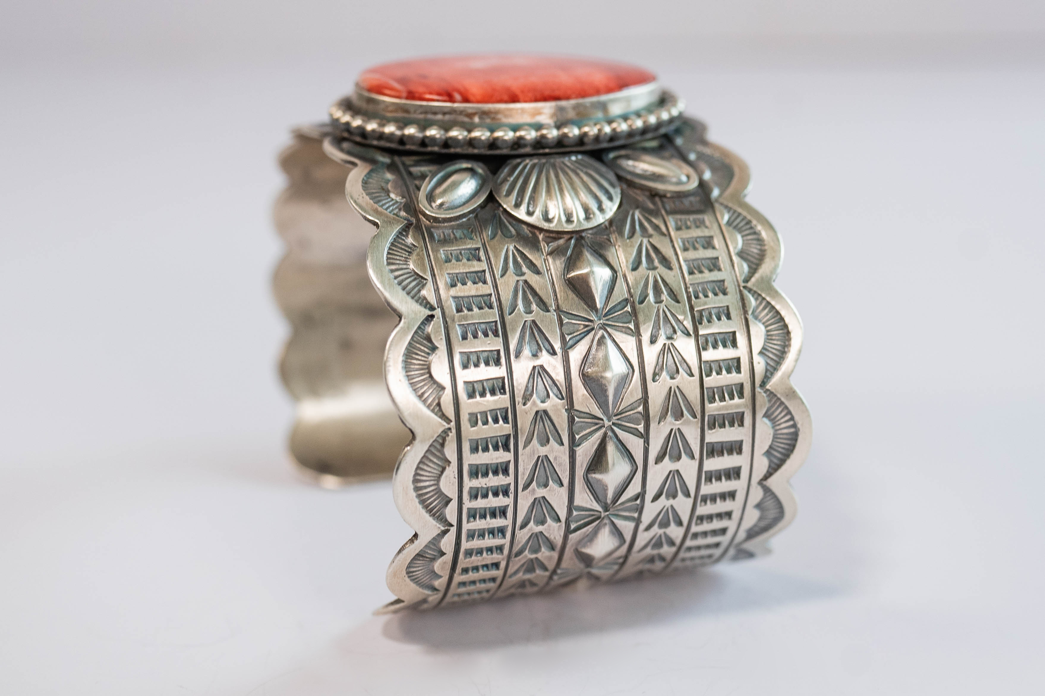 Native American Zuni Master silversmith J Lucio strikingly beautiful hand stamped and hand carved sterling silver cuff bracelet featuring AAAA red spiny oyster shell center stone length 1 5/8 inch by 1 1/4″inch surrounded by sterling silver beads. The cuff is embellished with sterling silver seashell ovals and rows of diamond-shaped appliqués. Size 12 inch gap 1 1/2 inch width 1 7/8 inch signed J Lucio 101gr