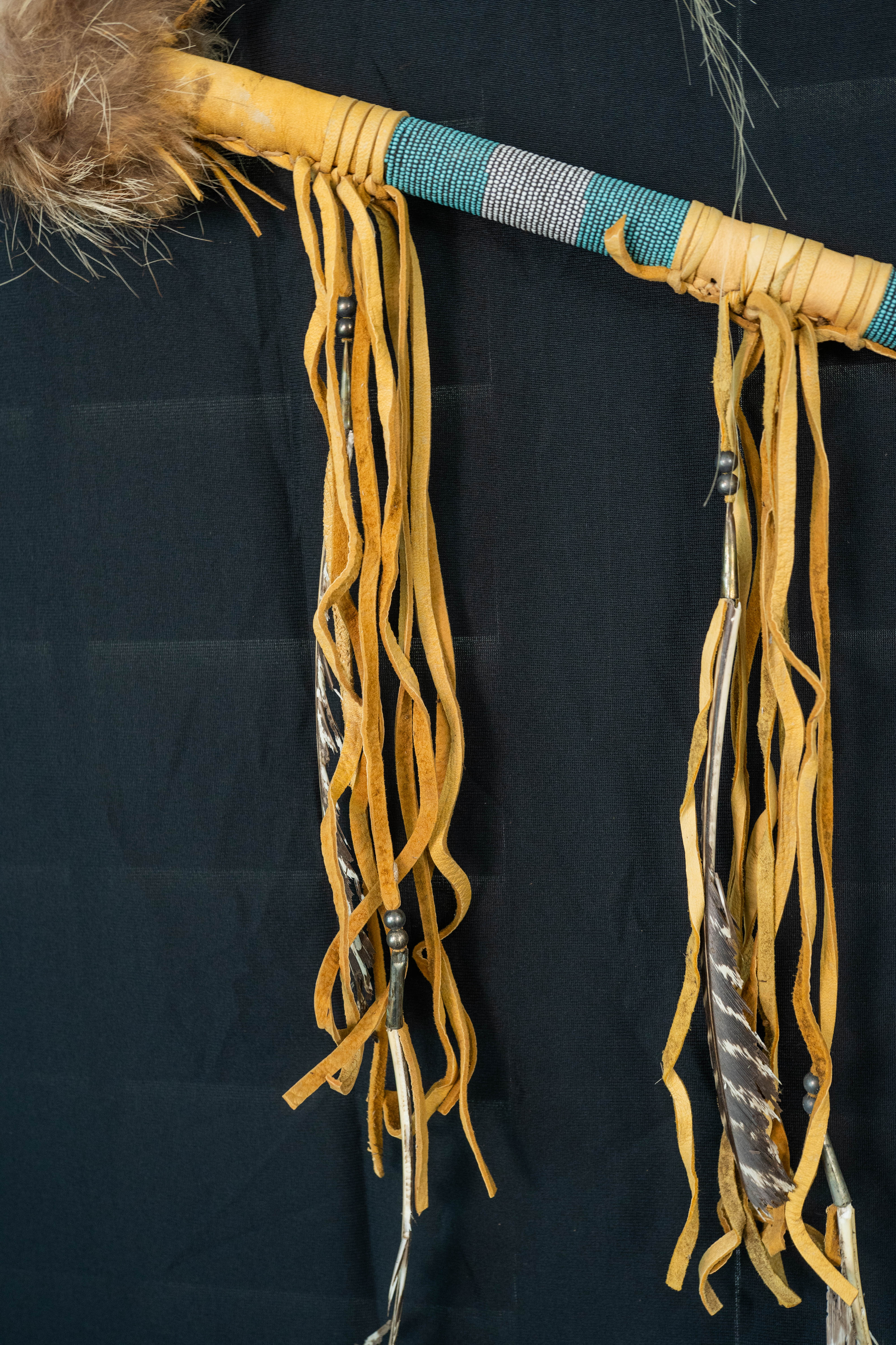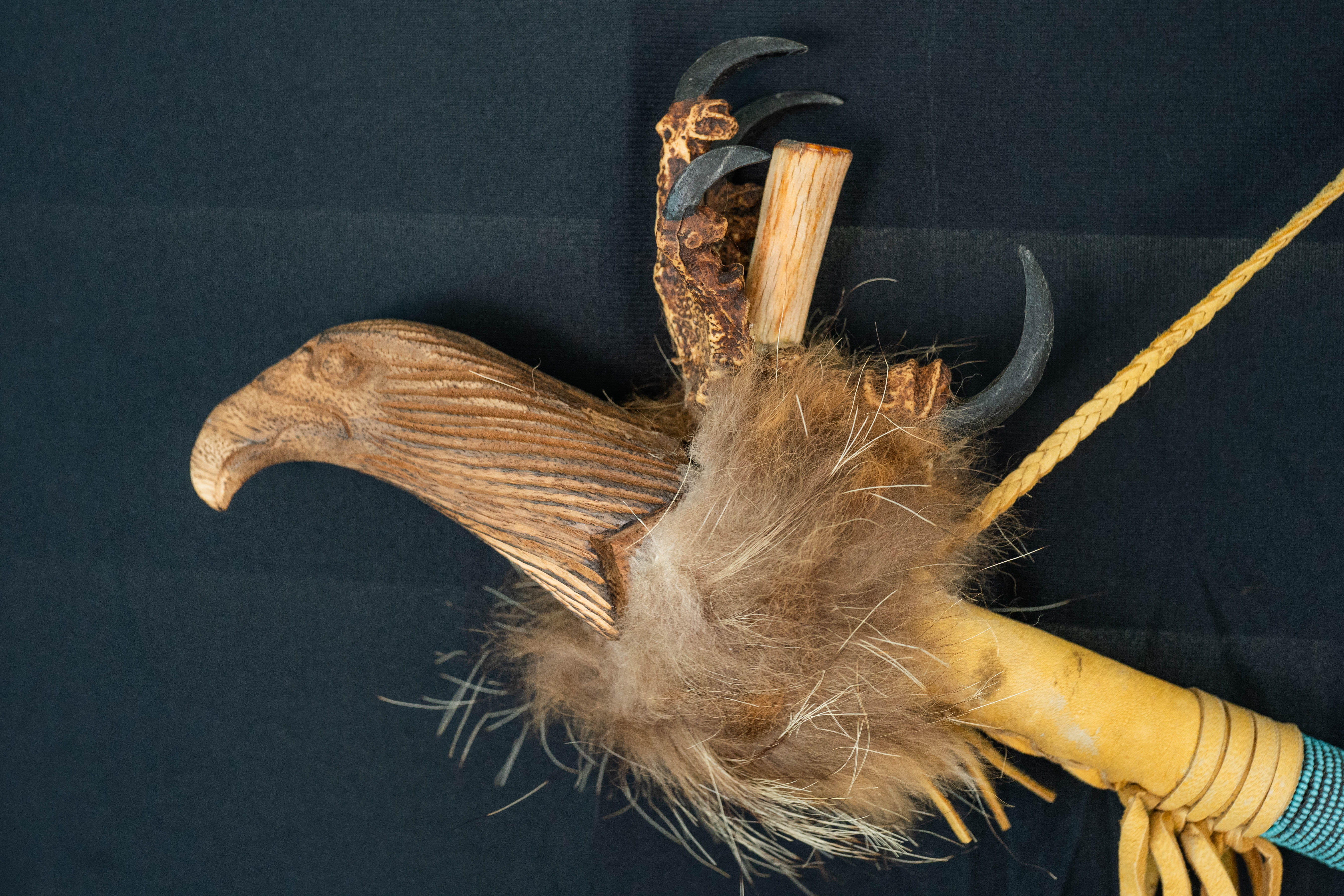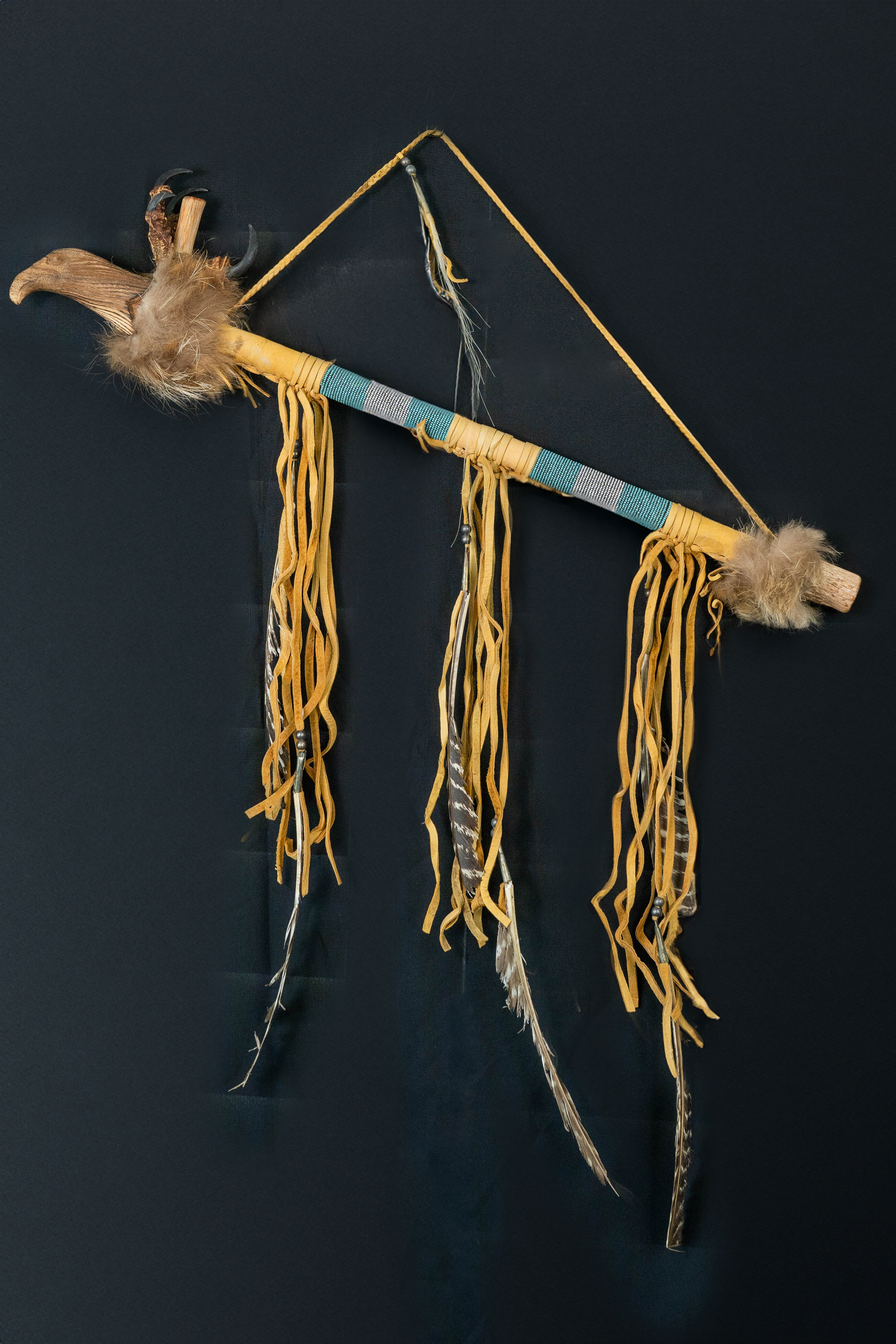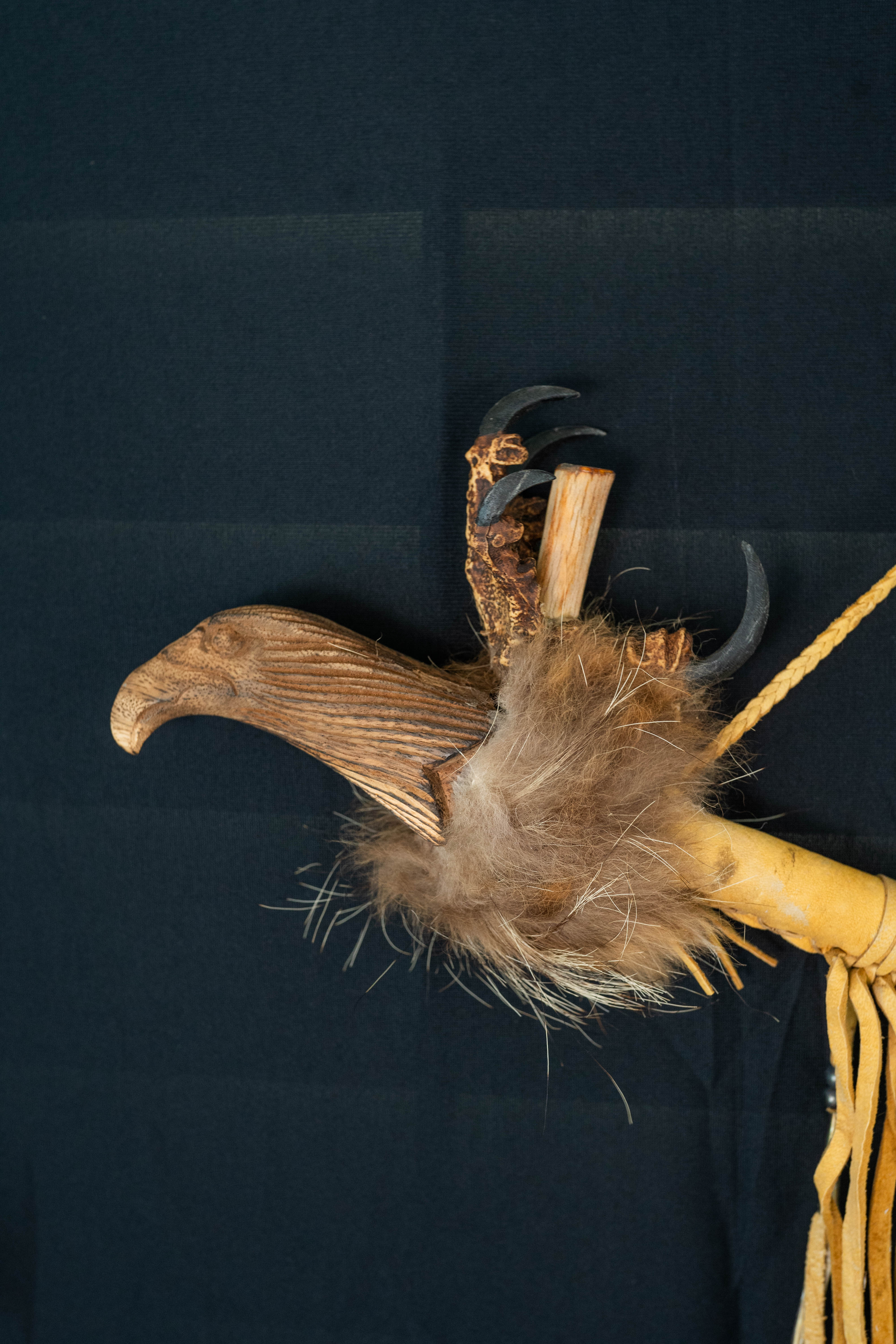 Native American Sioux Vintage hand carved Sioux eagle beaded peace pipe the eagle measures L 5″ x 3 1/4′ W the talons which surround the pipe bowl measure 4 ” Hight the bowl and the mouth piece are made from deer horn. Its accentuated with leather fringe and feathers OAL 28 1/2 “