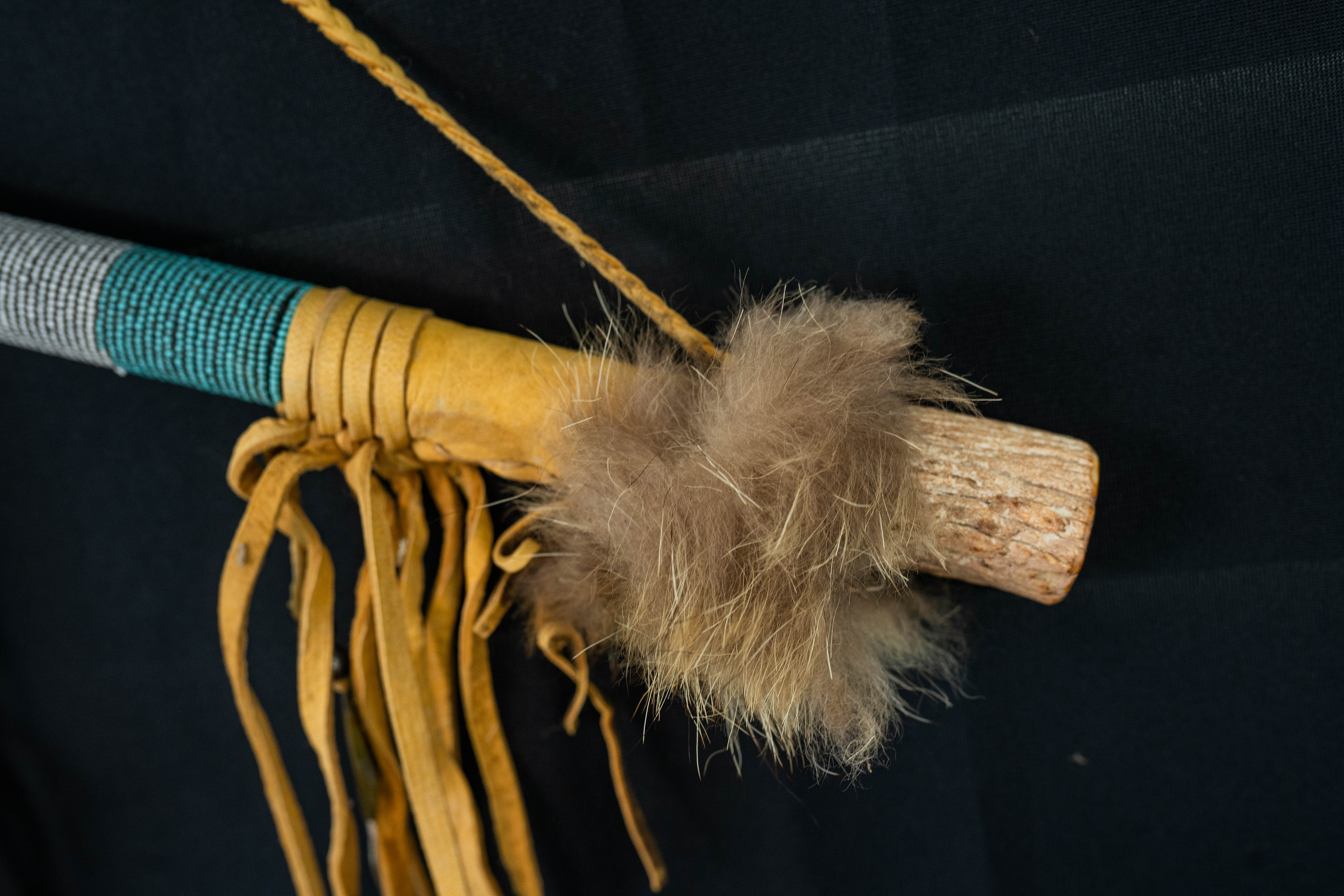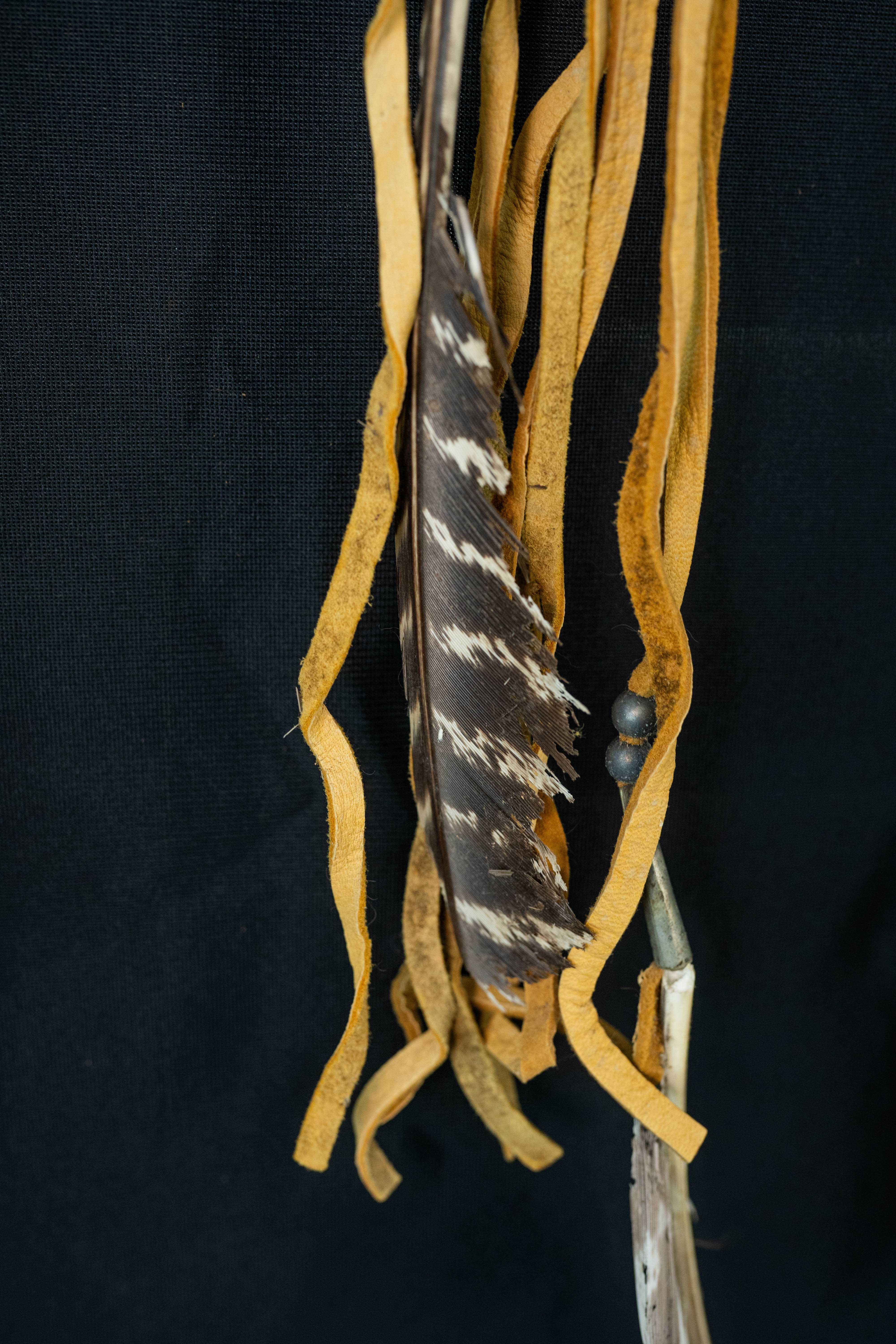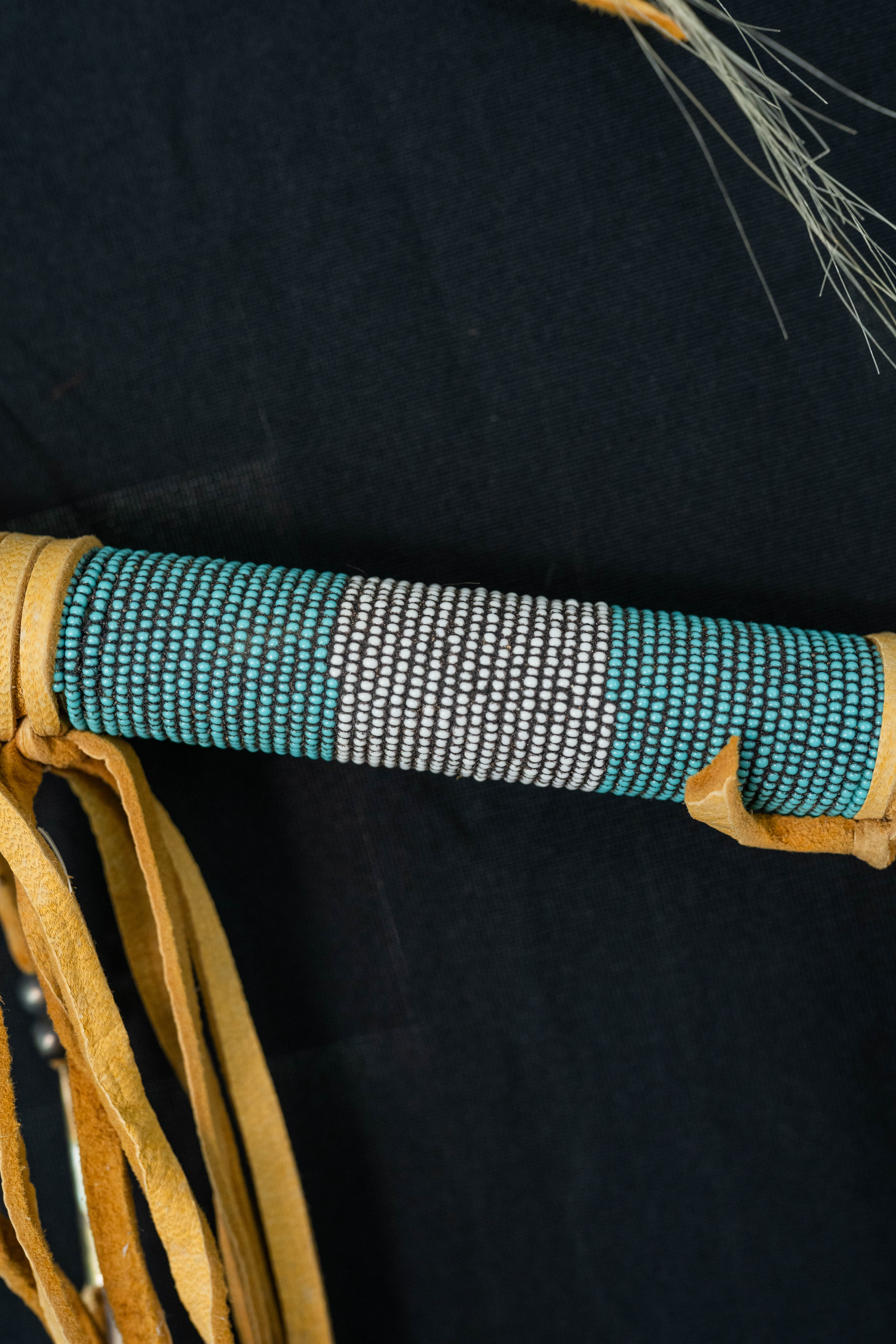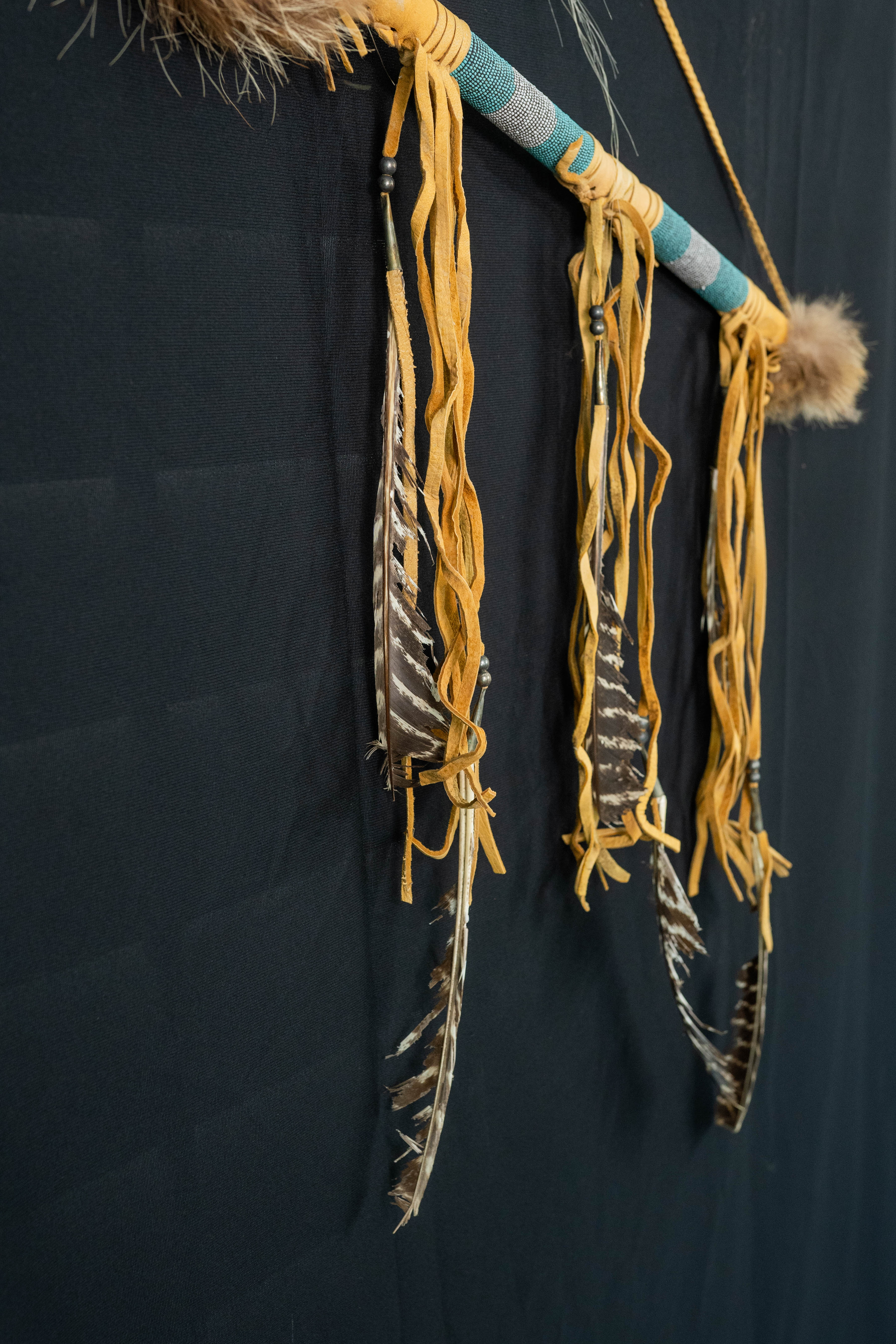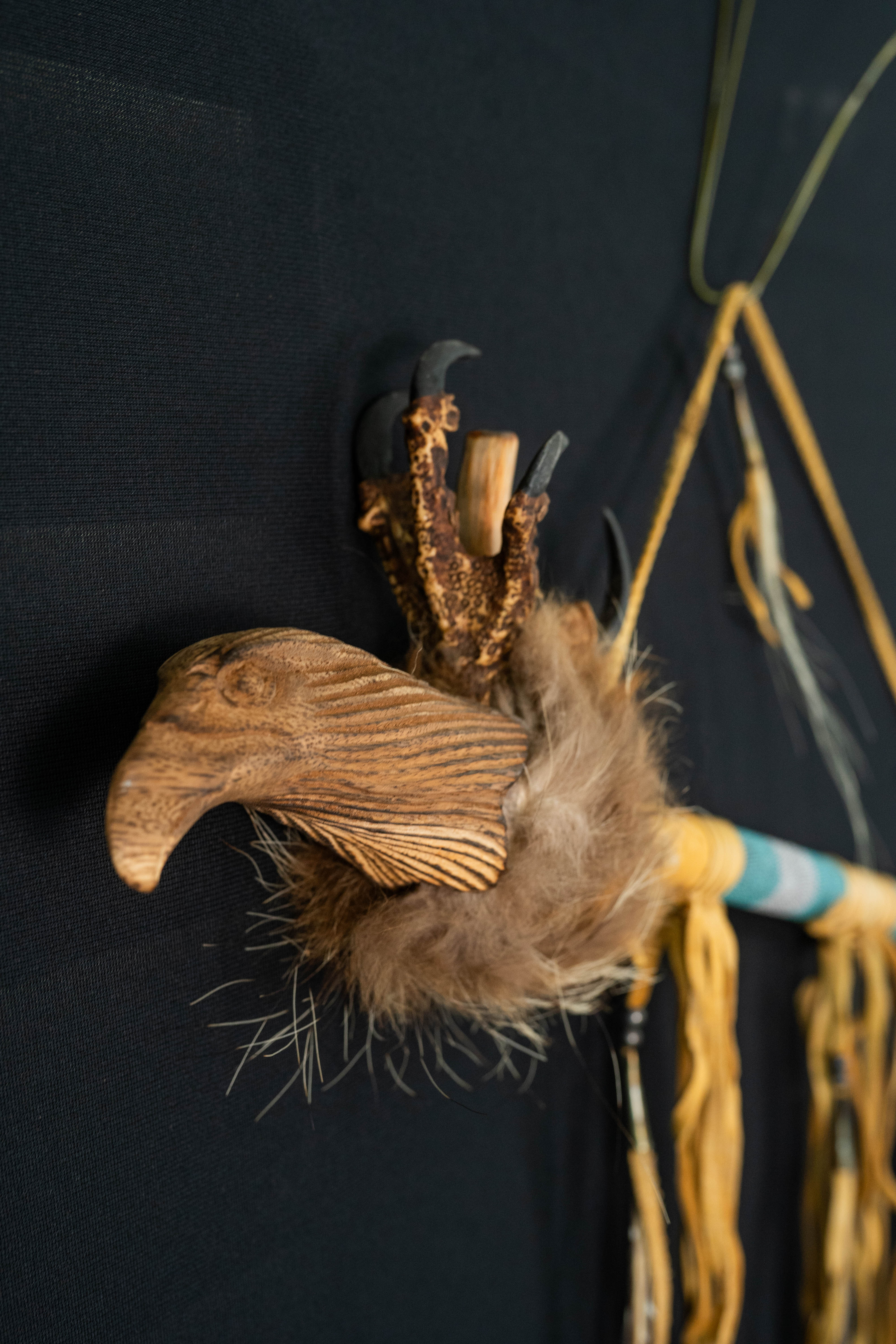 Native American Sioux Vintage hand carved Sioux eagle beaded peace pipe the eagle measures L 5″ x 3 1/4′ W the talons which surround the pipe bowl measure 4 ” Hight the bowl and the mouth piece are made from deer horn. Its accentuated with leather fringe and feathers OAL 28 1/2 “