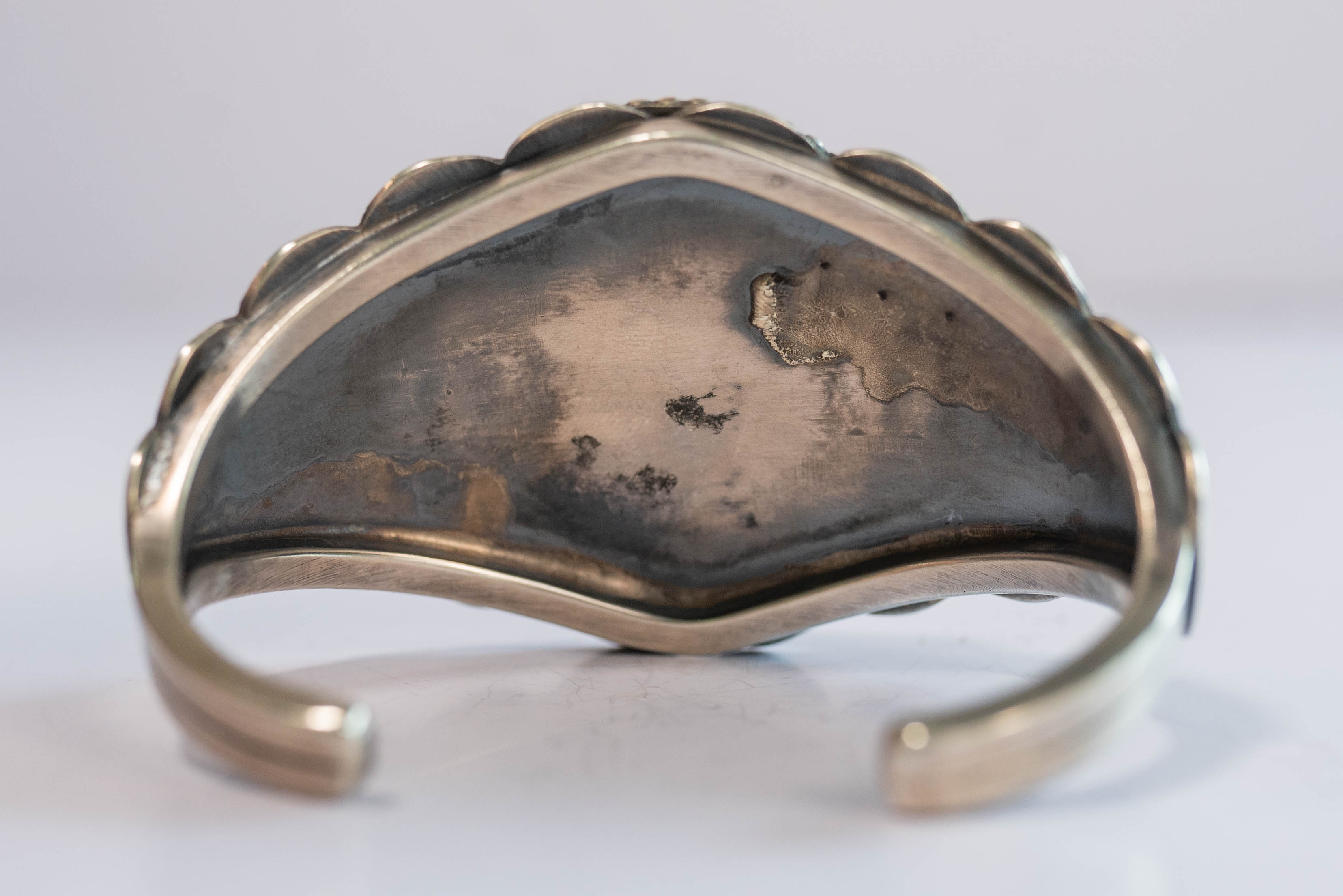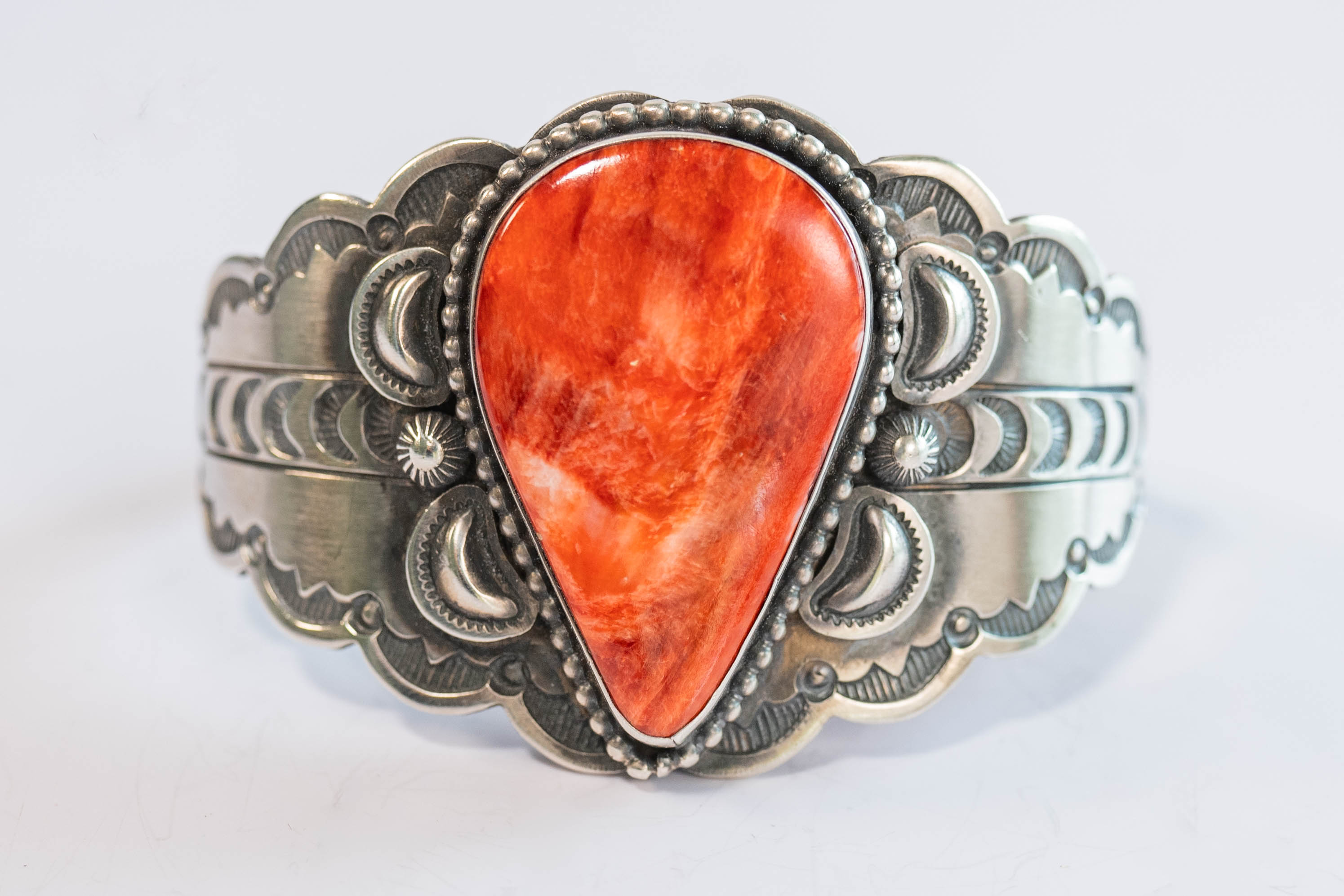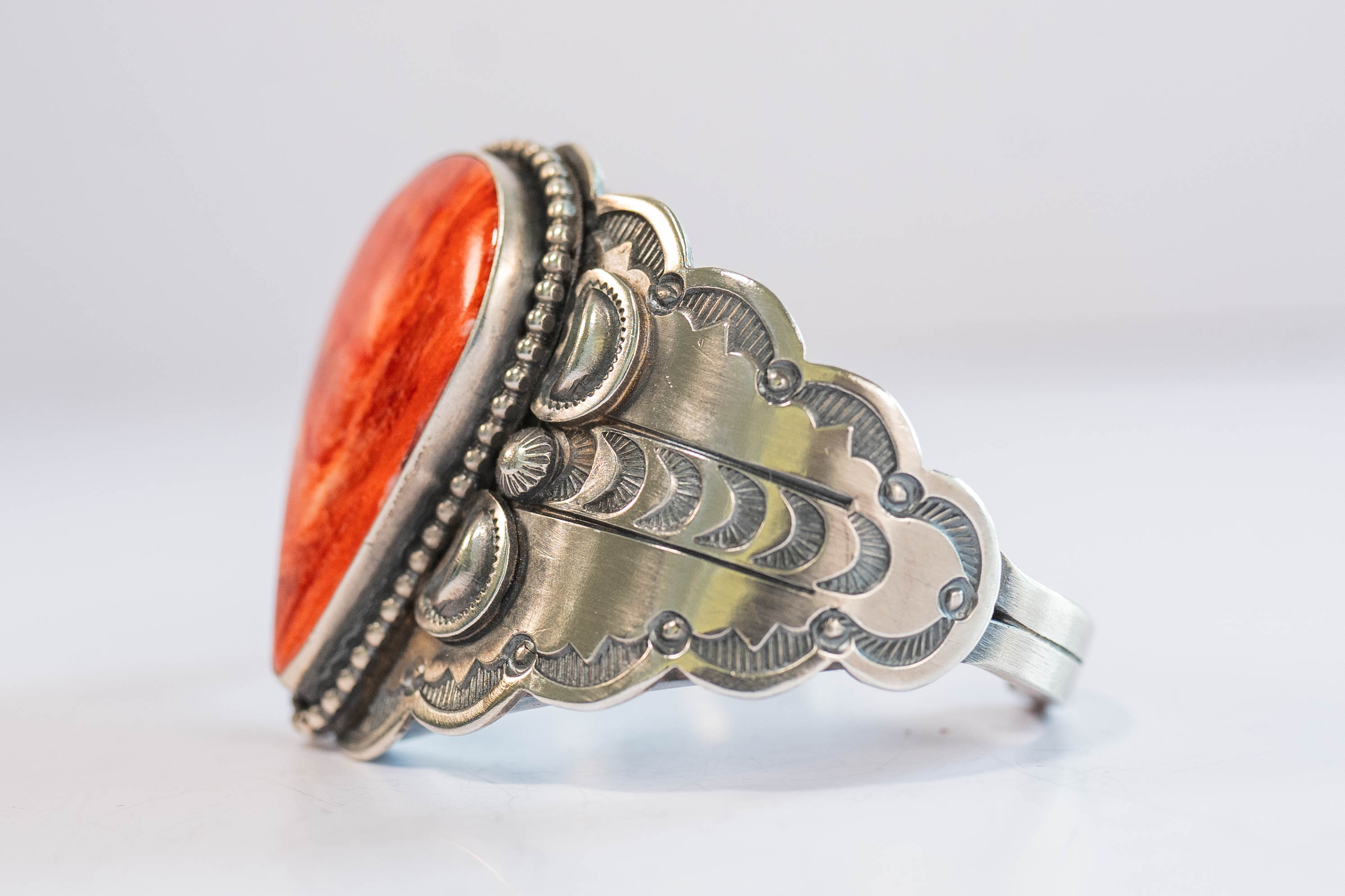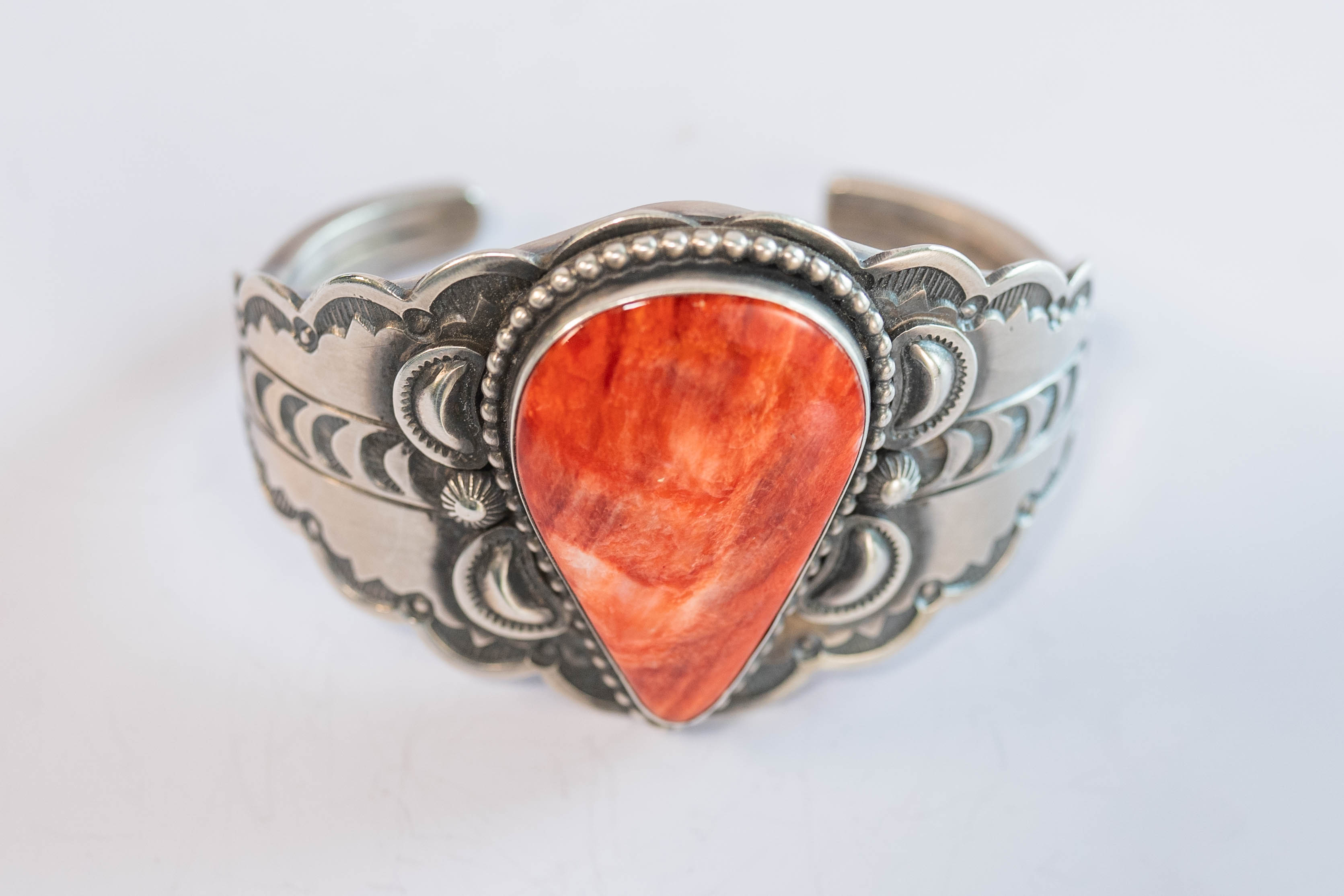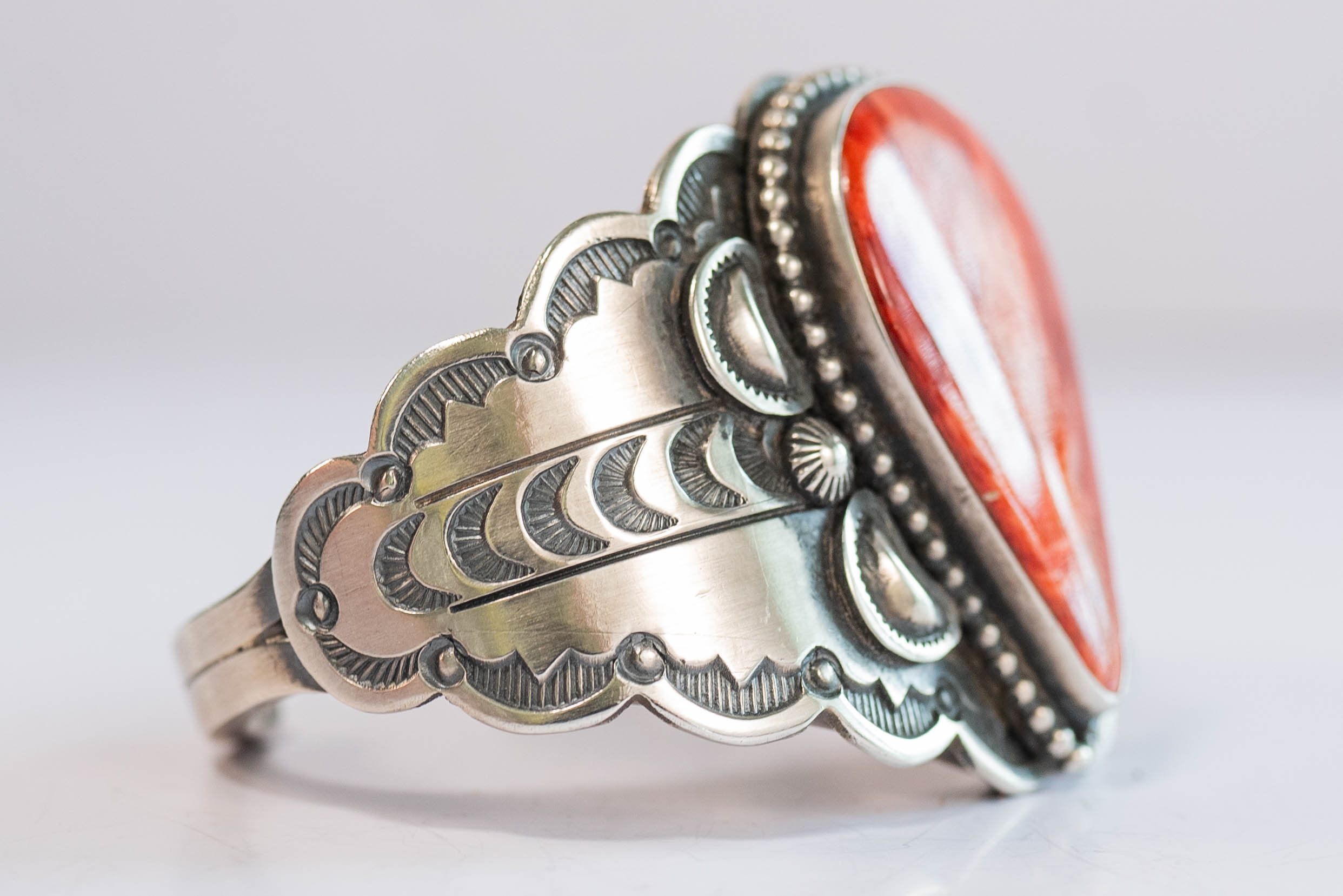 Native American Zuni sterling silver cuff bracelet featuring a AAAA Red Spiny Oyster Shell center stone L 1 1/2″ x W 1 1/8″surrounded by sterling silver beads. This detailed cuff is hand stamped and hand carved with sterling silver appliques and scalloped edges. Size 6 1/2 Gap 1 1/4″ Width 1 1/2 tapers to 1/4″. 80gr