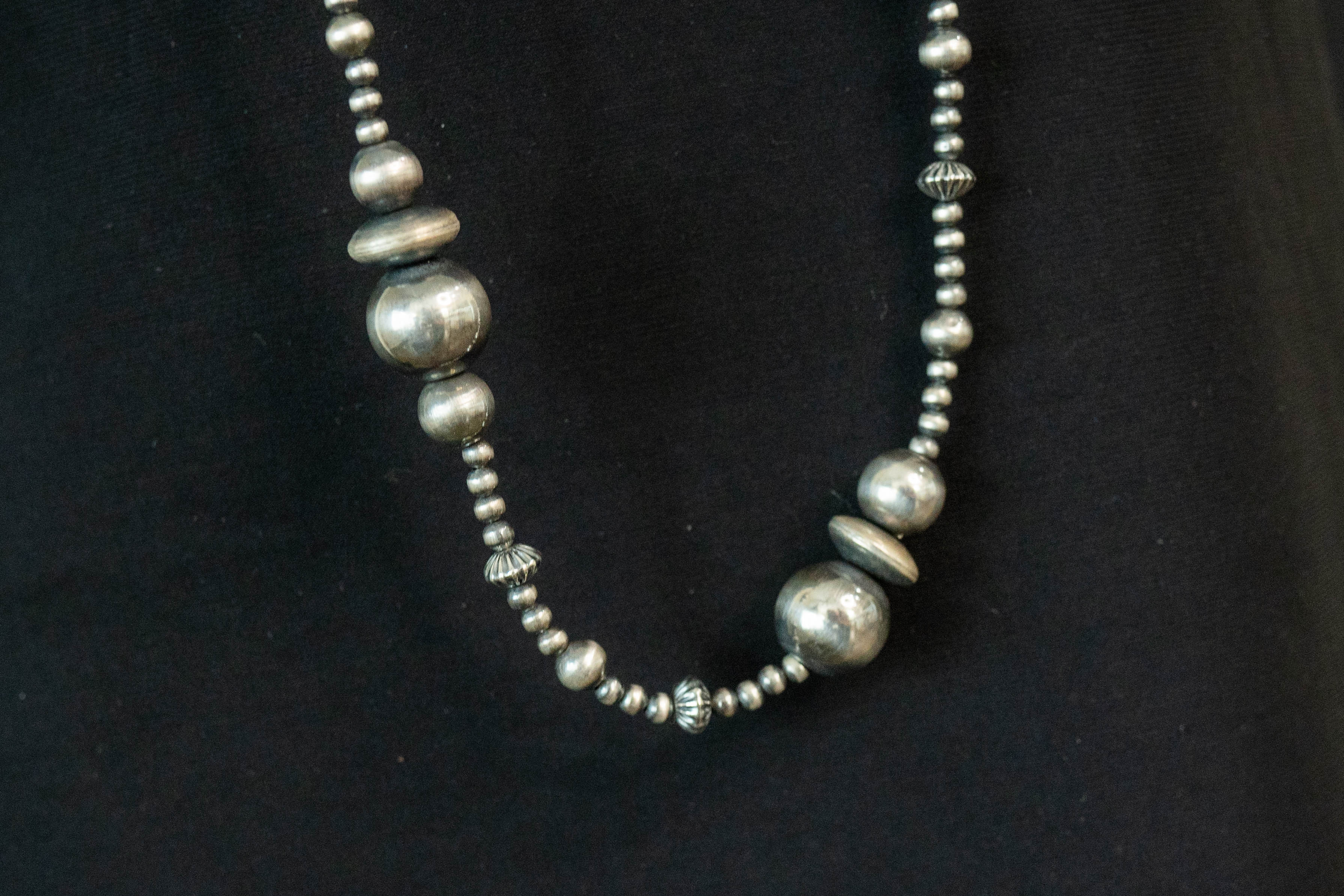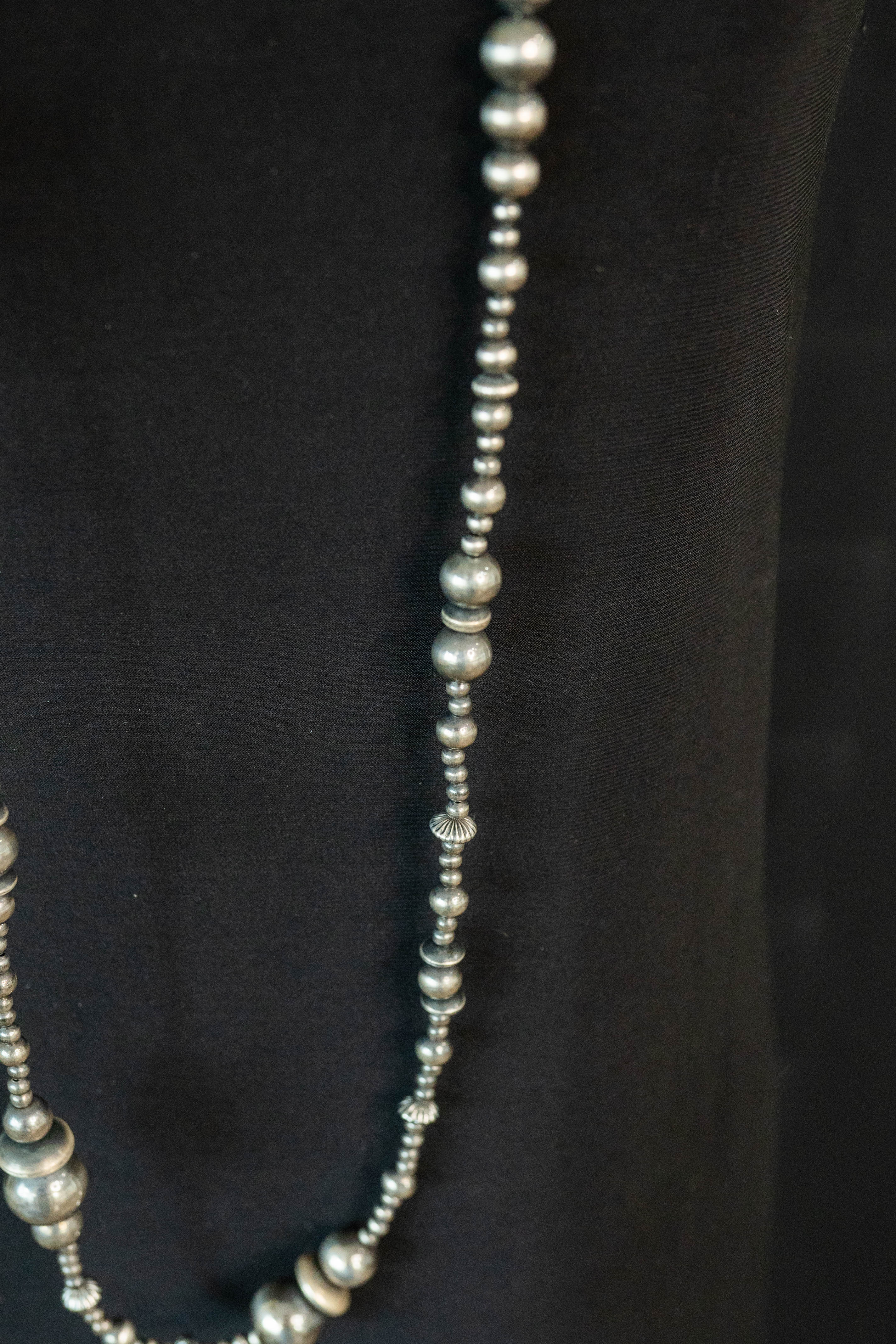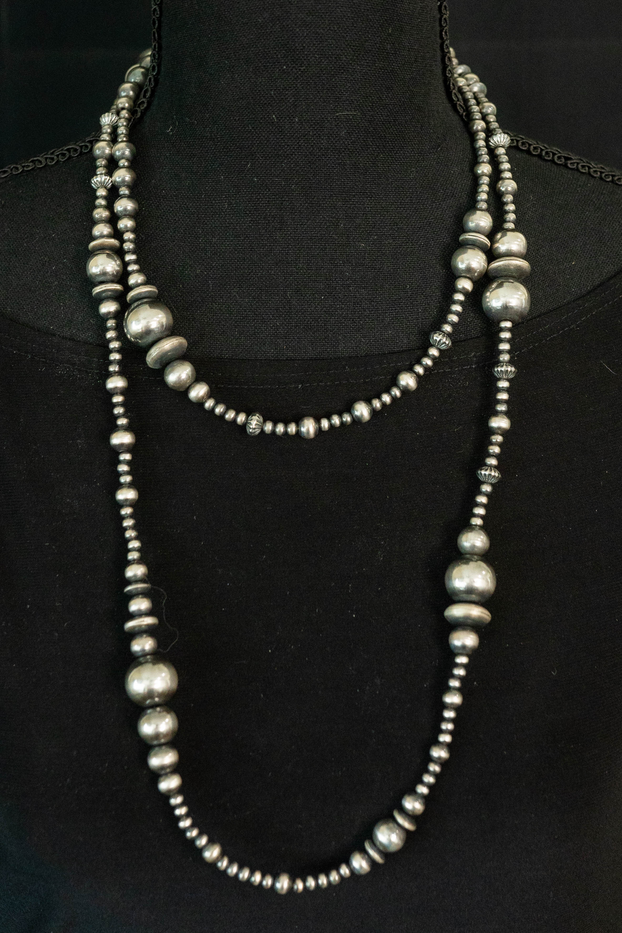 Native American sterling silver Navajo Pearl necklace 49 1/2″ long with various bead designs ranging from 4mm to 15.5mm.