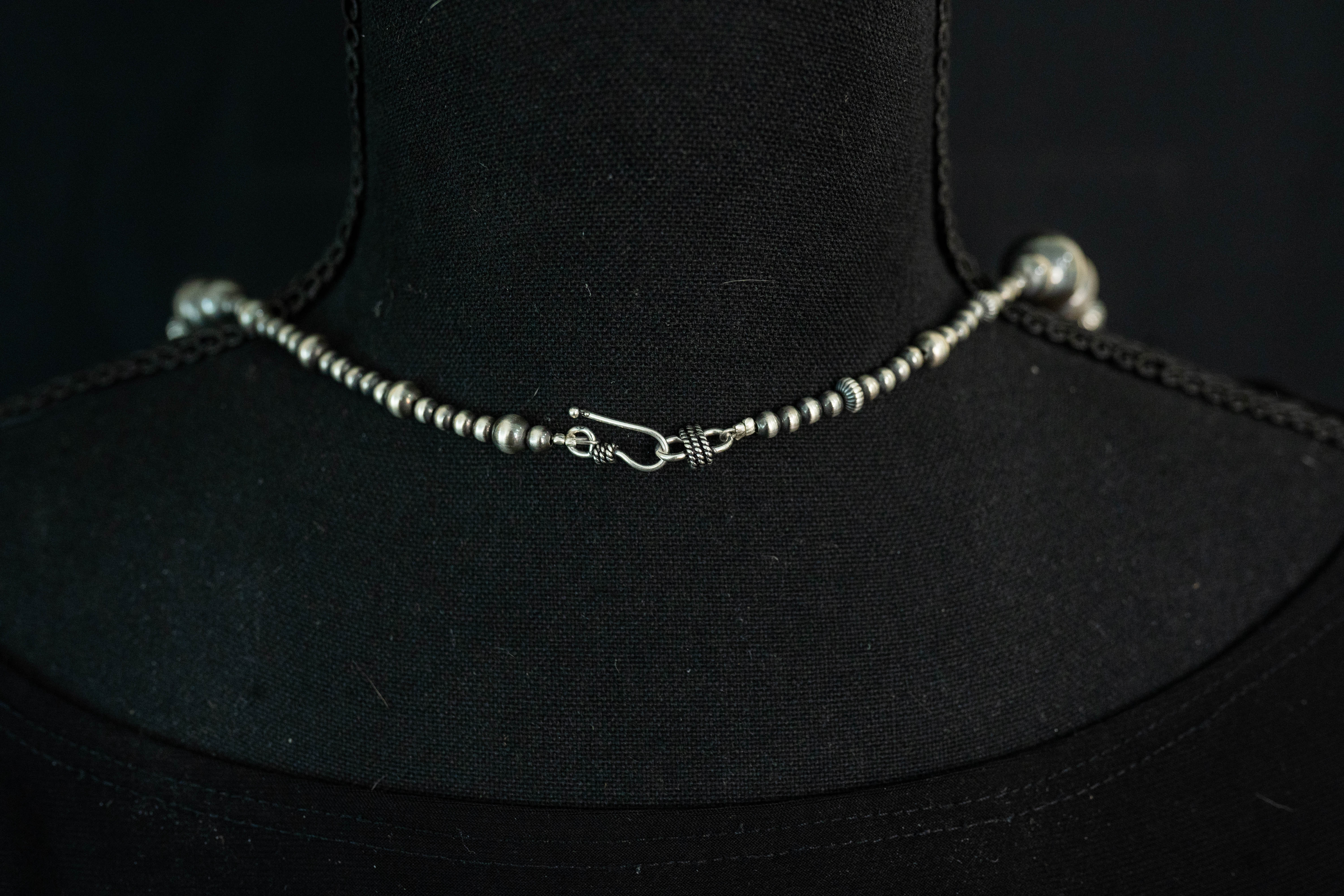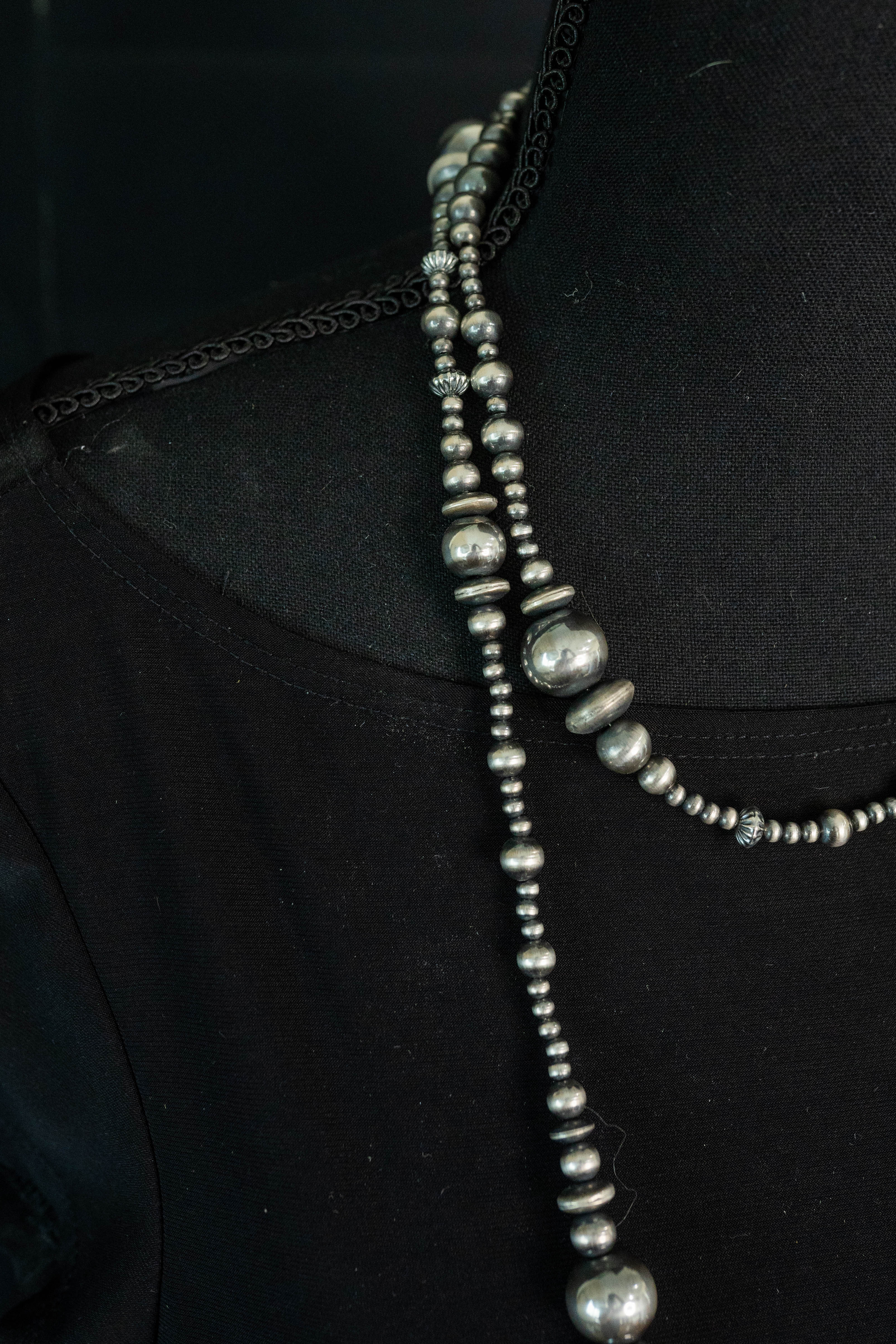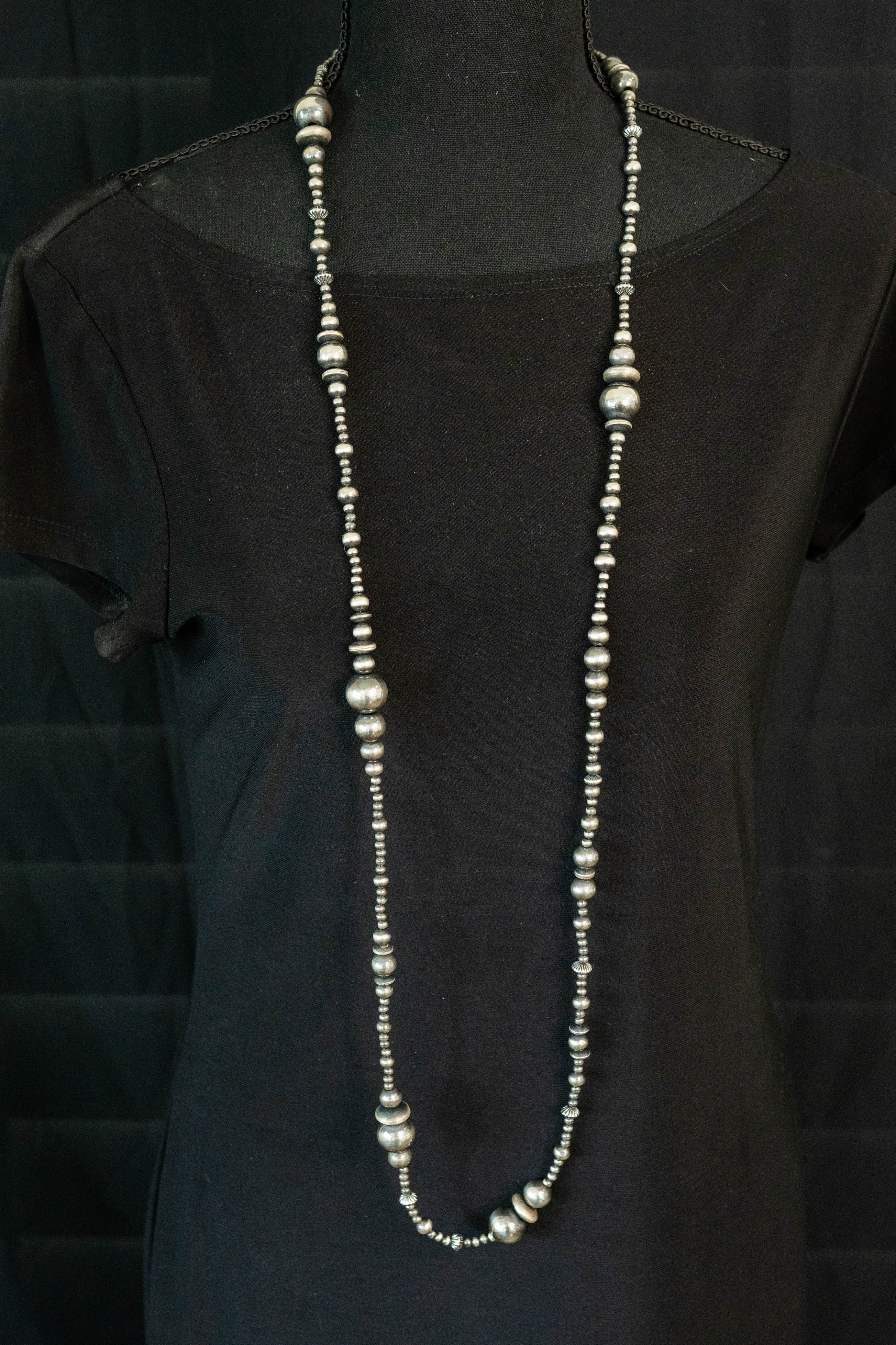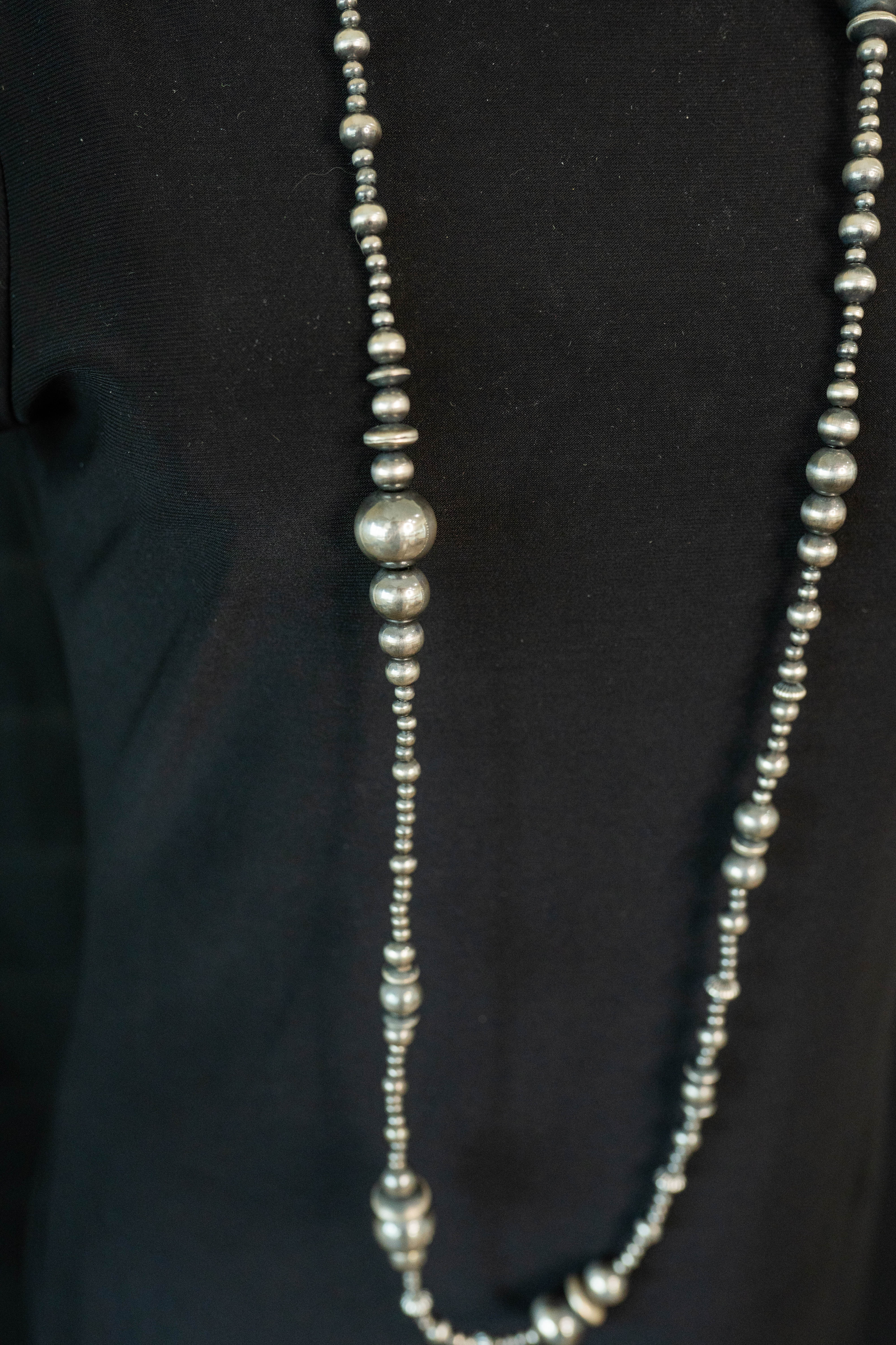 Native American sterling silver Navajo Pearl necklace 49 1/2″ long with various bead designs ranging from 4mm to 15.5mm.