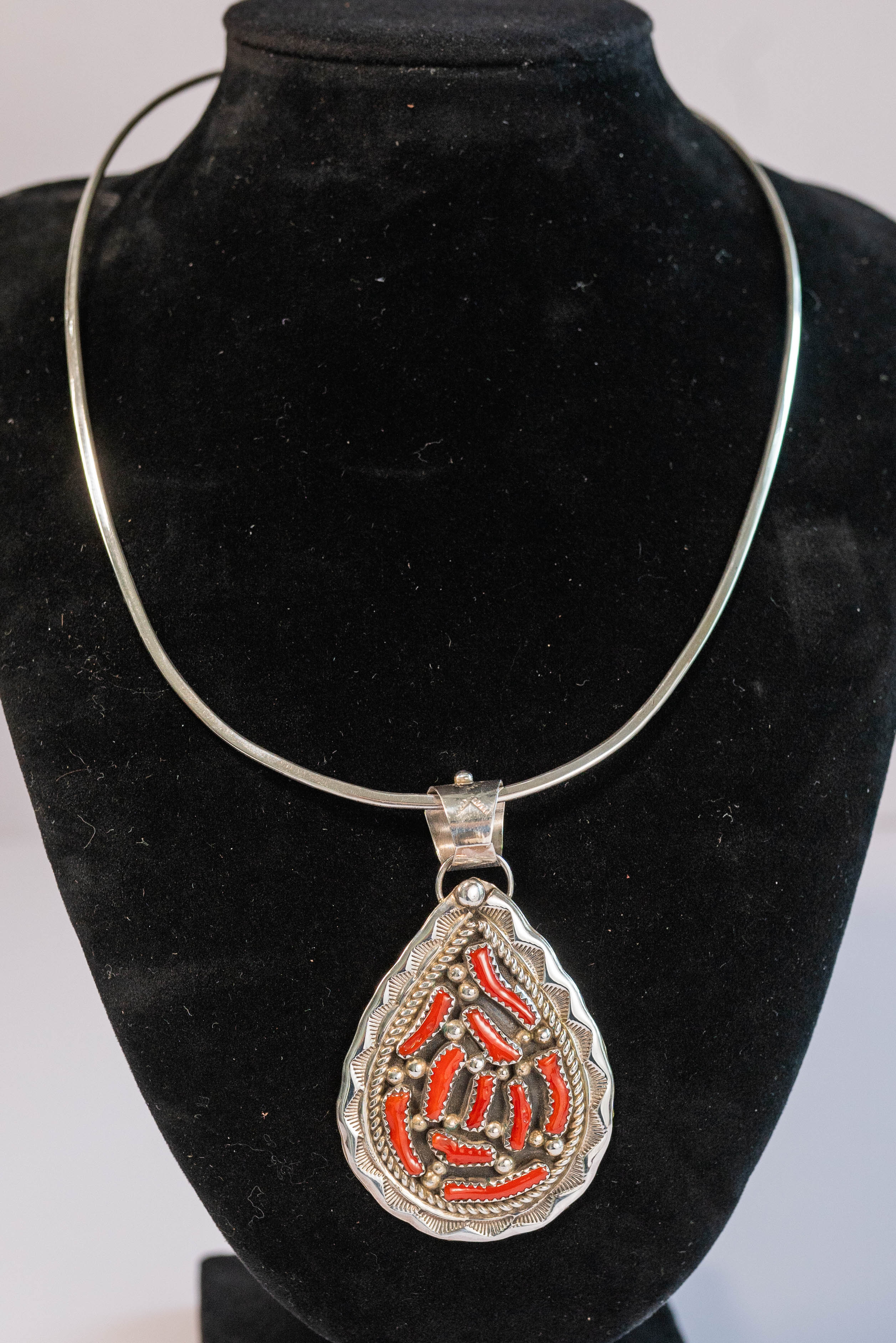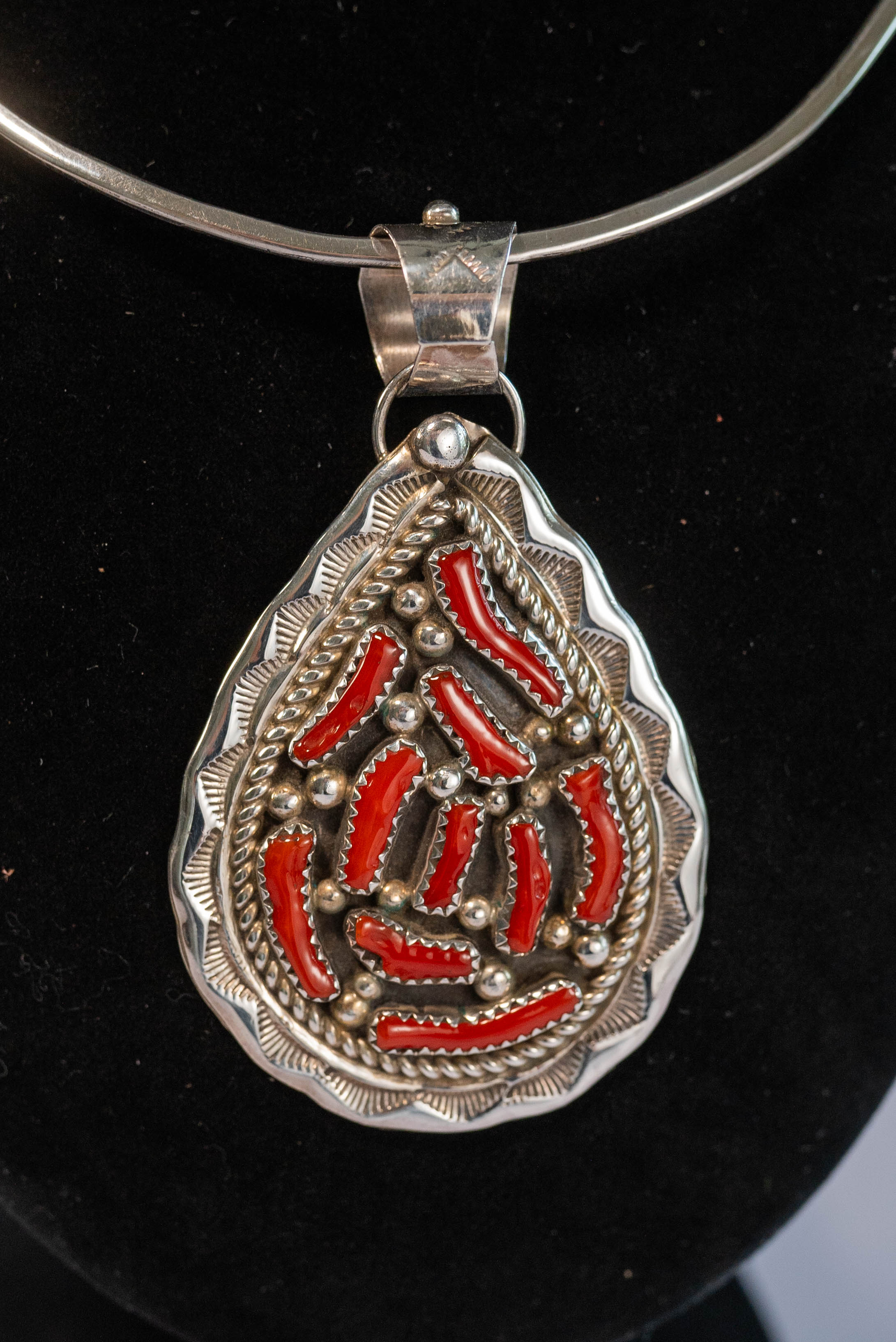 Native American Navajo Vintage sterling silver pendant hand tooled and hand stamped with 10 Mediterranean coral gemstones sterling silver bead appliqués and twisted wire pendant is on a 927 Mexican sterling silver slide 6″ x 4.625″ the pendant is 2 1/2″ x 1 5/8″ signed with a mountain and pine trees pictorial hallmark 35 g