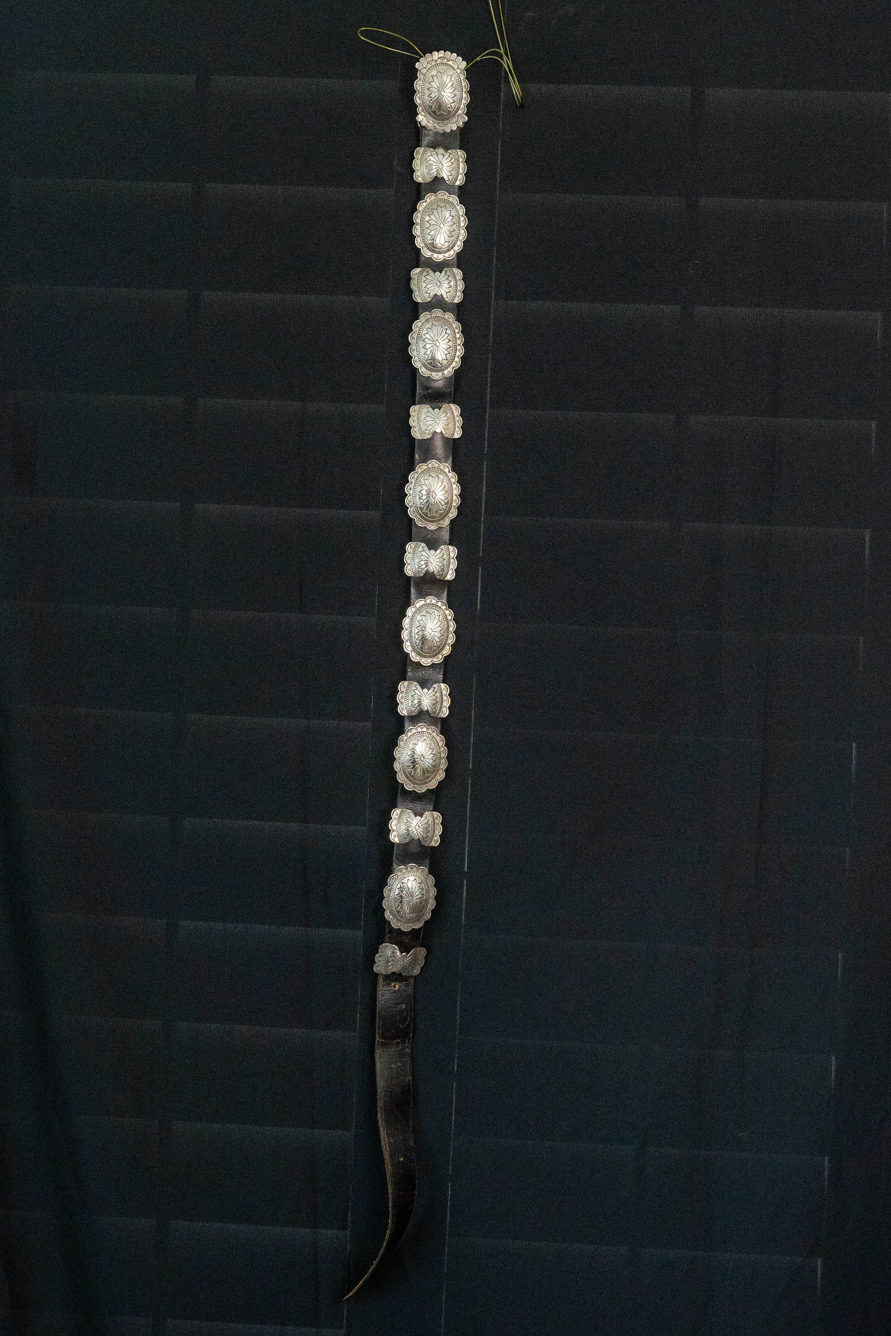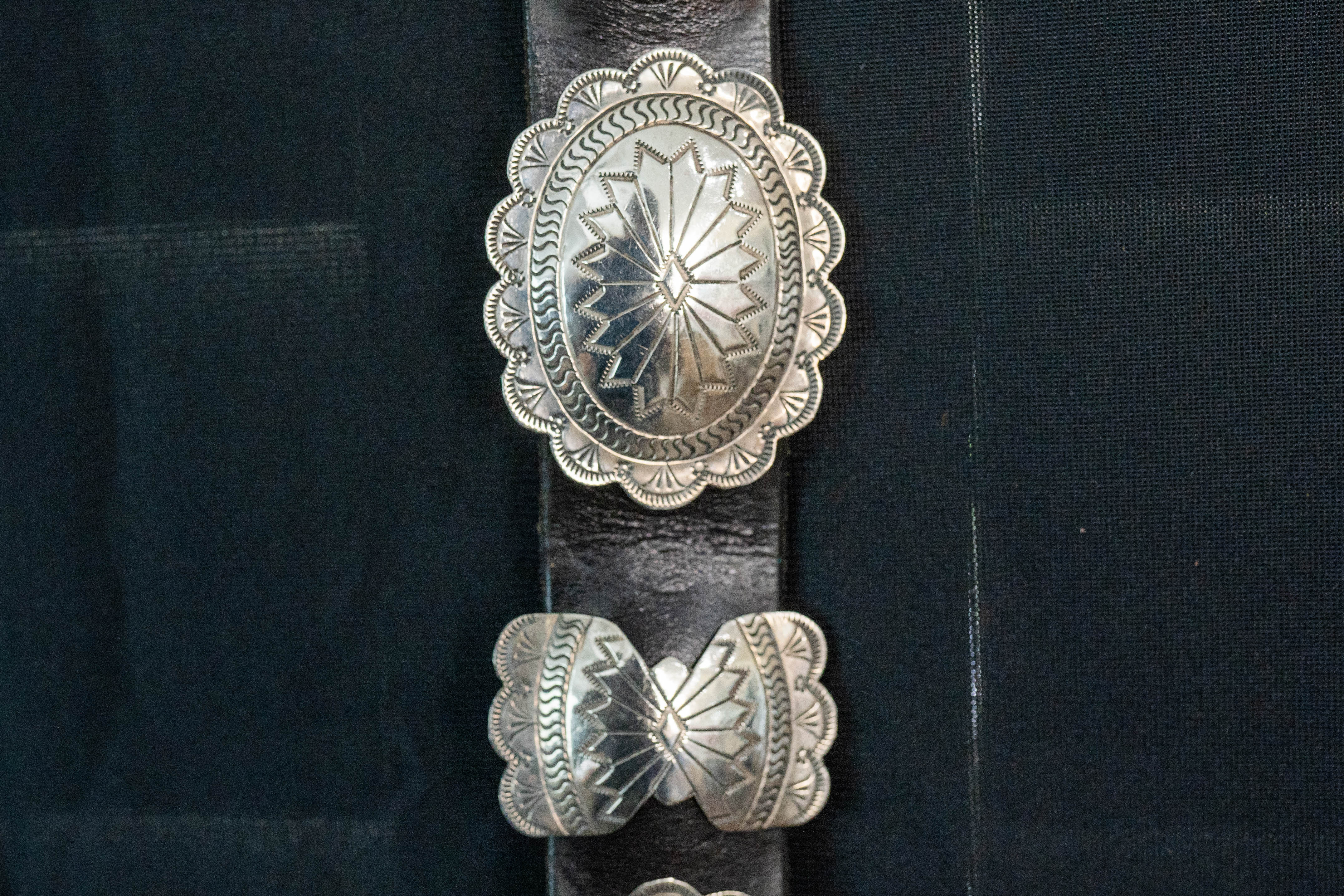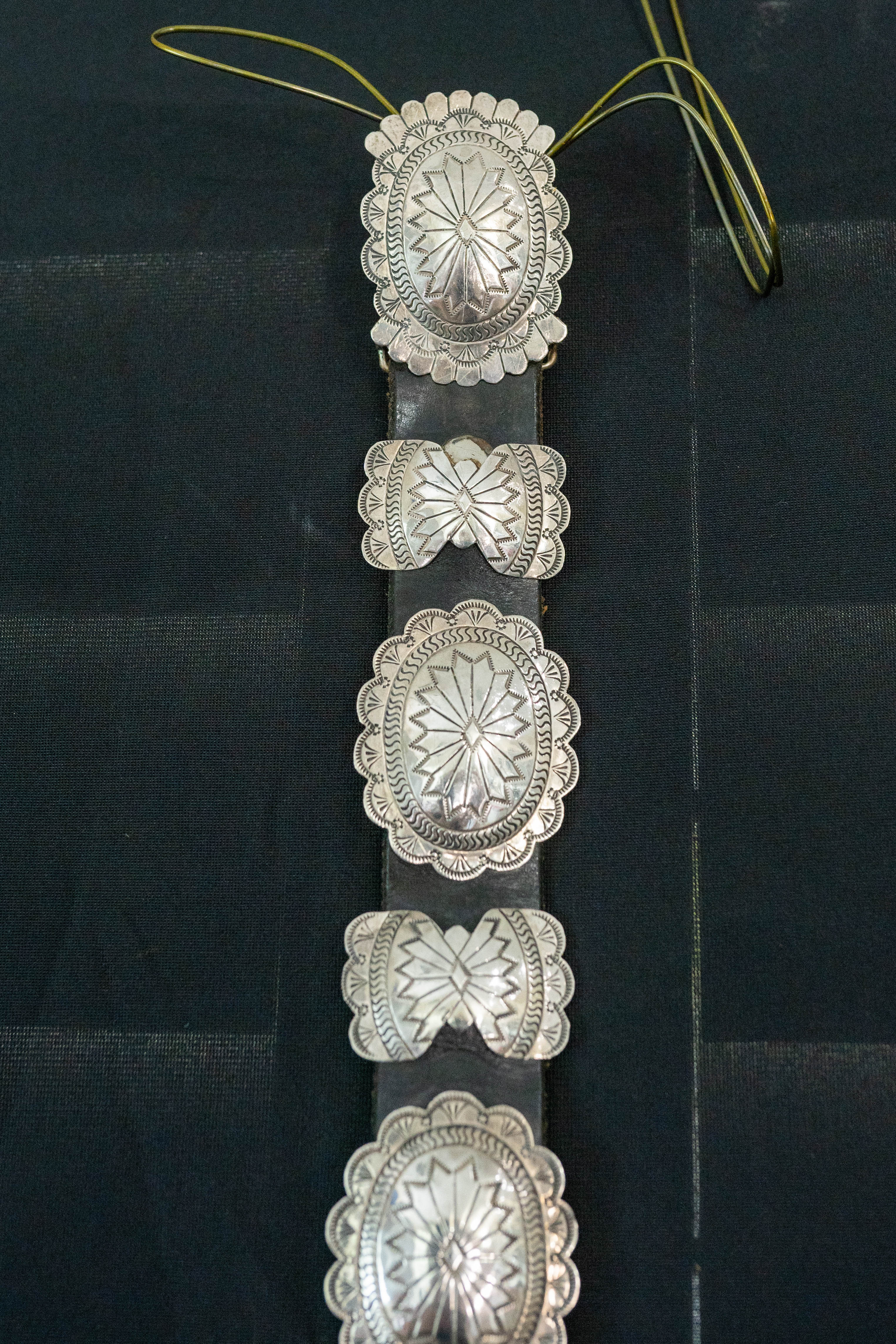 Native American Navajo DJ Begay master silversmith sterling silver vintage Concho Belt hand tooled and hand stamped with intricate detailing and scalloped edges.48 inches long belt buckle 3″ x 2″ seven bow Conchos 2″ x 1.375″ six Conchos round 2.5″ x 2″ 295 g
