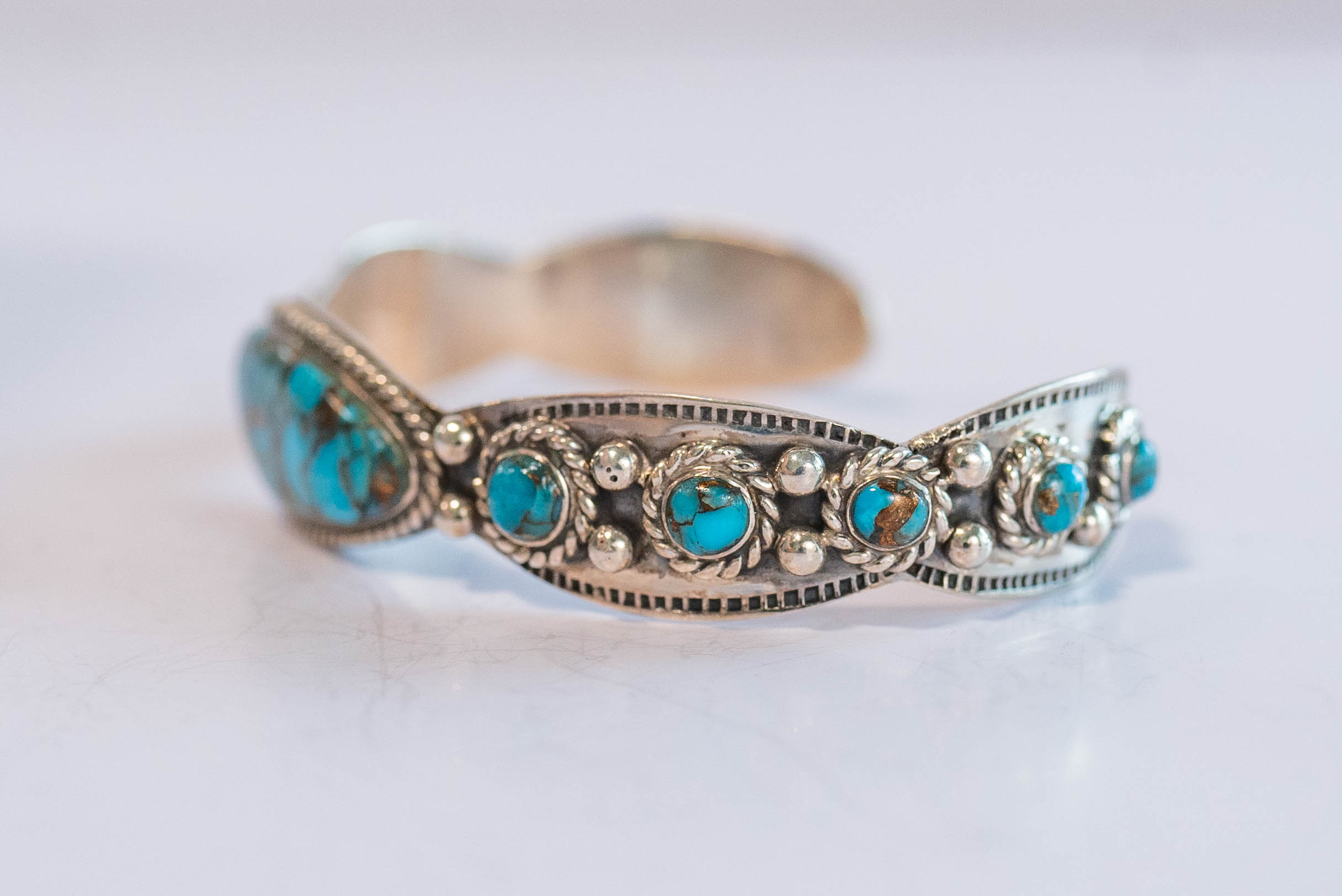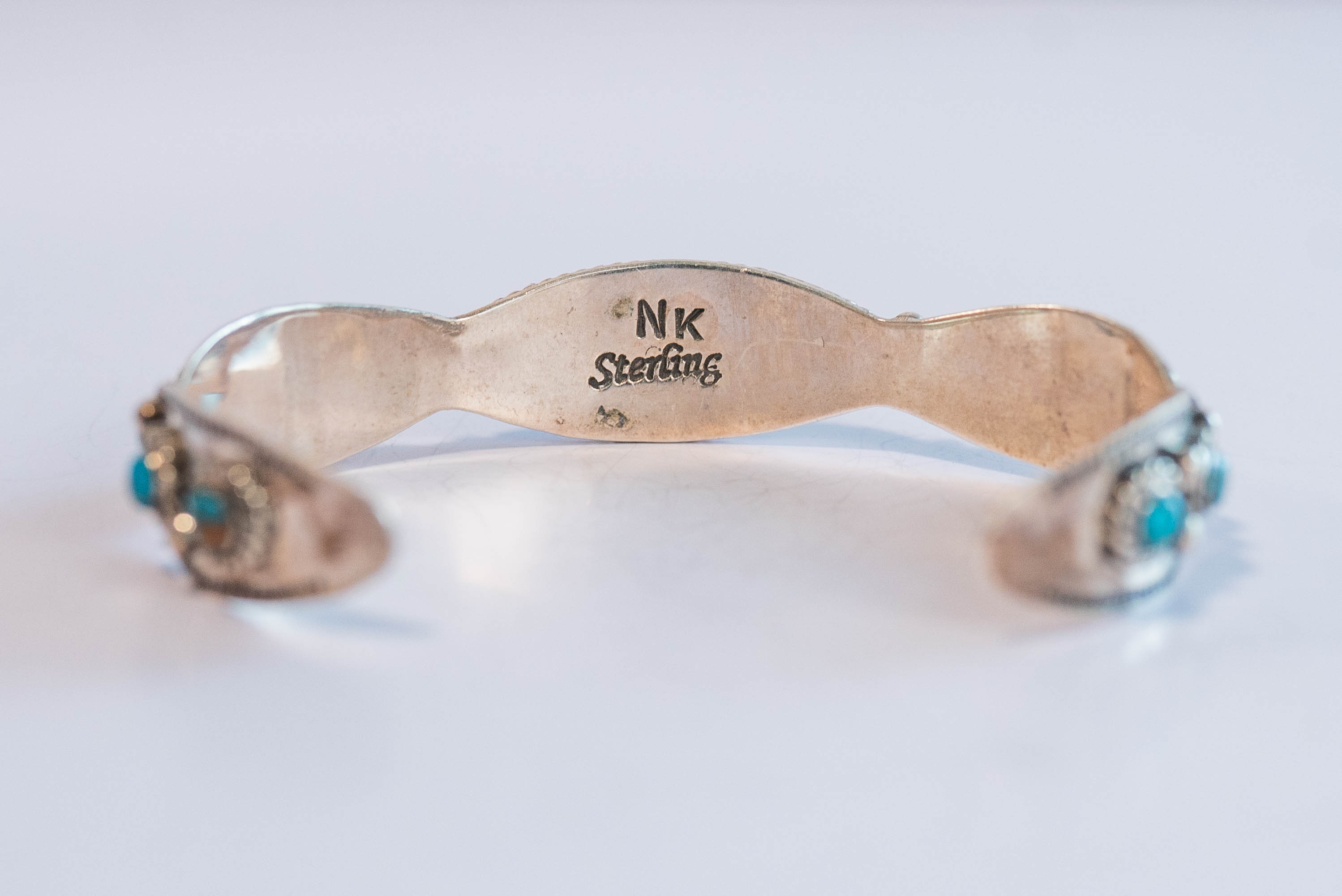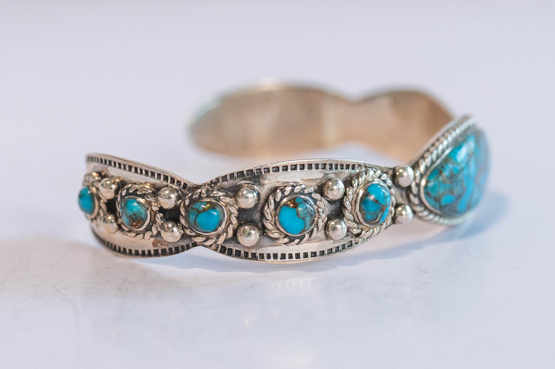Native American Navajo sterling silver rare Blue Mojave Turquoise beautifully detailed sterling silver vintage cuff bracelet with a center gemstone L 1 1/4″ x W 1/2″ (10) round gemstones with sterling silver twisted wire and dot appliques with scalloped edges. Size 6 3/4 Gap 1 1/2″ Width 5/8″ Signed NK 20gr