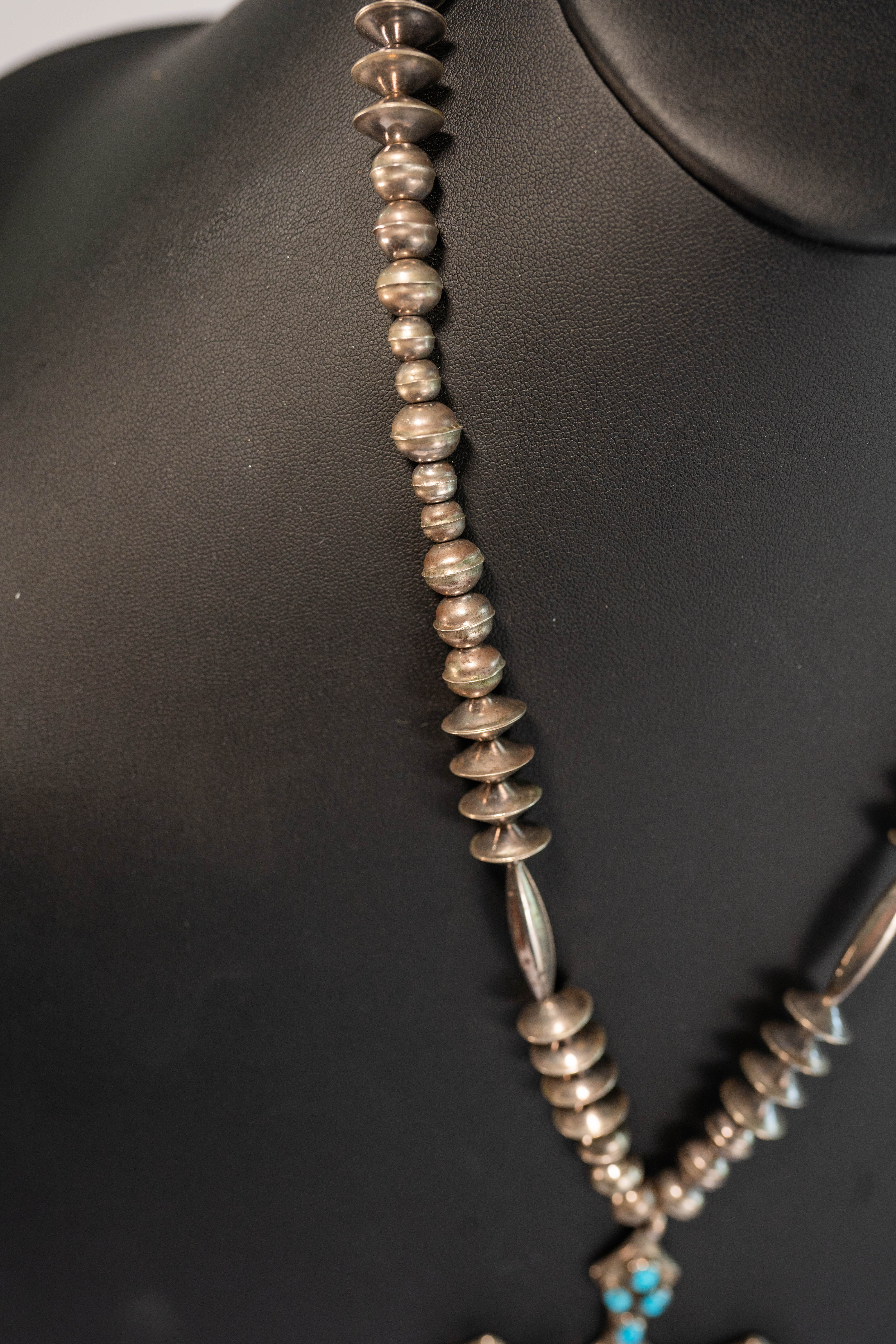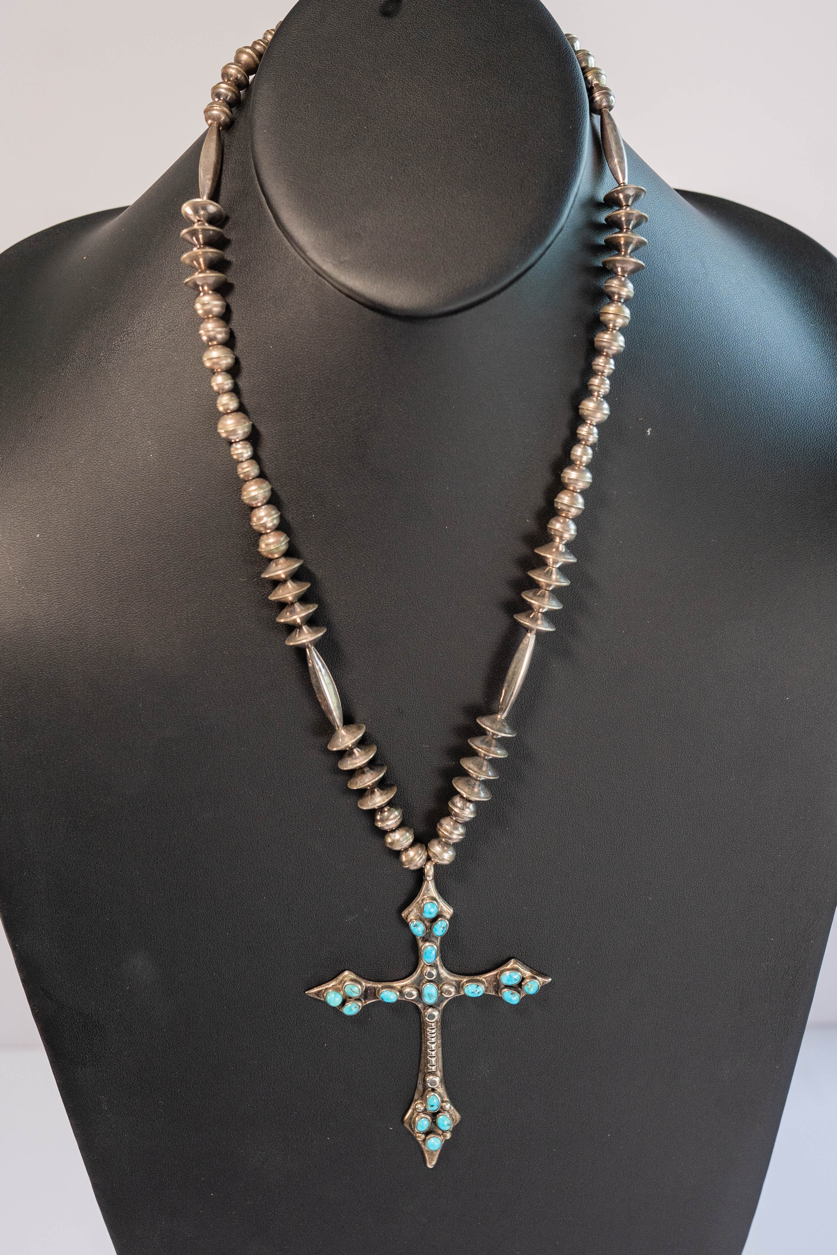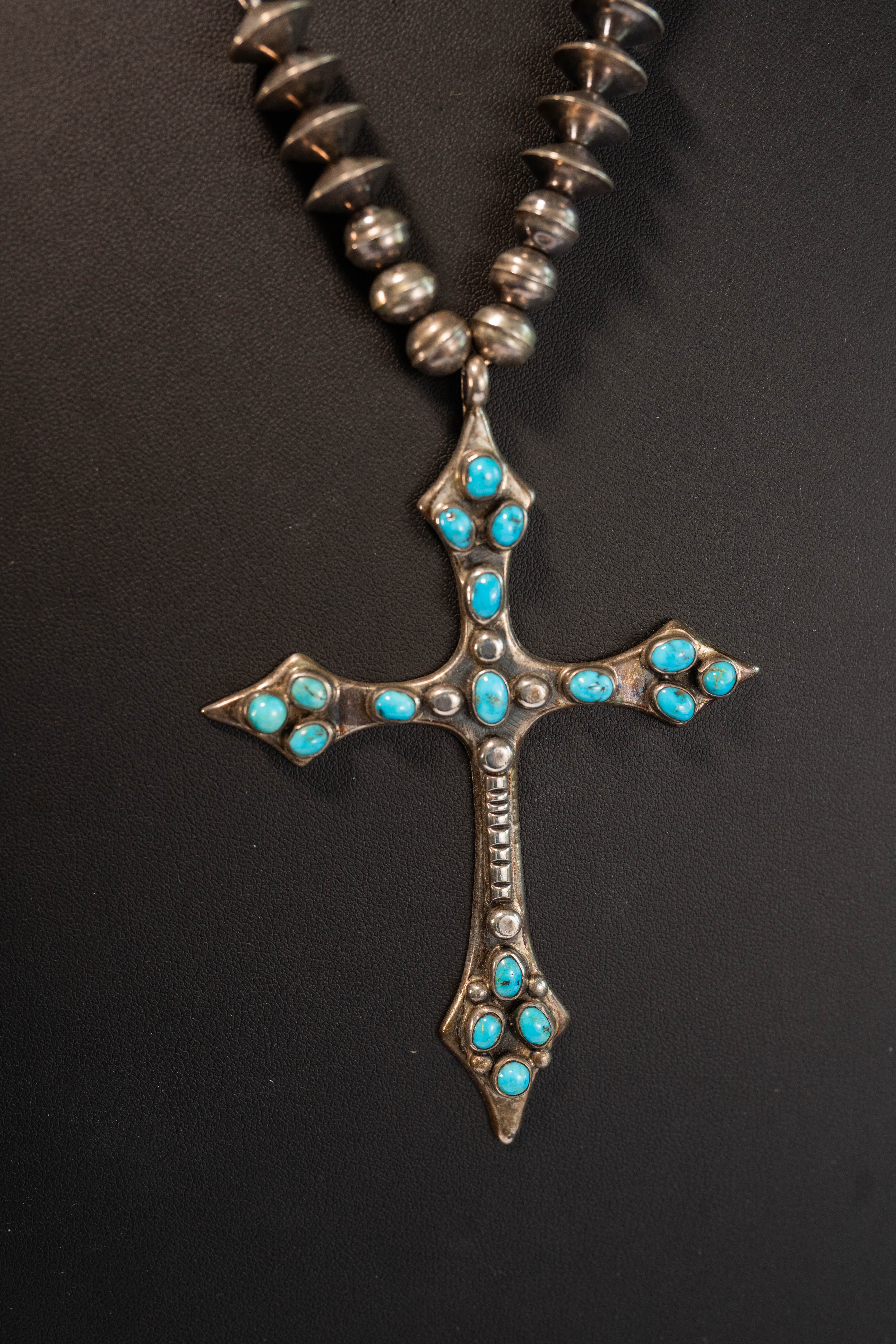 Native American Navajo vintage sterling silver cross pendant necklace with sleeping beauty turquoise gemstones Navajo pearls with natural patina the necklace is 23 inch long the pendant is 4″ x 3″ overall length 27 inch 68 g