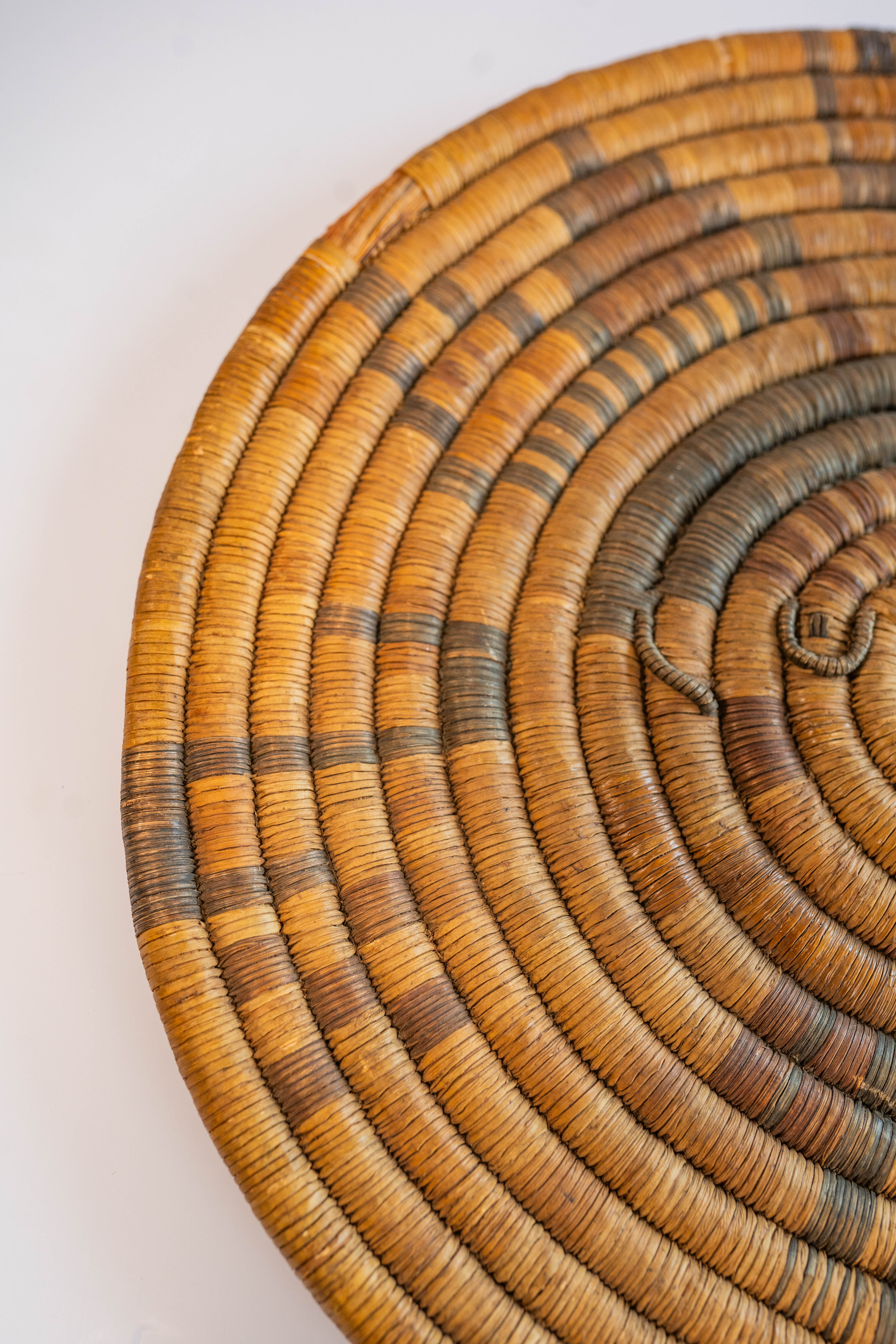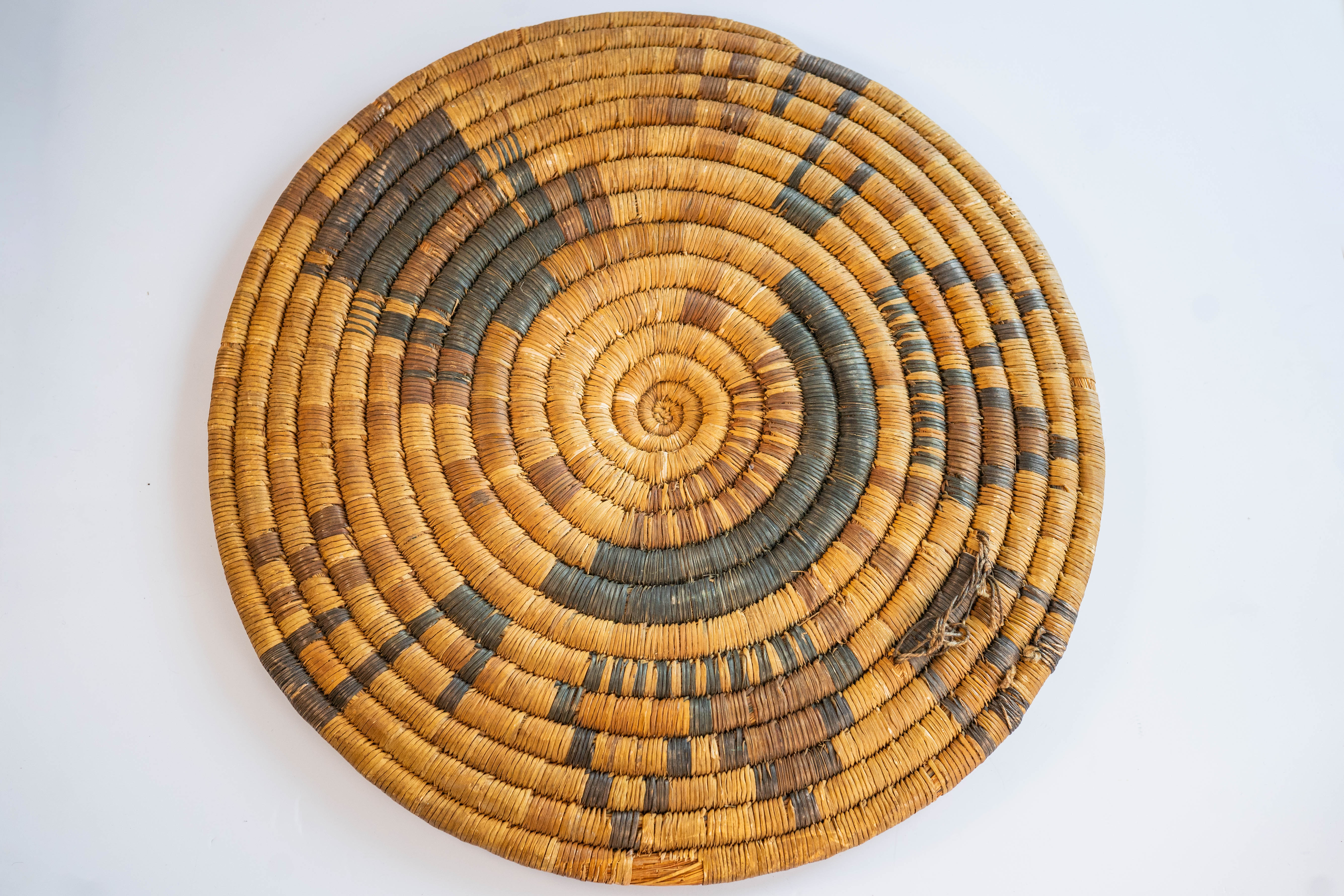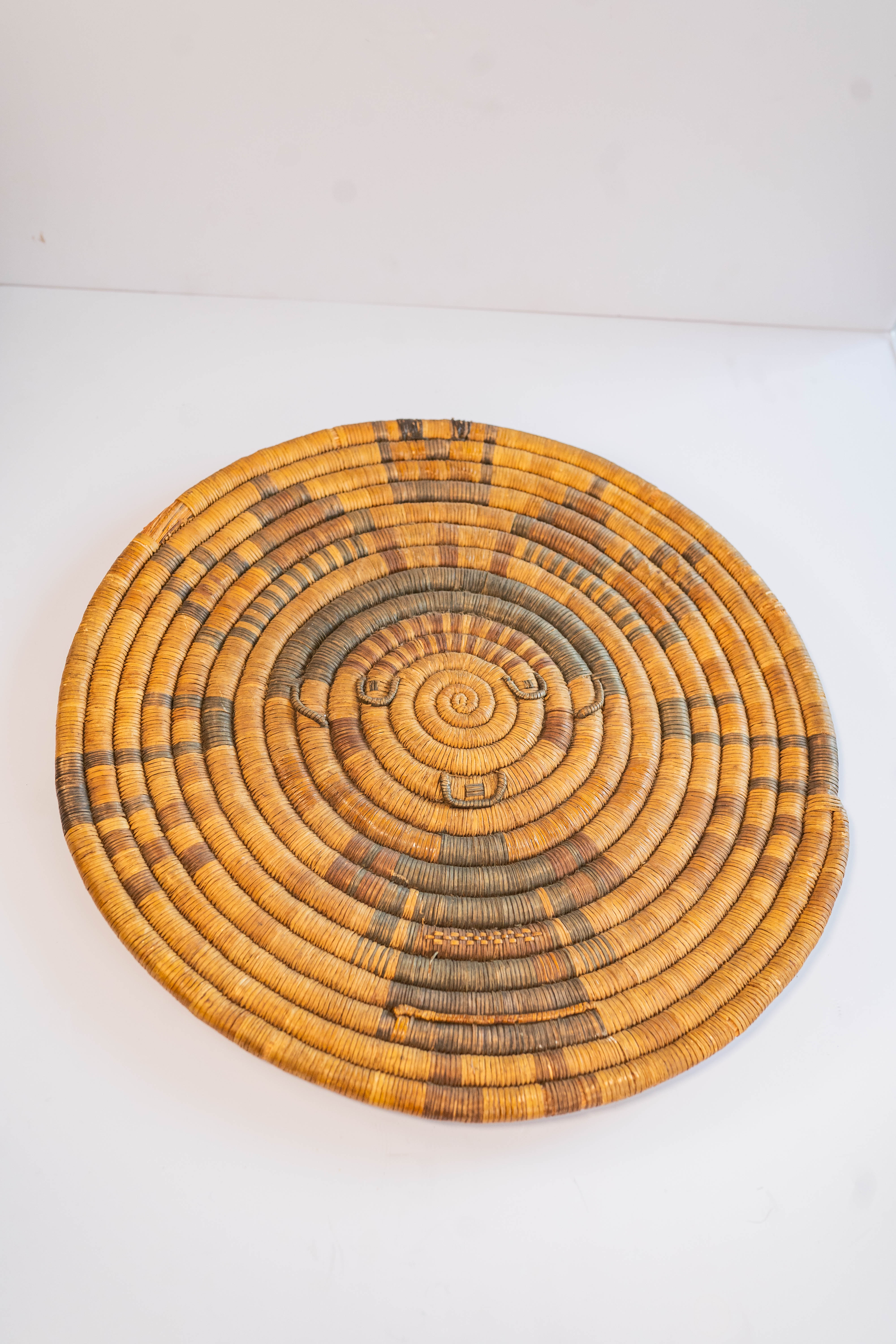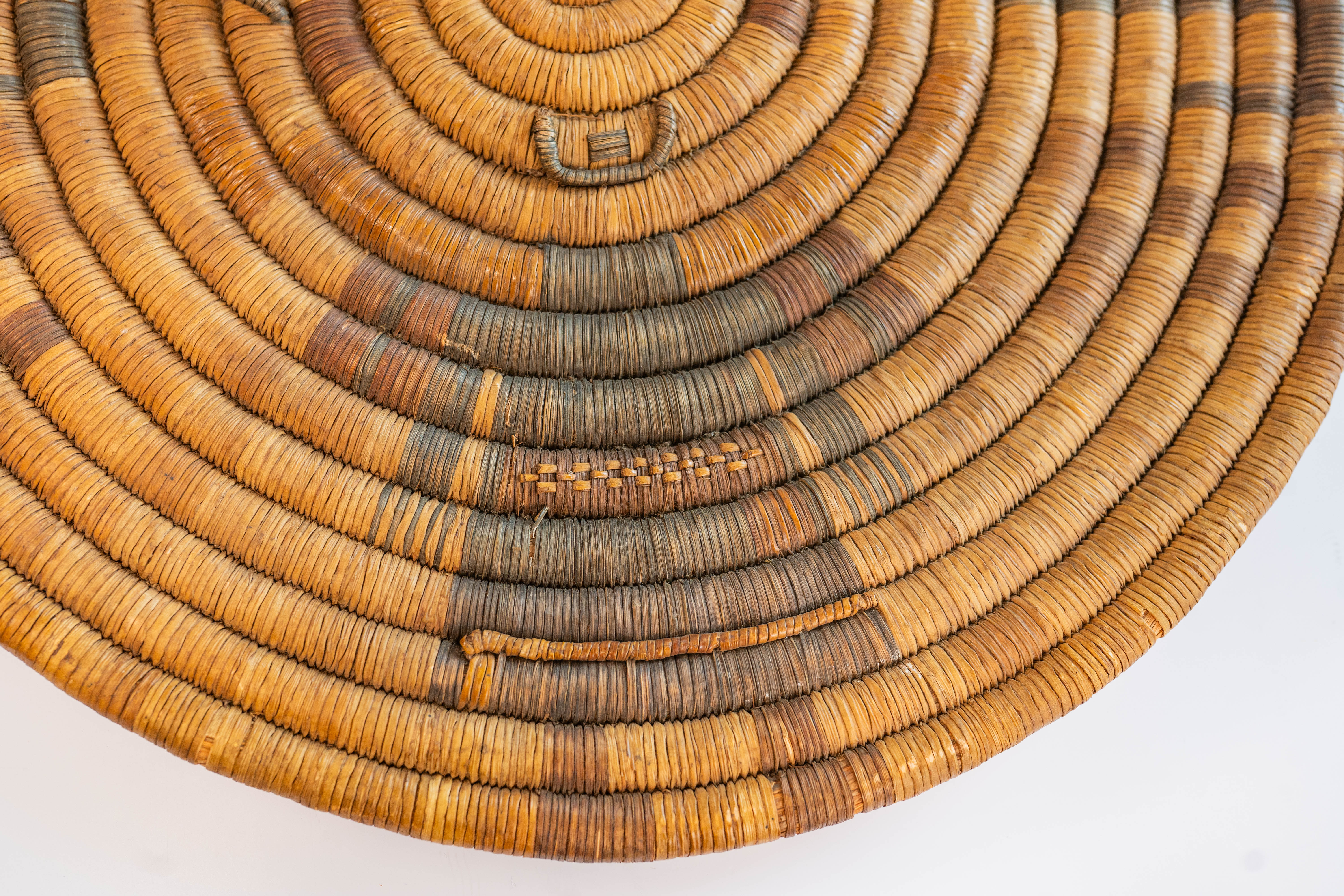 Hopi Early Action Period Circa 1930s coiled basketry plaque.The plaque was given to a new born by an uncle or other male relative. The Shalako spirit brings good fortune , protection, fertility and wisdom to the new tribe member. This piece is in particularly excellent condition owing no doubt to its sacred significance. 16″ diameter