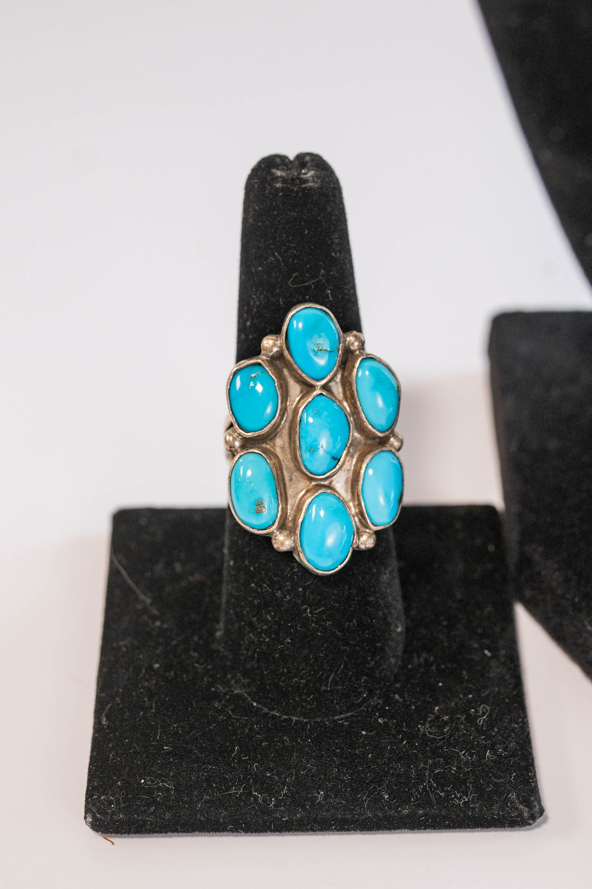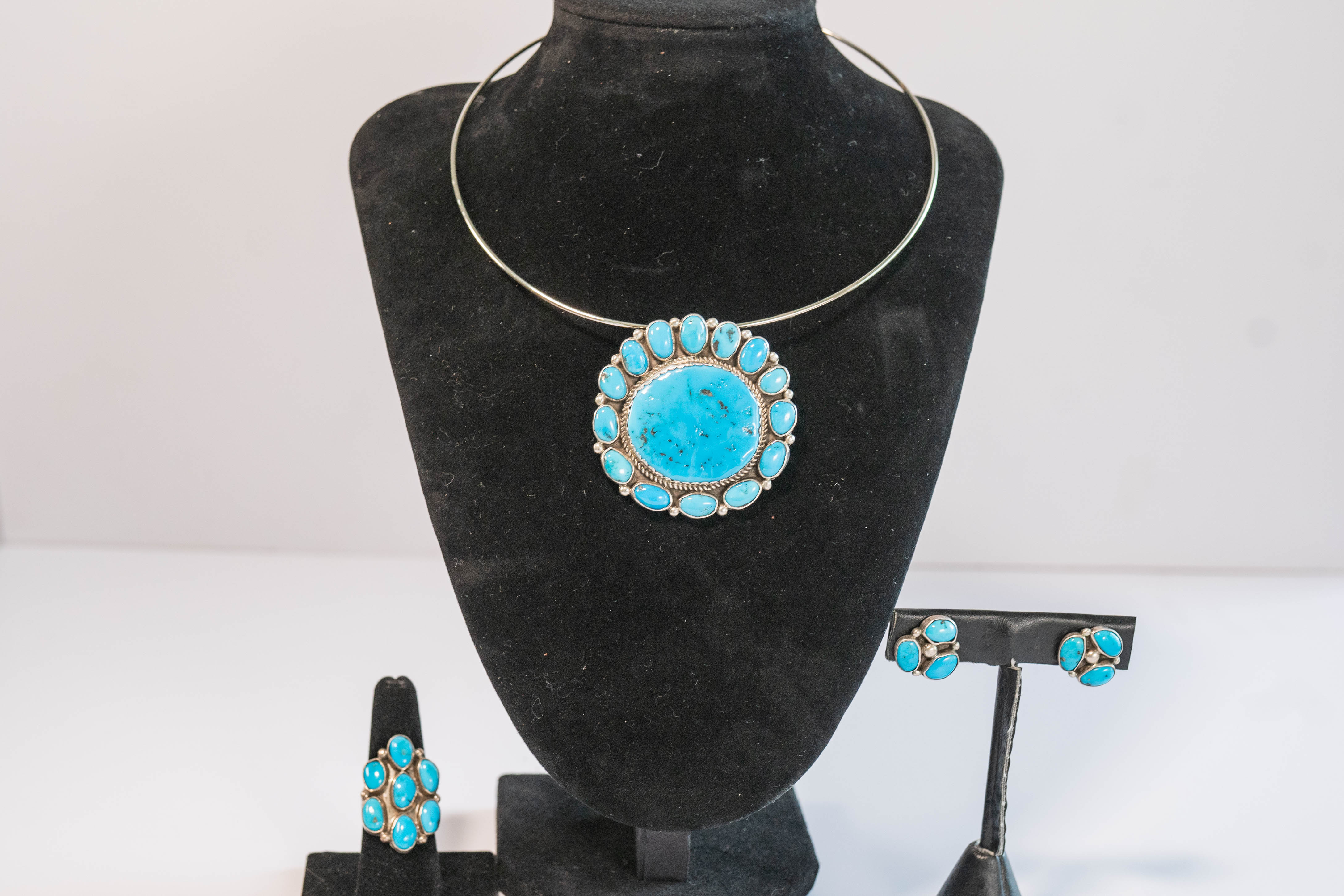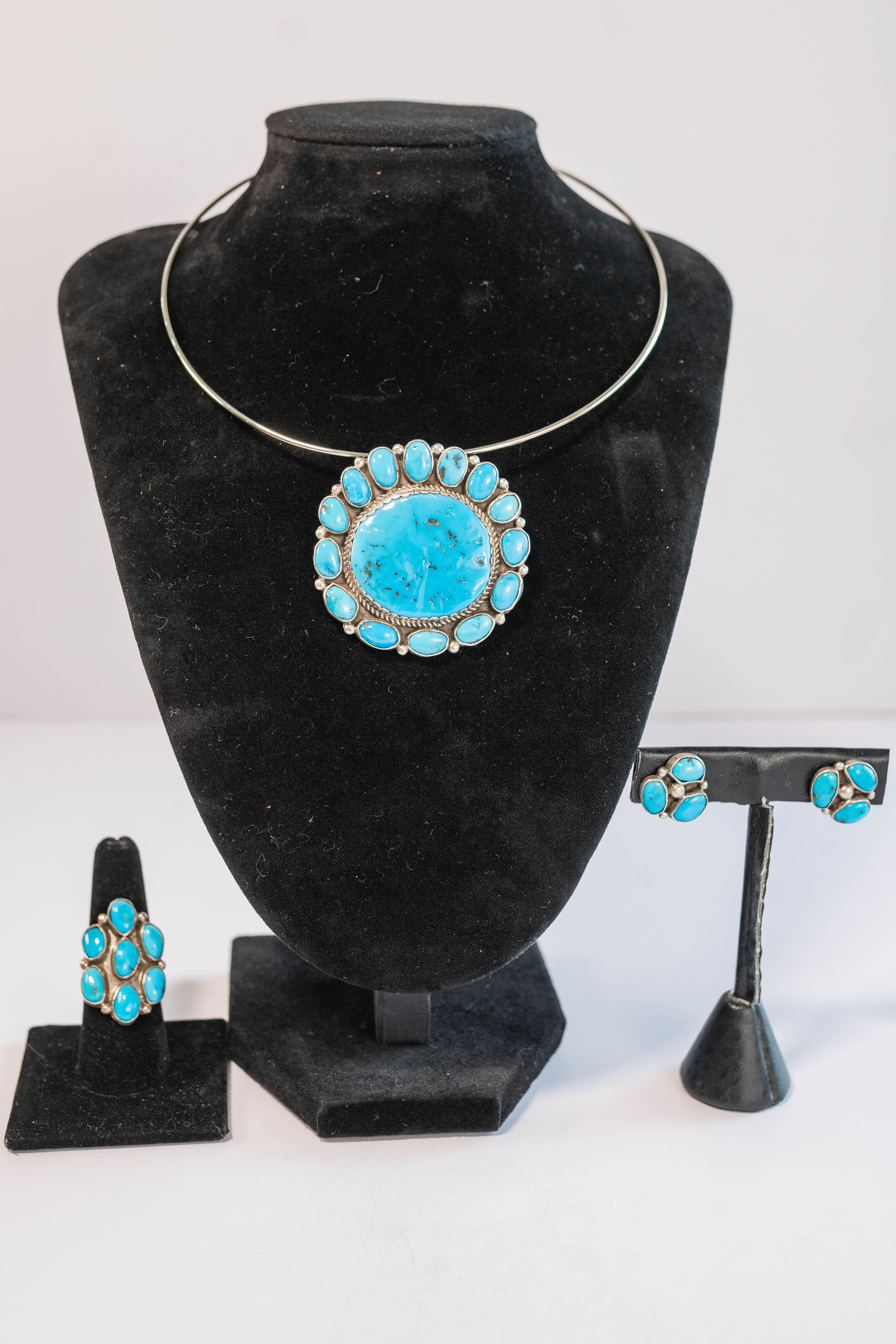 Native American Navajo E.H Gray sterling silver AAAA Morenci Turquoise. Vintage ensemble consisting of a pendant/ brooch, earrings and a ring. This Morenci Turquoise is a beautiful bright blue. Broach 2″ x 2″, Ring 7 1/4, Earrings 5/8″.