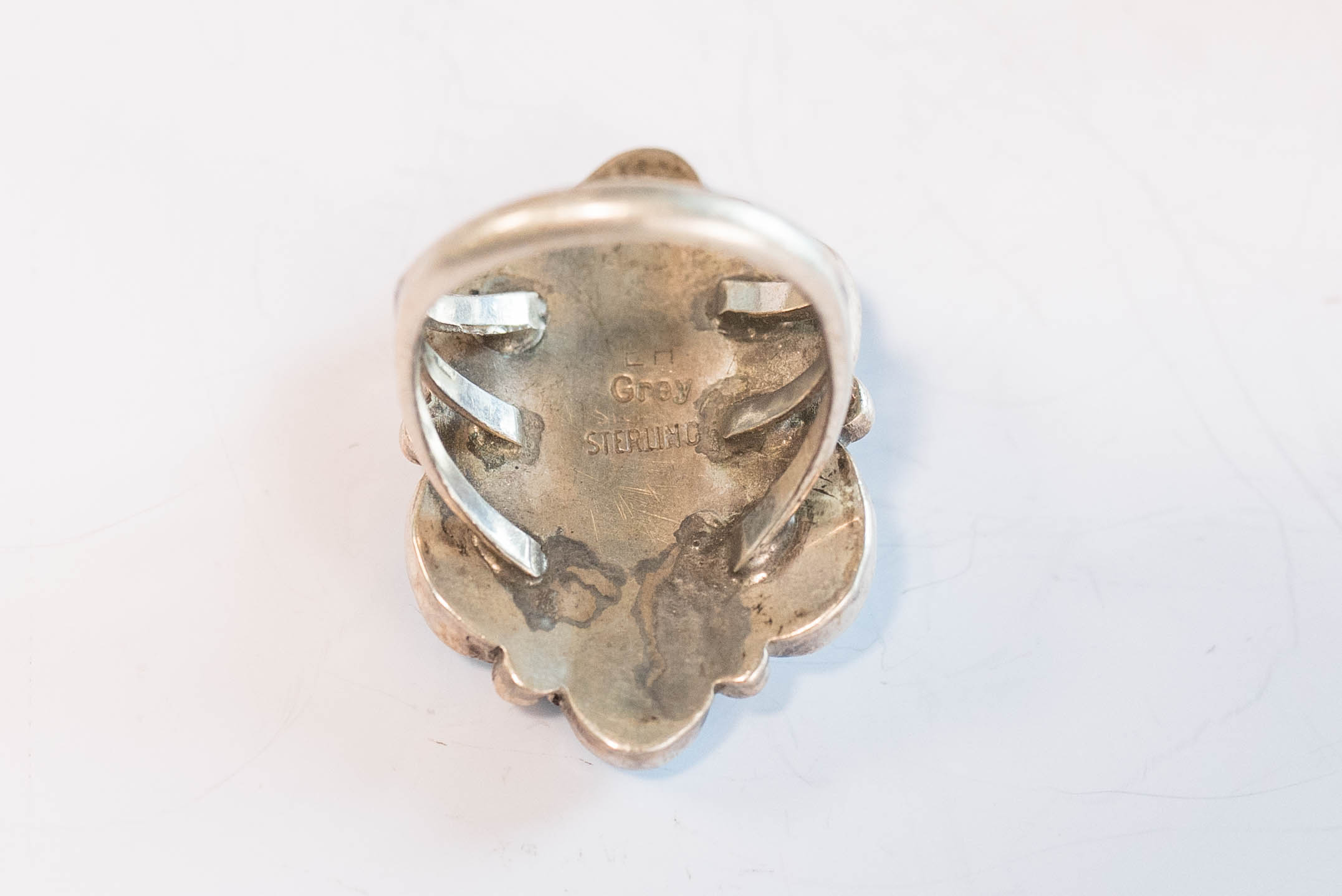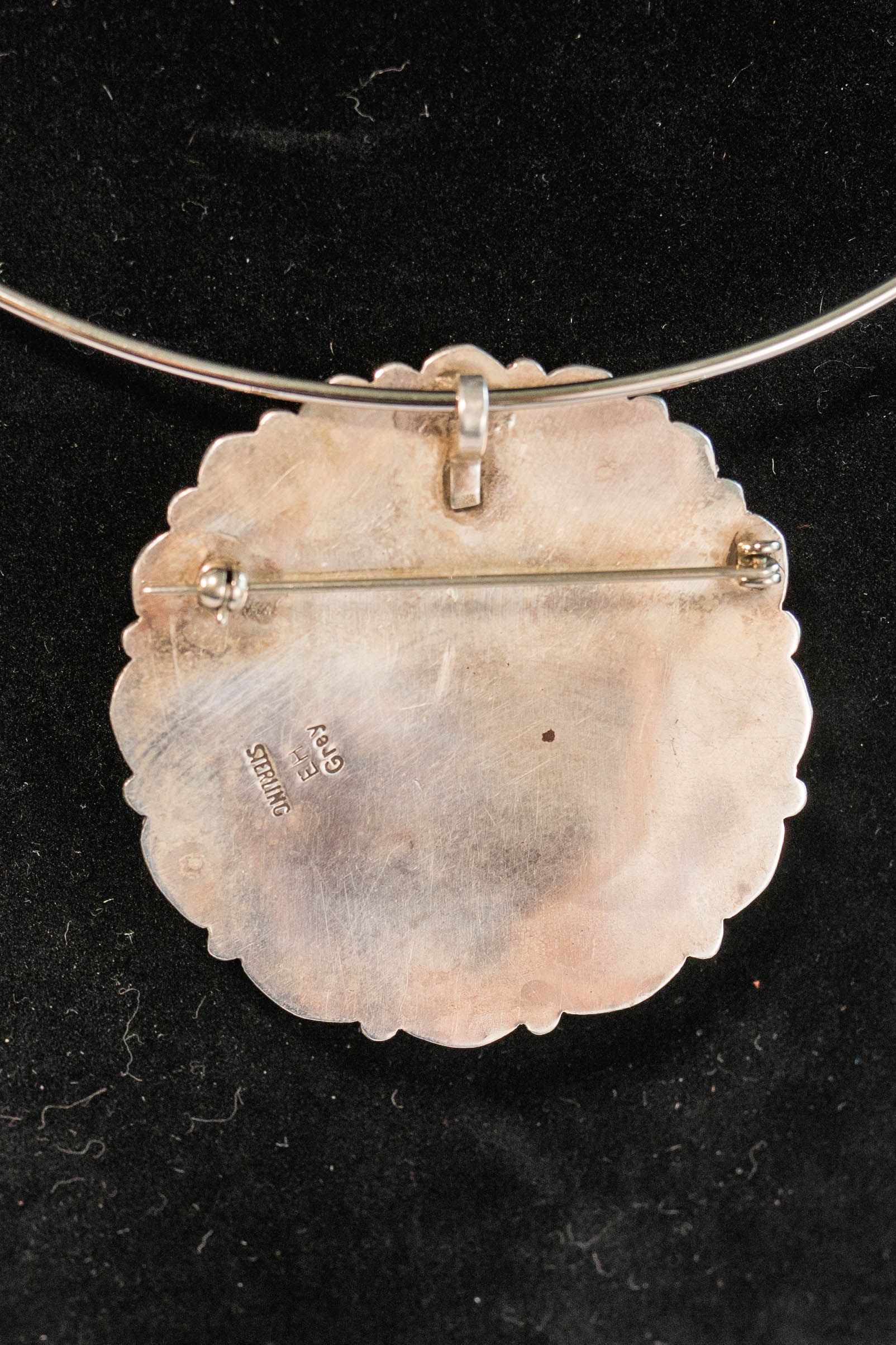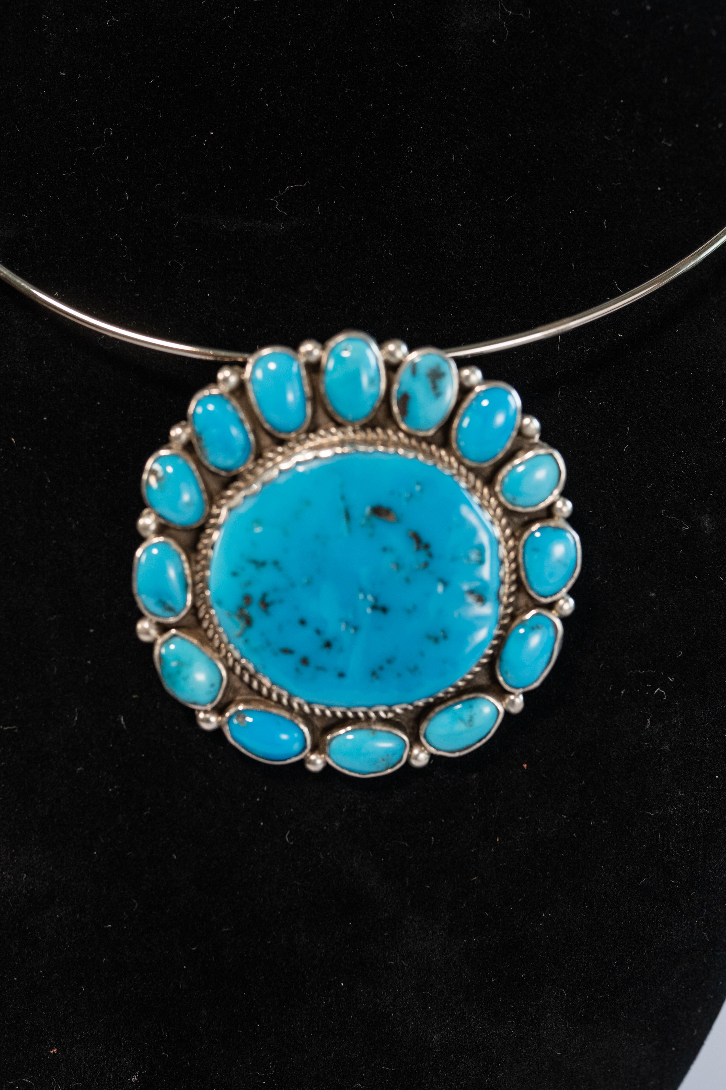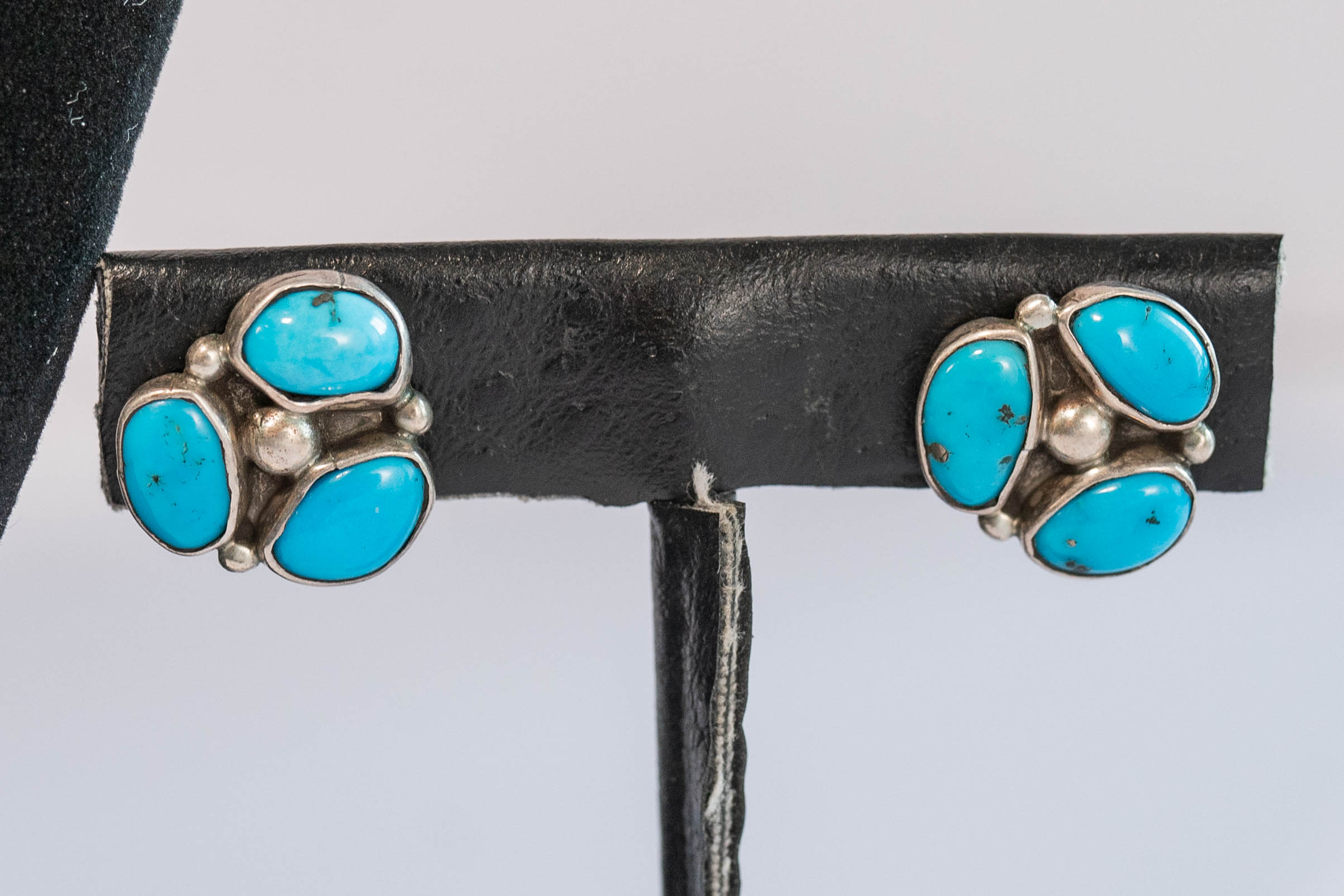 Native American Navajo E.H Gray sterling silver AAAA Morenci Turquoise. Vintage ensemble consisting of a pendant/ brooch, earrings and a ring. This Morenci Turquoise is a beautiful bright blue. Broach 2″ x 2″, Ring 7 1/4, Earrings 5/8″.