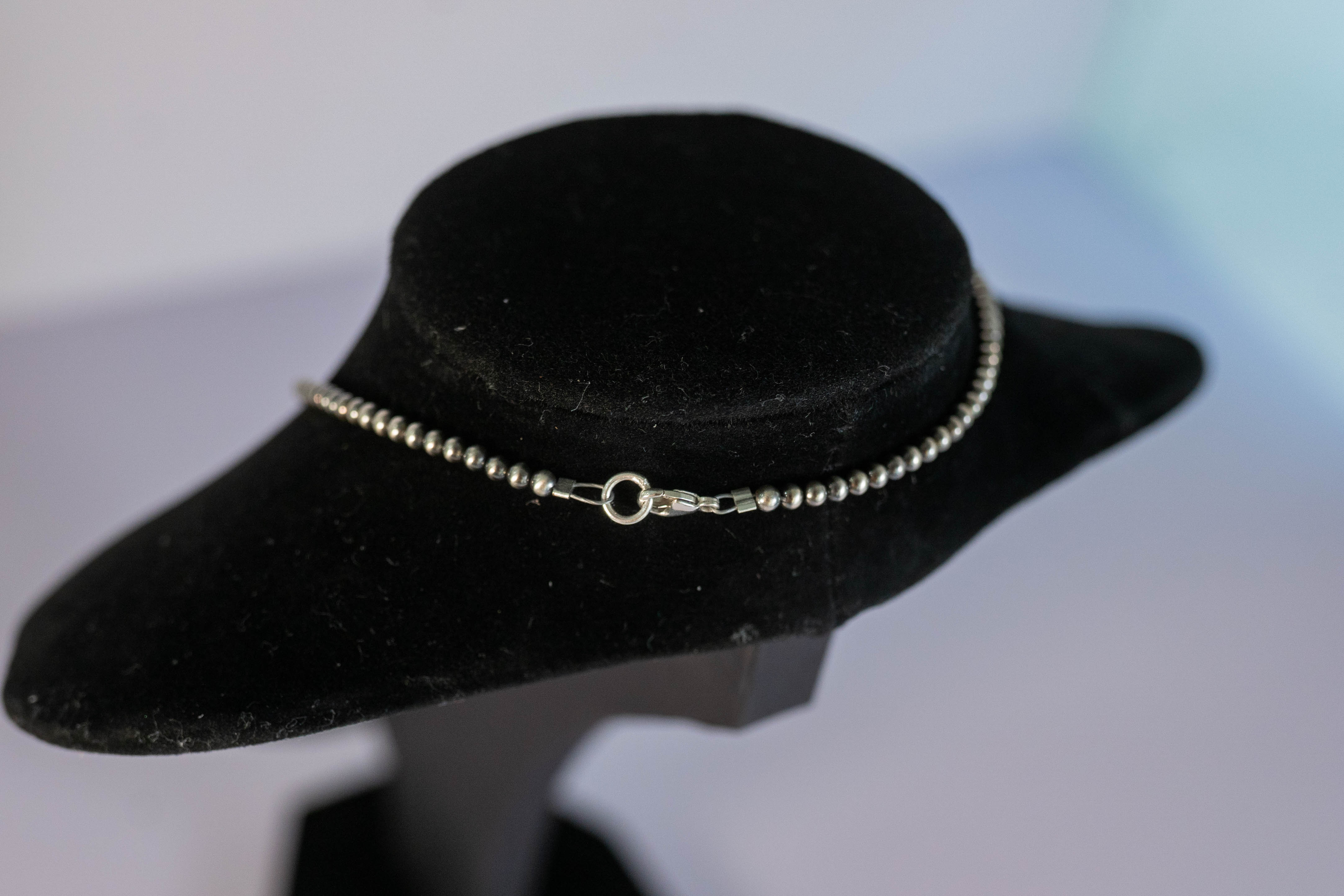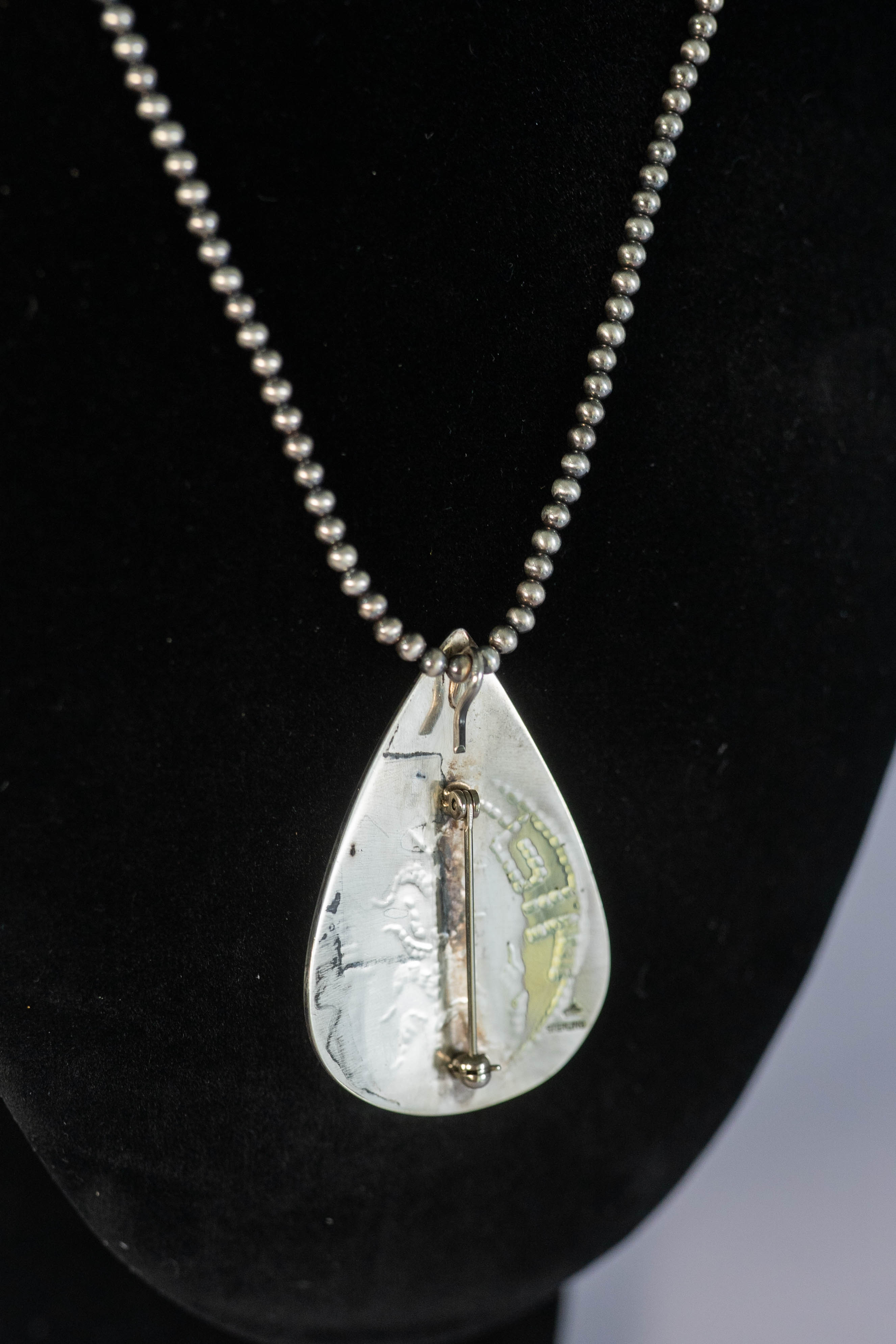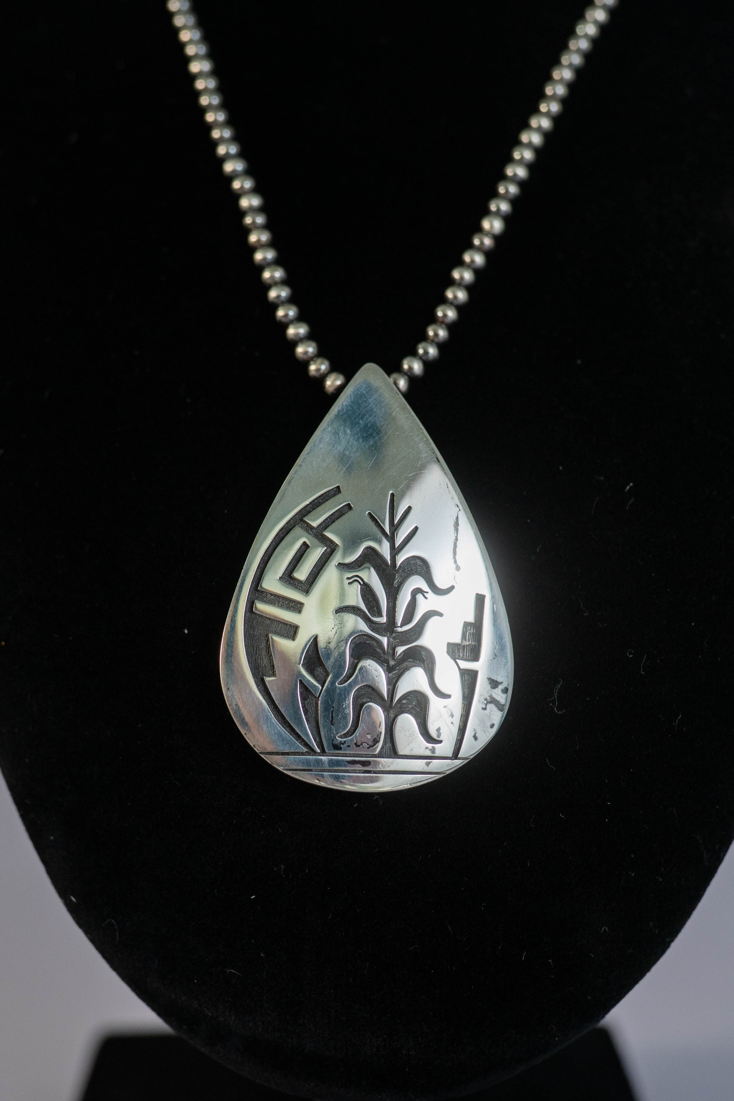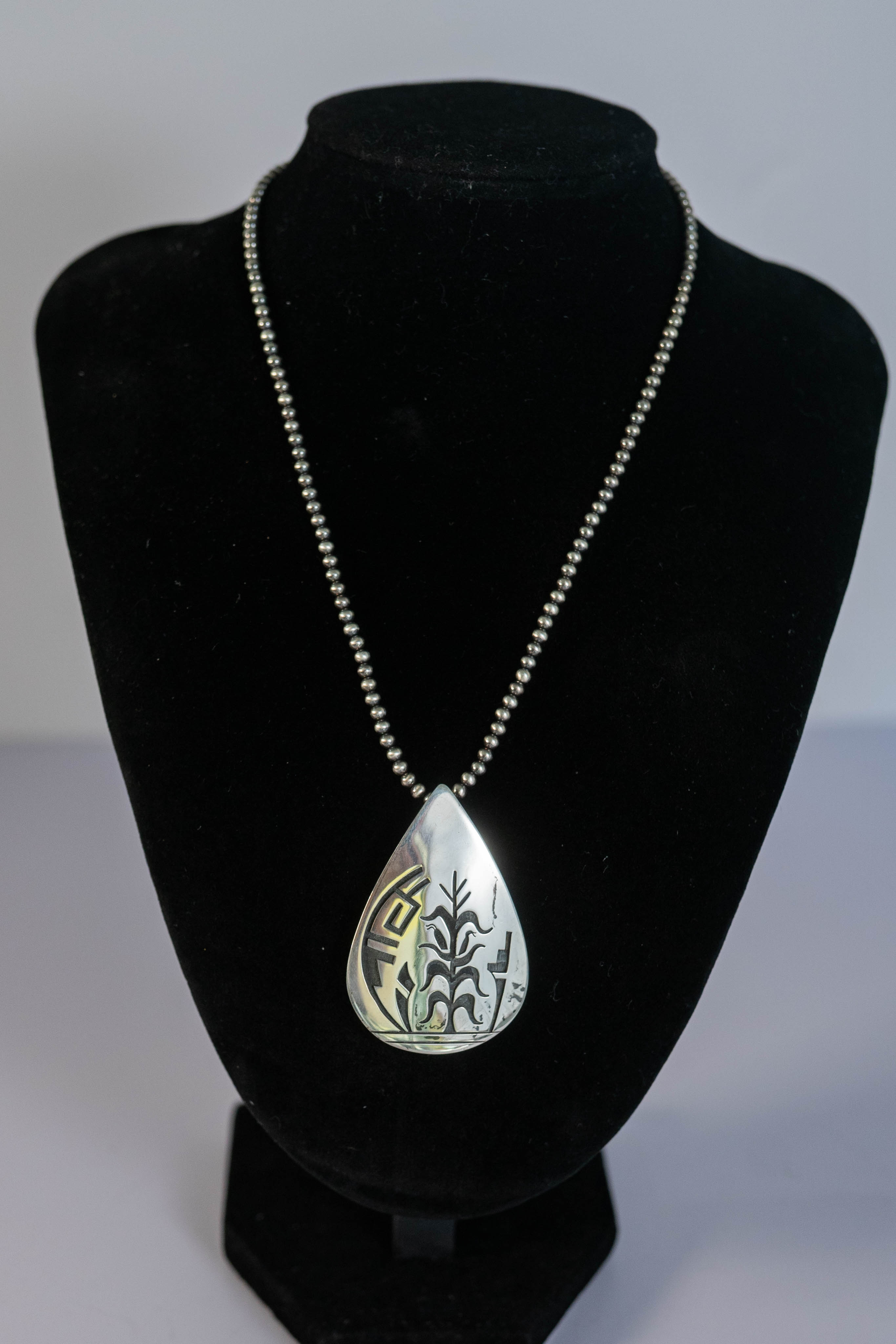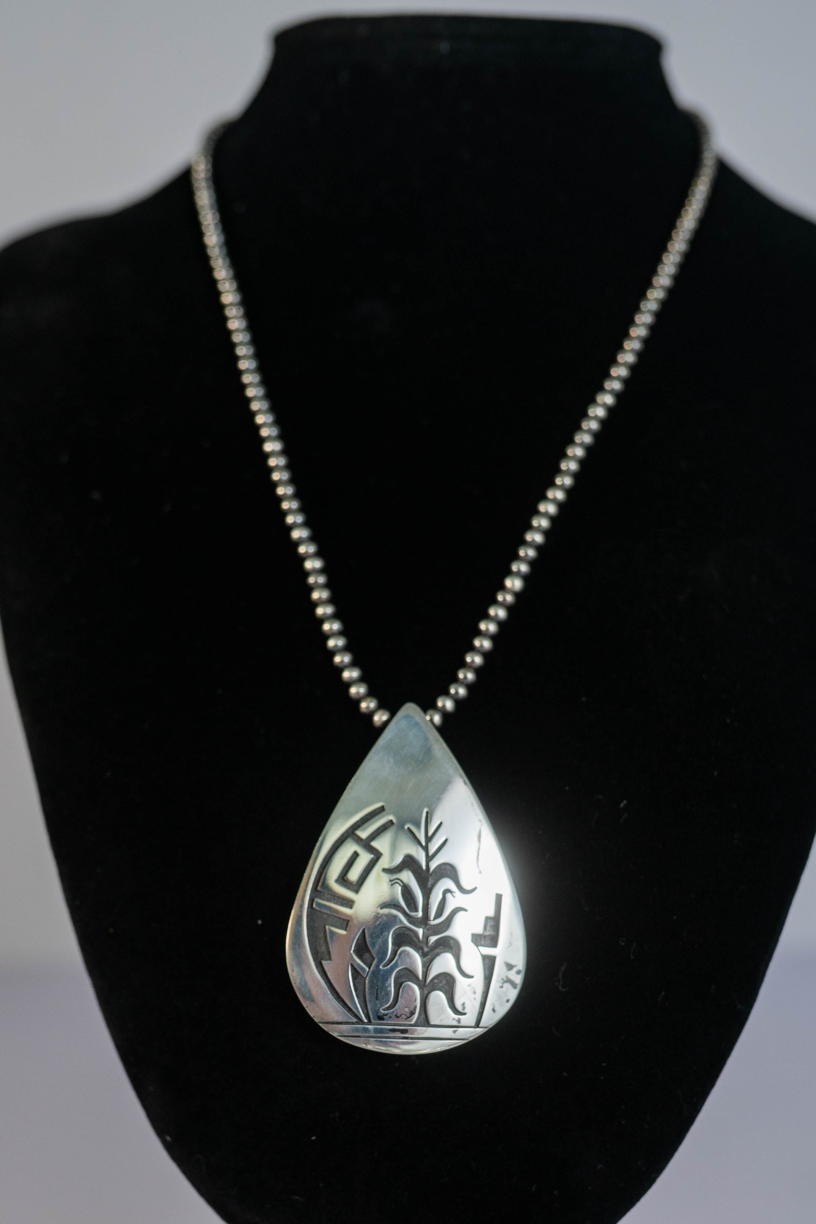 Native American Hopi artist Wilmer Saufike vintage sterling silver pendant with traditional corn stalk design on sterling silver 3mm 16 inch Navajo pearls with 2 inch extender. Pendant L 2″ x 1 1/4″ W