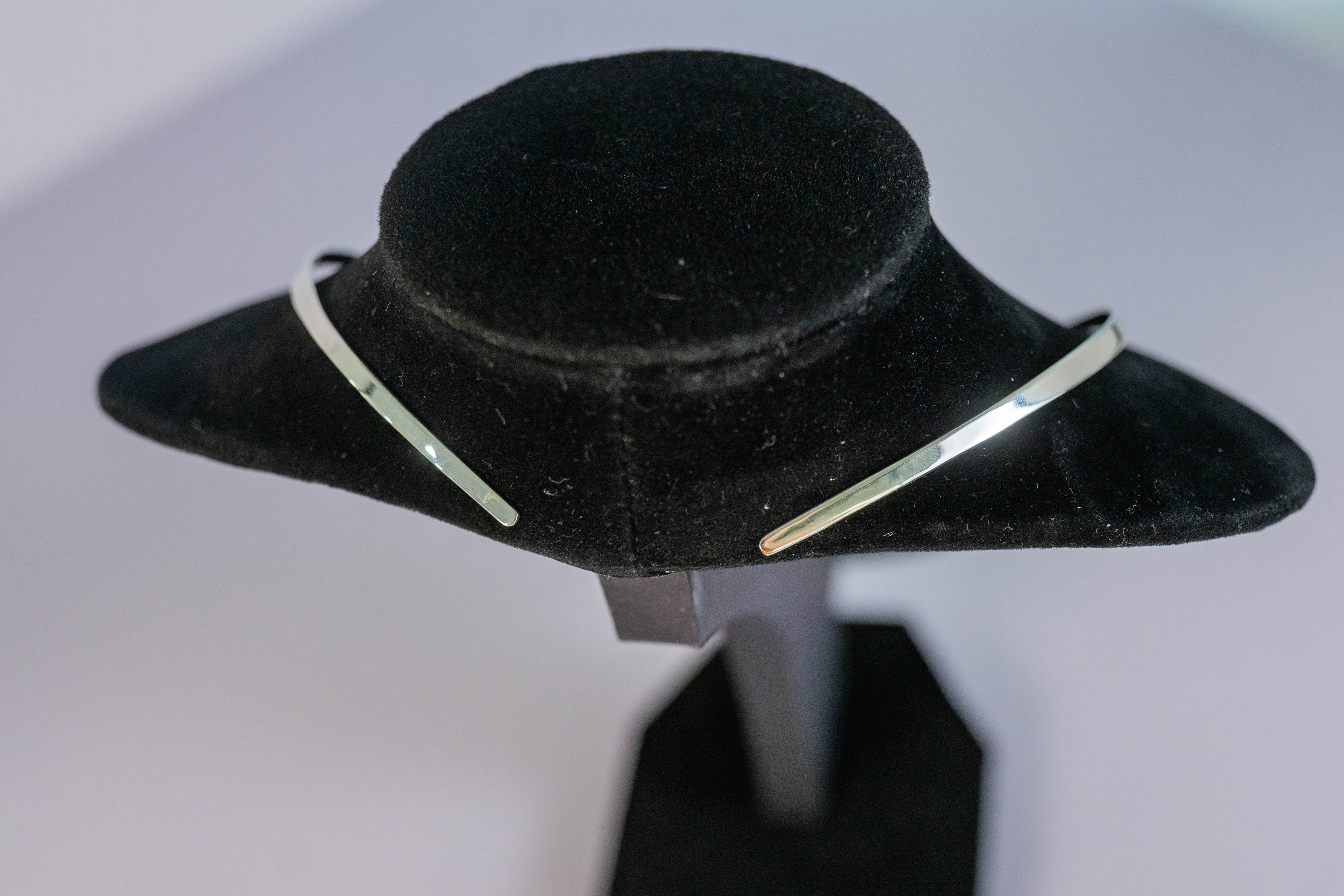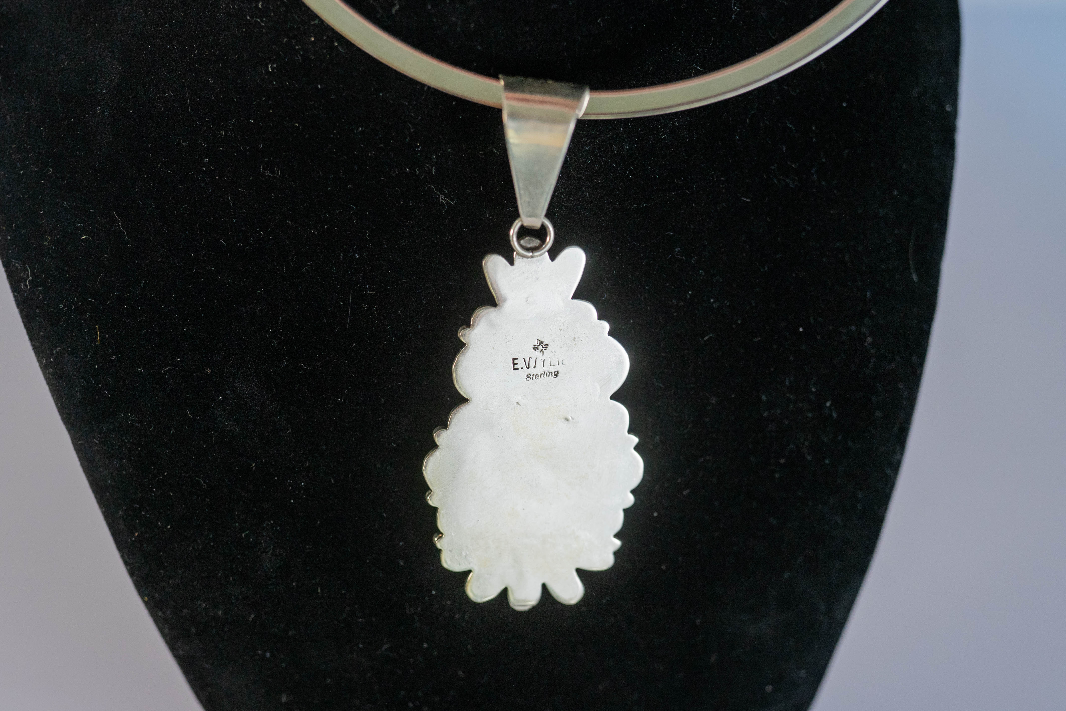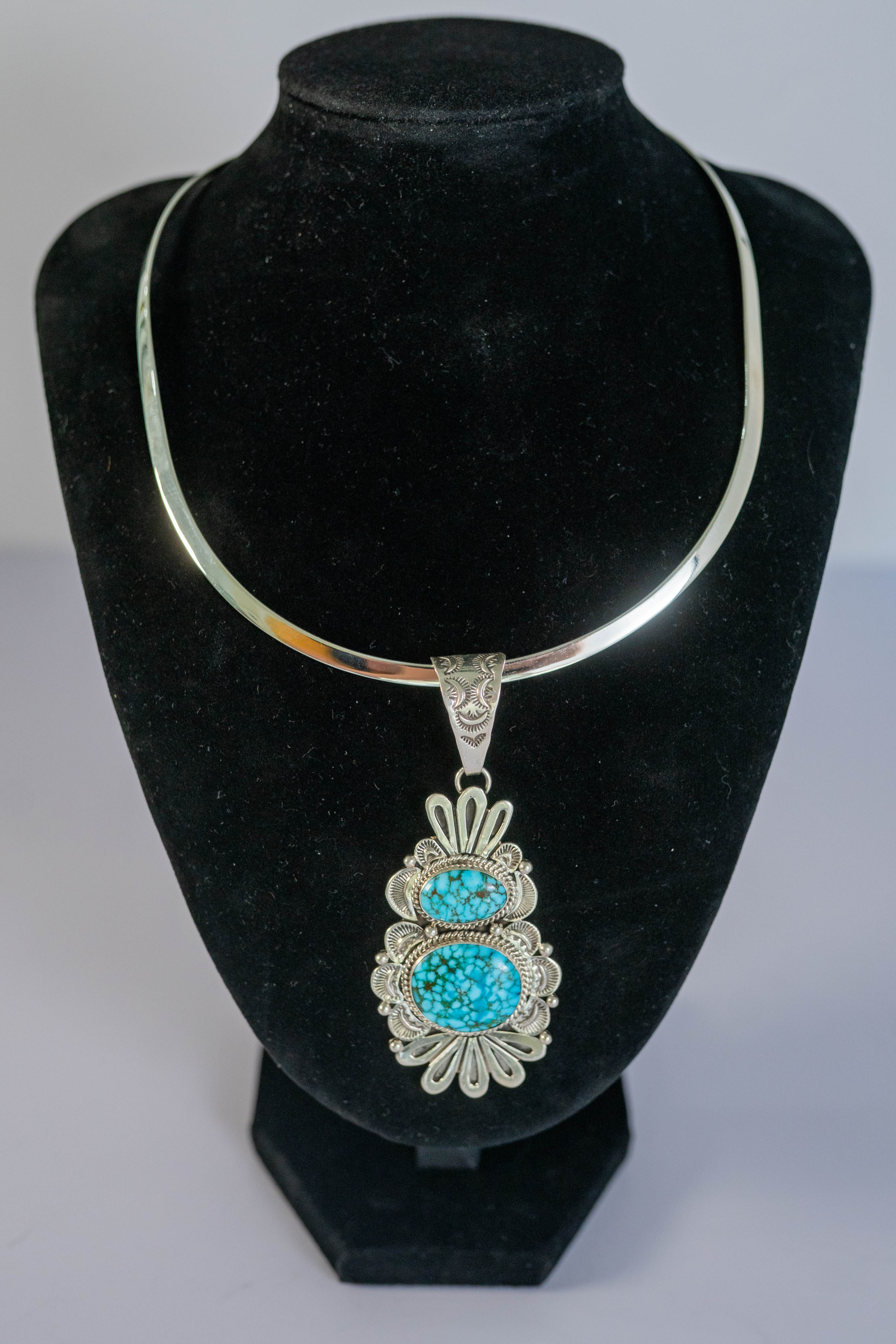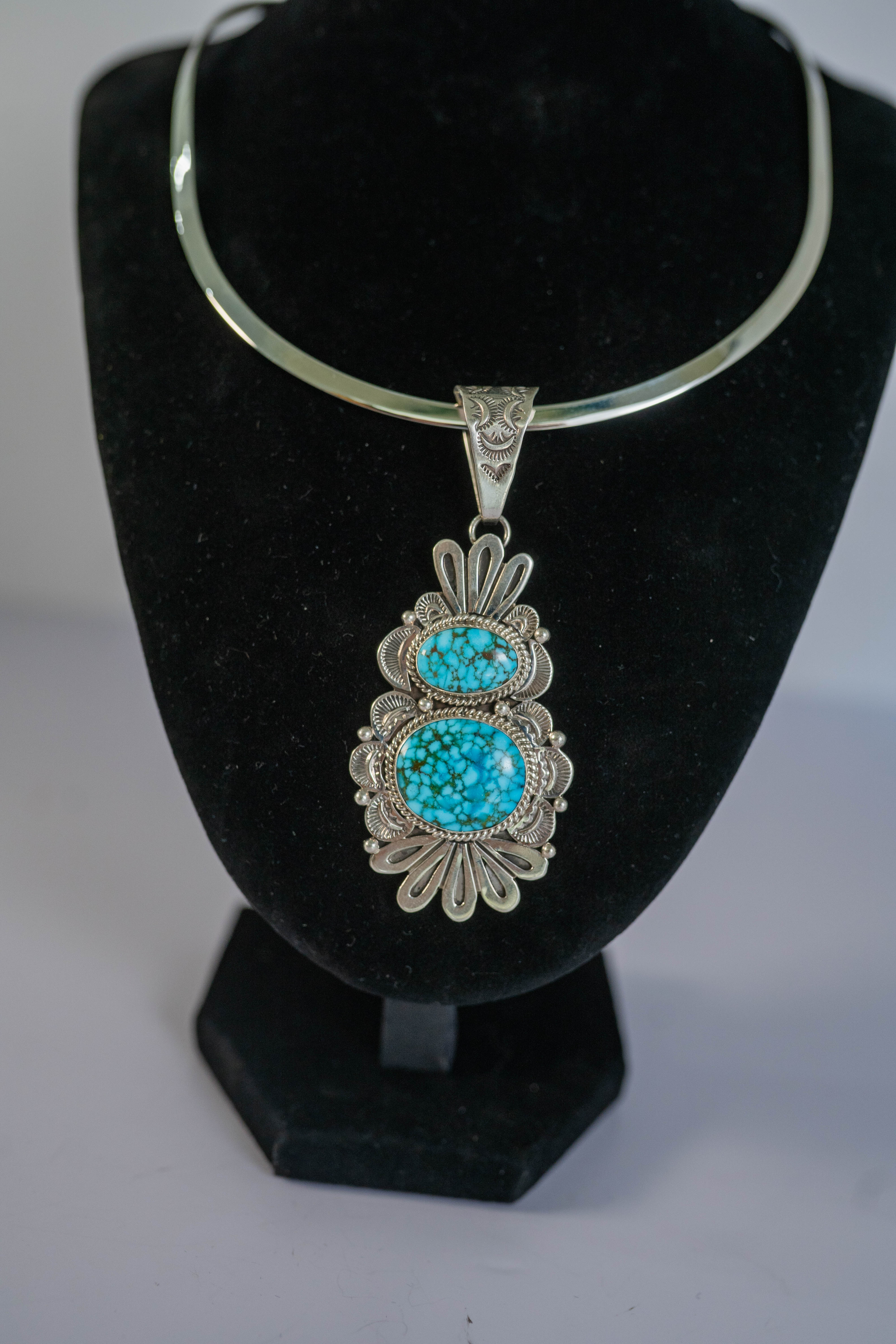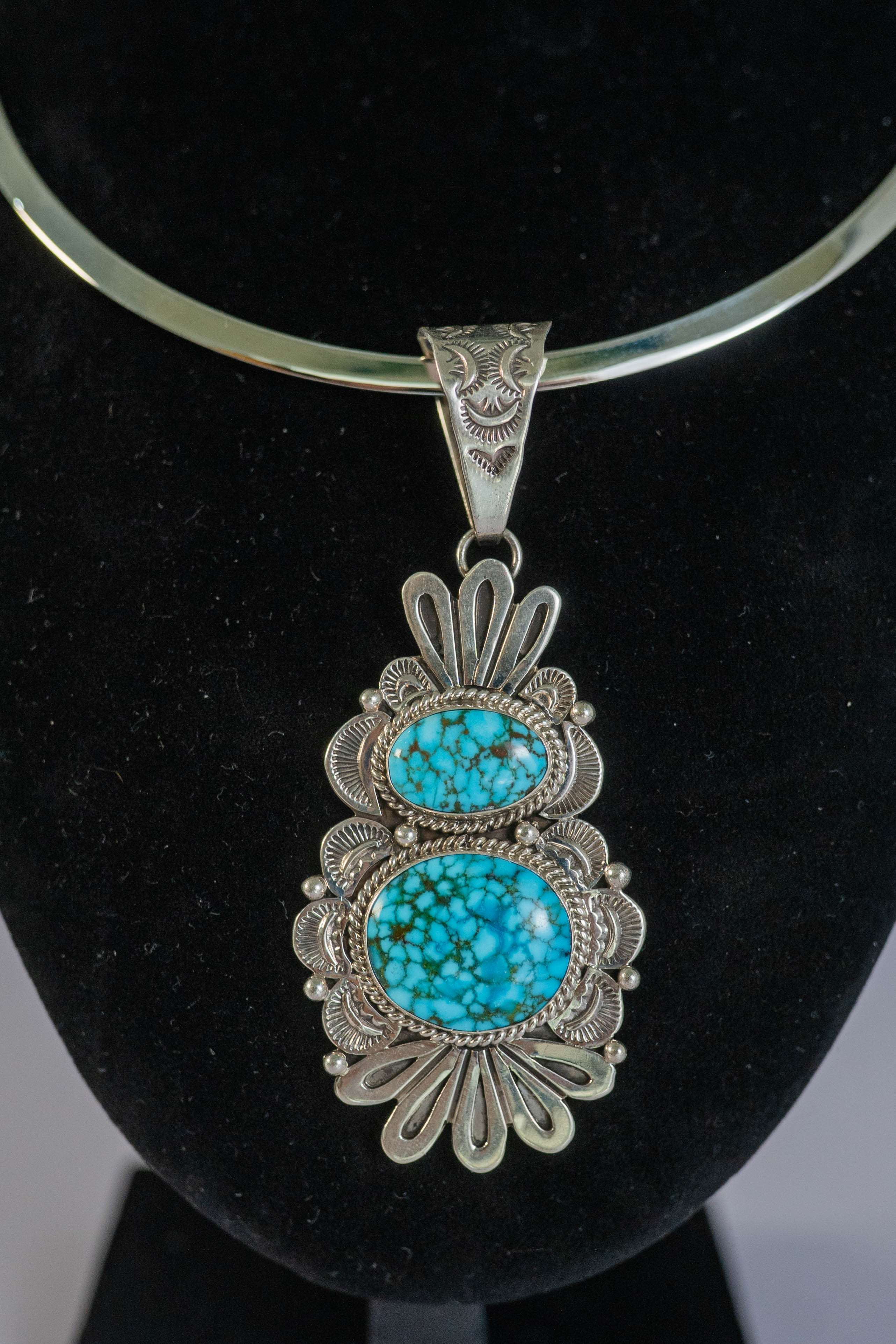 Native American Navajo Master Silversmith Eula Wylie exquisite pendant featuring two AAAAA Water Web Kingman Turquoise gemstones surrounded by twisted wire and hand stamped accents, dot appliques with beautiful embellishments at the top and bottom of the pendant and a hand stamped bail. The pendant hangs on a sterling silver 16″ choker necklace. Length 3 1/4 ” x 1 1/2″ Width. OAL 19 1/4 ” Signed E. Wylie.