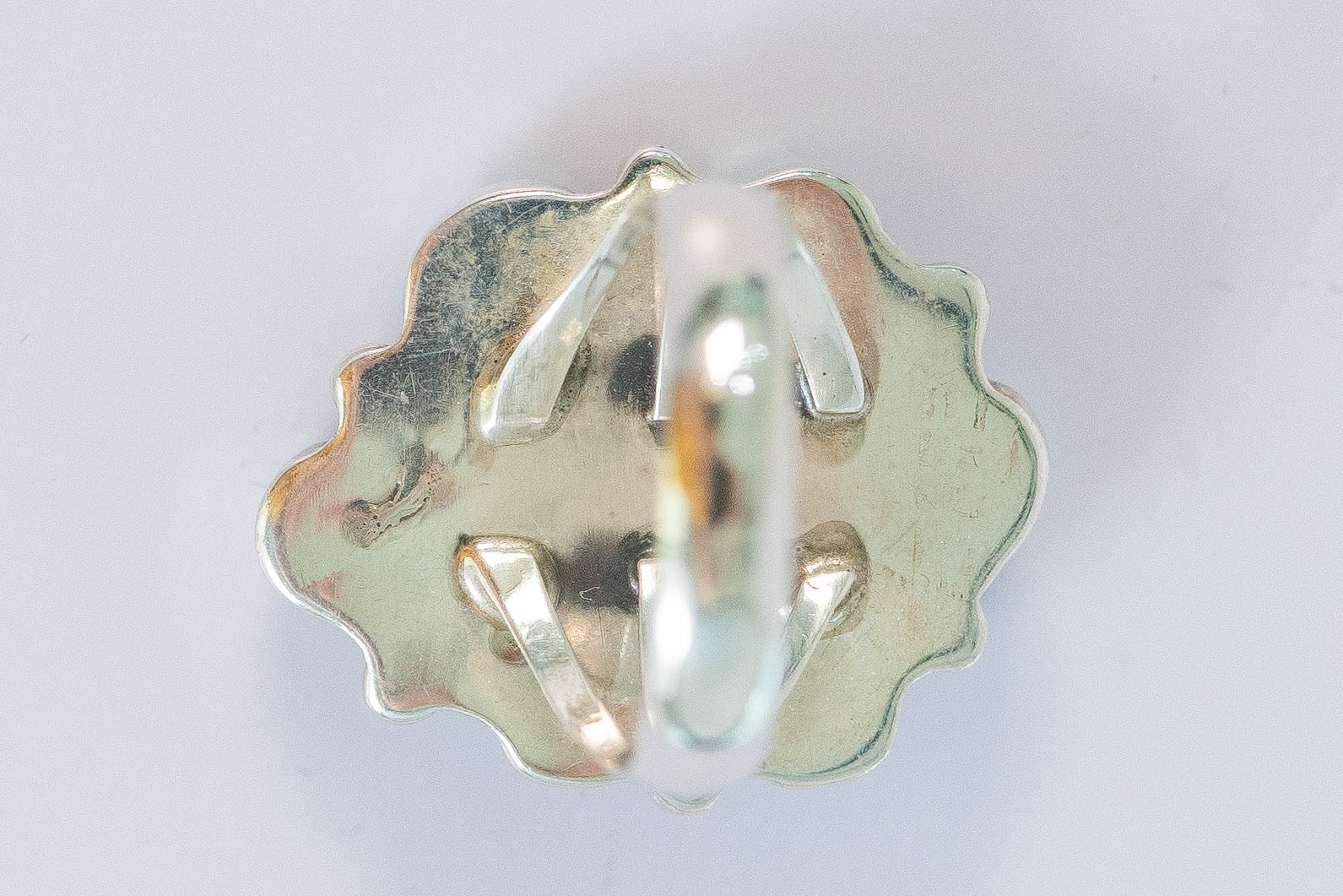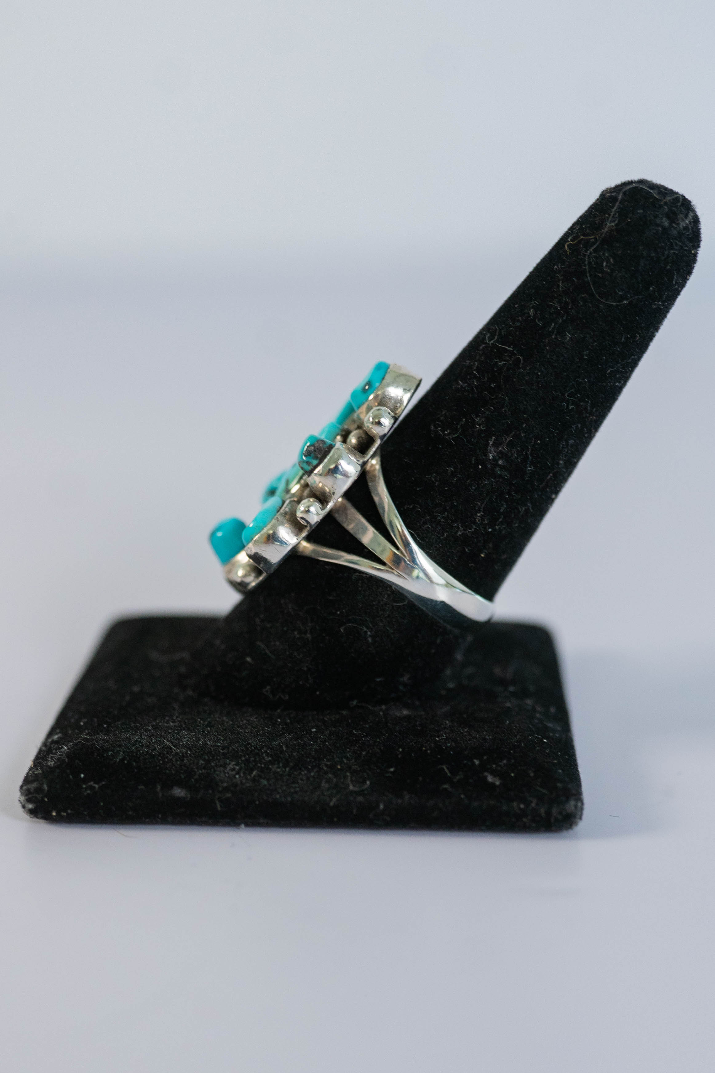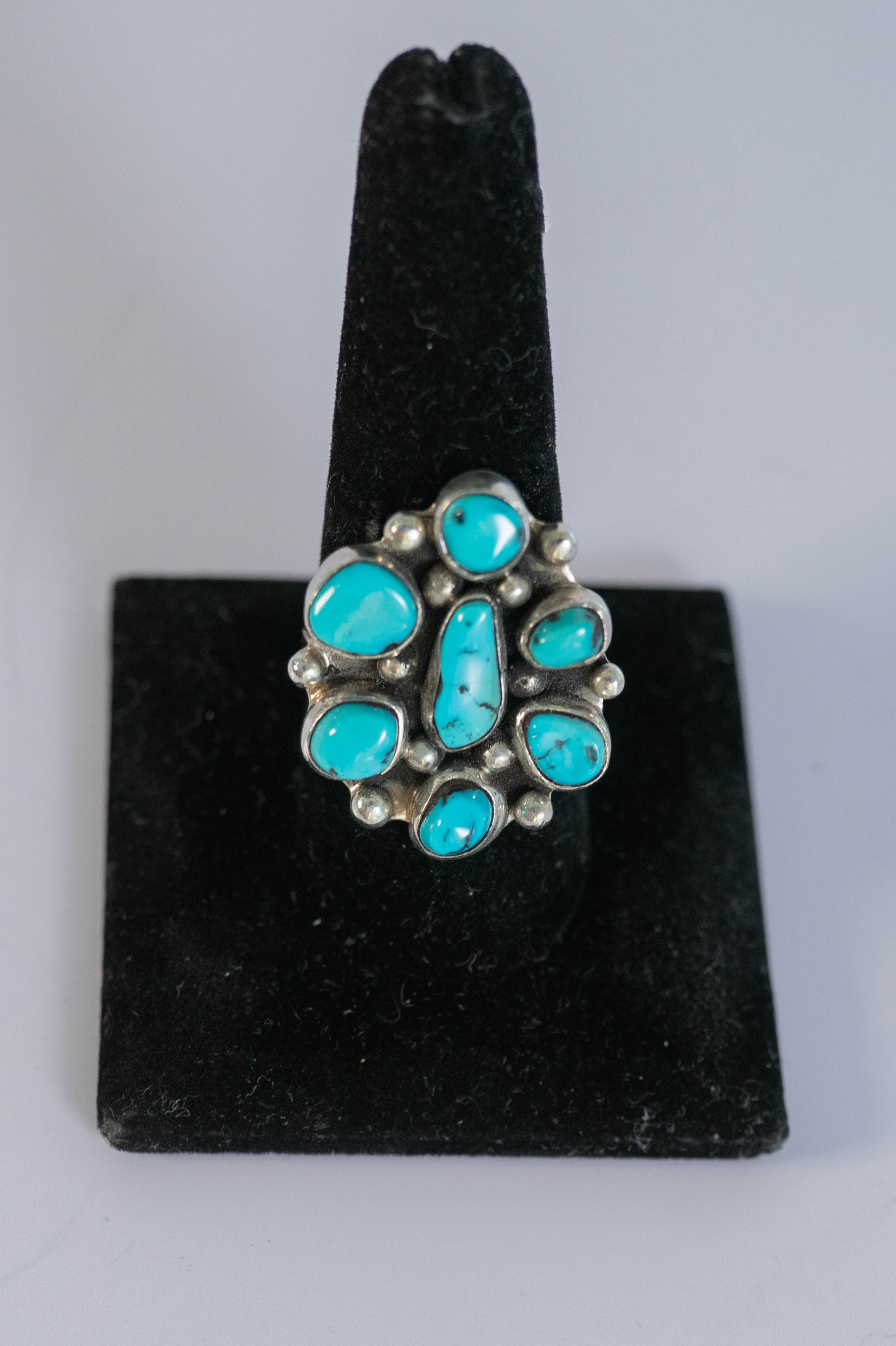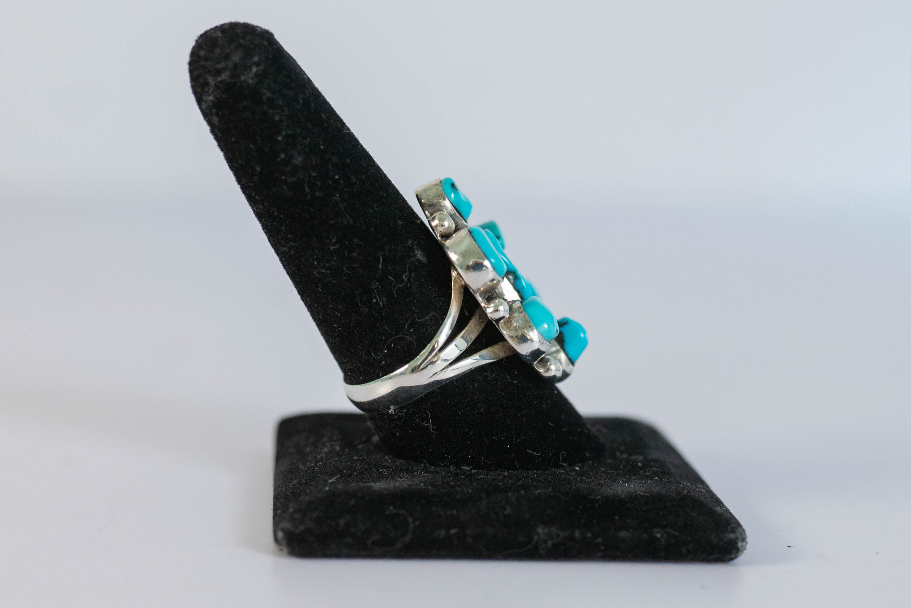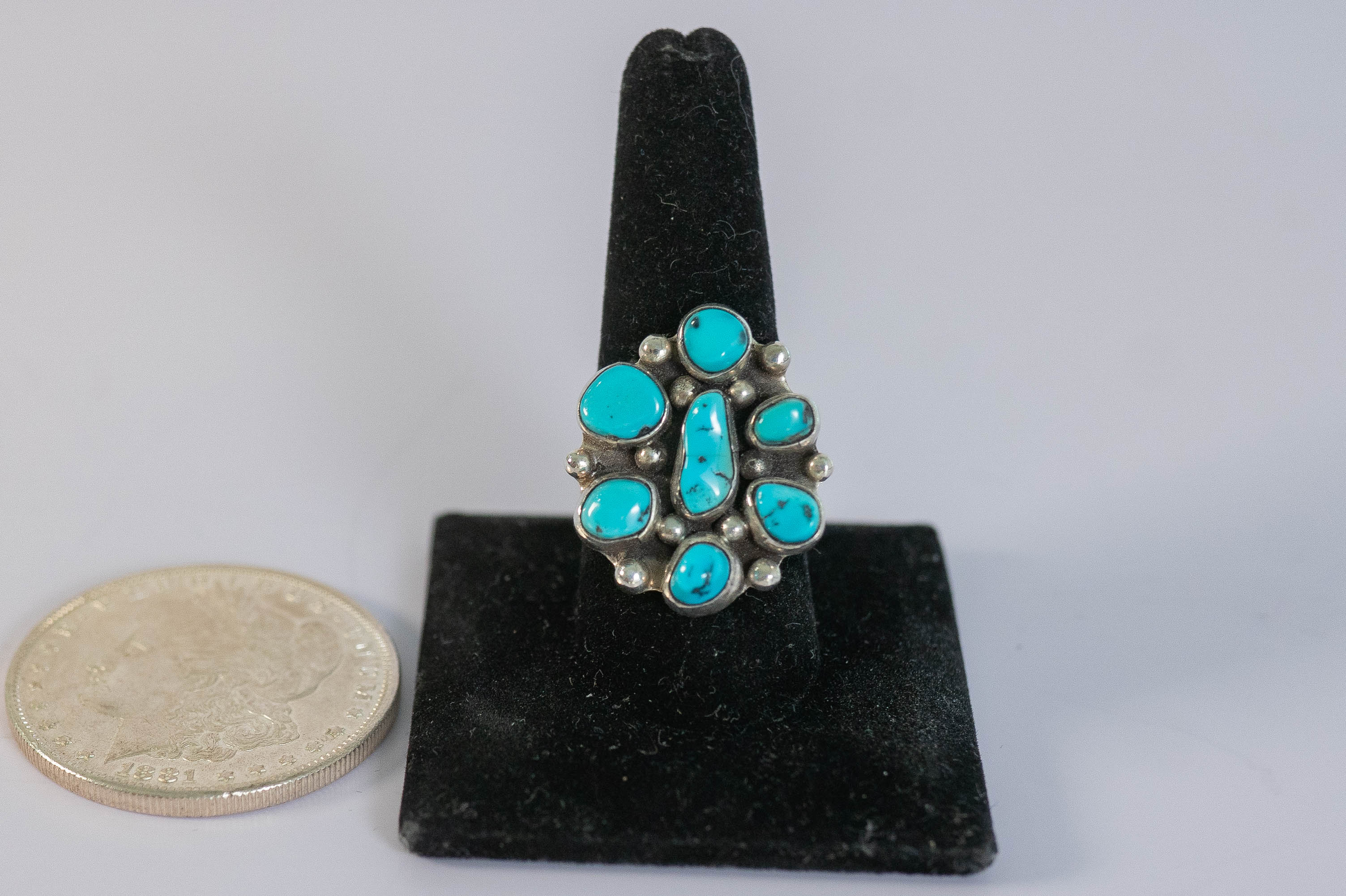 Native American Navajo sterling silver vintage ring featuring (7) AAAA Kingman turquoise gemstones with sterling silver dot spacers. Size 8 3/4 L 1 ” x 7/8 “