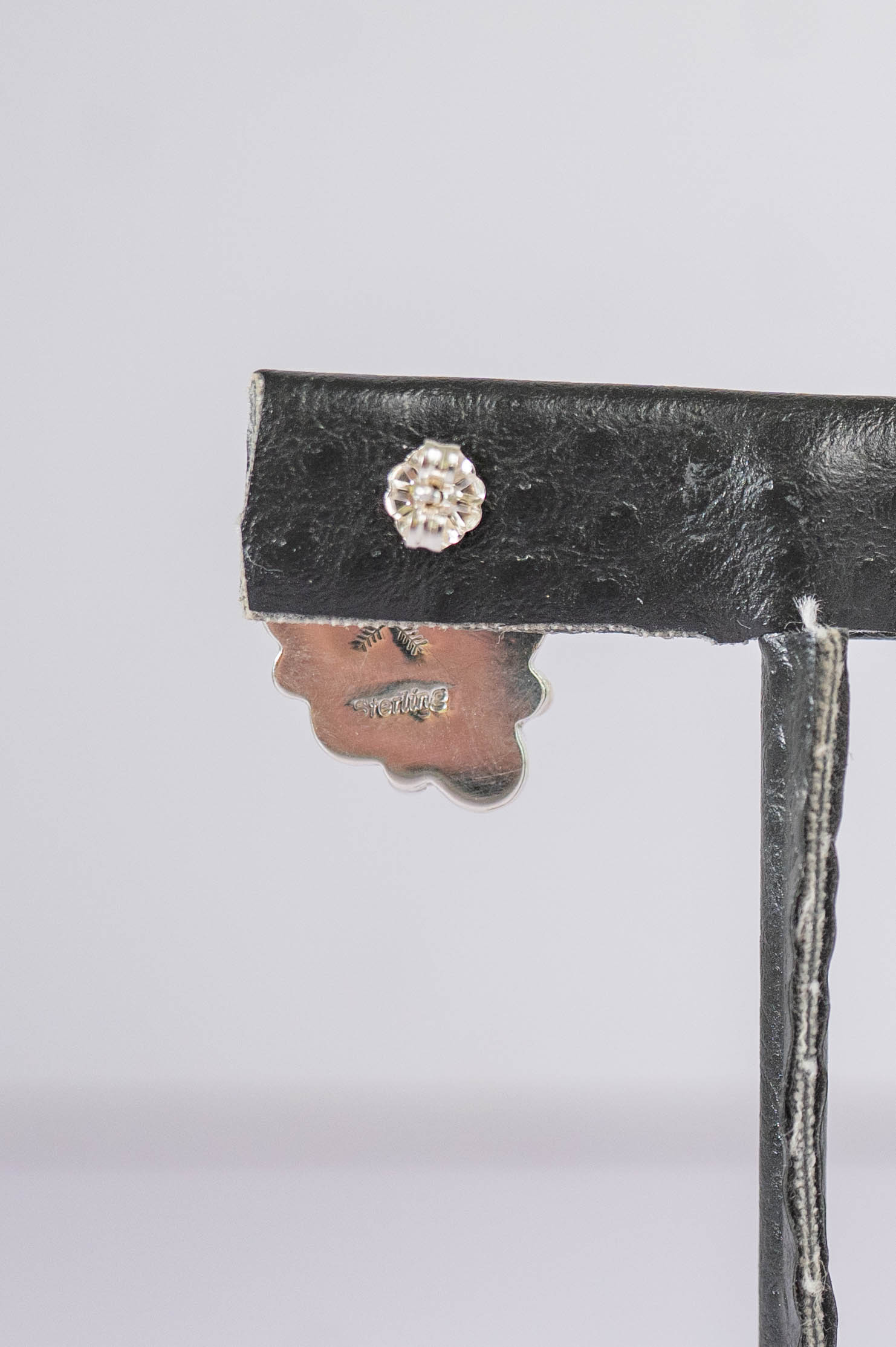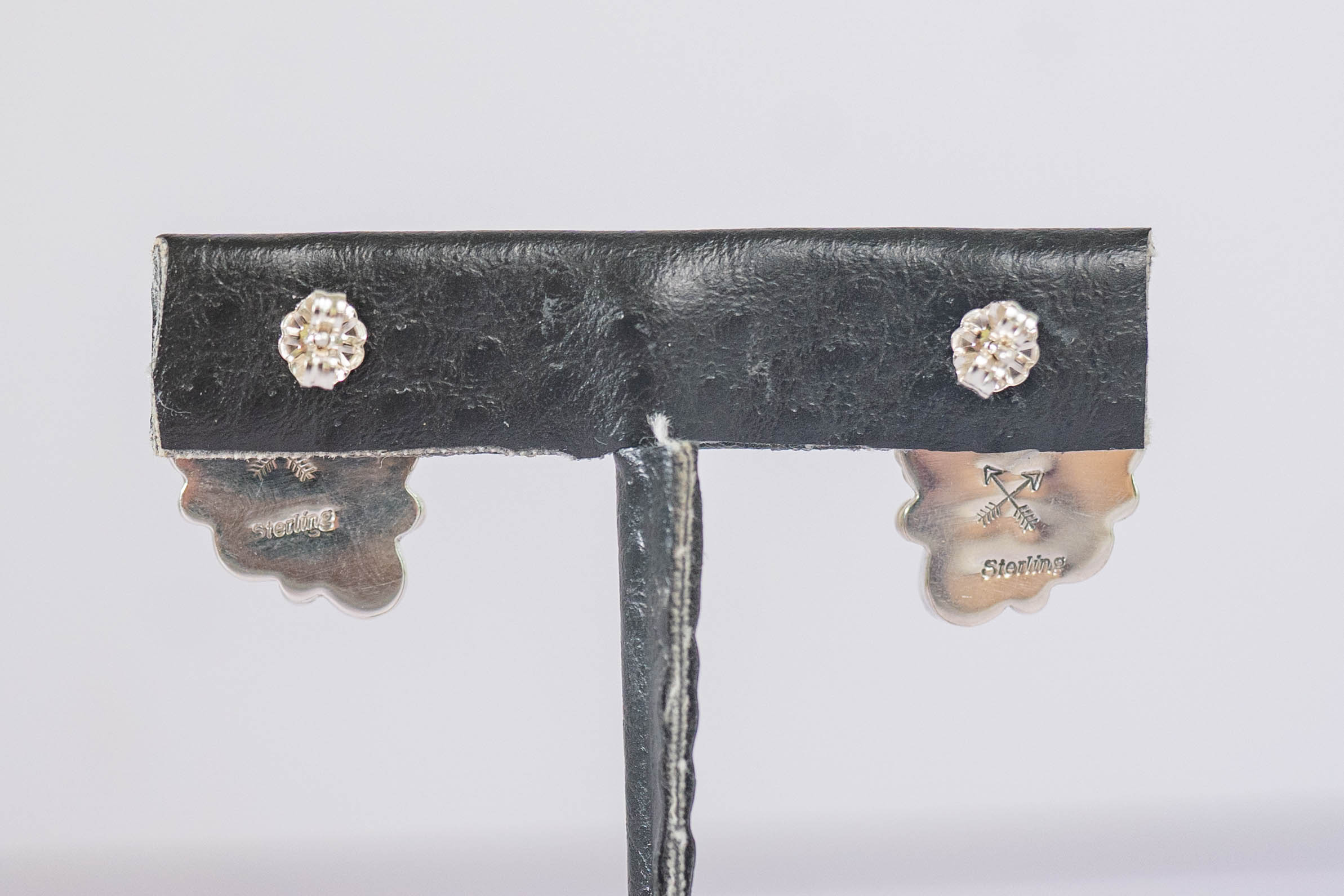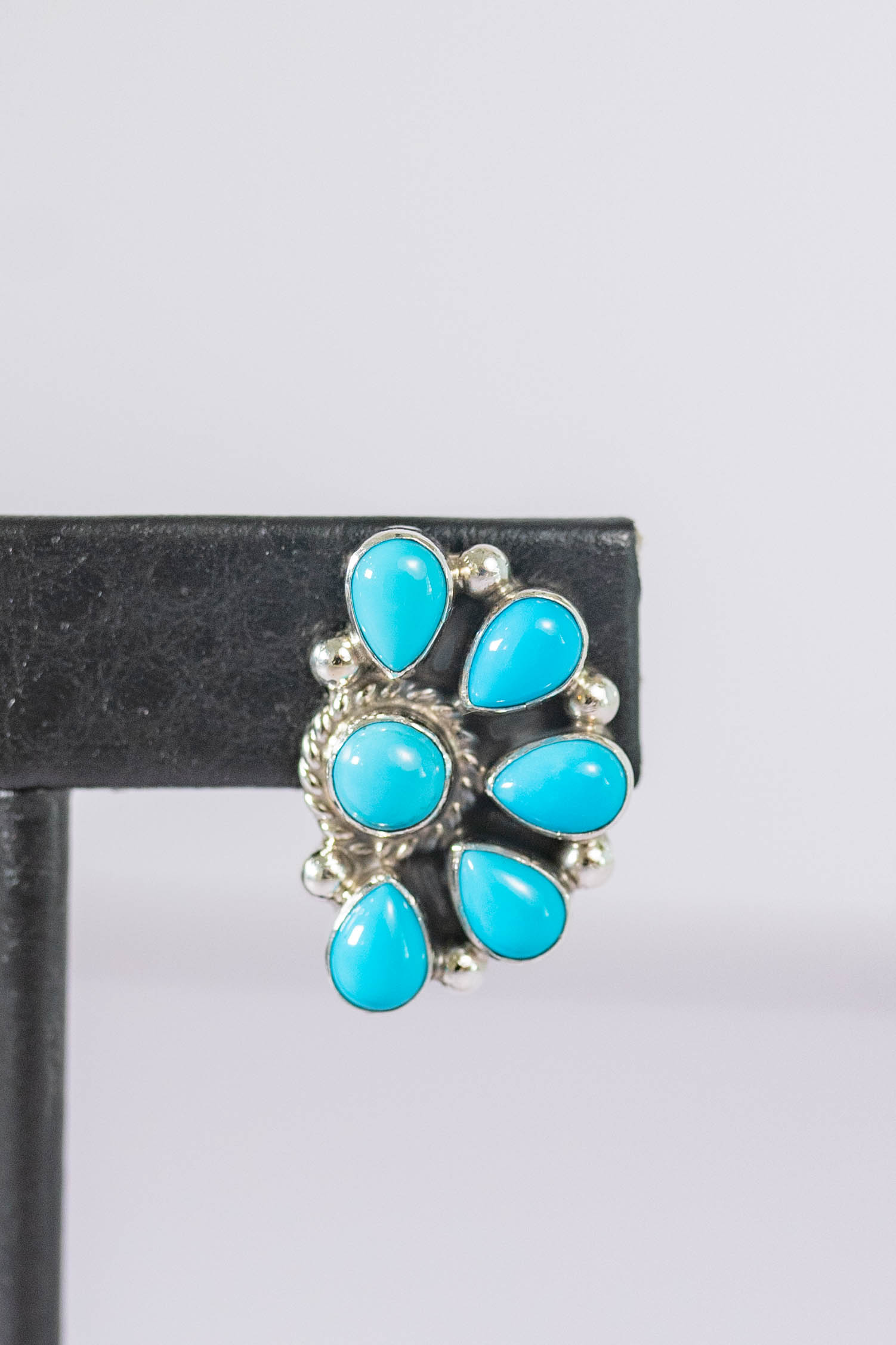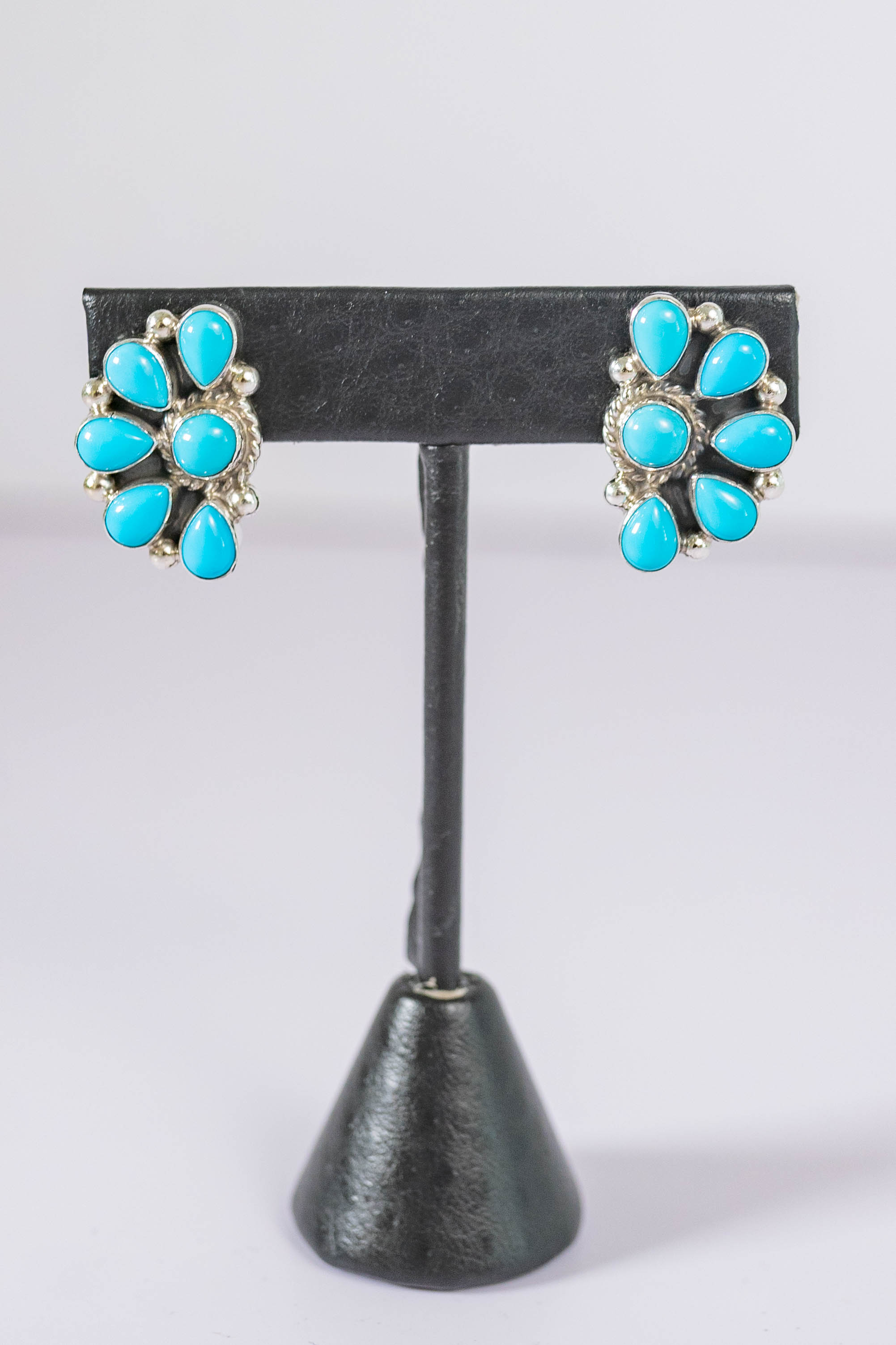 Native American Navajo master silversmith Tom DeWitt sterling silver post earrings with AAAAA Sonoran Beauty Turquoise gemstones with twisted wire and dot spacer beads. Signed with his crossed arrows hallmark. Length 1 ” x 5/8″ Width.