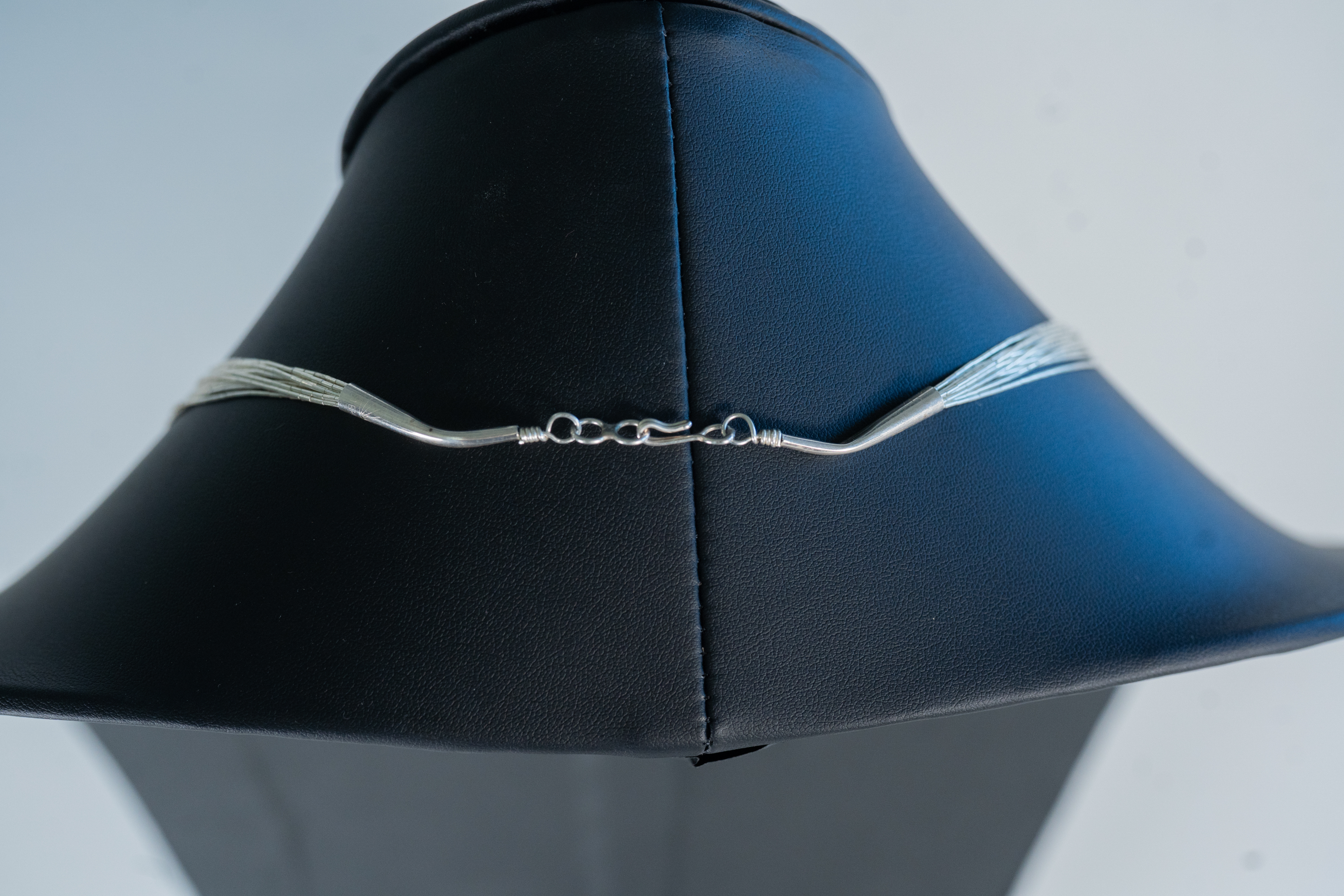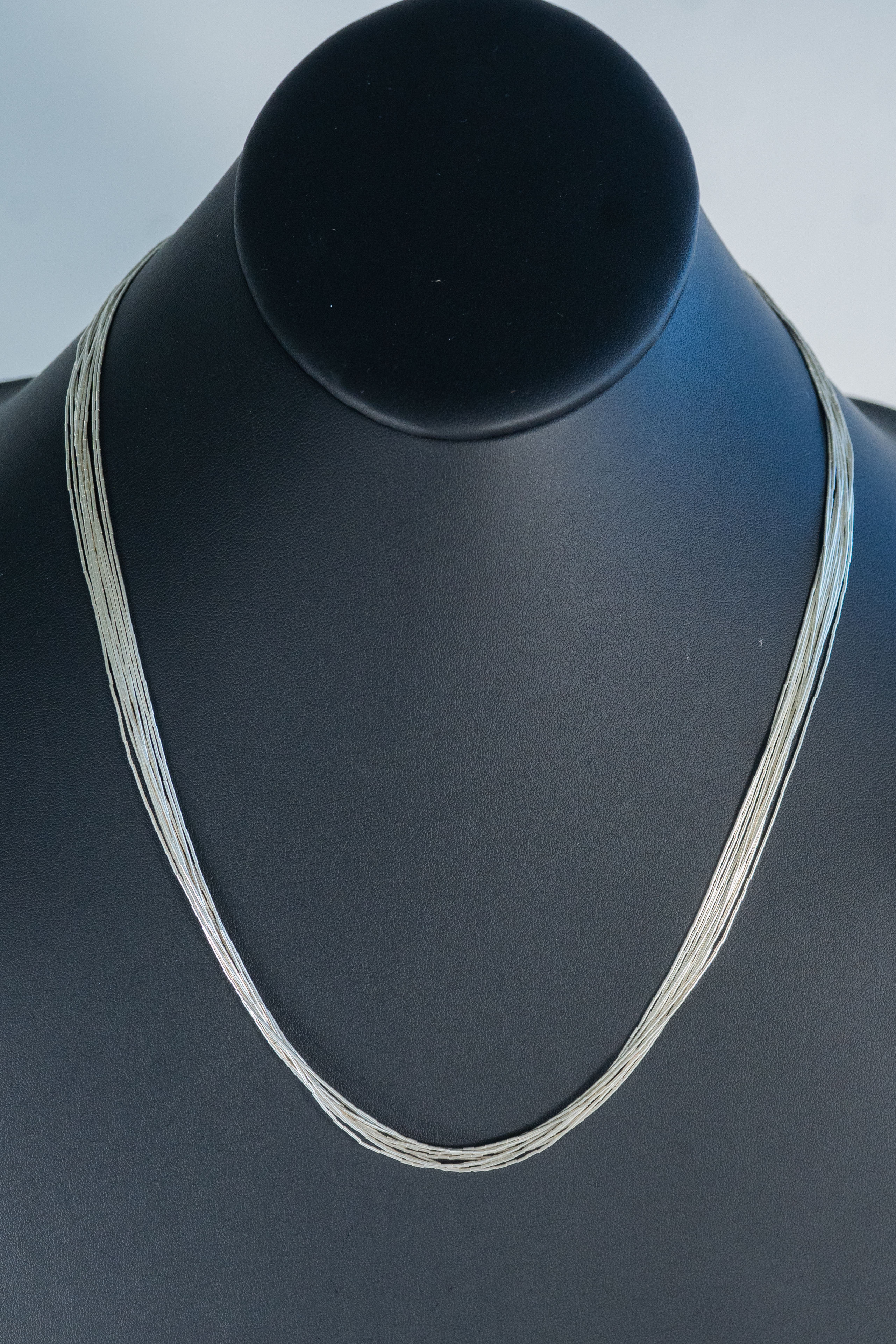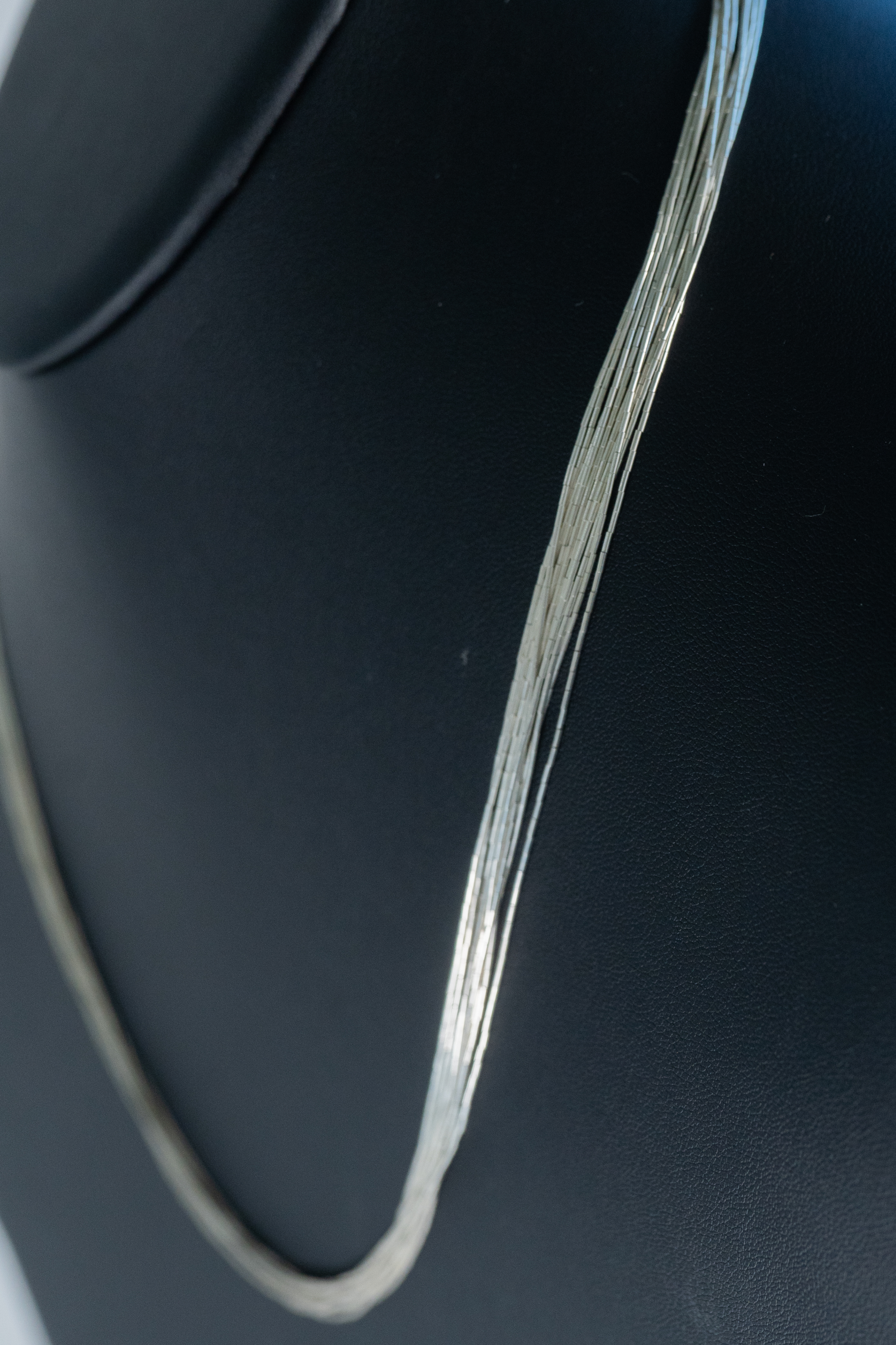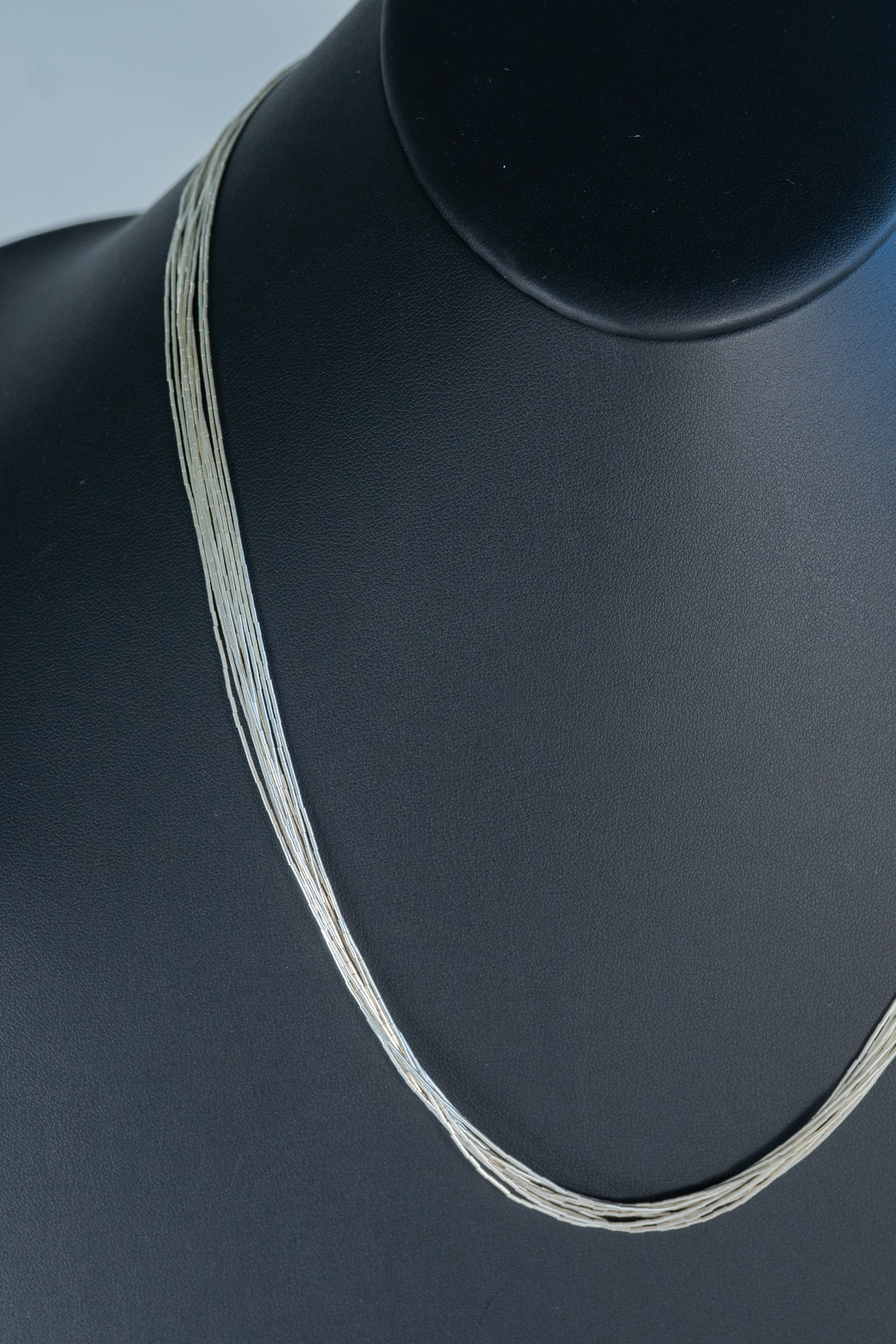 Native American Navajo elegant sterling liquid silver (10) strand necklace with sterling silver cones and findings. Length 24″