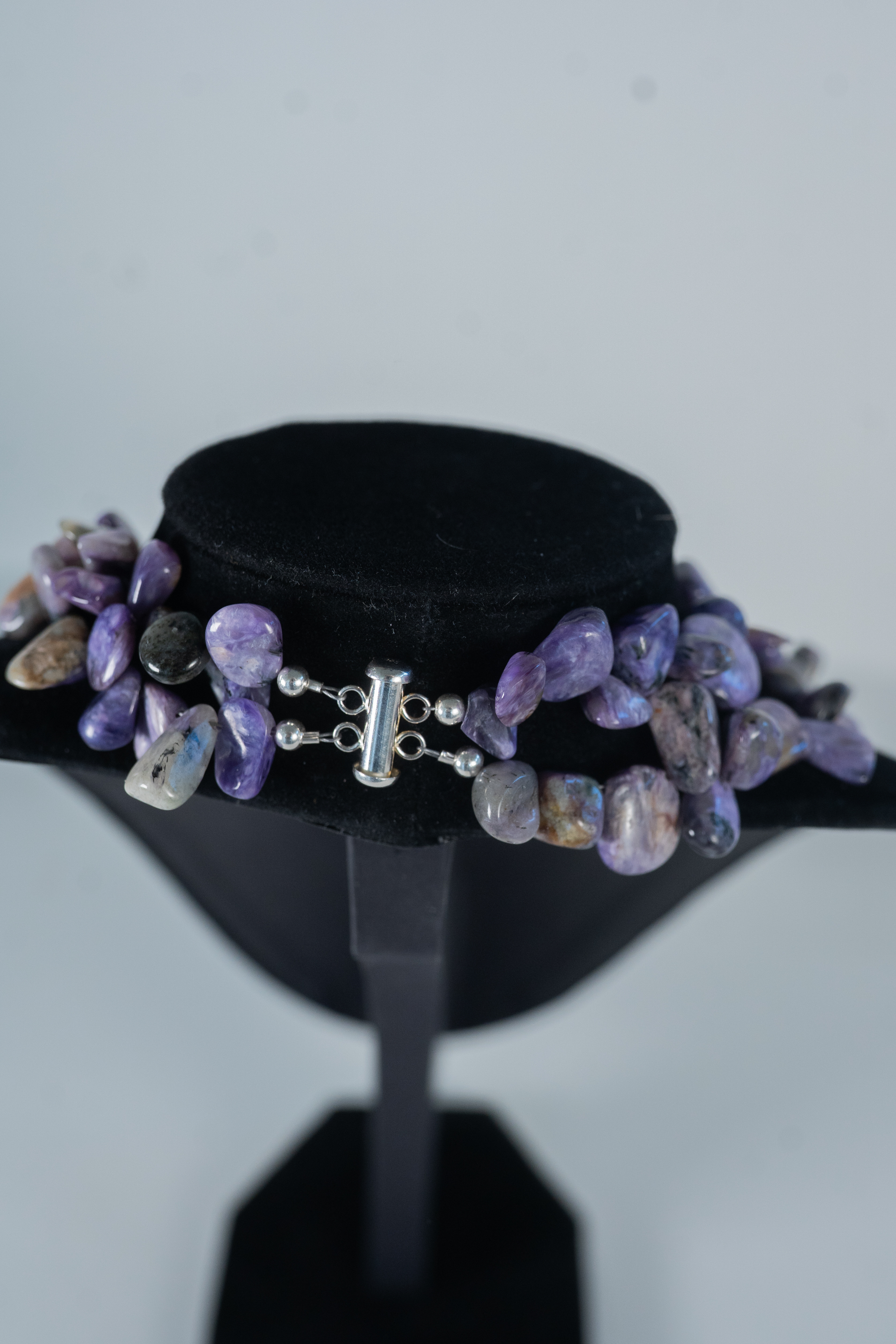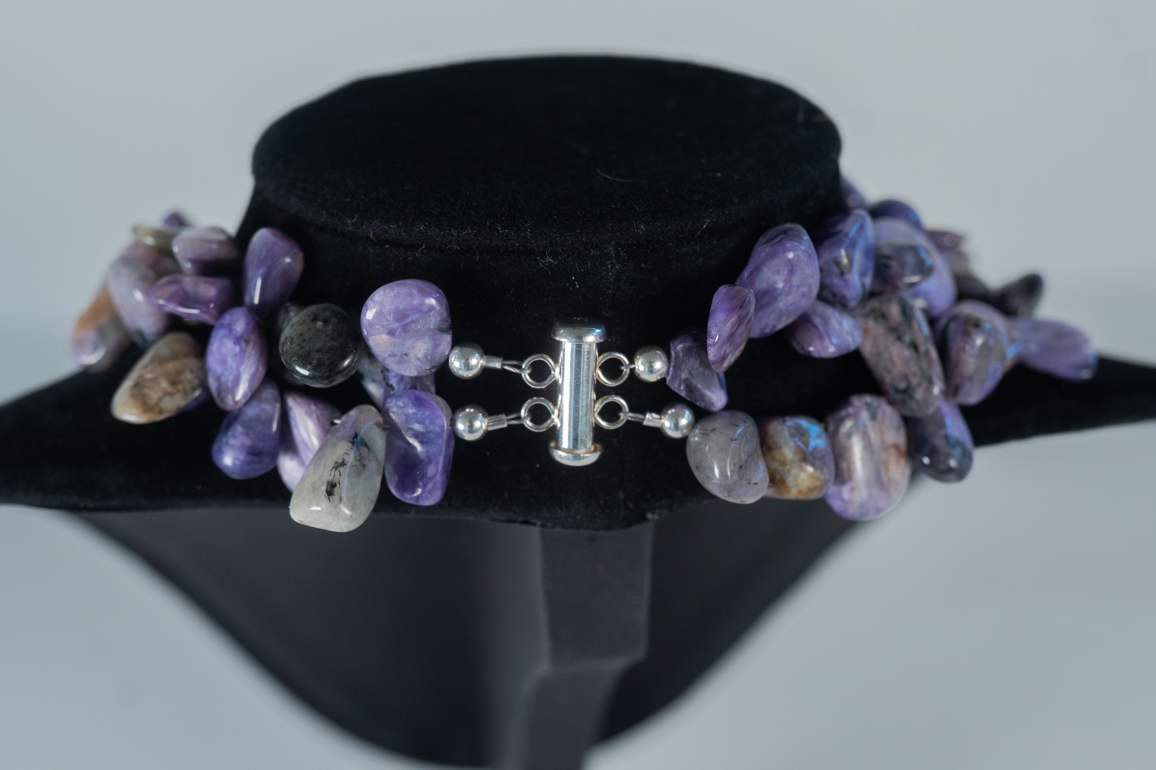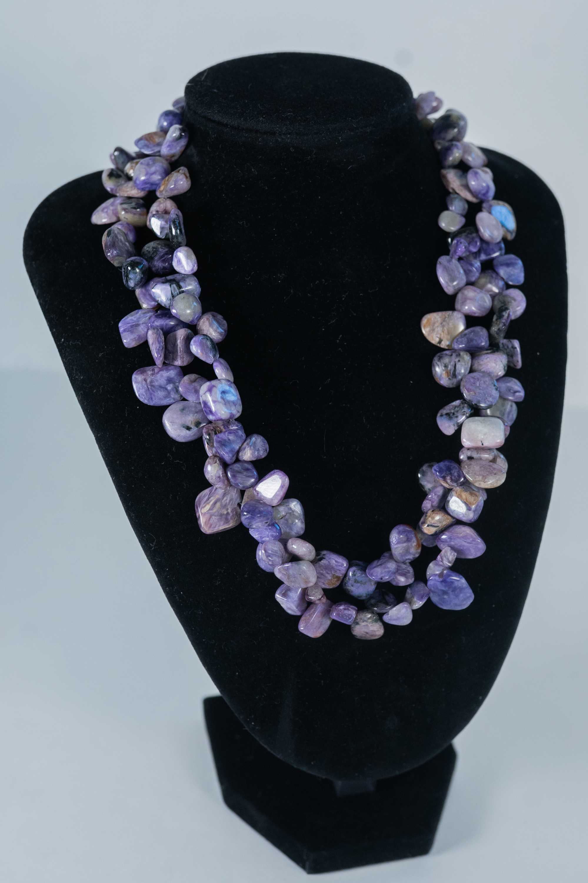 Sugilite two strand necklace featuring rough cut polished gemstones with a sterling silver clasp and accent beads. Length 18″.