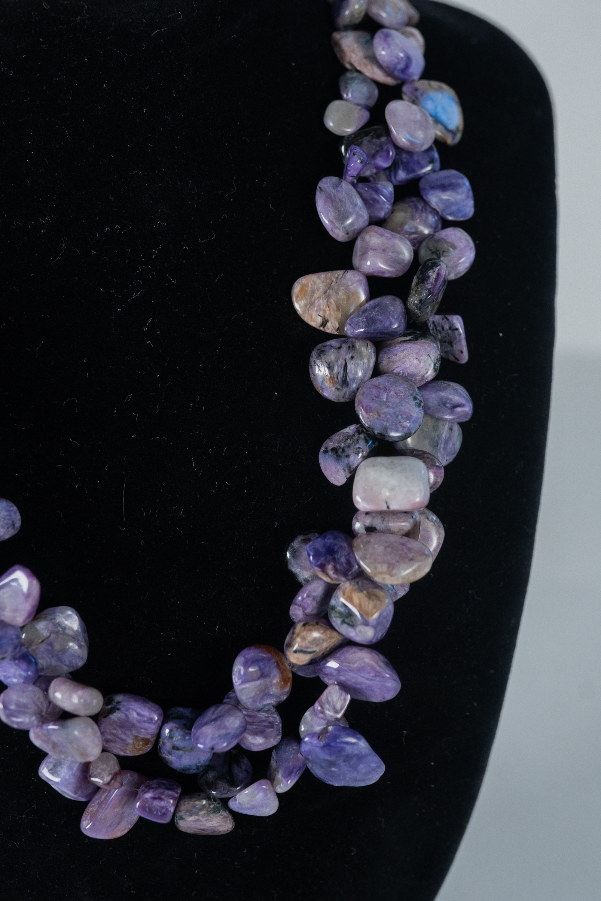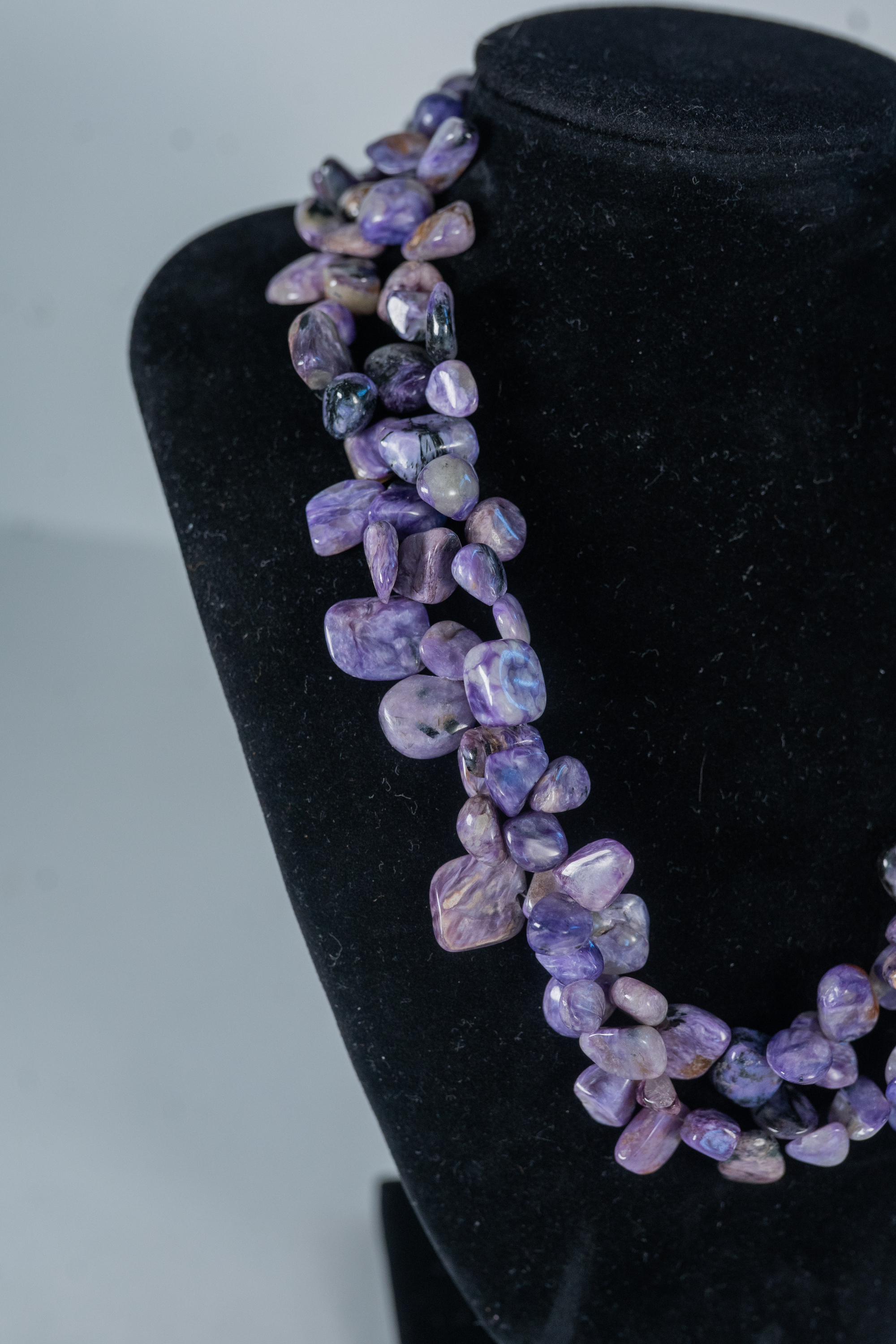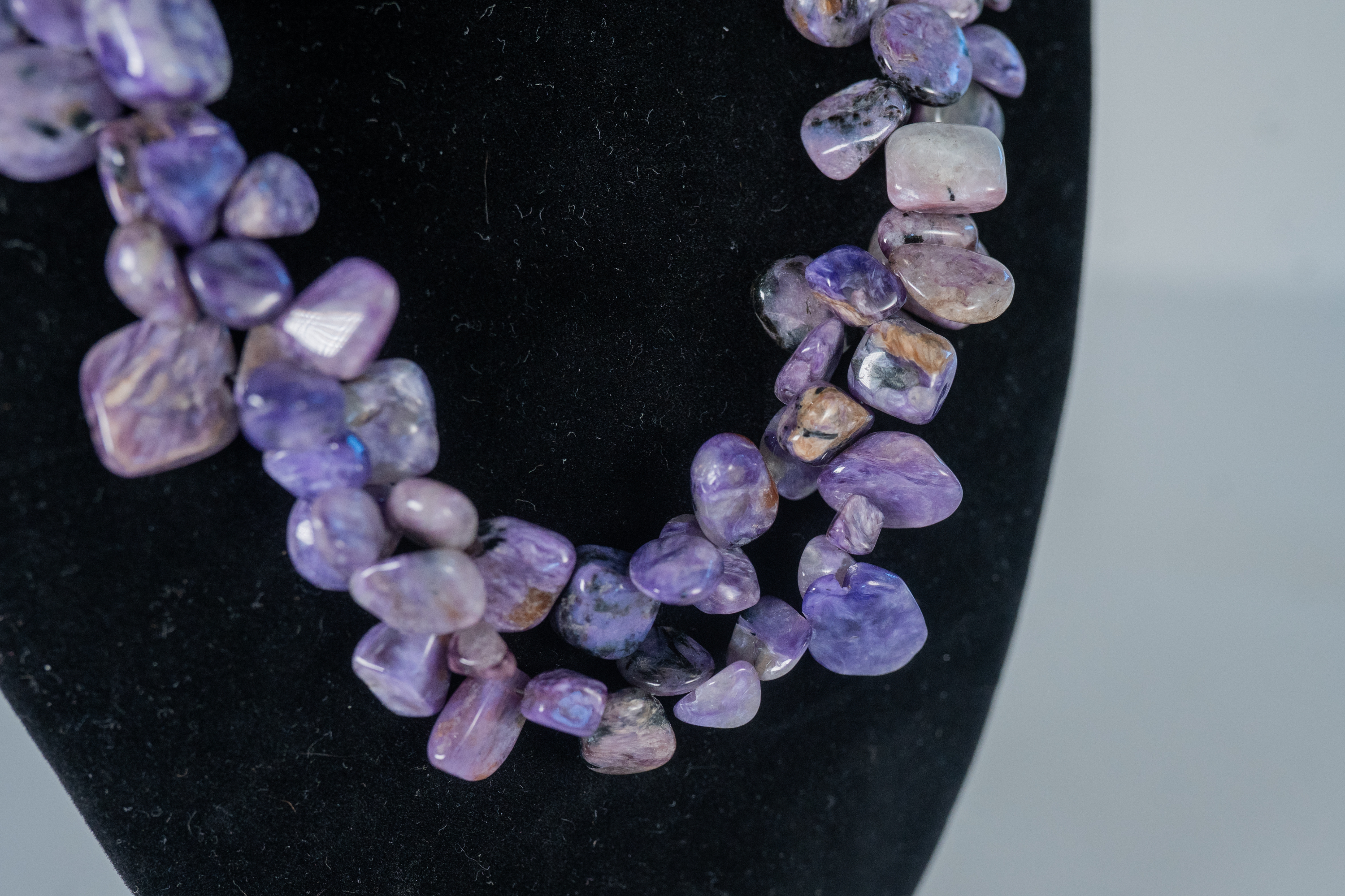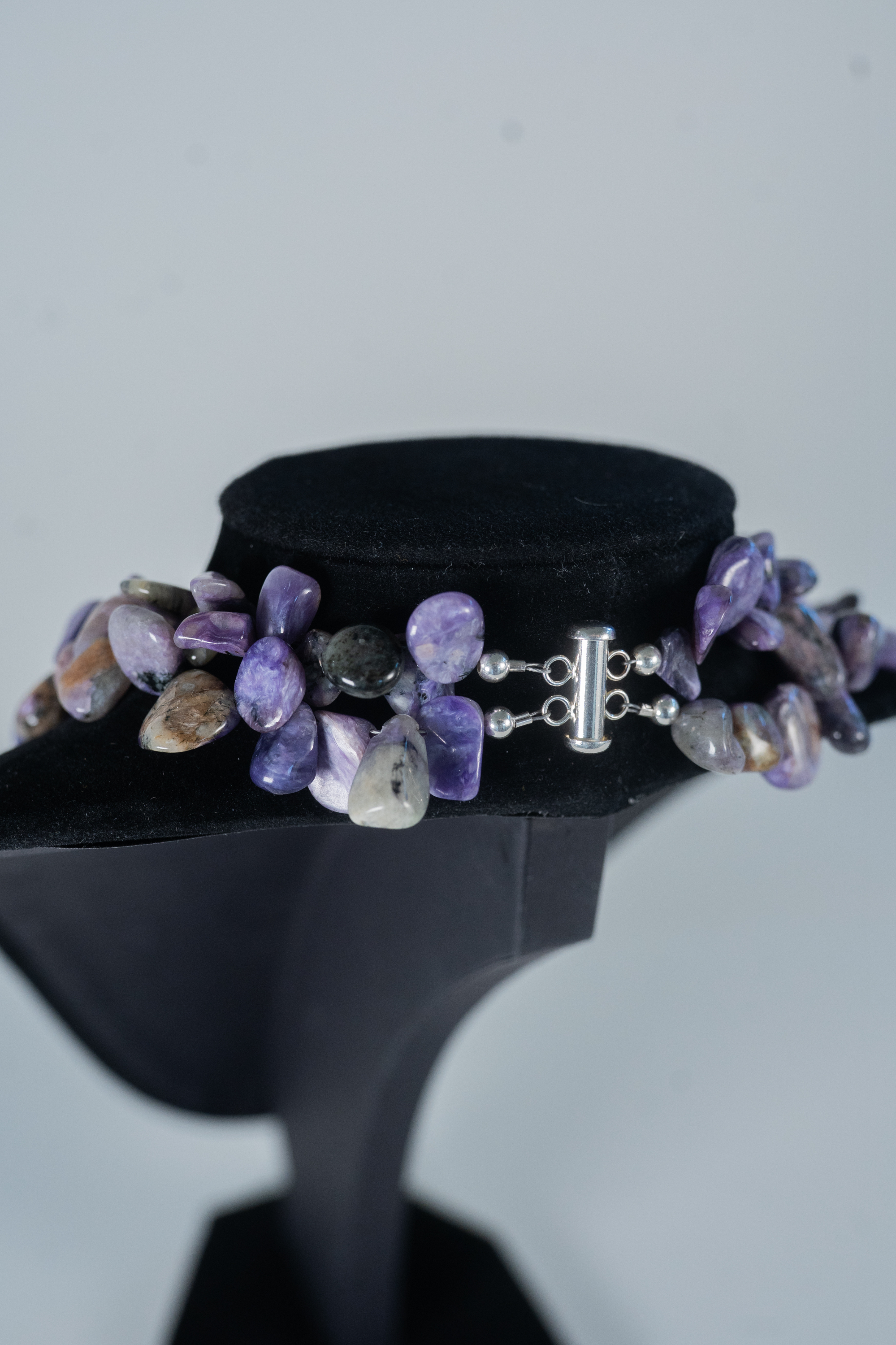 Sugilite two strand necklace featuring rough cut polished gemstones with a sterling silver clasp and accent beads. Length 18″.
