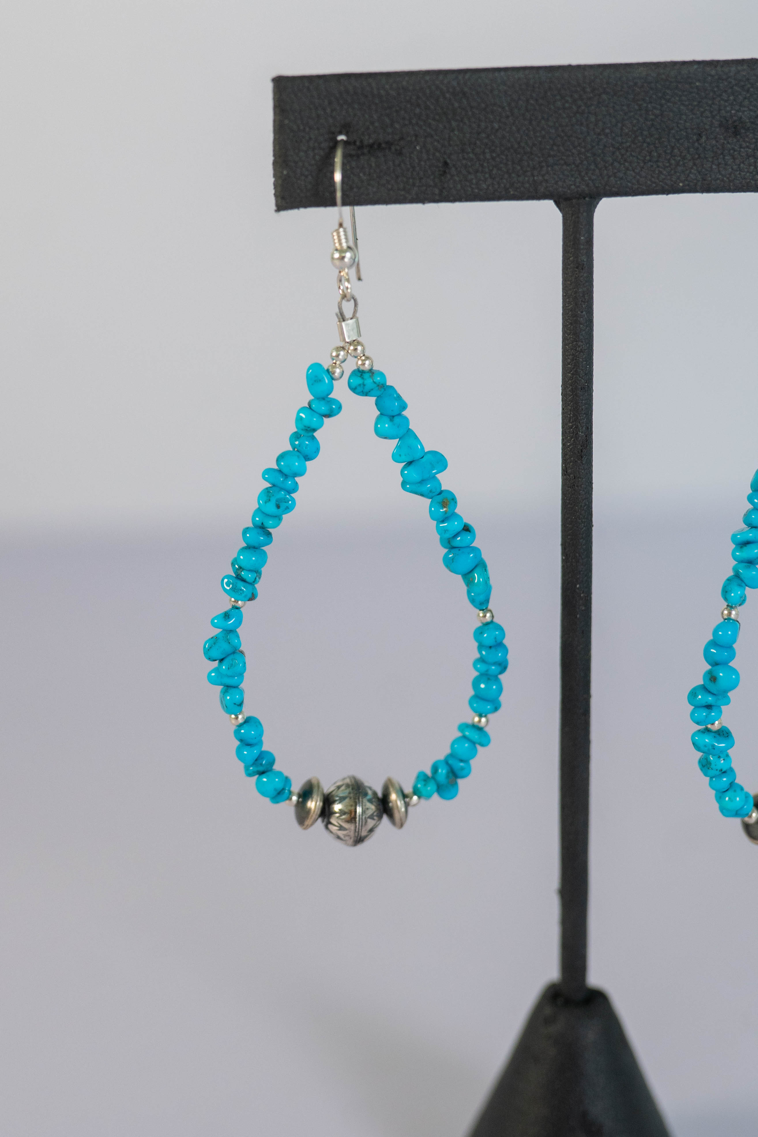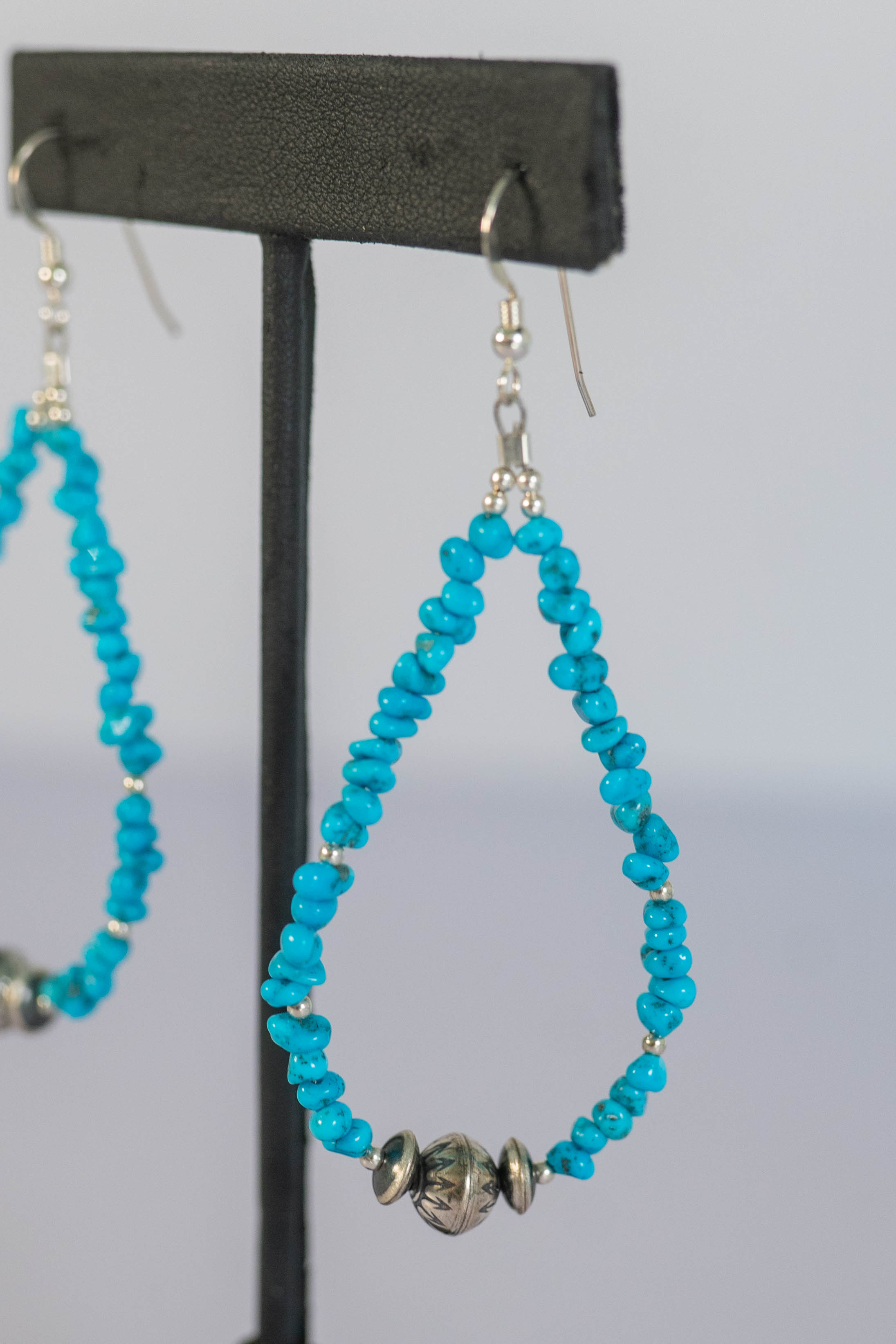 Native American Navajo Sleeping Beauty Turquoise chip wire earrings accentuated with sterling silver 8mm hand stamped Navajo Pearls. Length including wire 3″ x 1 1/4″ Width.