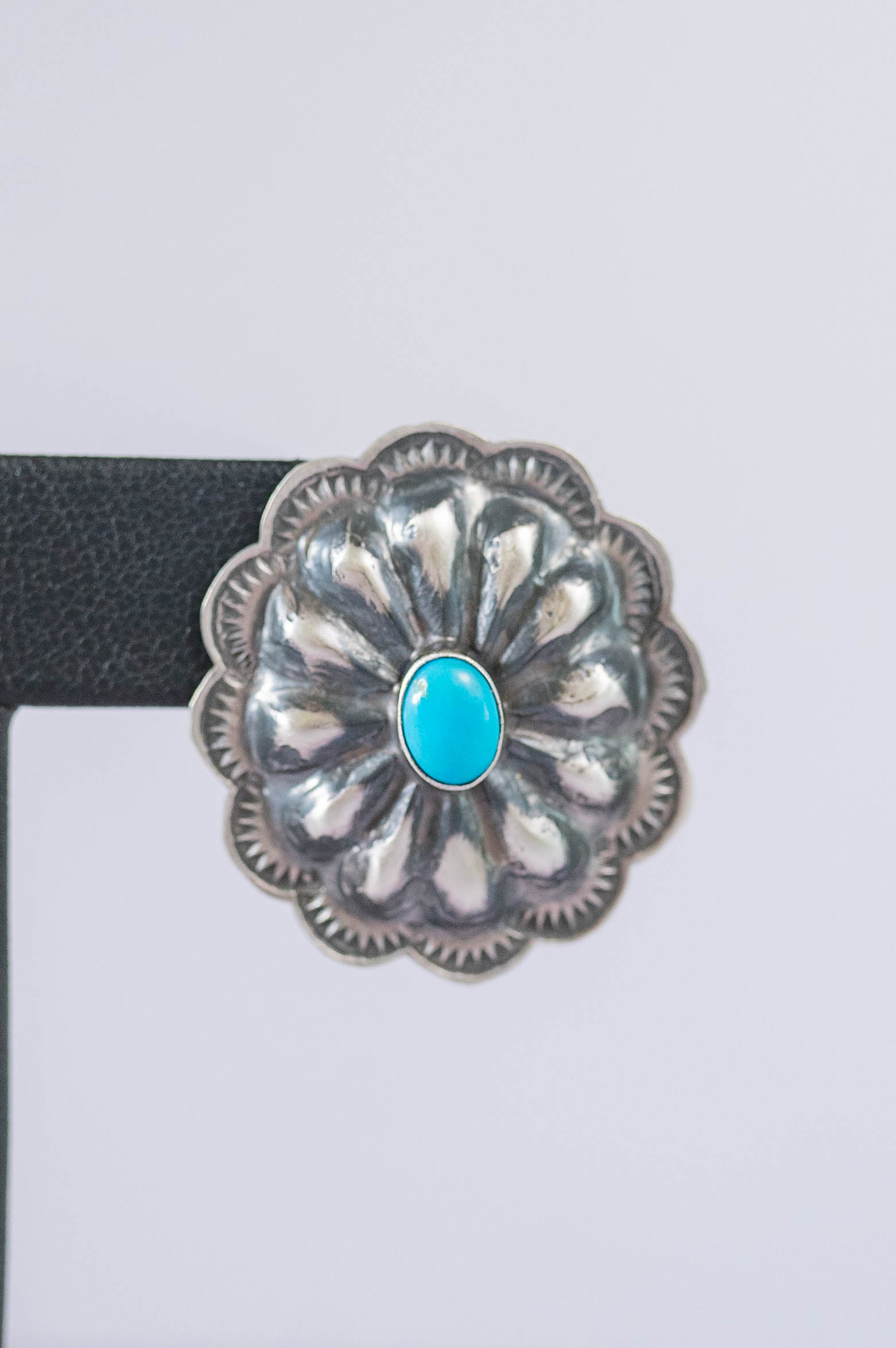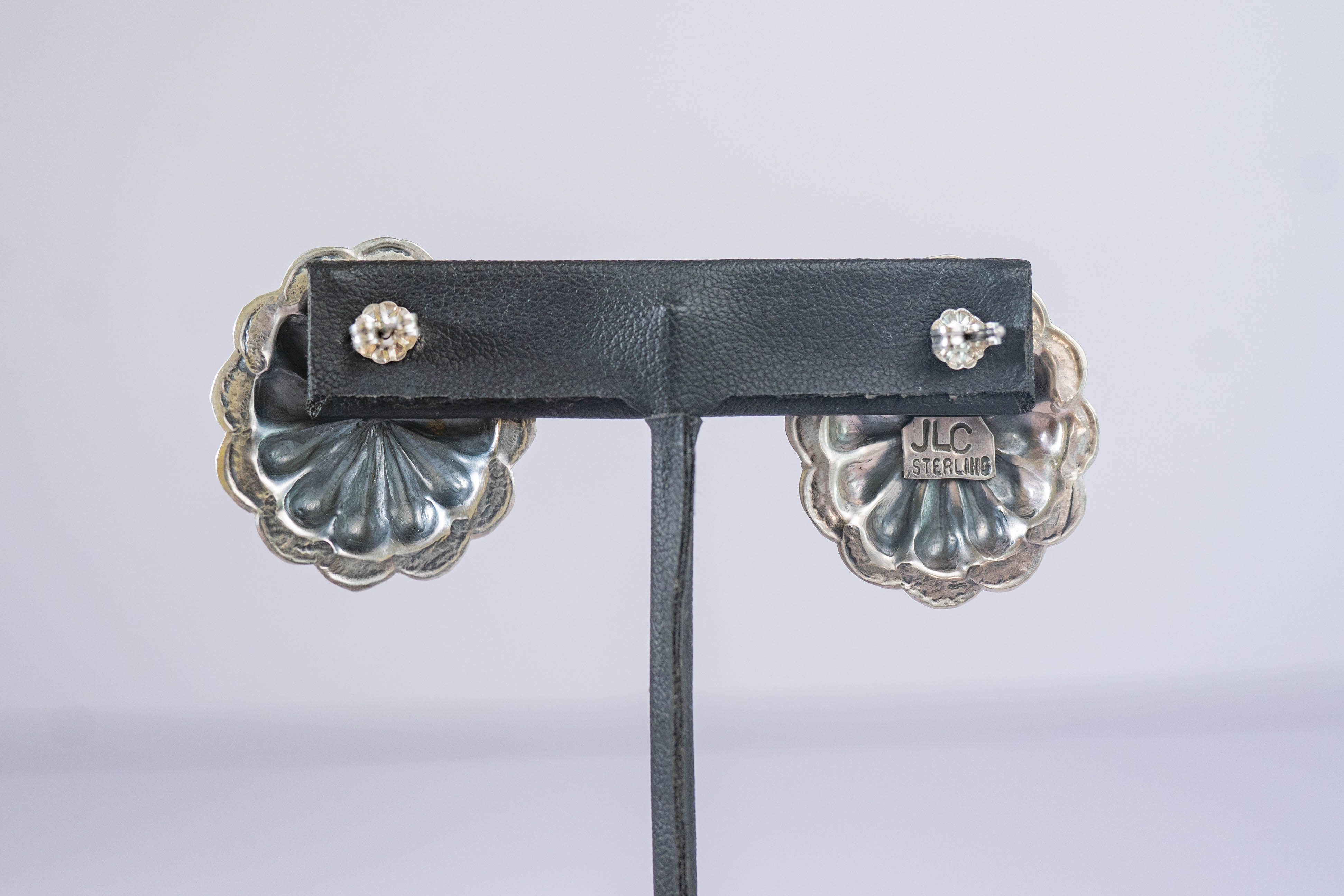 Native American Navajo sterling silver concho post oxidized earrings featuring a AAAAA Kingman turquoise gemstones with hand stamped scalloped edges Length 1 1/8″ x 1 ‘ width Signed JLC