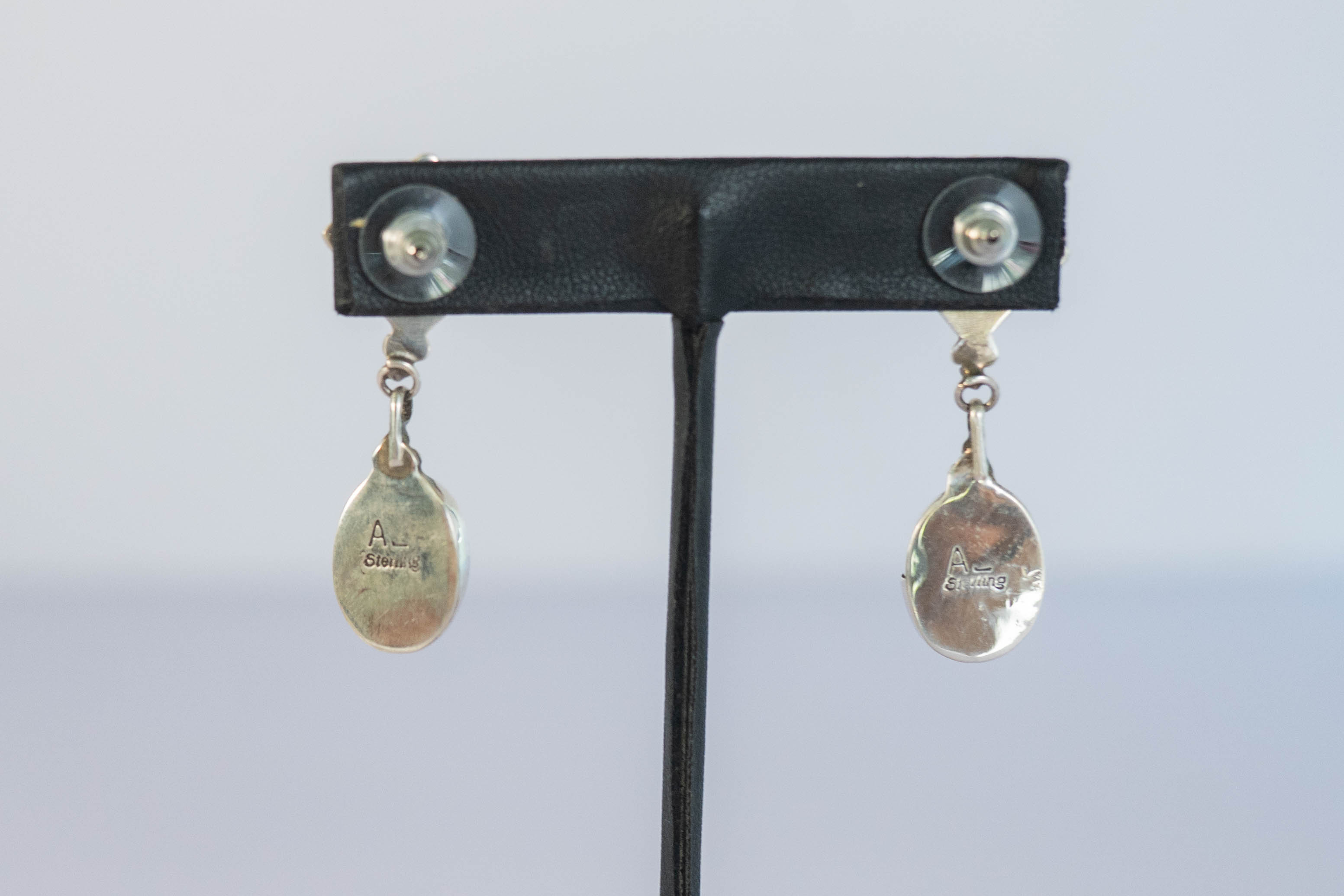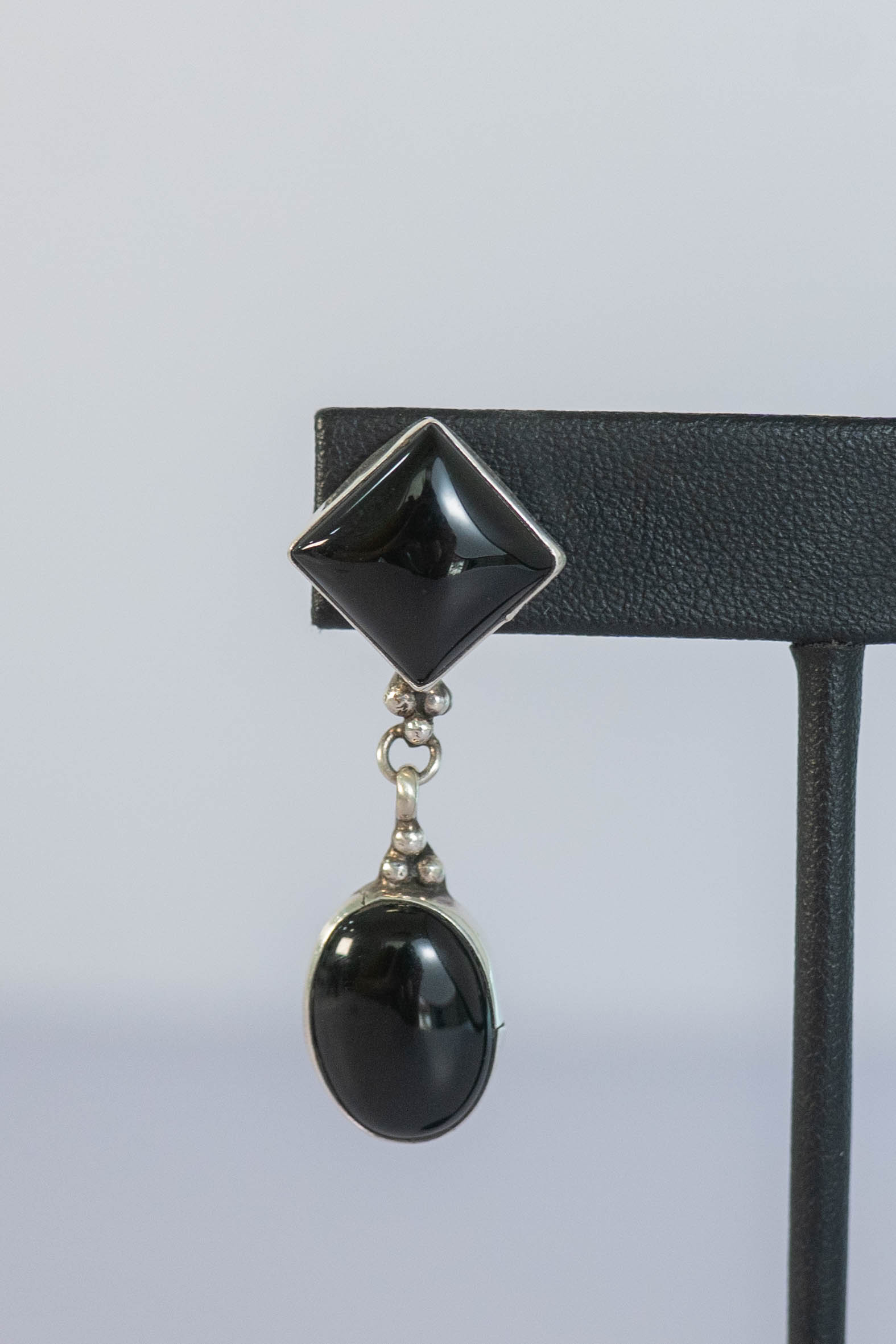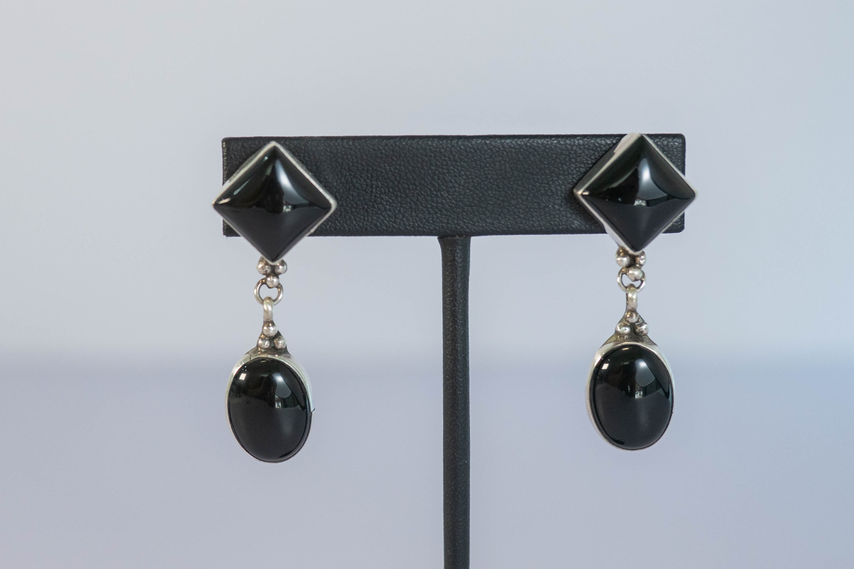 Native American Navajo sterling silver classic black onyx post-dangle earrings with bead applique clusters between the gemstones. L 13/4″ x W 5/8″ Signed AL.