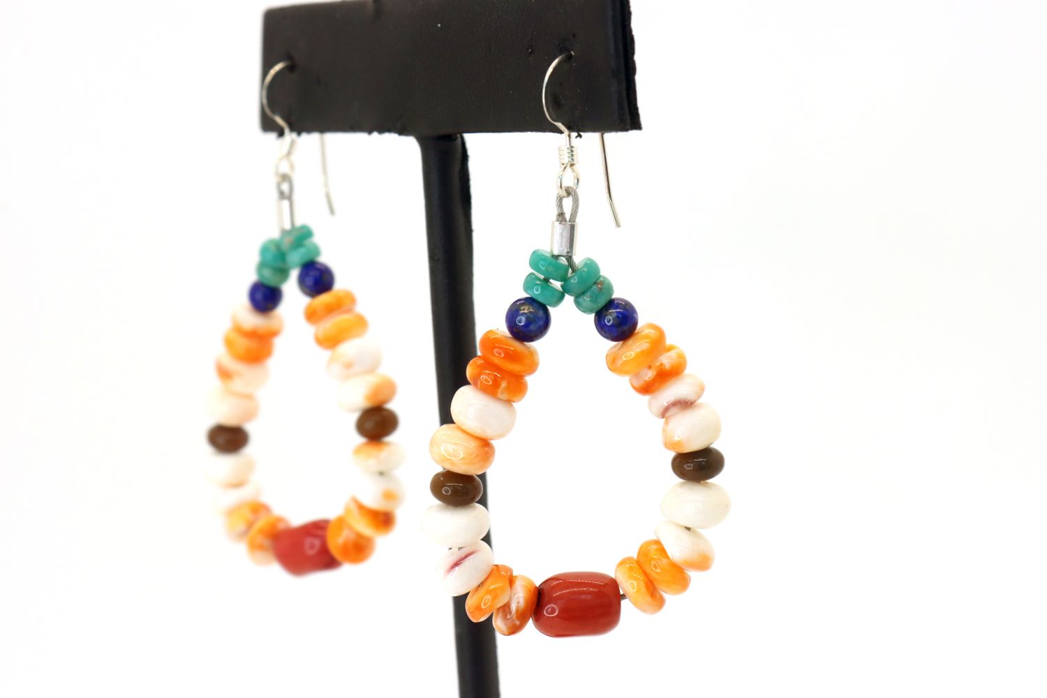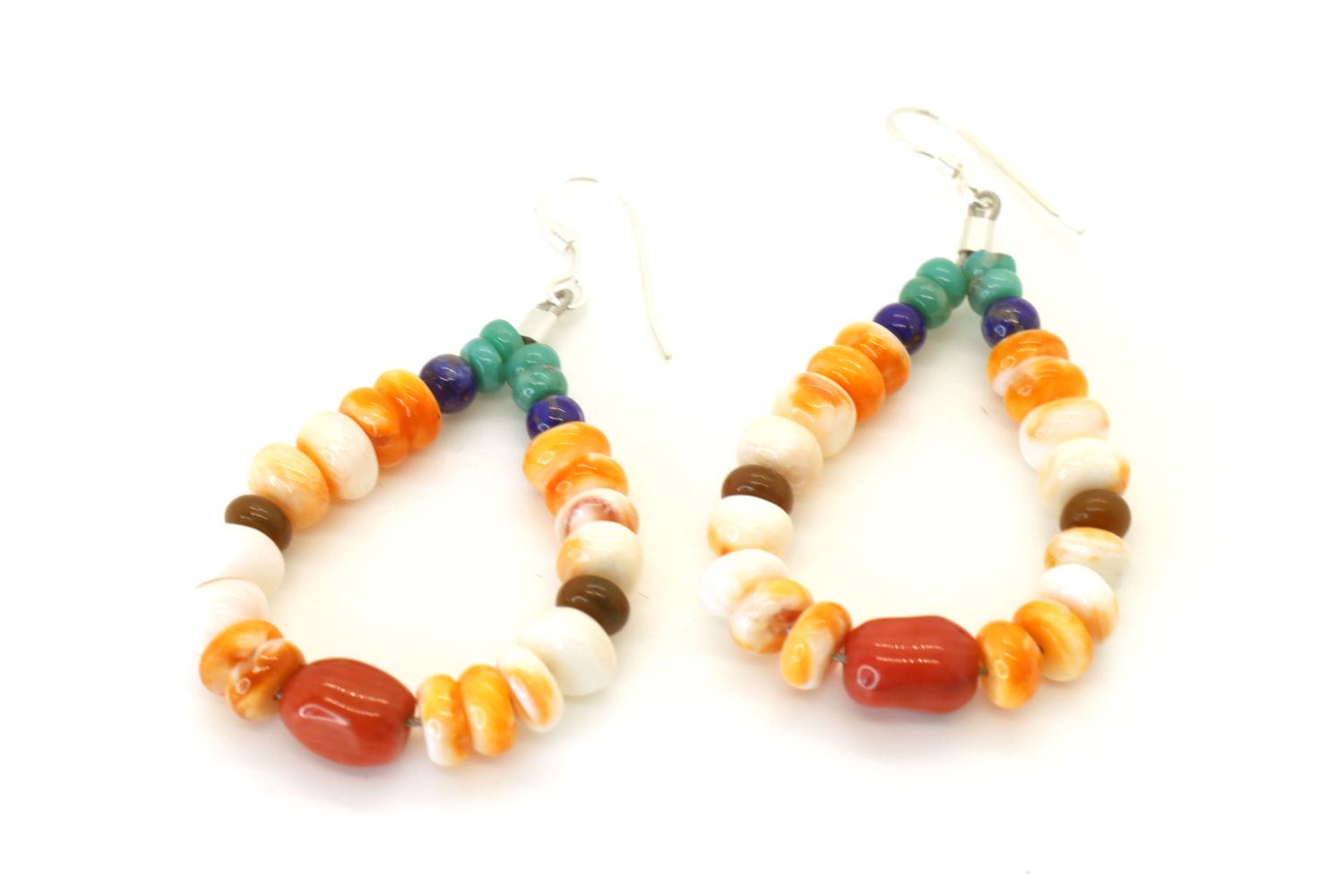 Native American Navajo Multi Gemstone Earrings sterling silver wire earrings featuring Turquoise, Lapis, orange spiny oyster shell and Coral Length 2 1/4″ X 1 1/8″ Width