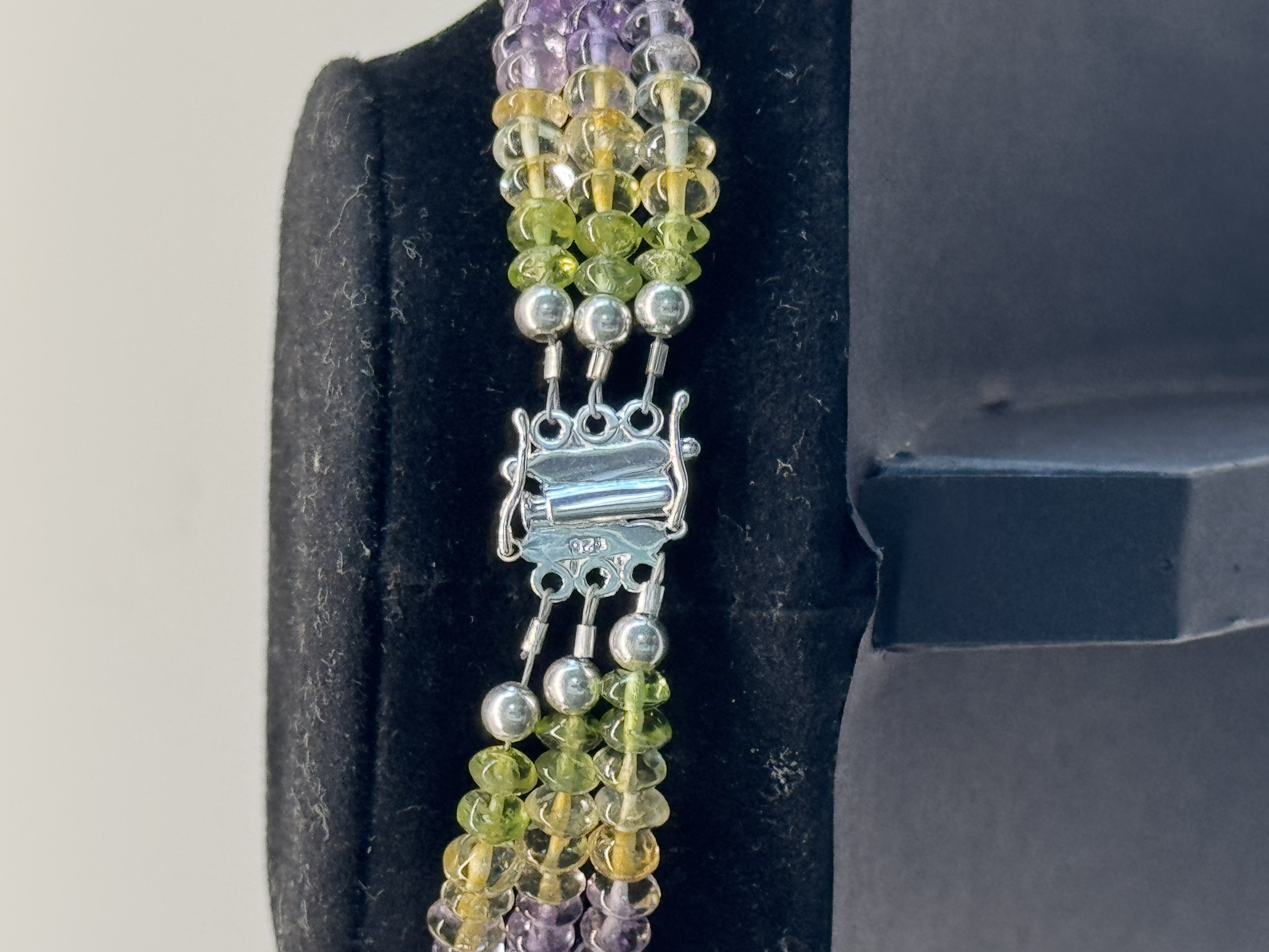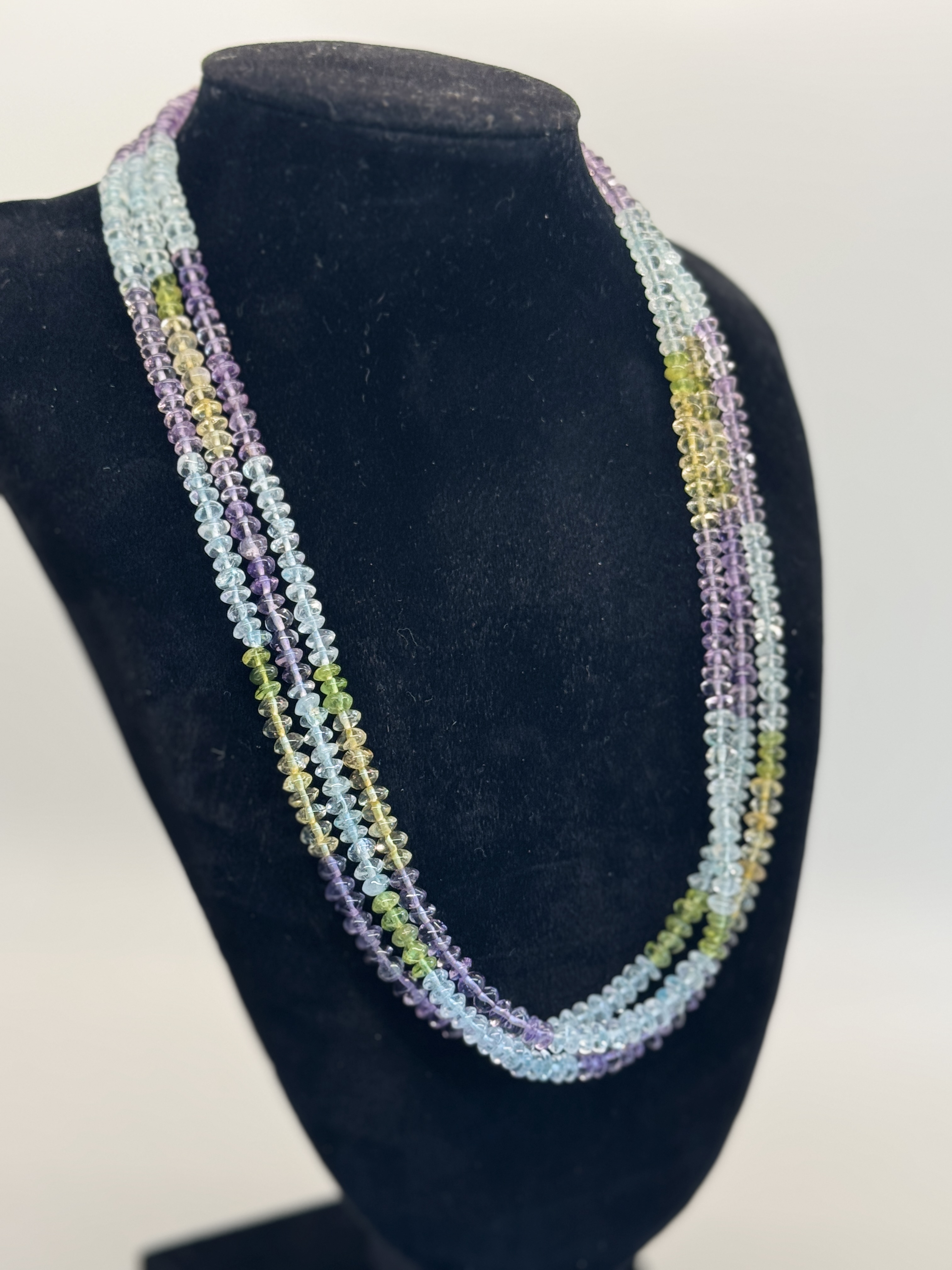 Exquisite multi-gemstone 3 strand necklace featuring 5mm center drilled saucer gemstones; Amethyst, Citrine, Blue Topaz and Peridot. The necklace is 20″ long with a sterling silver decorative clasp.