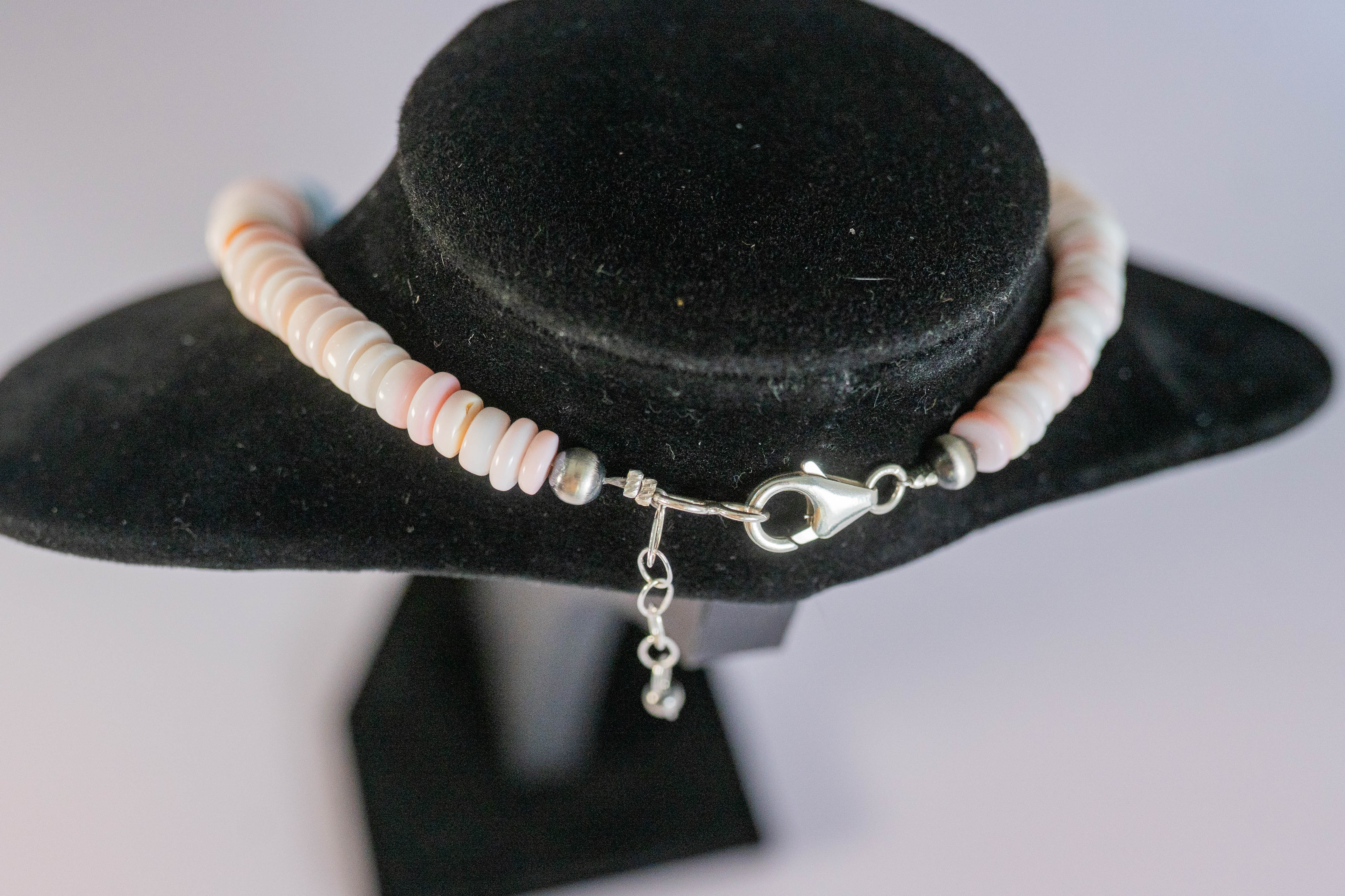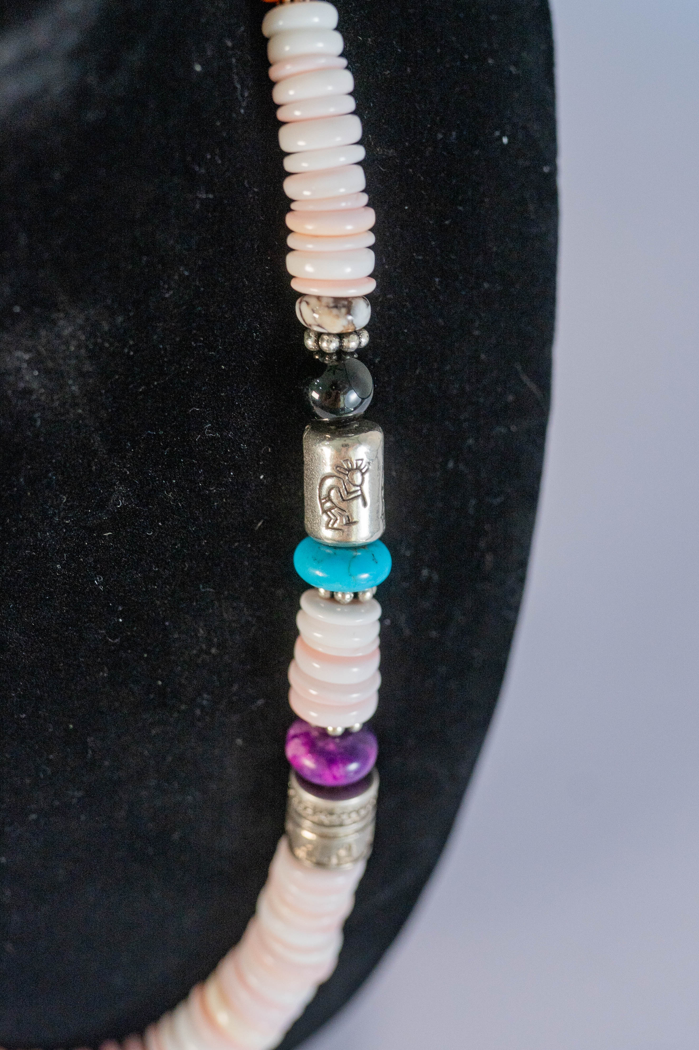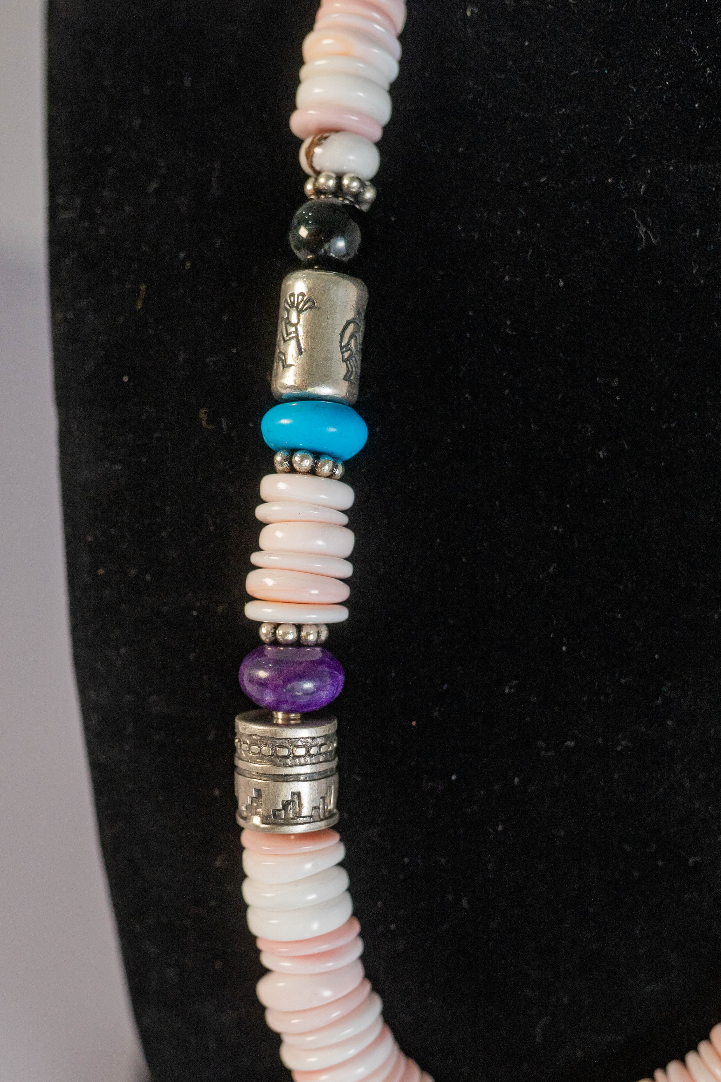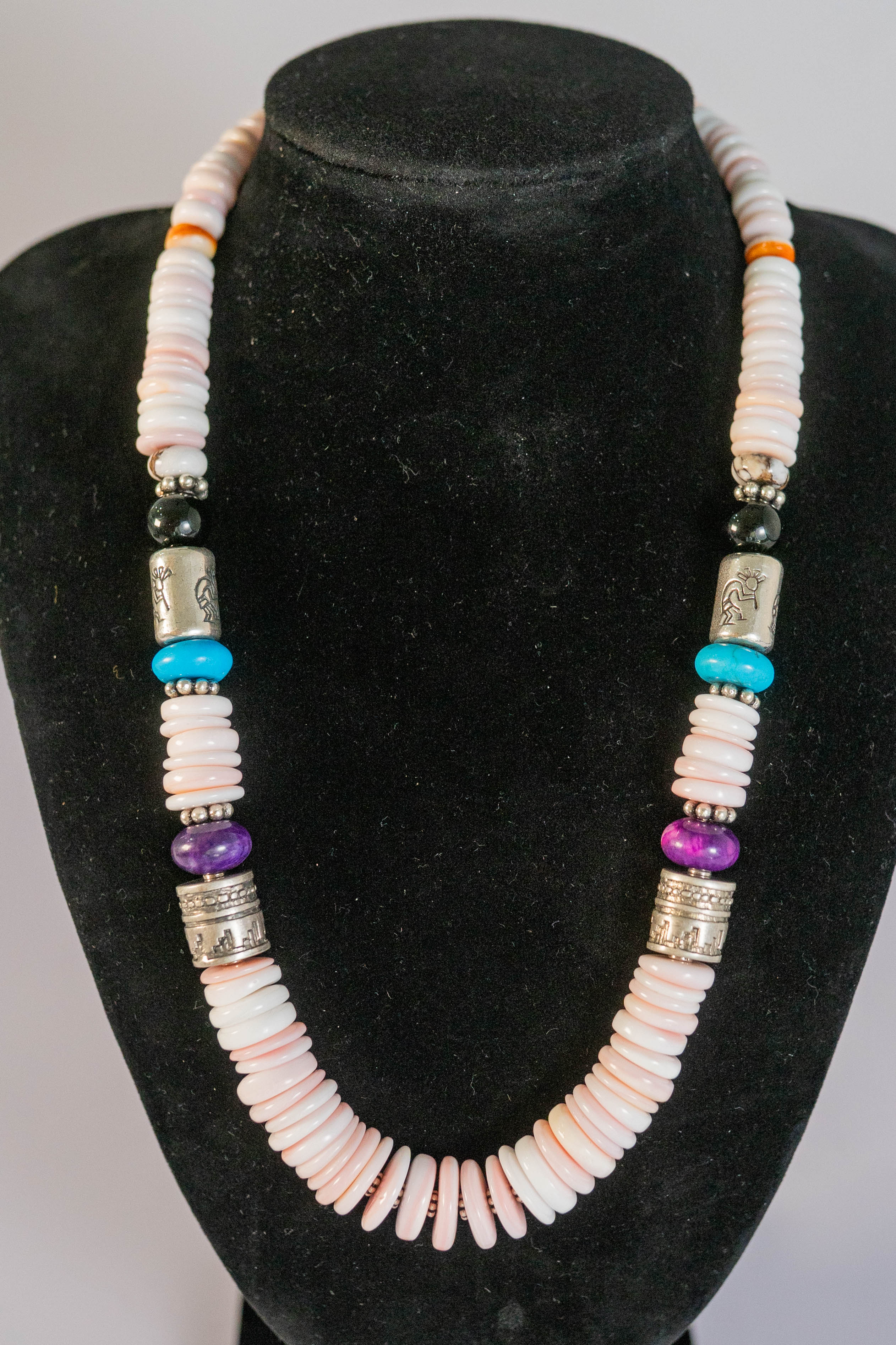 Native American Navajo wonderful Pink Conch Shell graduated round gemstone necklace accentuated with Sleeping Beauty Turquoise, Purple and Orange Spiny Oyster Shell and Black Onyx gemstones, sterling silver spacer beads and findings. L 18″ with a 2″ extender.