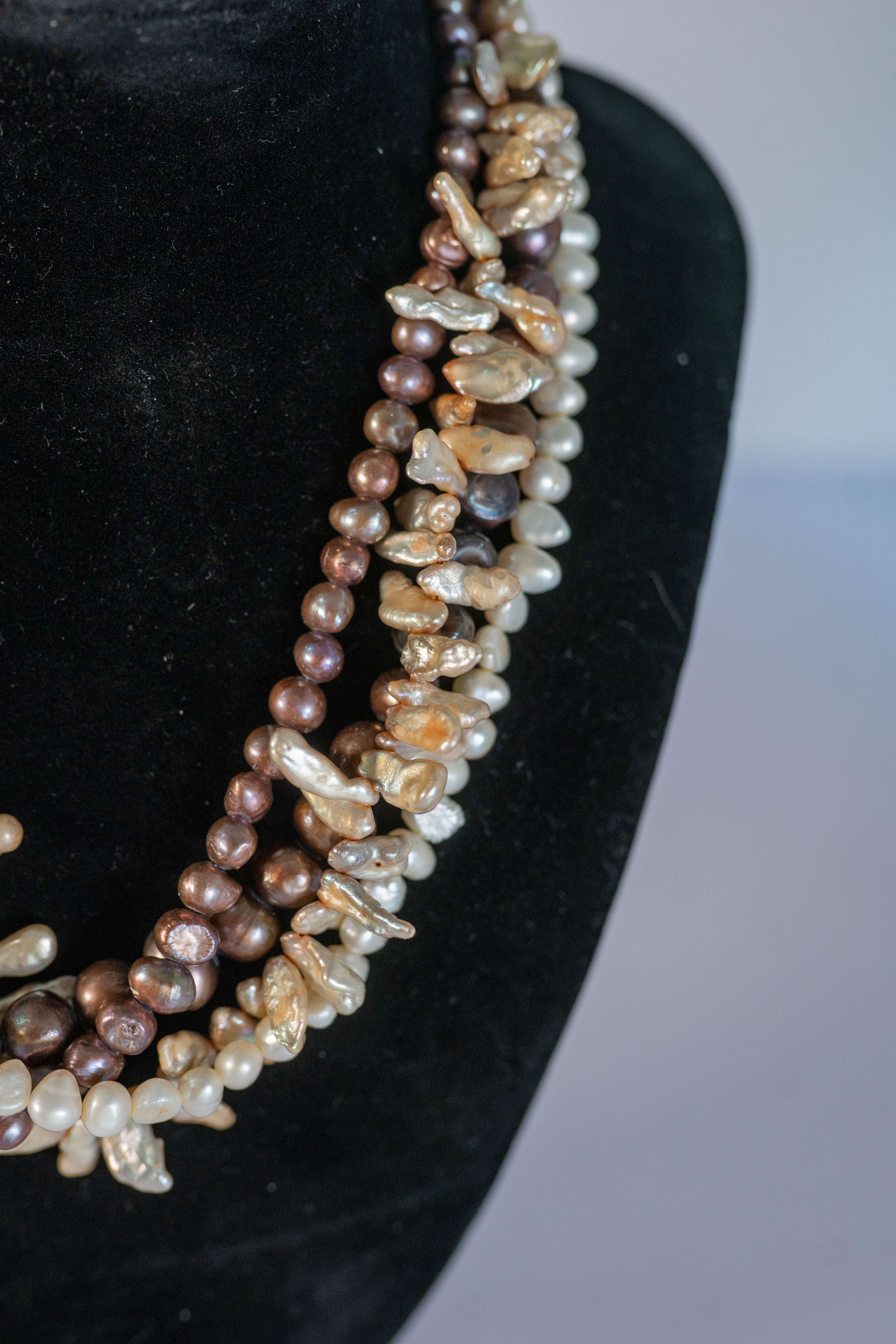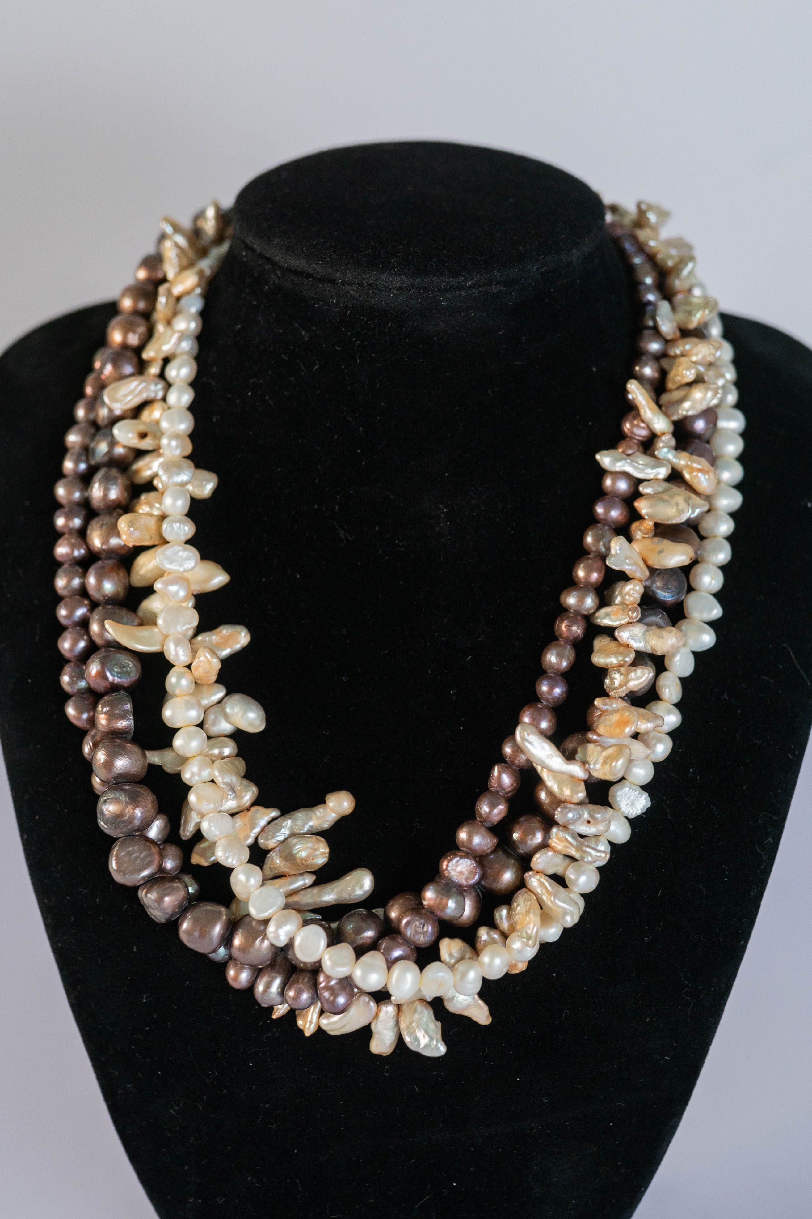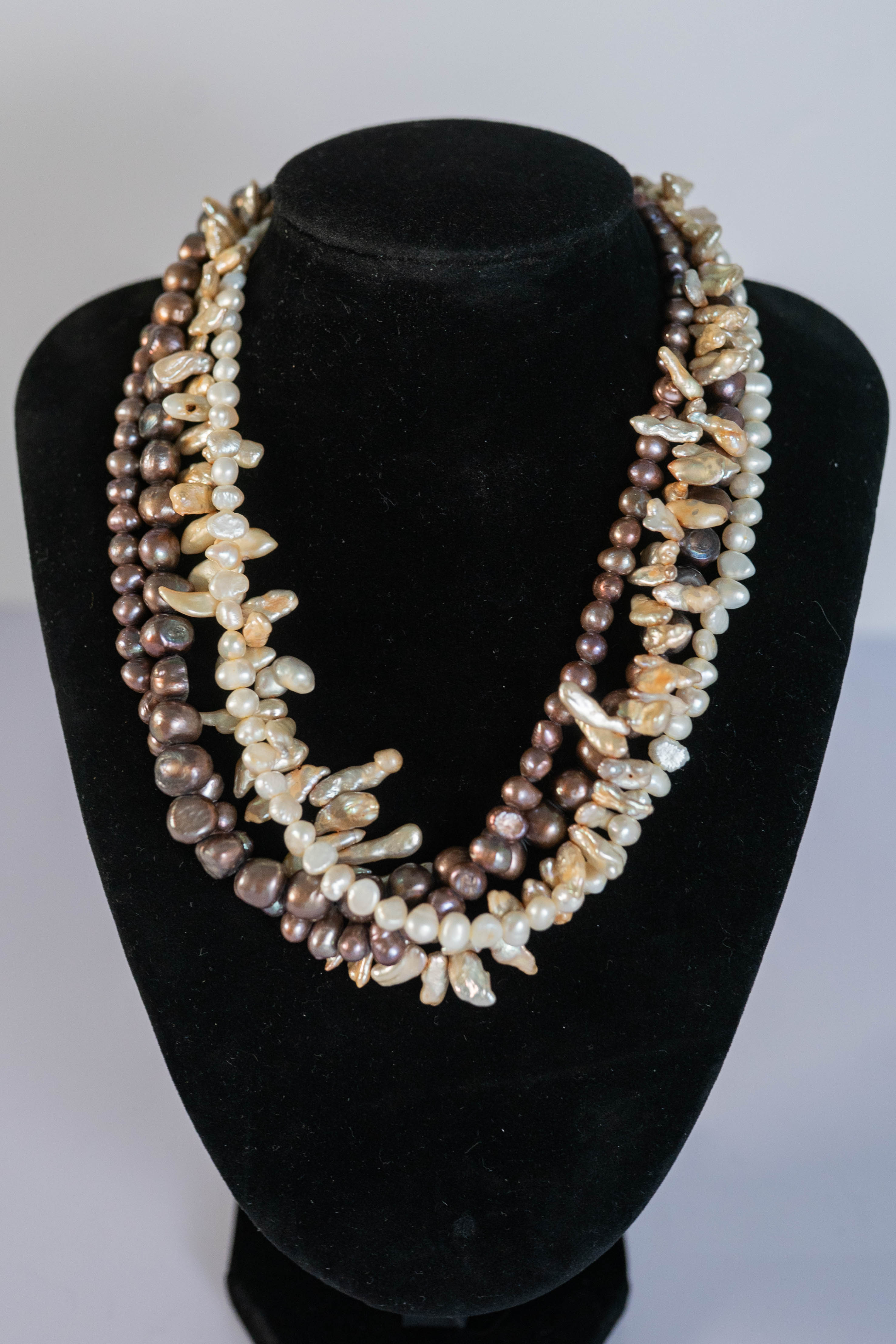 Native American Navajo lovely four strand Freshwater Pearl necklace featuring biwa, potato and round pearl gemstones, sterling silver end caps and toggle clasp.