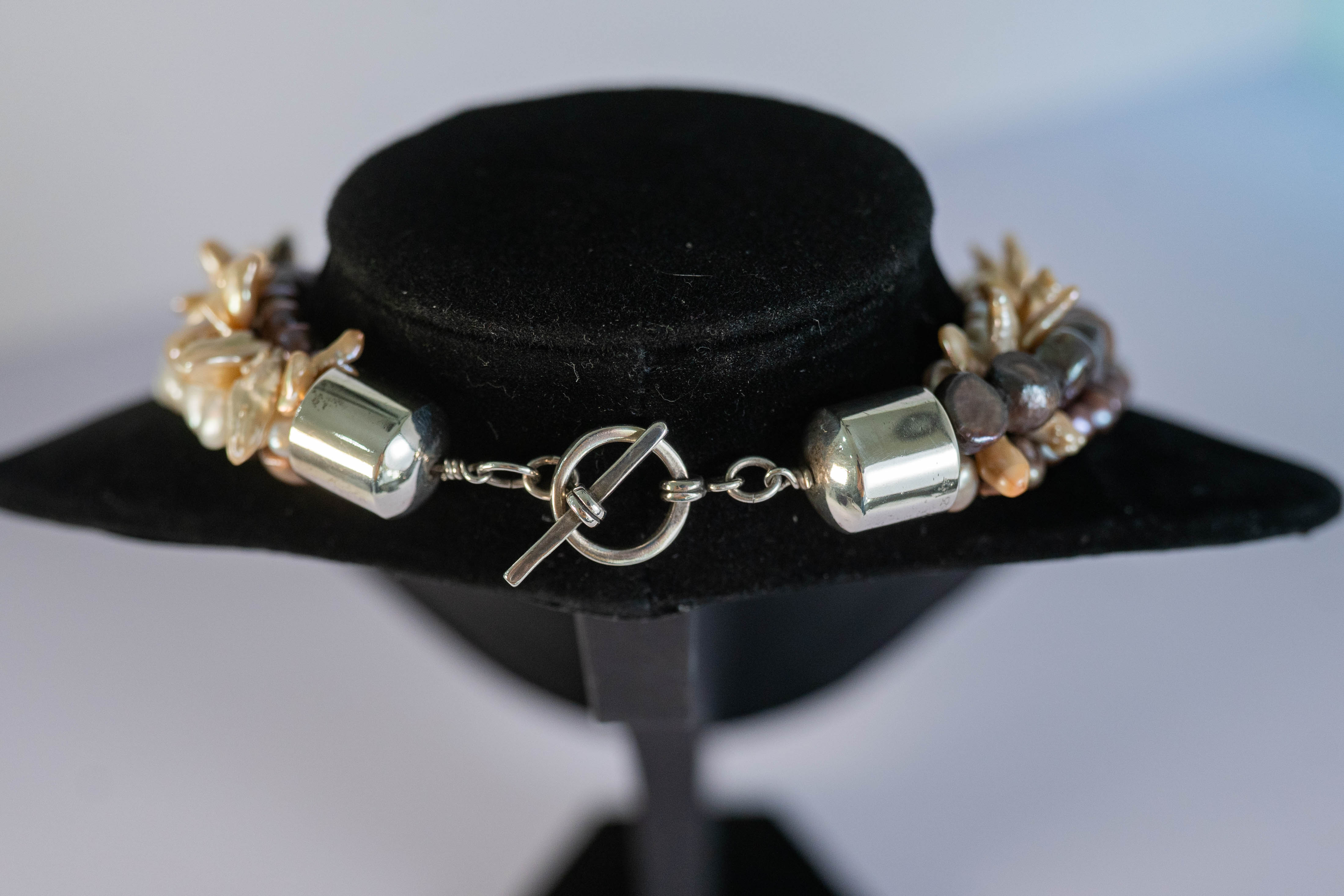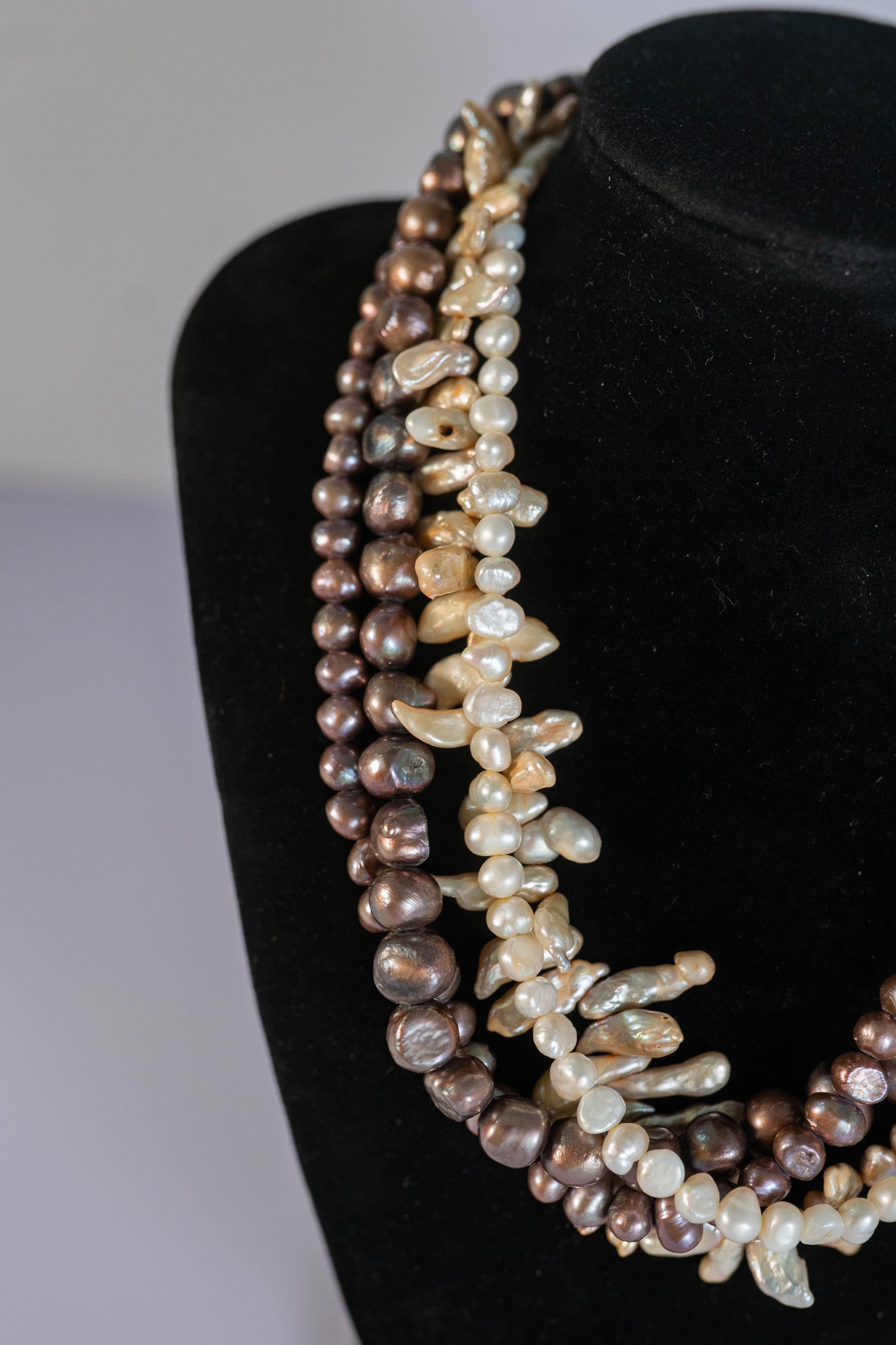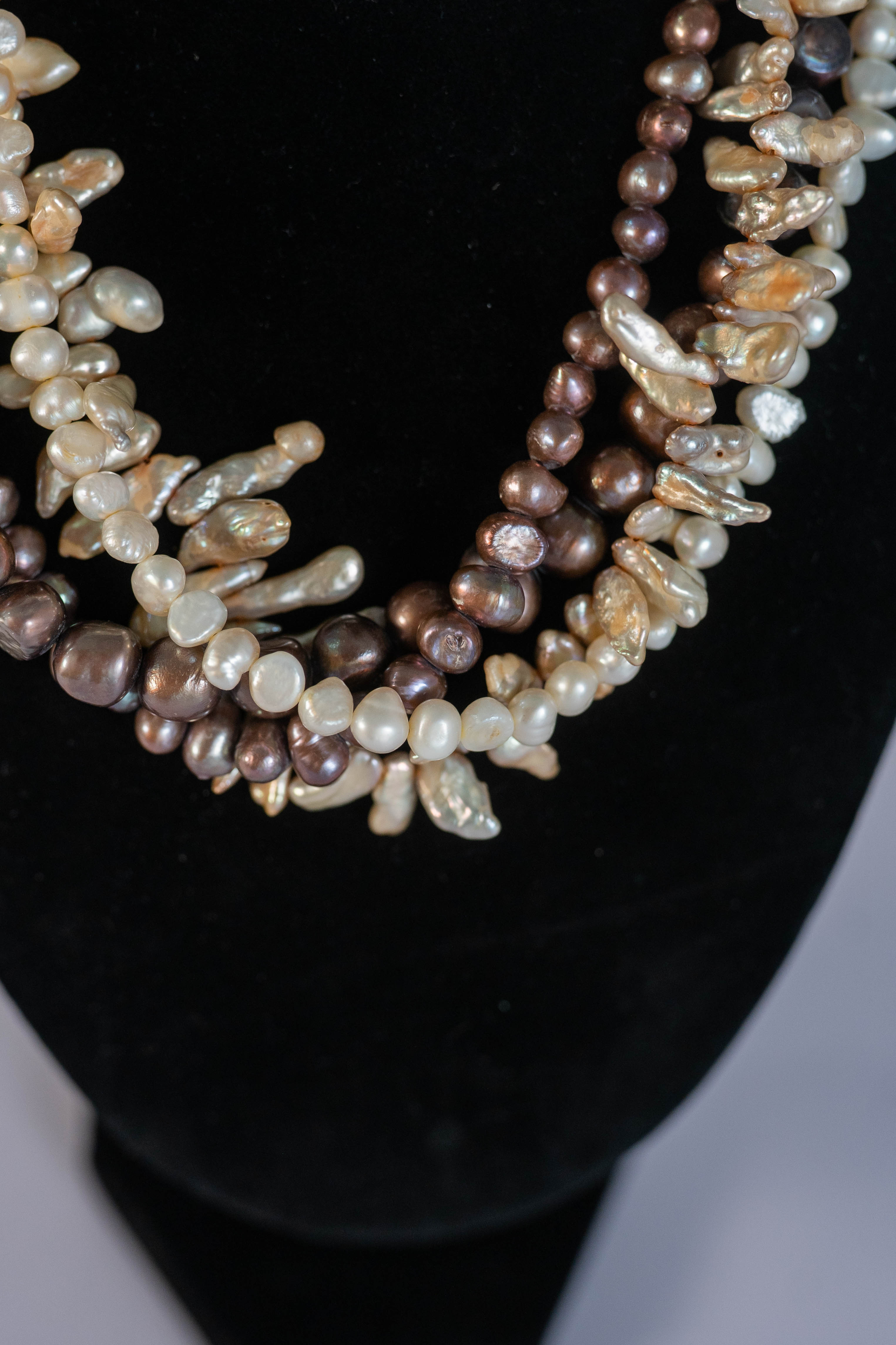 Native American Navajo lovely four strand Freshwater Pearl necklace featuring biwa, potato and round pearl gemstones, sterling silver end caps and toggle clasp.