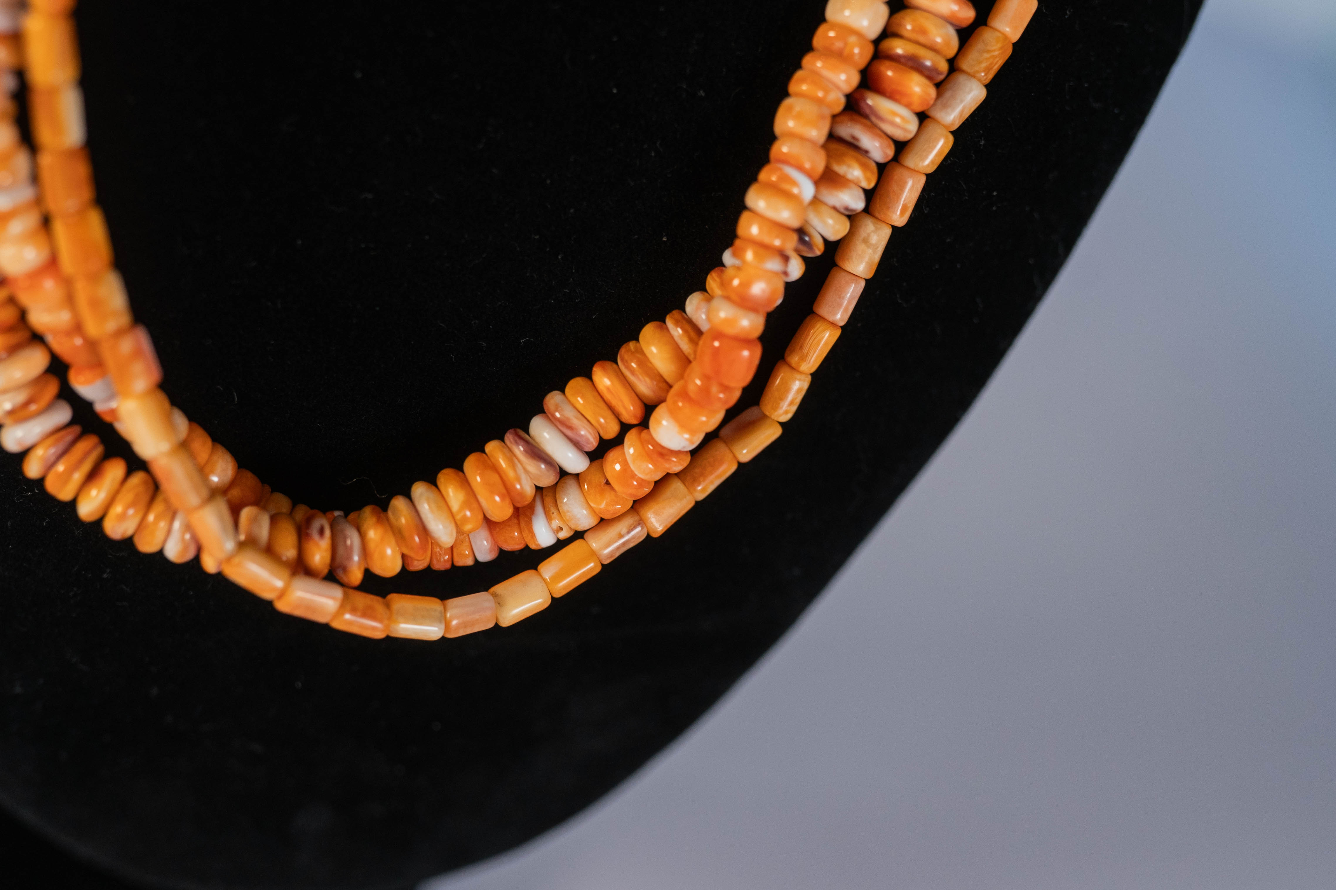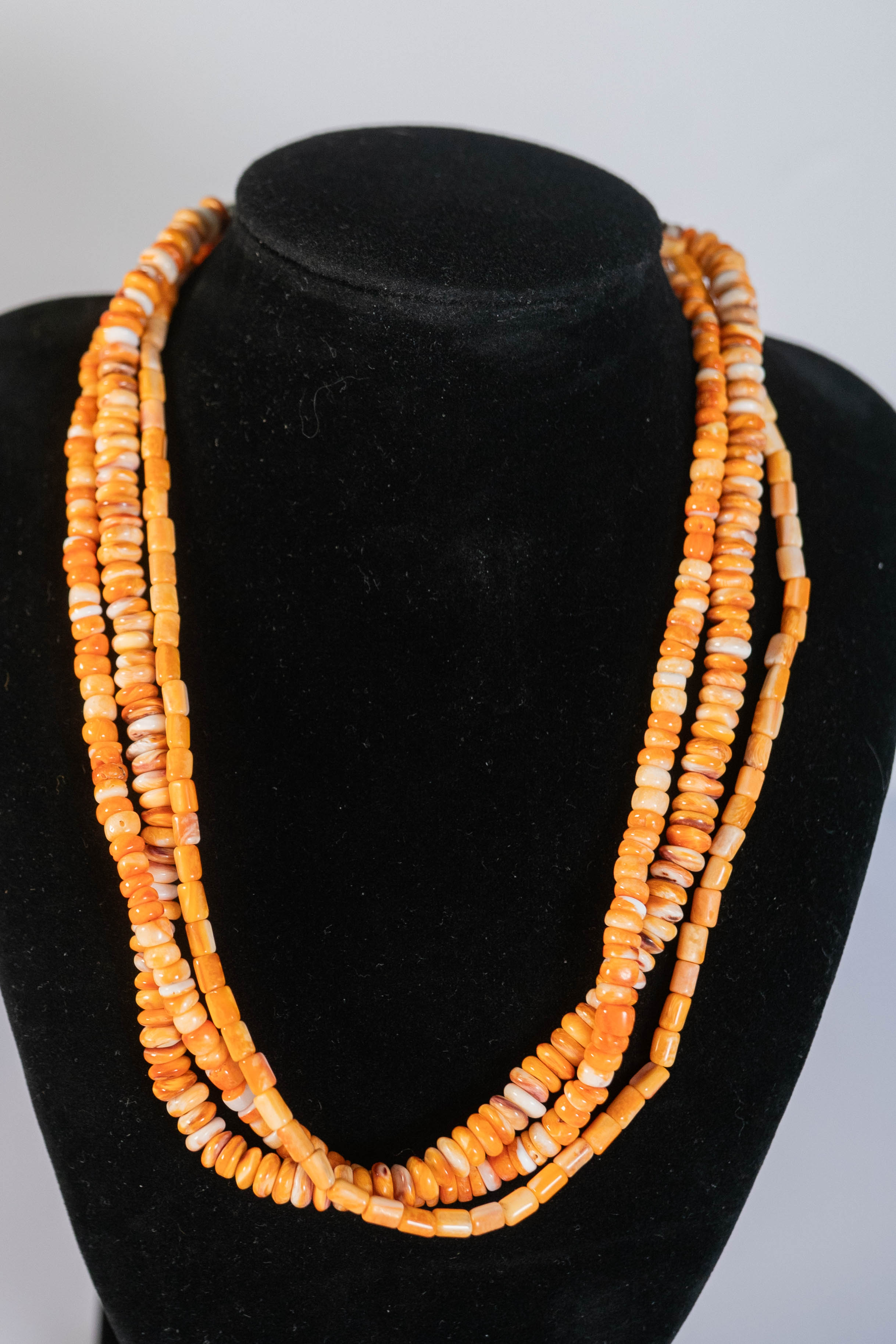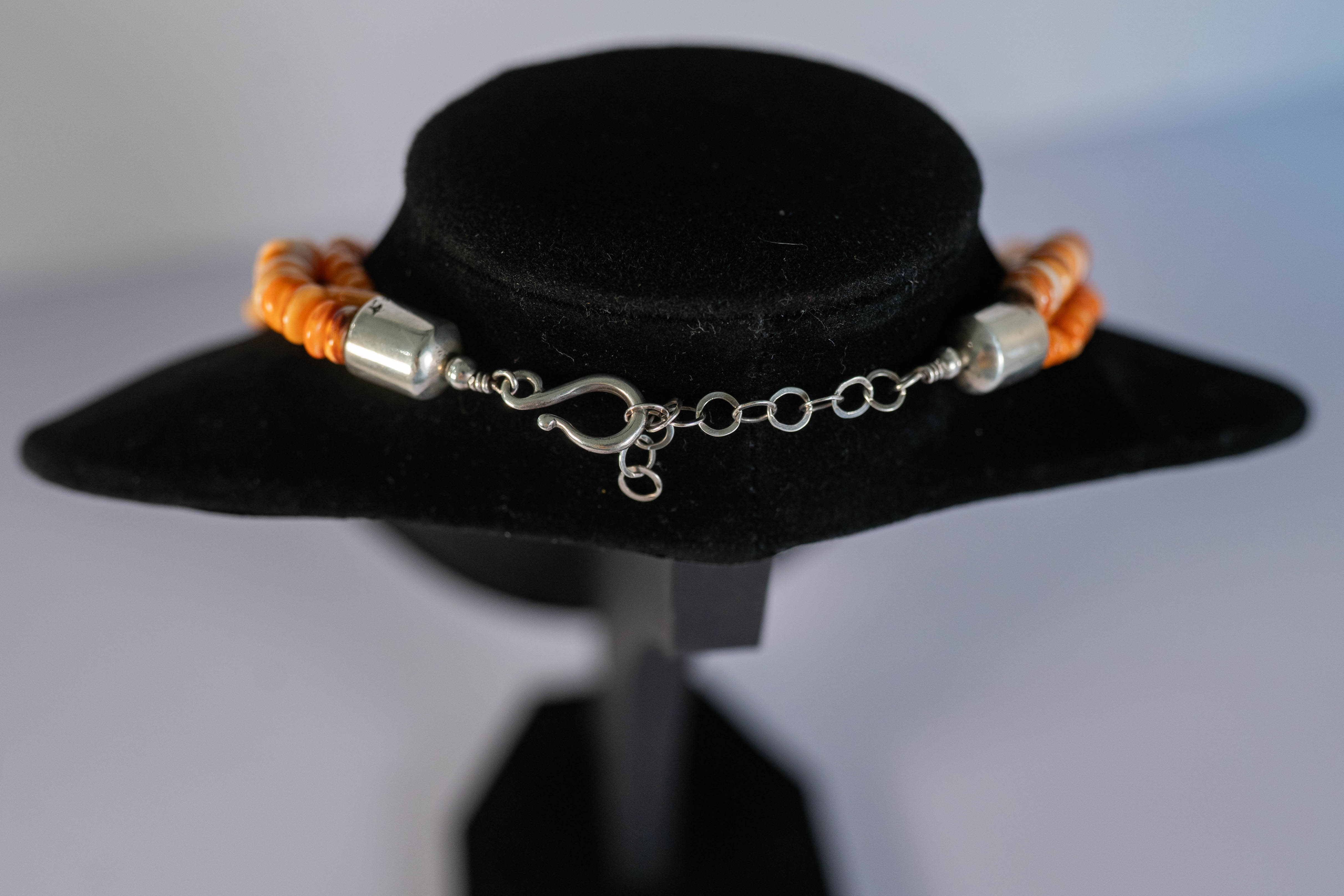 Native American Navajo three strand necklace featuring AAAA Orange Spiny Oyster Shell heishi and rondelle gemstones with sterling silver end caps and findings. 16″ long with a 1 1/2″ extender.