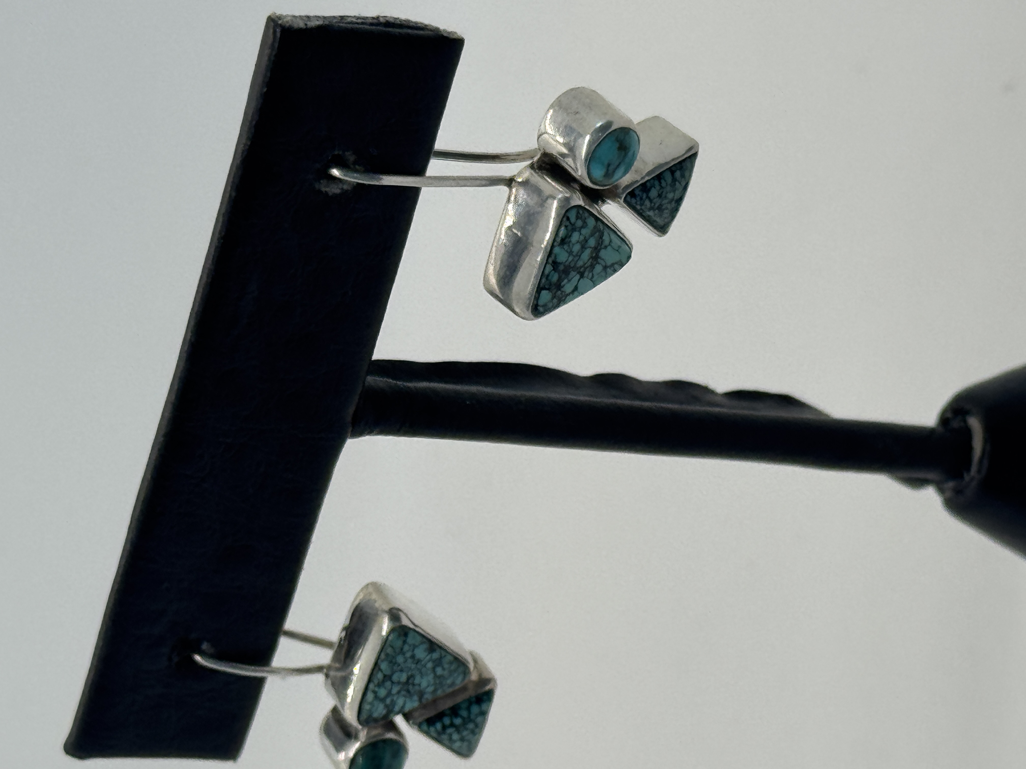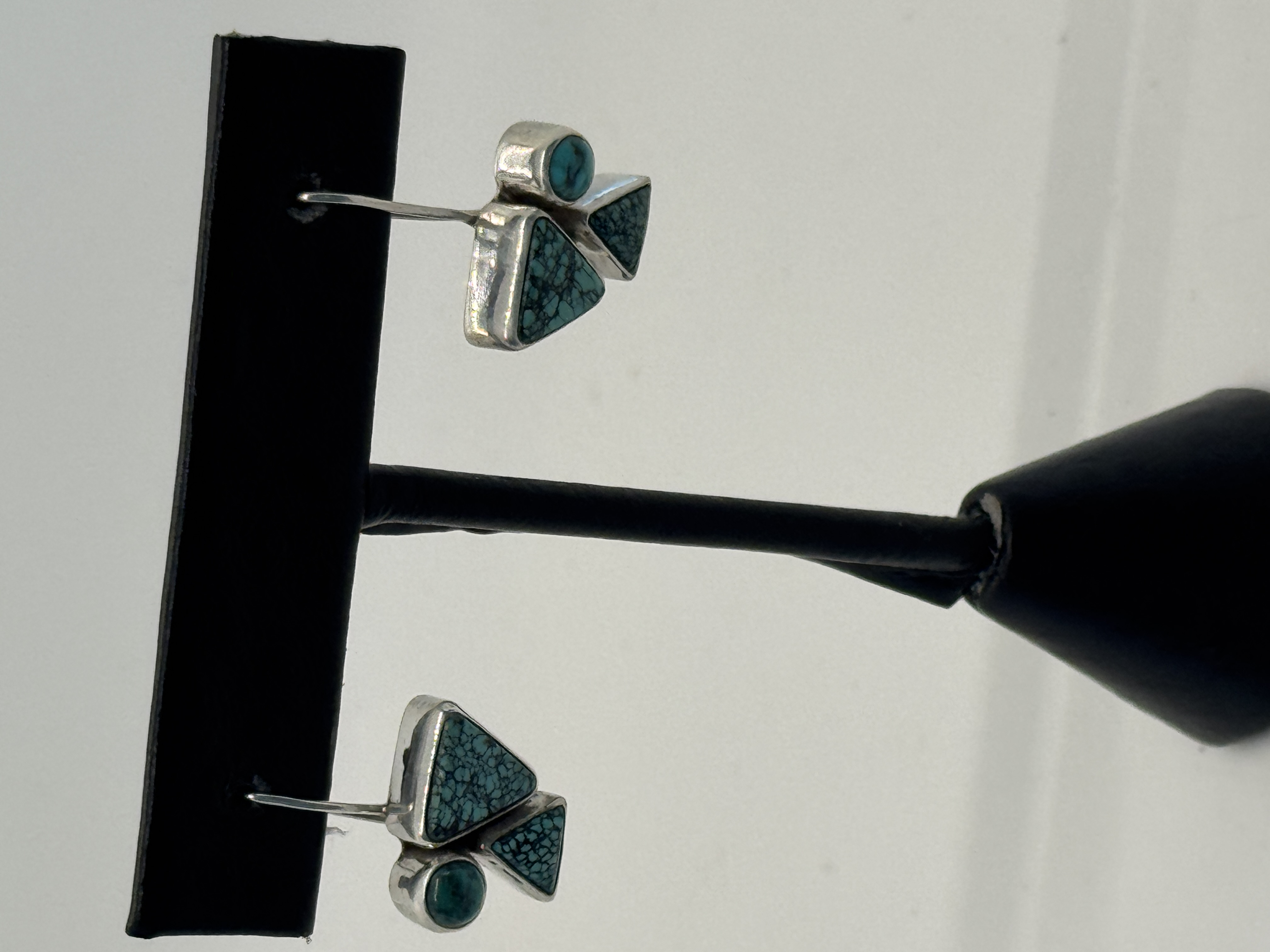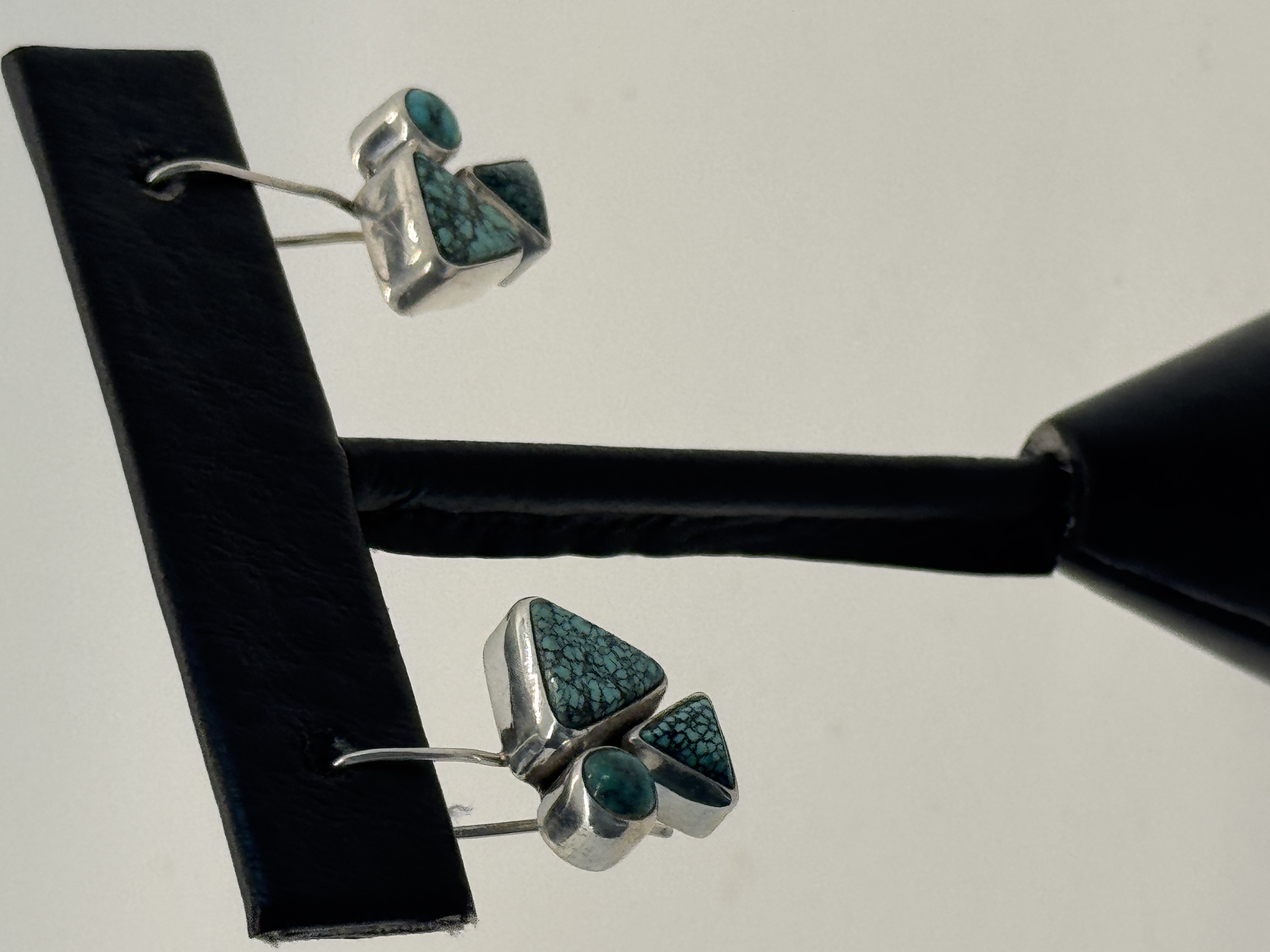 Native American Navajo sterling silver earrings with rare Morenci Turquoise gemstones. Morenci Turquoise is an American classic, highly regarded and sought after by collectors. Each earring has (3) sky blue gemstones with rare spider webbing. L 1 1/4″x 1/2″ W. Signed with the hallmark H2O.