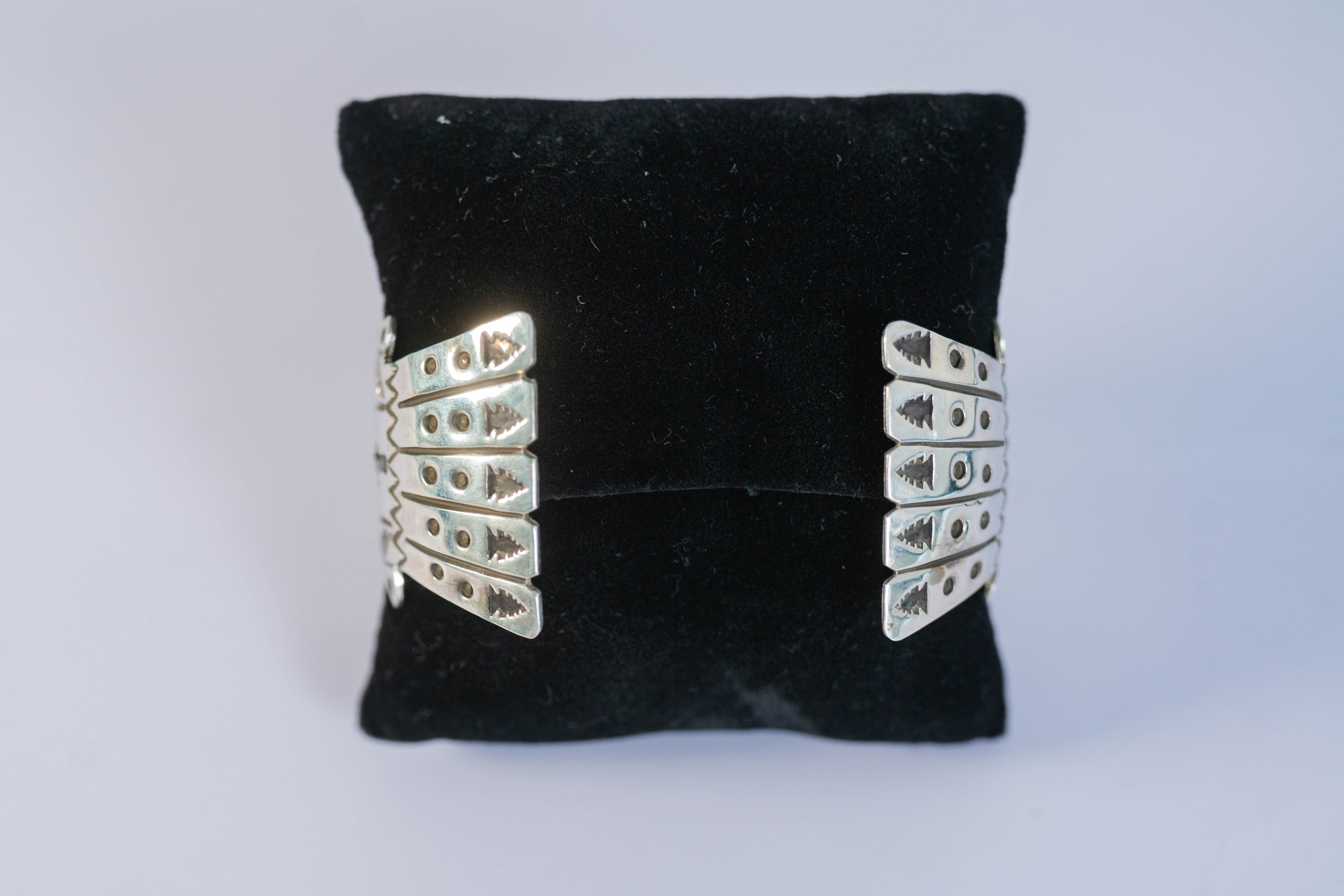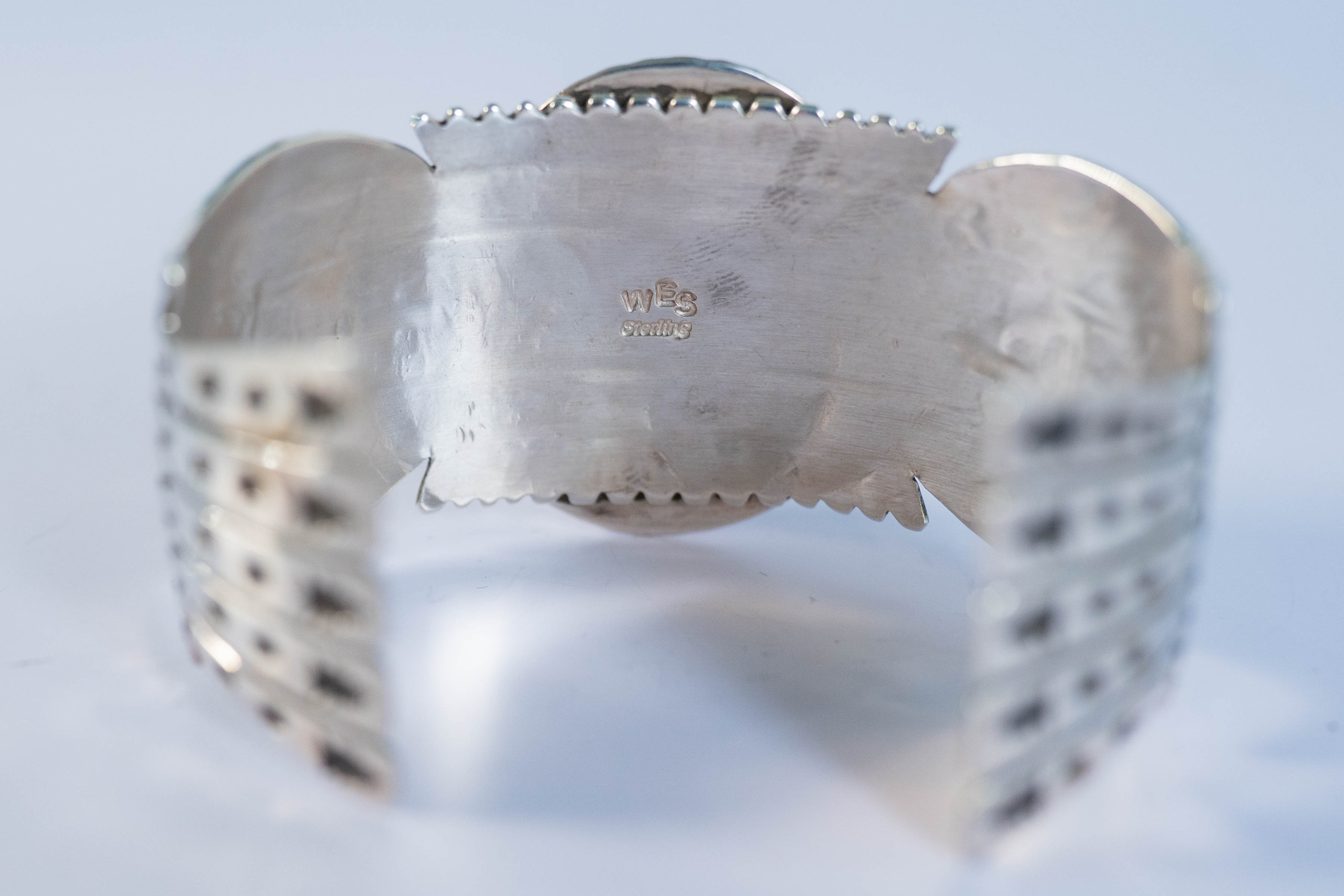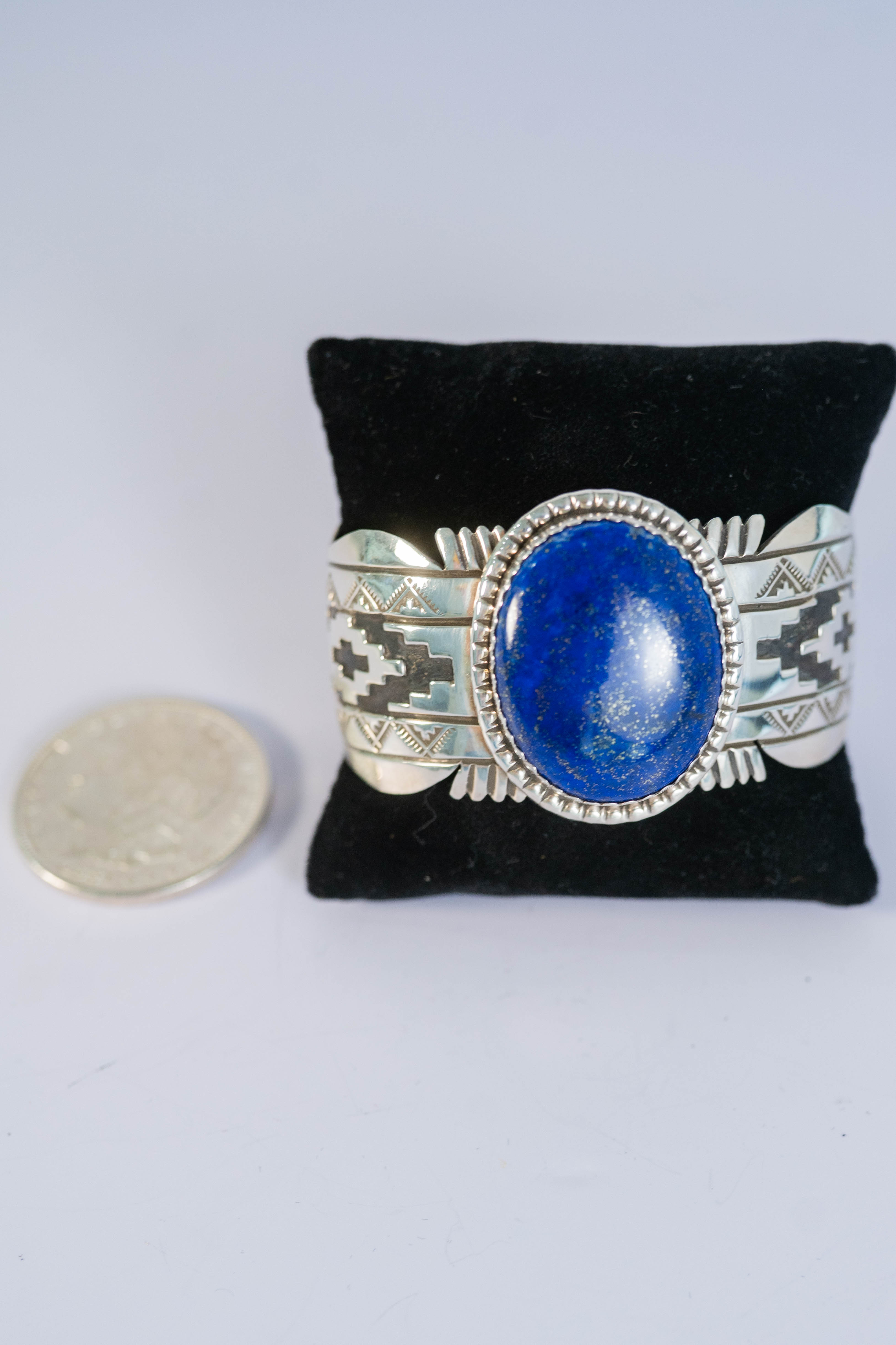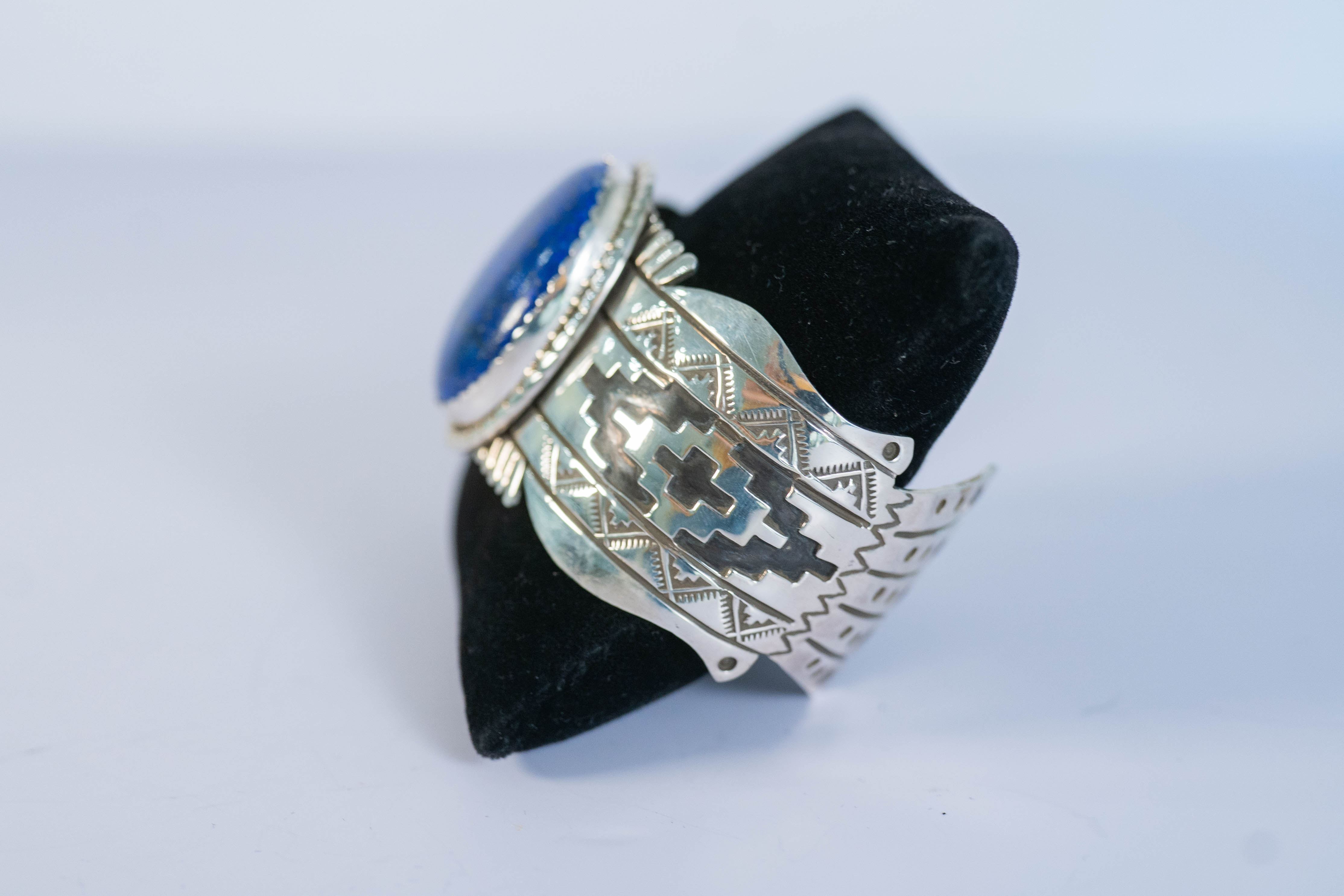 Native American Navajo spectacular sterling silver cuff bracelet with a AAAA Afghanistan Lapis center stone L 1 3/8″ x 1 1/8″ W and an overlay design. Size 10 Width 1 3/8″ Gap 1 1/2″. Signed WES.