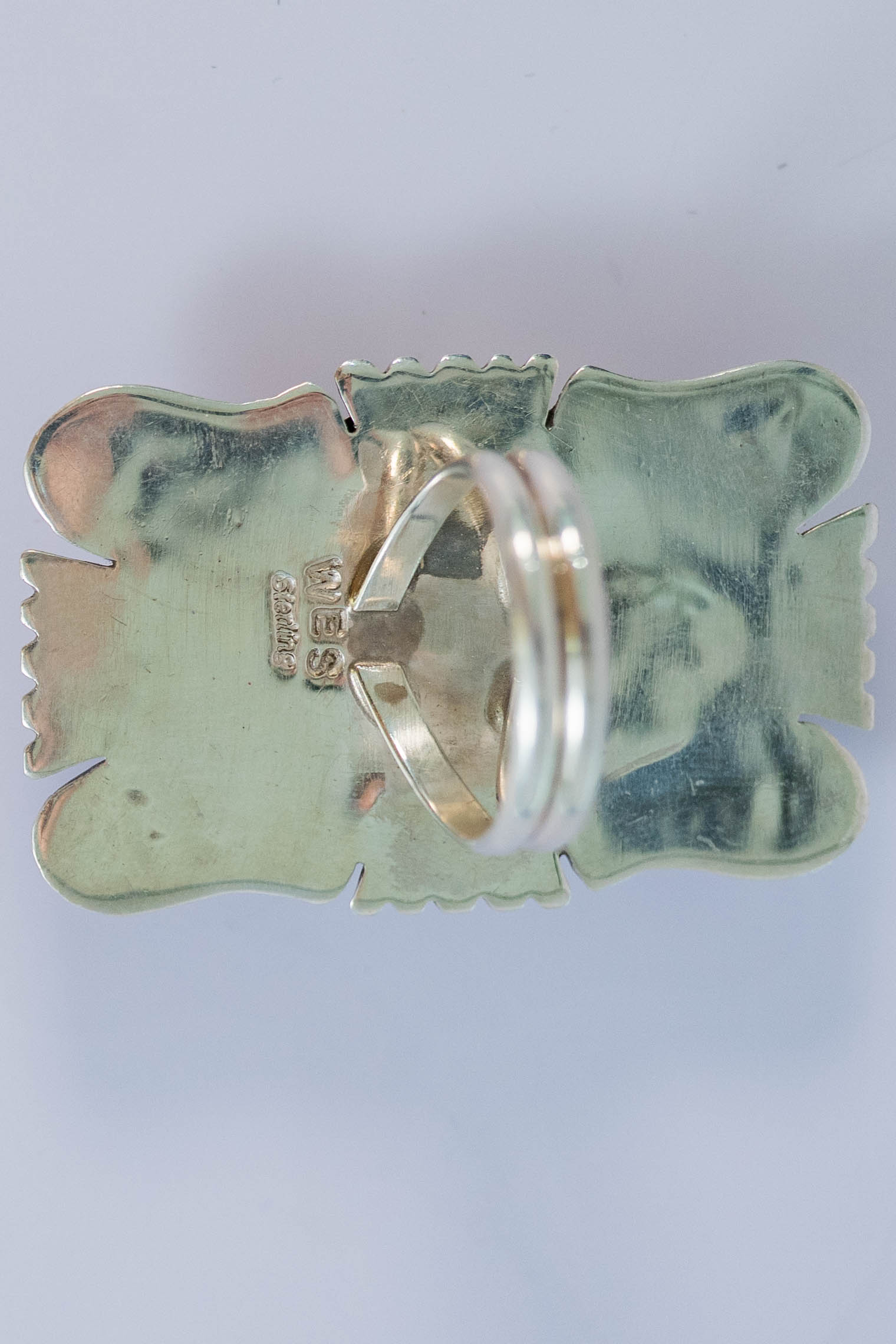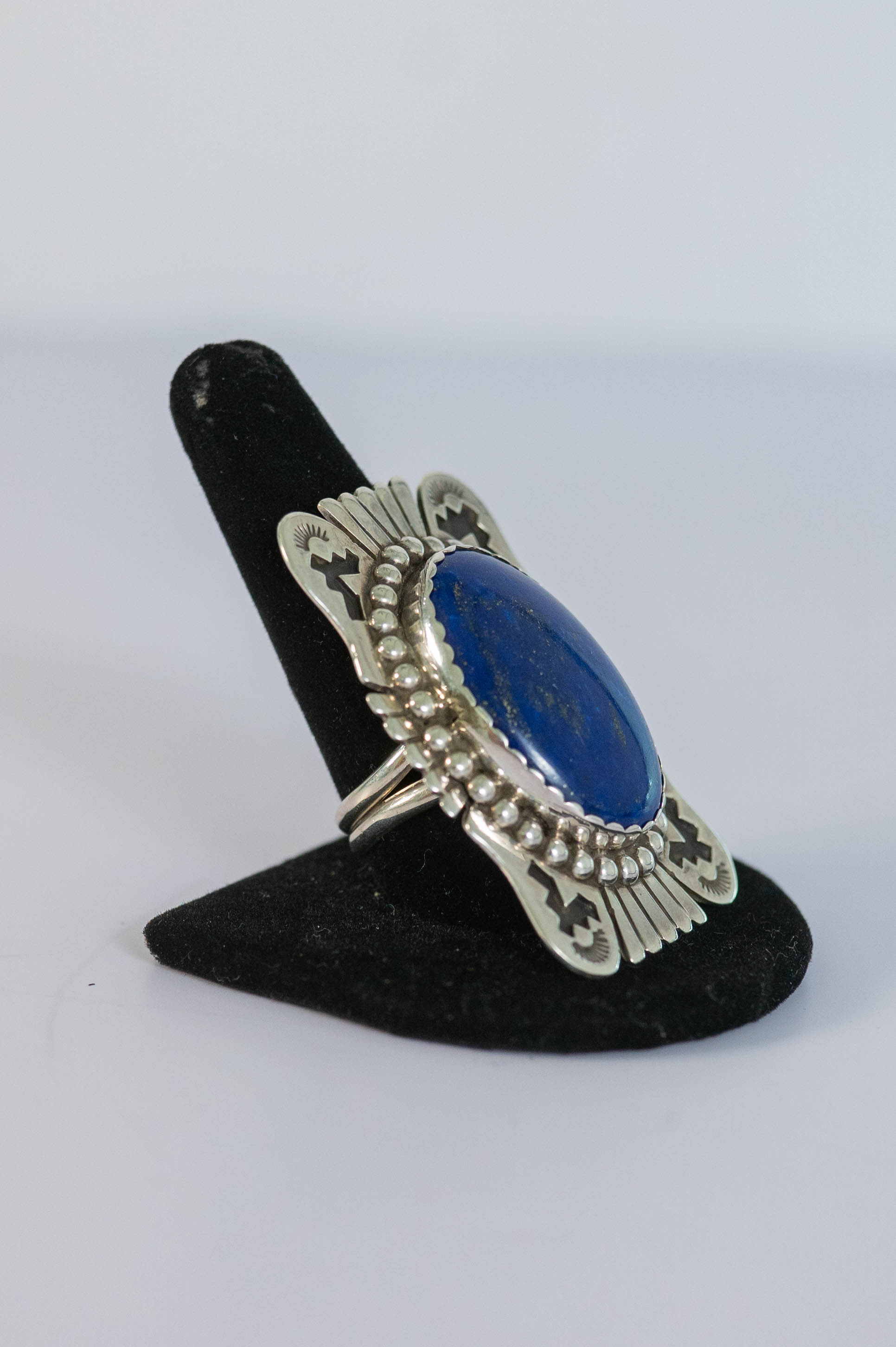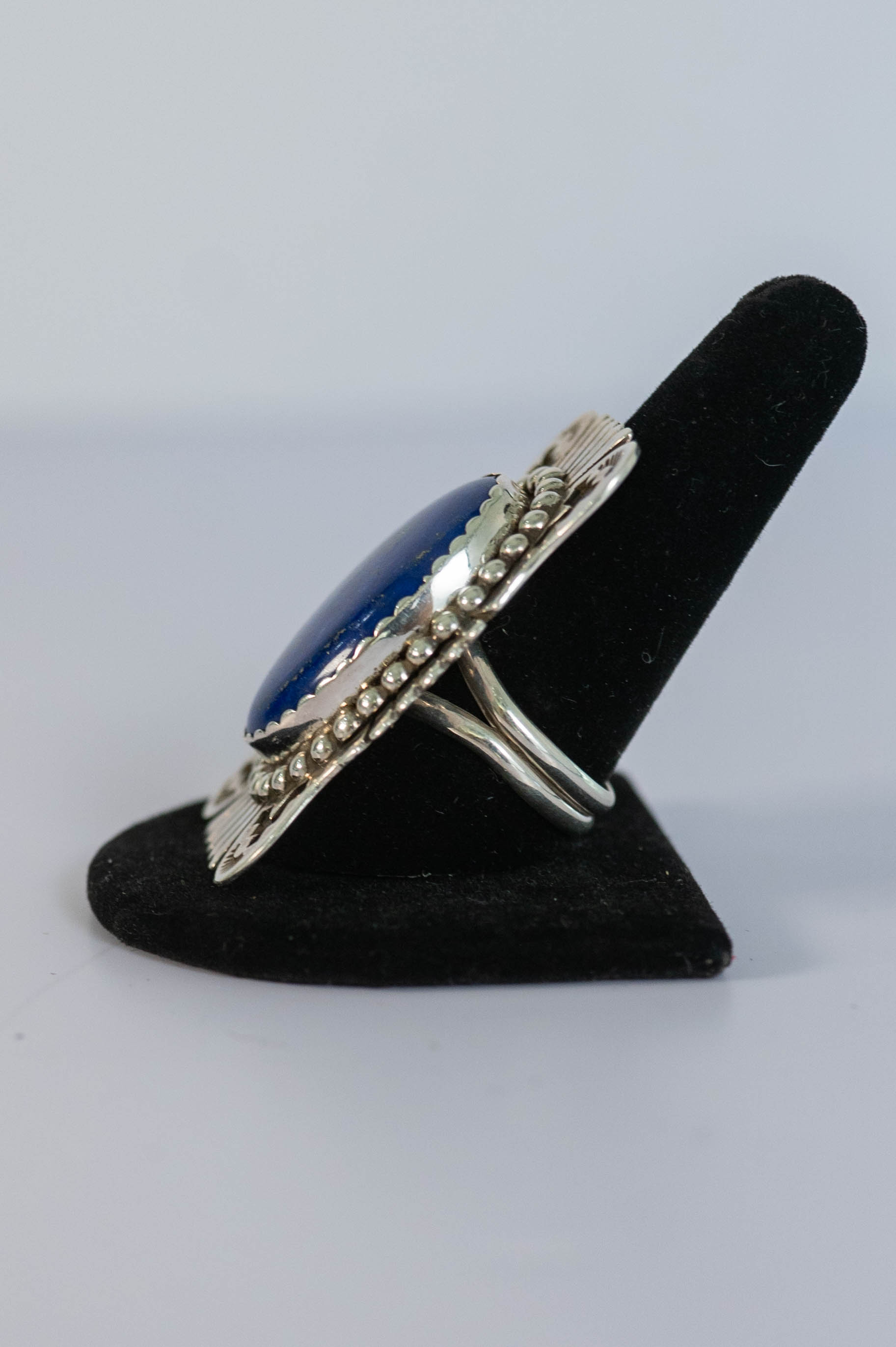 Native American Navajo spectacular sterling silver ring featuring an overlay design and a AAAA Afghanistan Lapis oval gemstone L 1 1/4″ x W 7/8″. Size 10 L 2″ x 1 1/4″ W. Signed Wes.