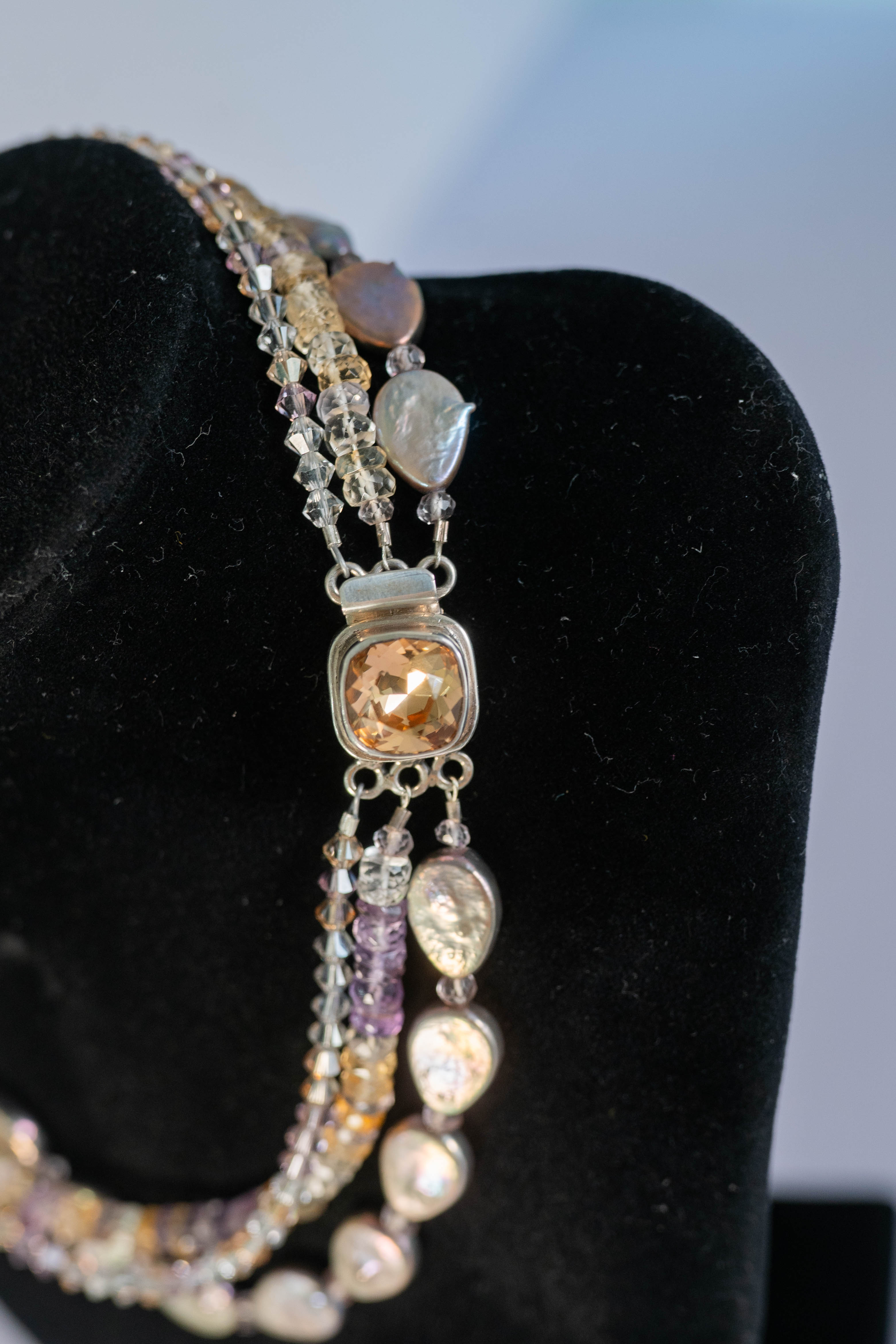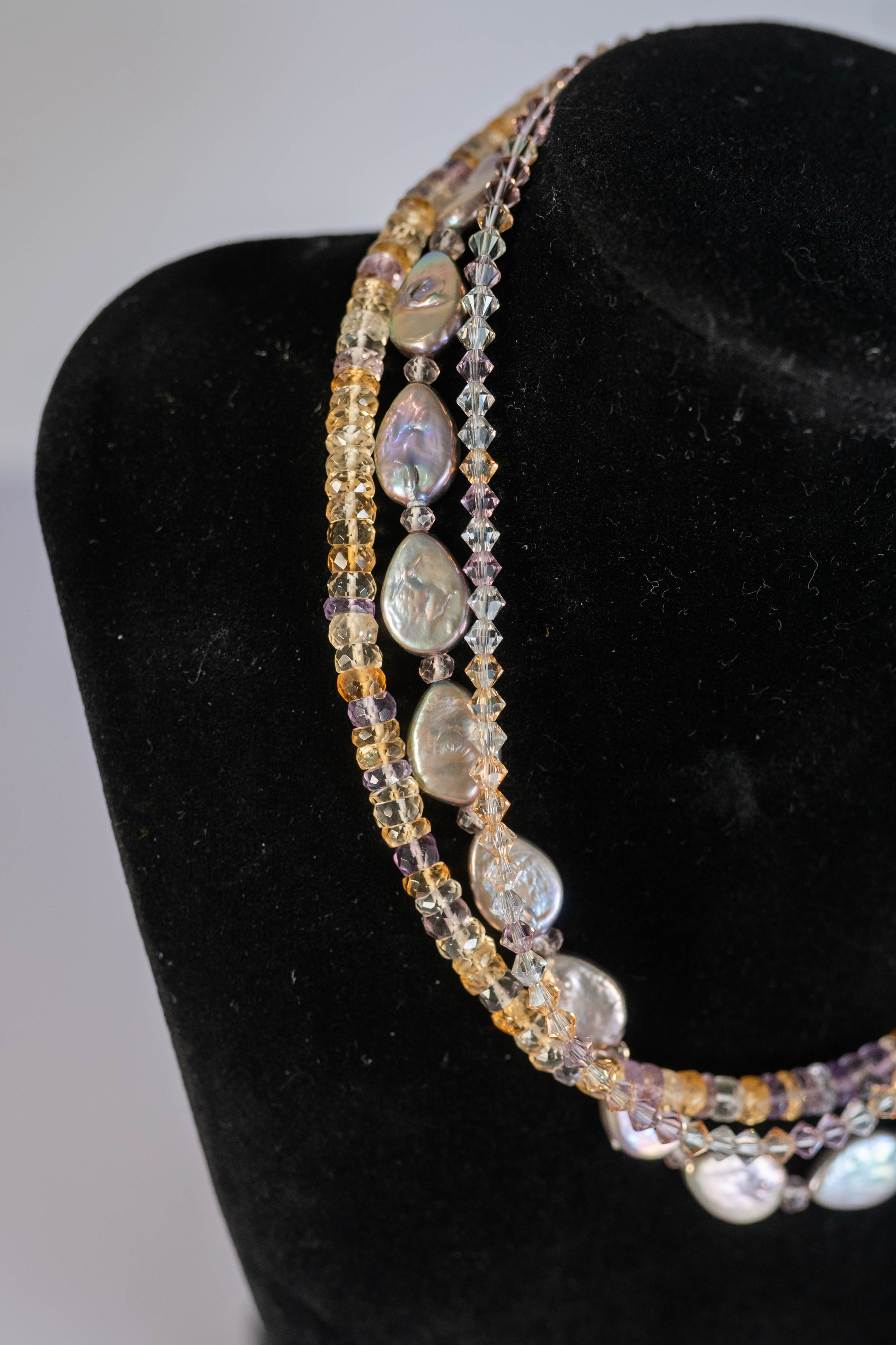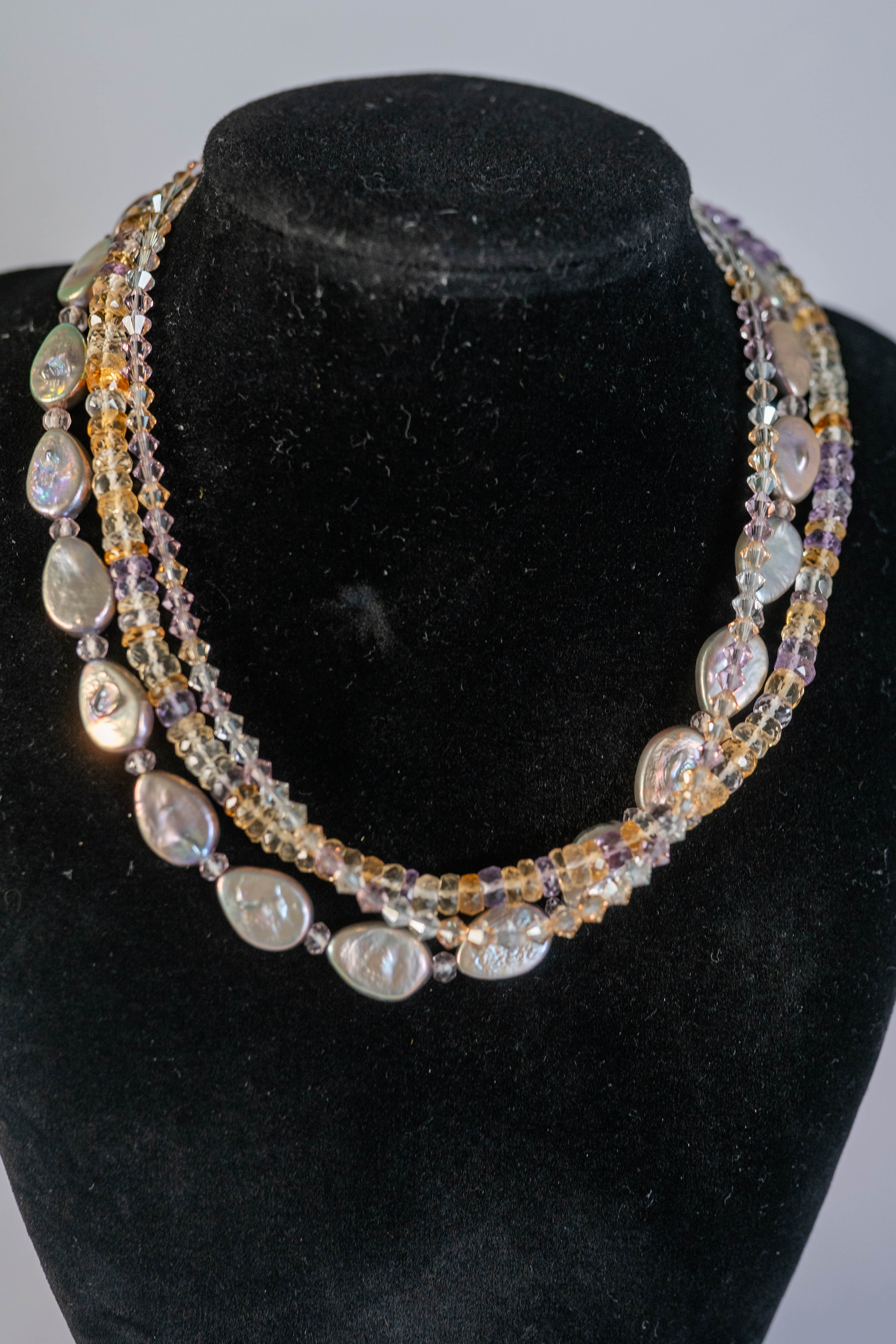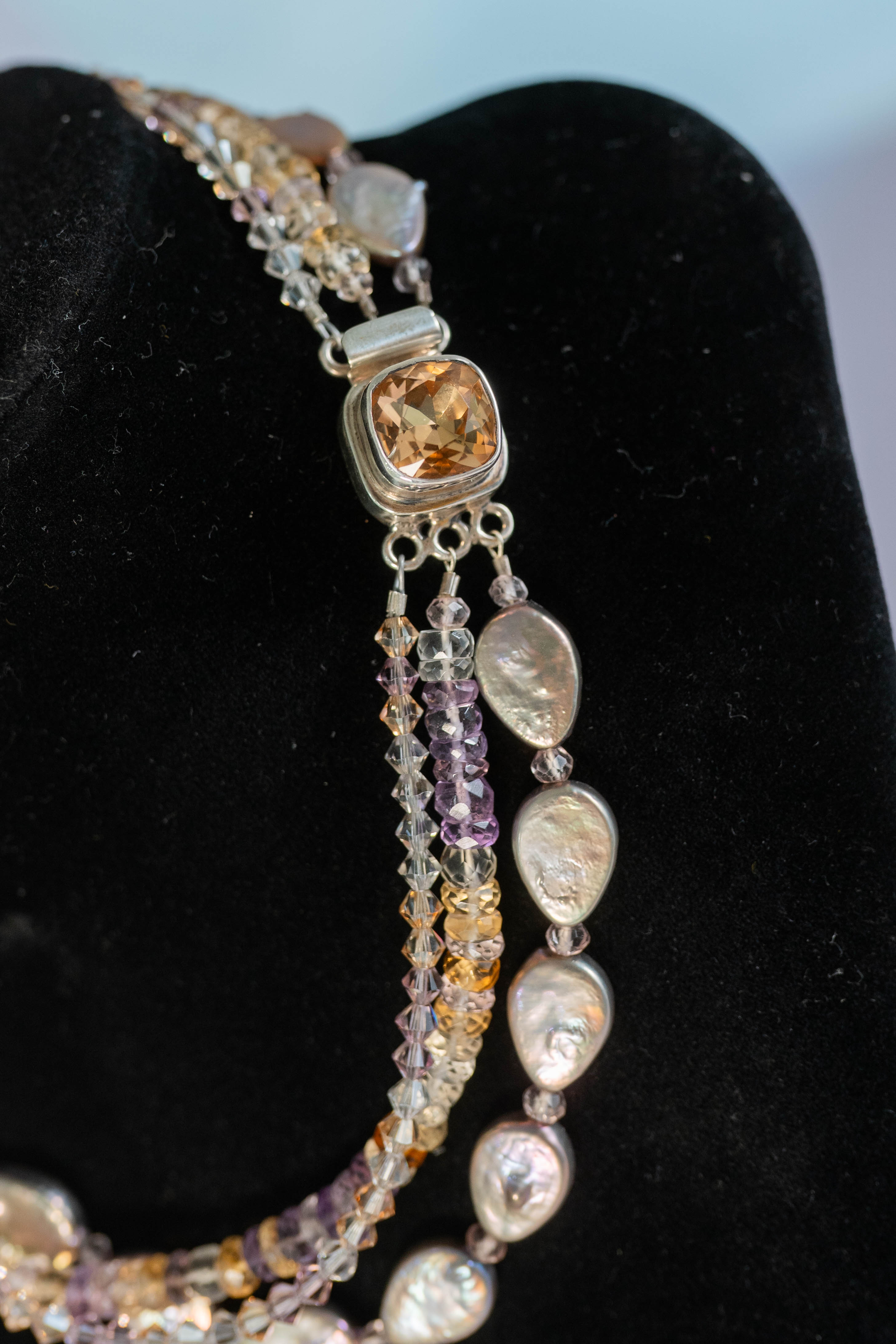 Exquisite three strand necklace featuring Freshwater Pearls and Ametrine gemstones and a beautiful AAAA faceted Citrine and sterling silver clasp. L 14″.