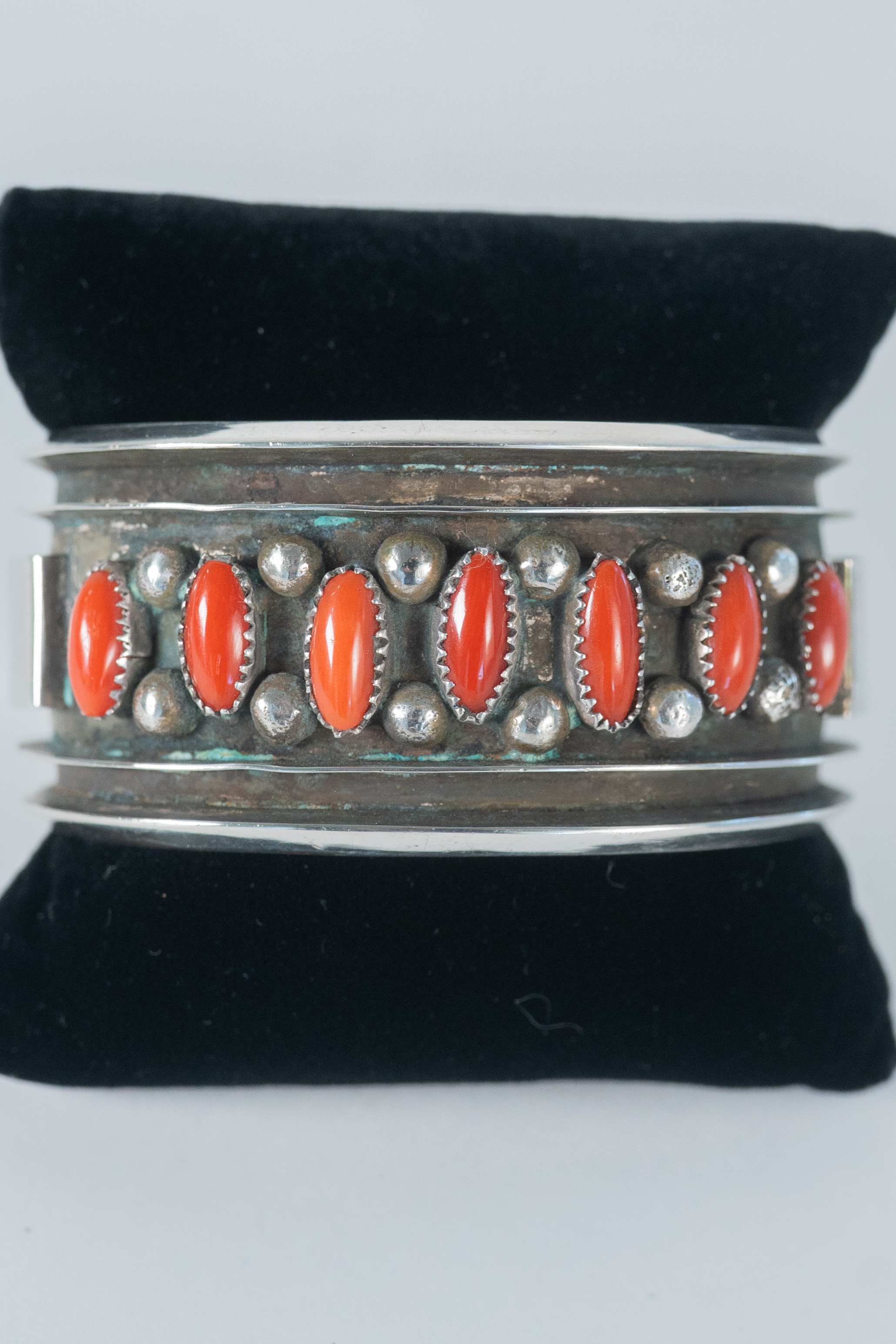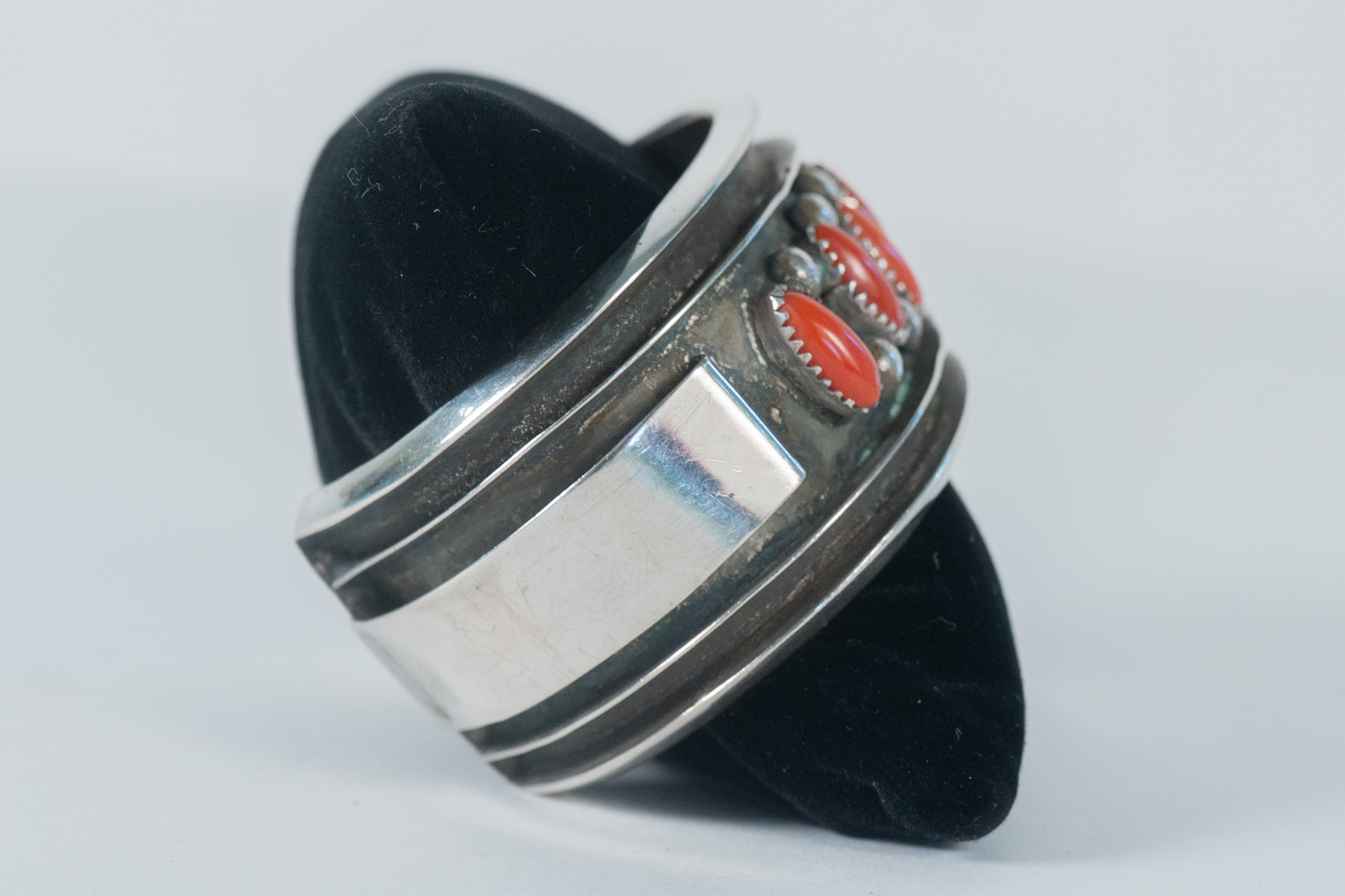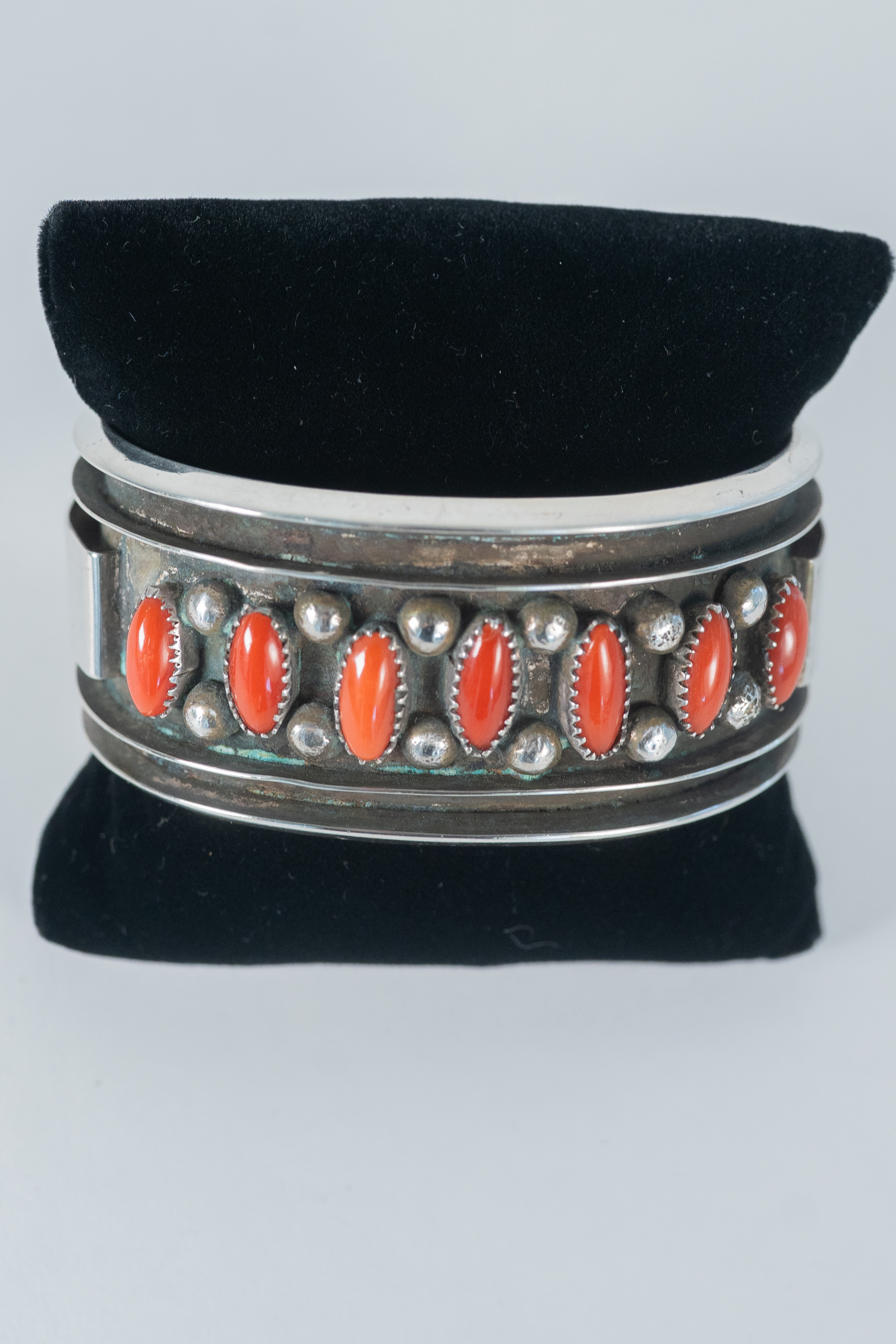 Native American Navajo master silversmith Alice Sam important highly collectible sterling silver, oxidized, channel cuff bracelet featuring (7) AAAA Mediterranean Coral oval gemstones This is a superior piece. Size 8 Width 1 1/4″ Gap 1 1/2″. Signed Alice Sam.
