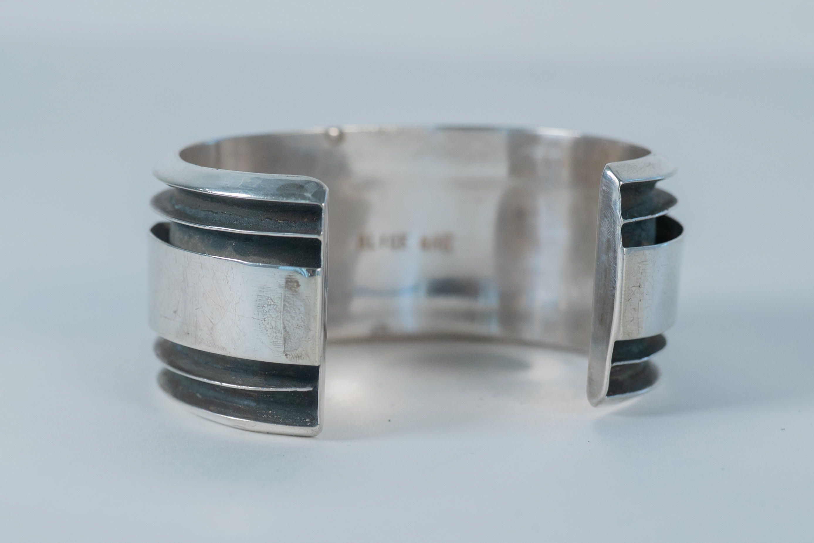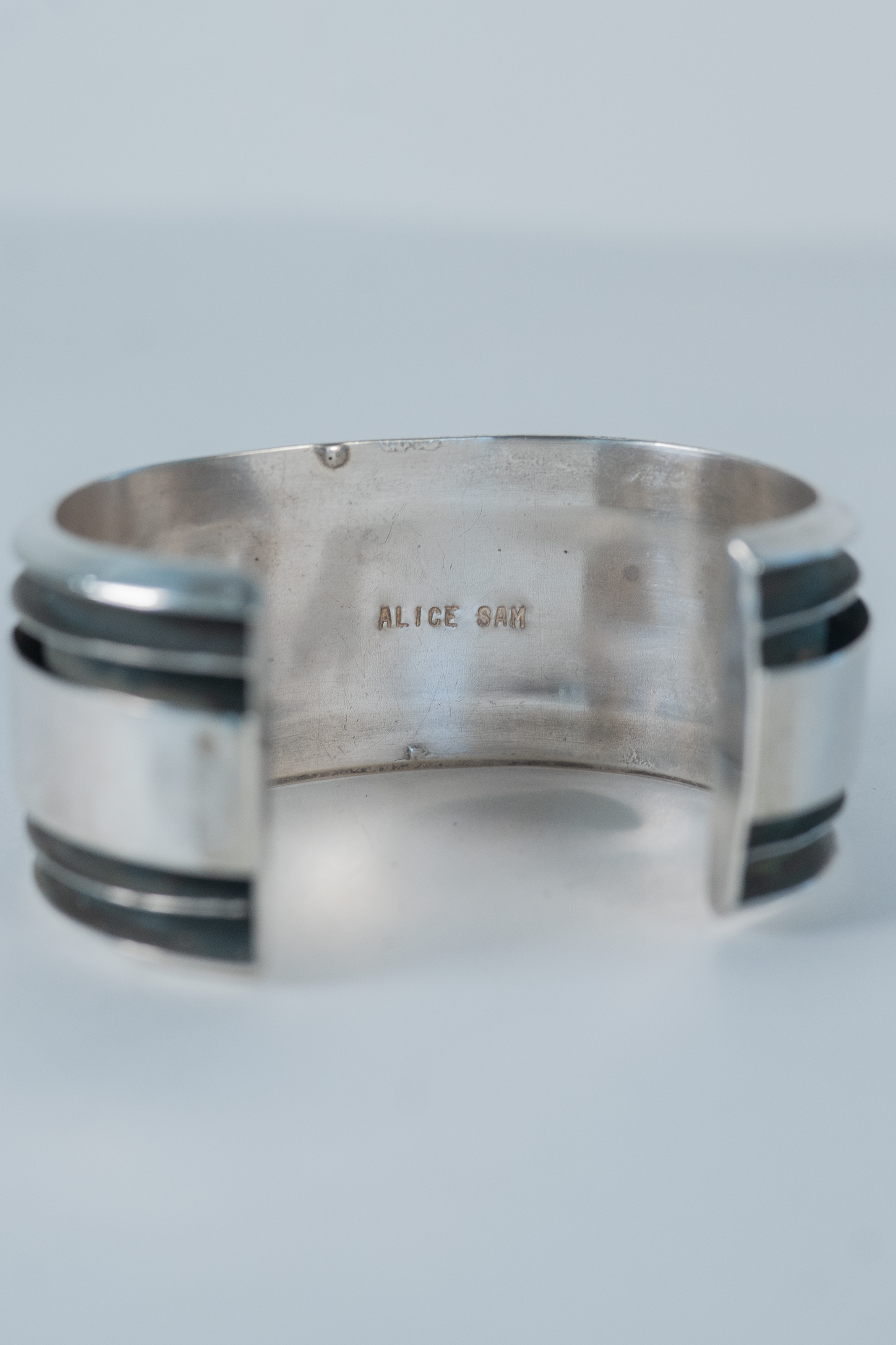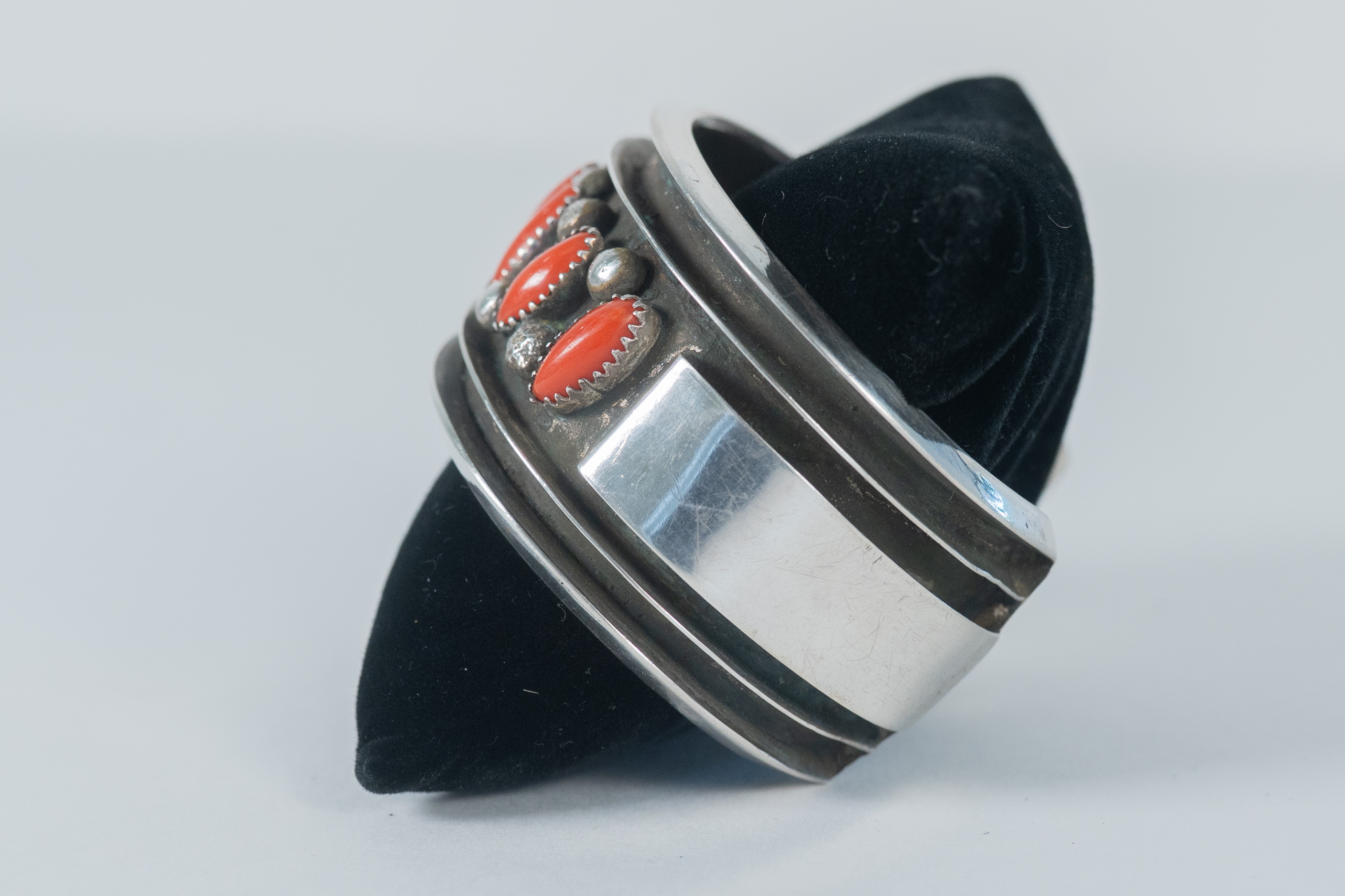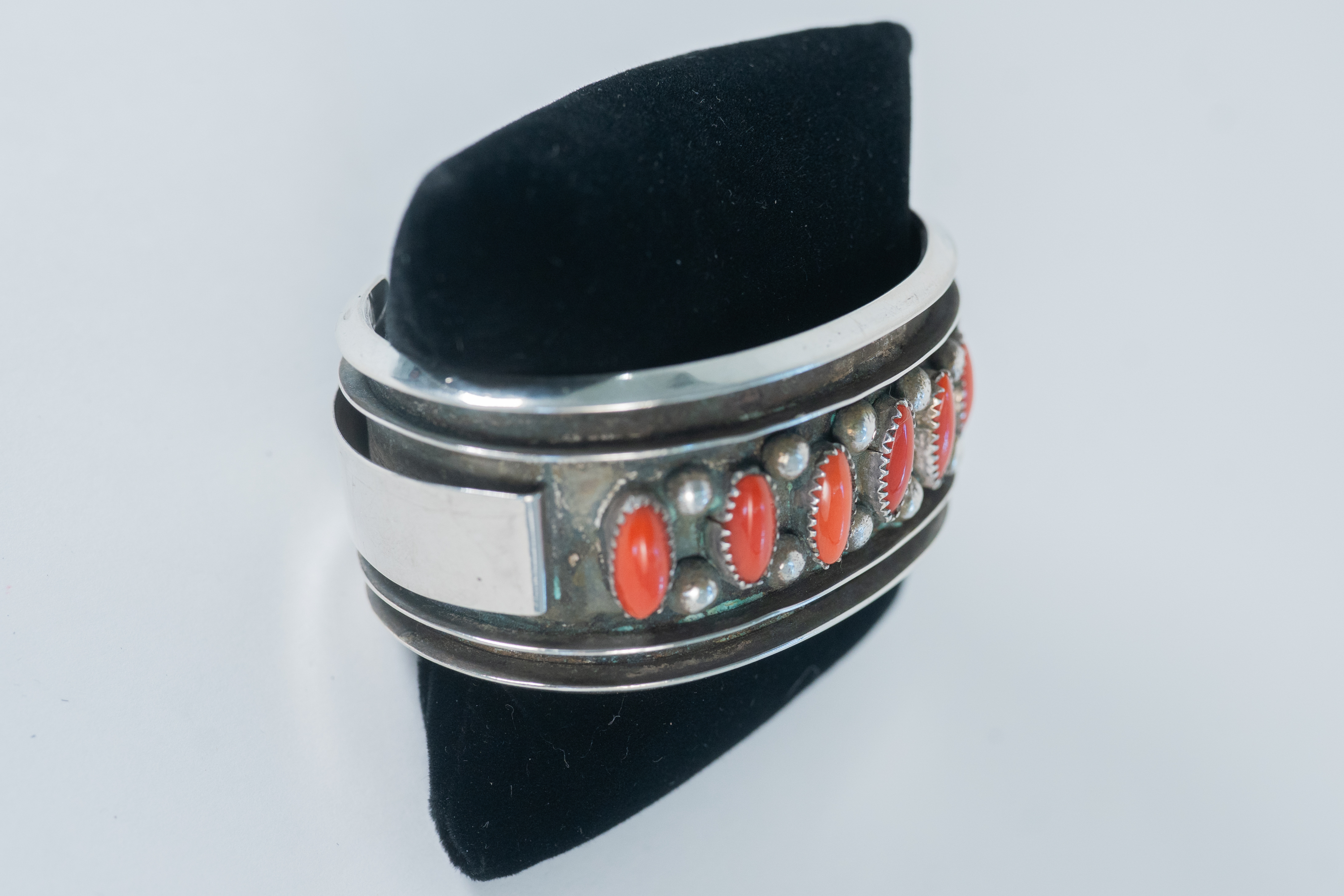 Native American Navajo master silversmith Alice Sam important highly collectible sterling silver, oxidized, channel cuff bracelet featuring (7) AAAA Mediterranean Coral oval gemstones This is a superior piece. Size 8 Width 1 1/4″ Gap 1 1/2″. Signed Alice Sam.