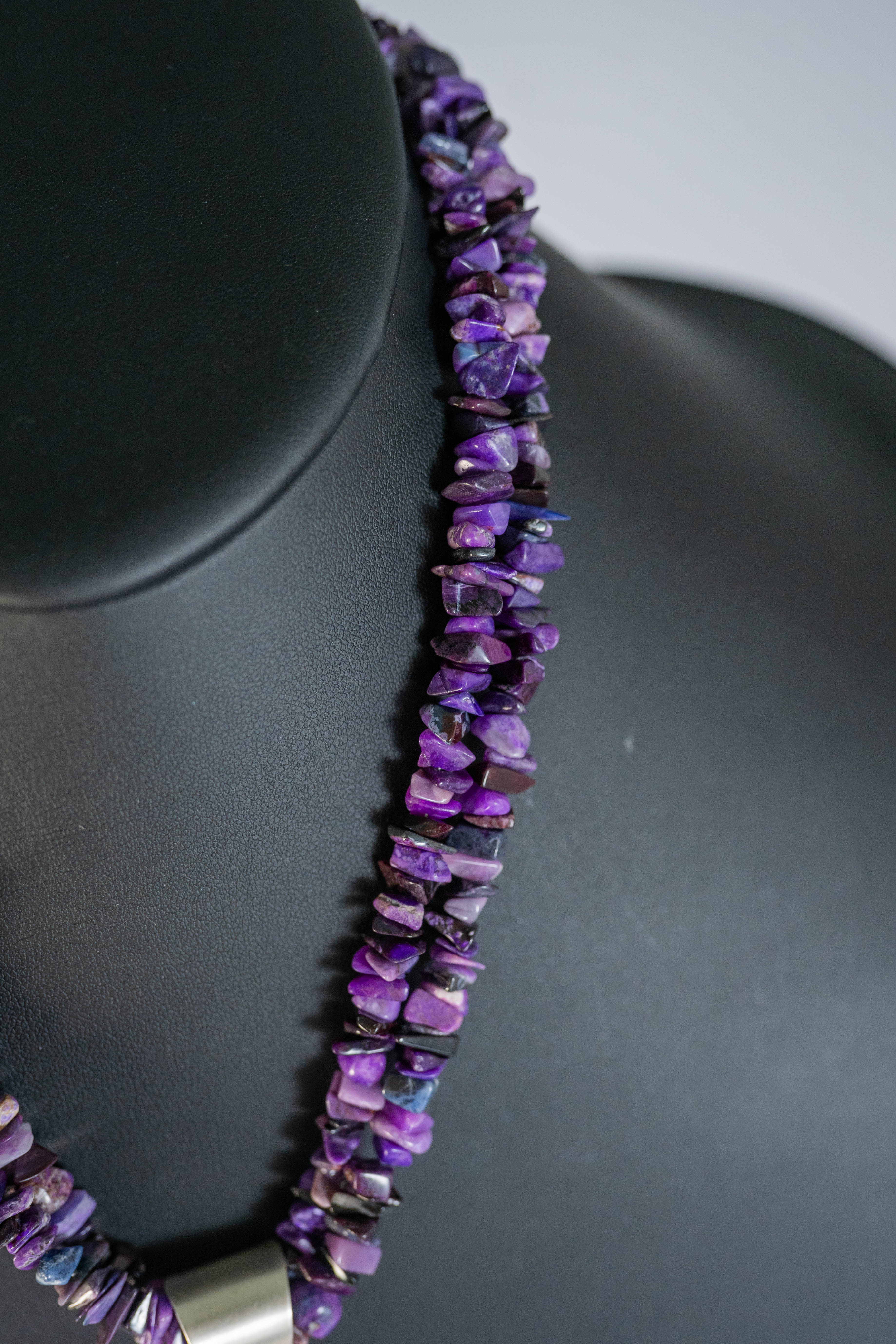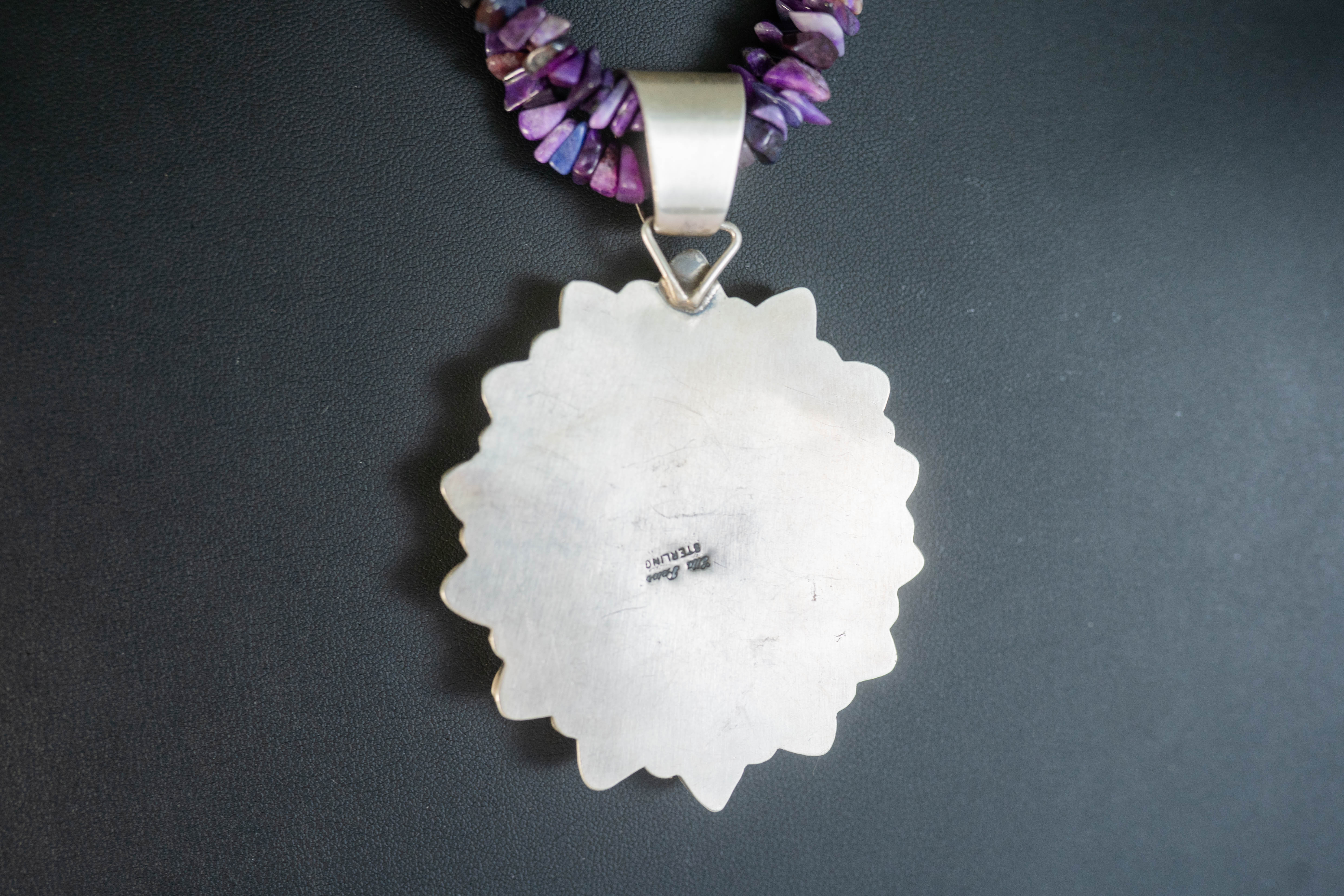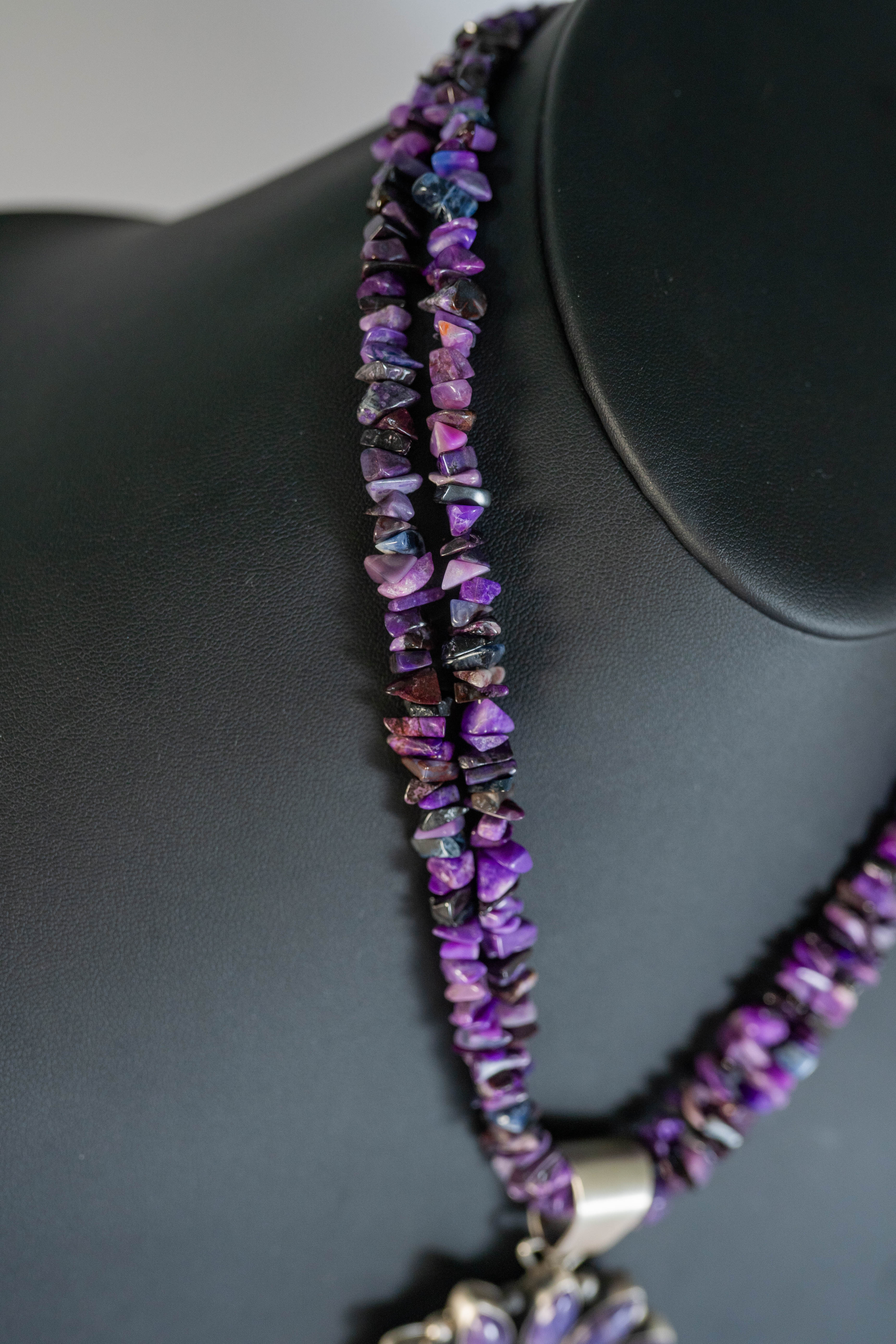 Native American Navajo master silversmith Ella Peters stunning pendant featuring AAAAA rare Sugilite gemstones, twisted wire and dot spacer beads. The pendant hangs on a two strand necklace featuring rare AAAAA Sugalite polished chip gemstones and a sterling silver clasp.. L 20″. Pendant L 2 1/2″ x 3 3/8″ W. O.A.L. 22 1/2″ Signed Ella Peters.