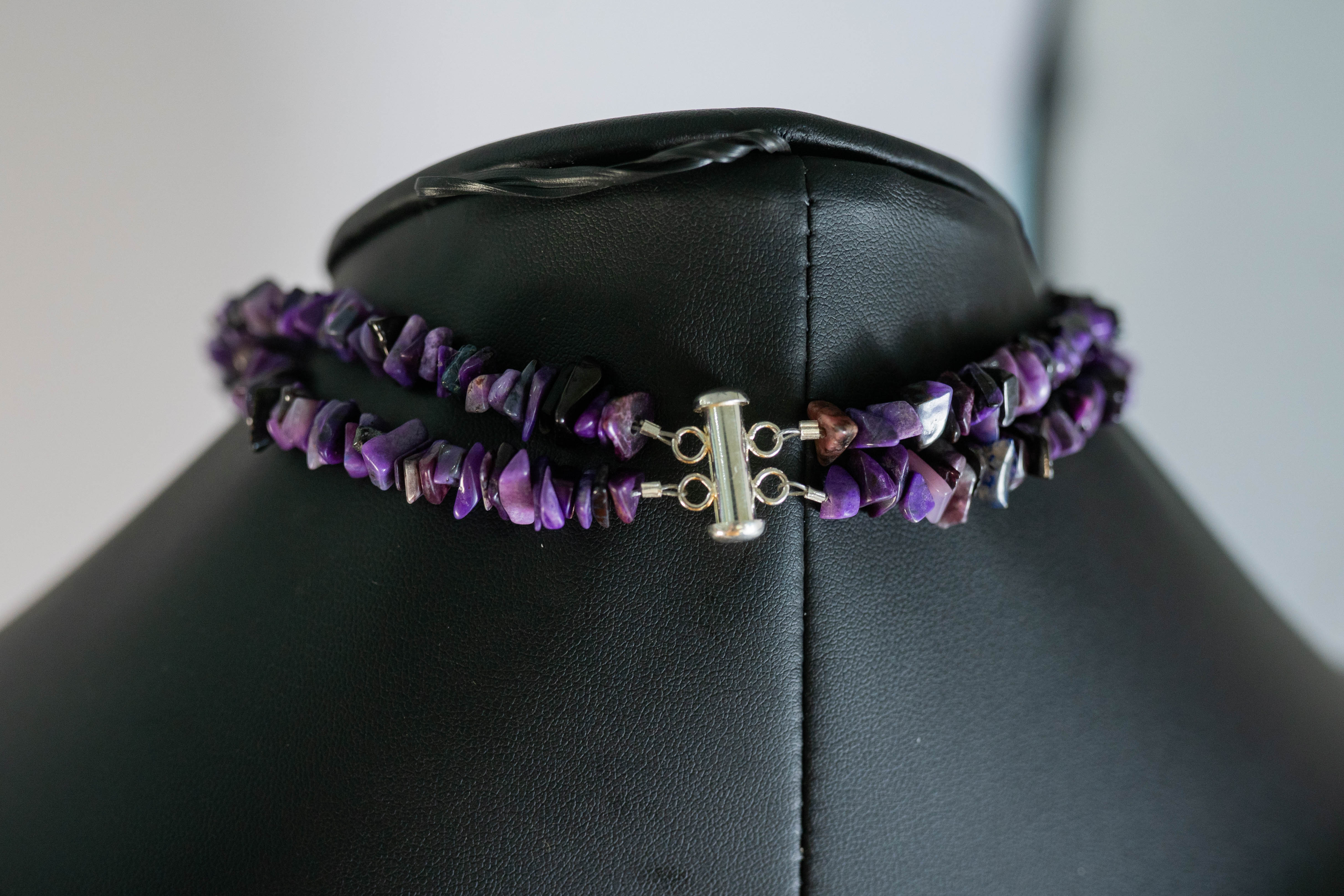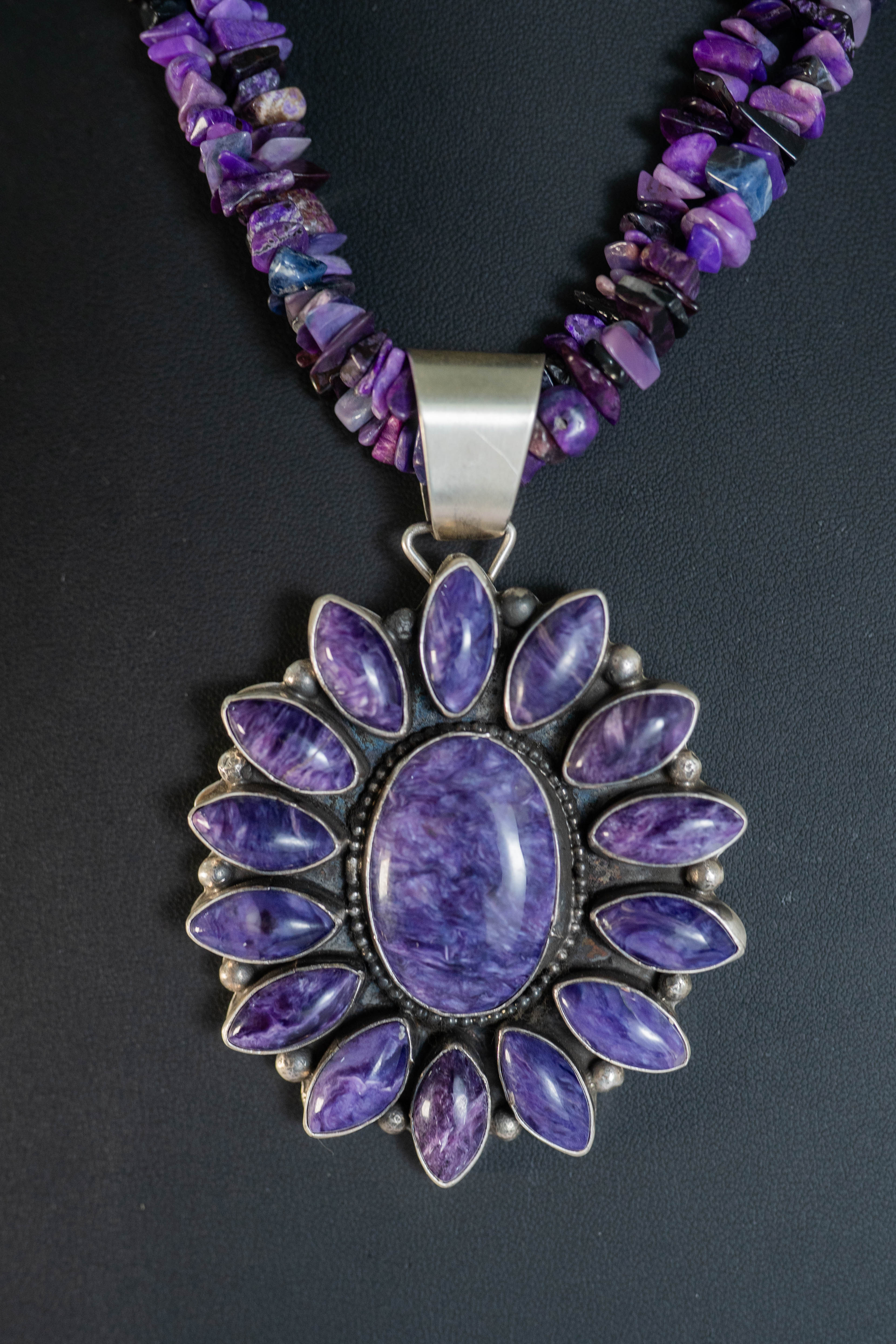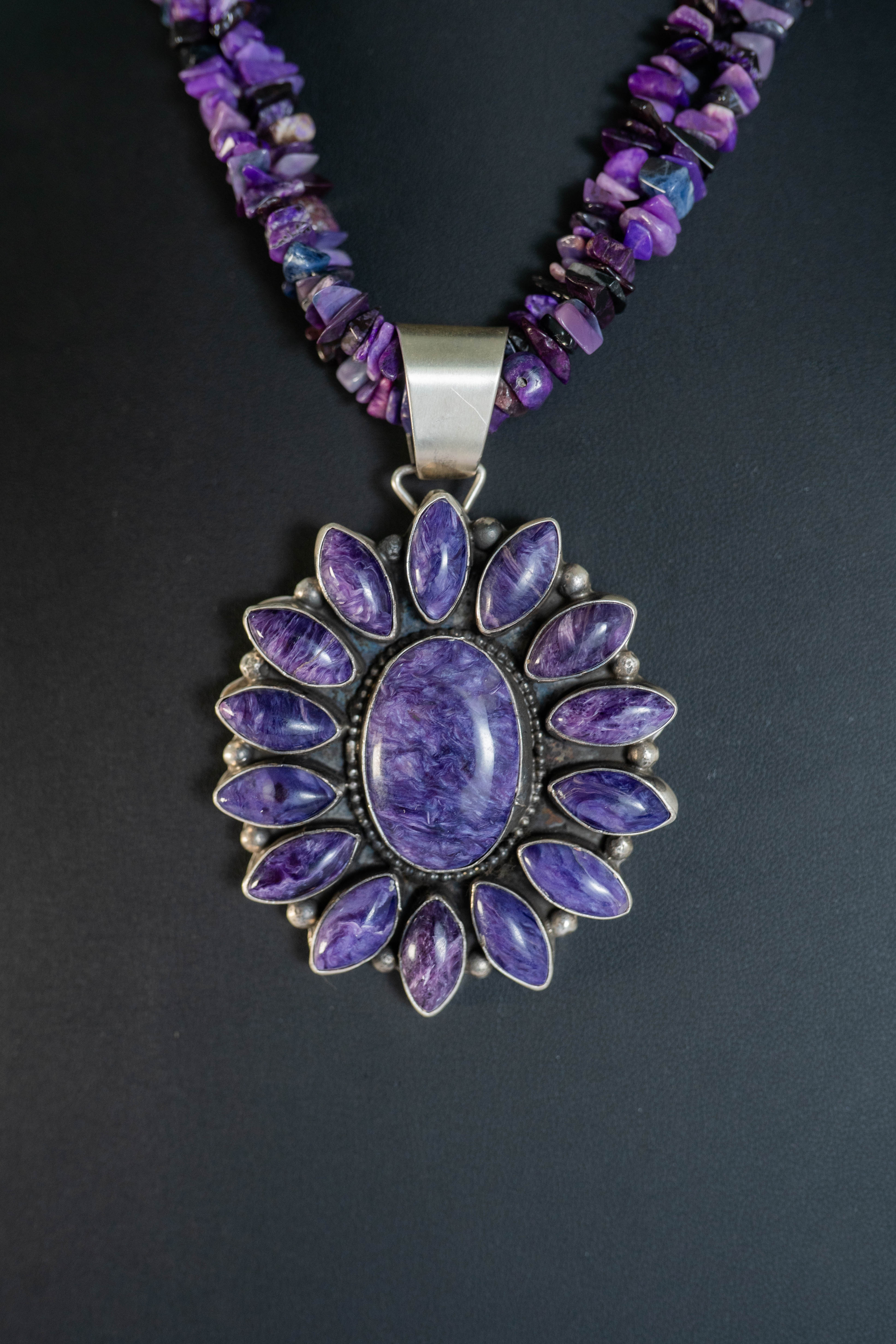 Native American Navajo master silversmith Ella Peters stunning pendant featuring AAAAA rare Sugilite gemstones, twisted wire and dot spacer beads. The pendant hangs on a two strand necklace featuring rare AAAAA Sugalite polished chip gemstones and a sterling silver clasp.. L 20″. Pendant L 2 1/2″ x 3 3/8″ W. O.A.L. 22 1/2″ Signed Ella Peters.