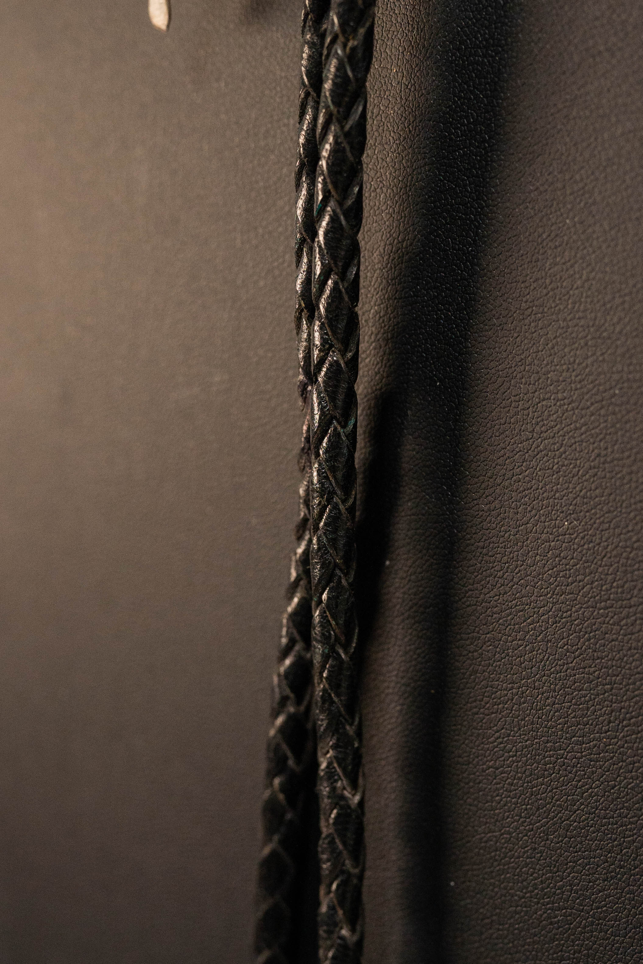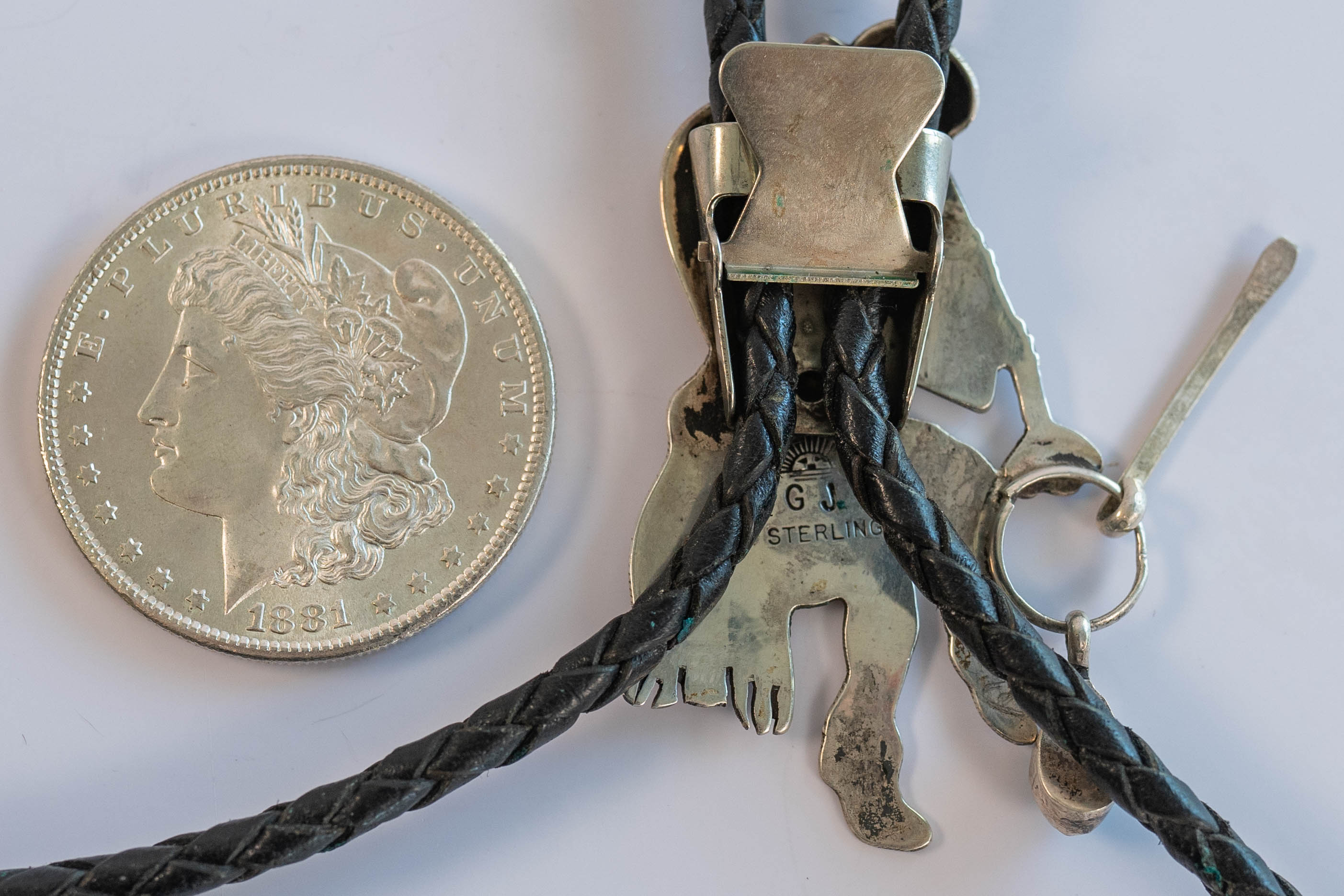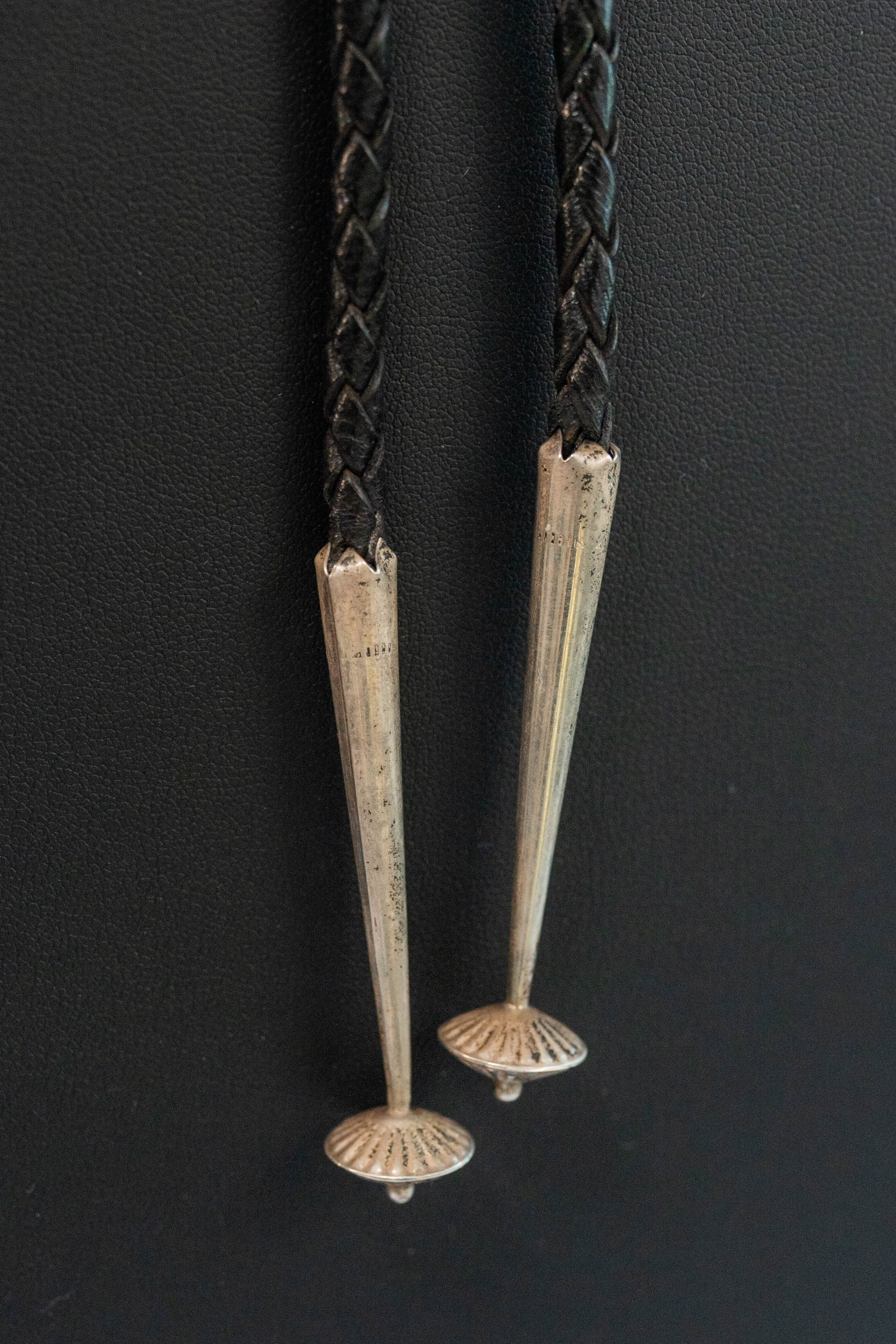 Native American Navajo sterling silver vintage Kachina Dancer Bolo Tie with Kingman Turquoise gemstone accent. The bolo is L 2 1/2″ x W 1 5/8. The black leather tie is 38″ long with sterling silver tips 2 1/8″ long included in the length. Signed DJ