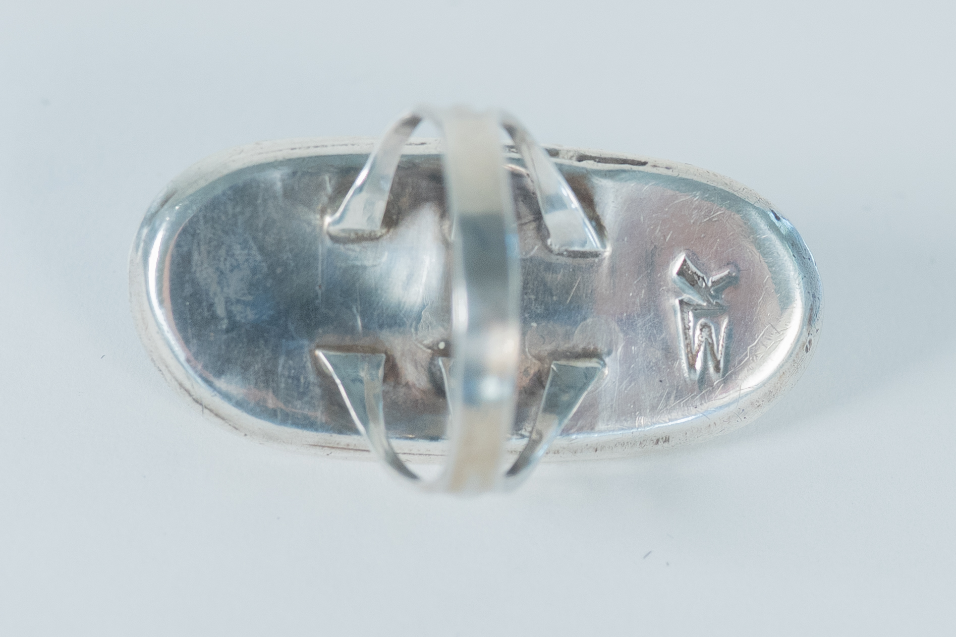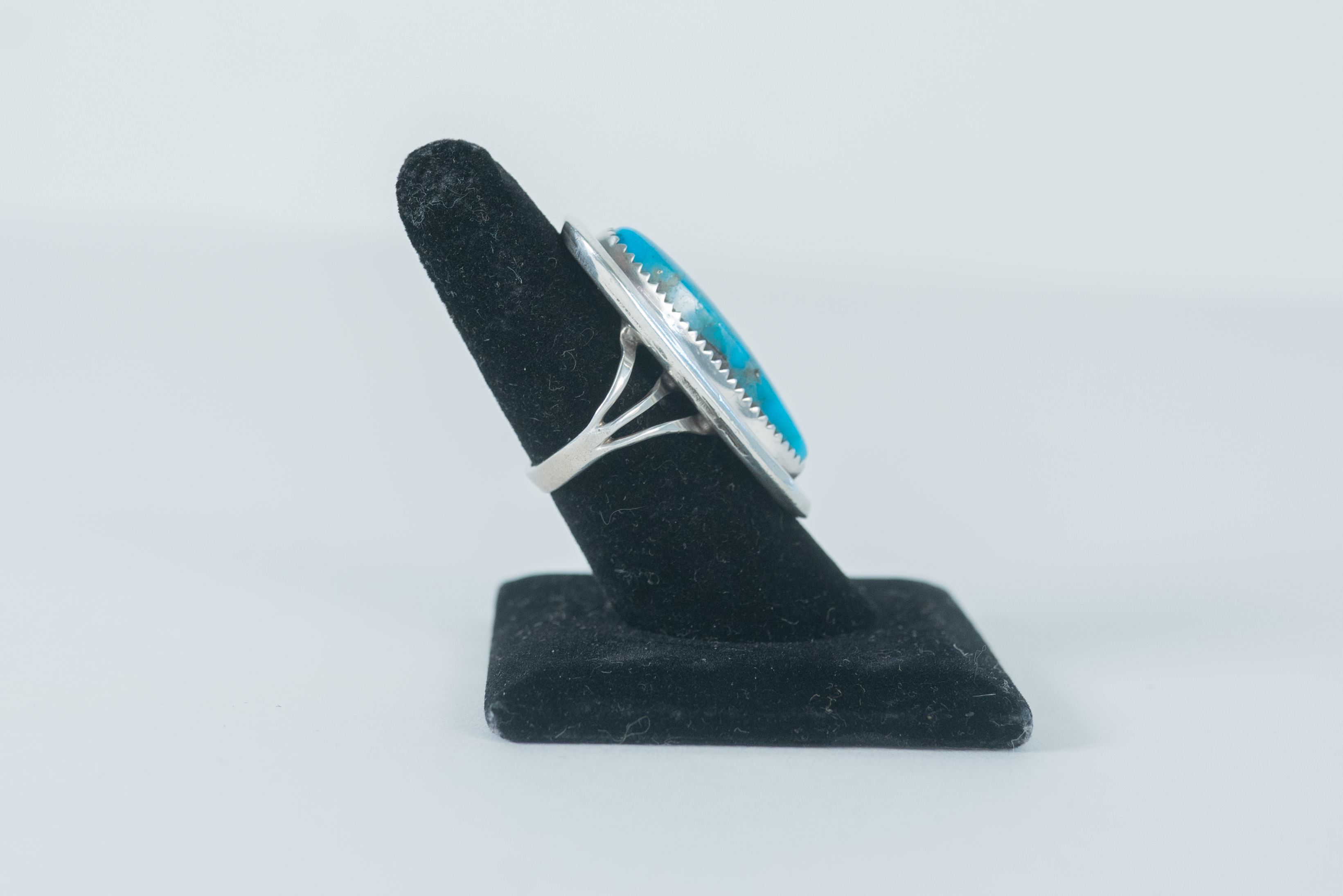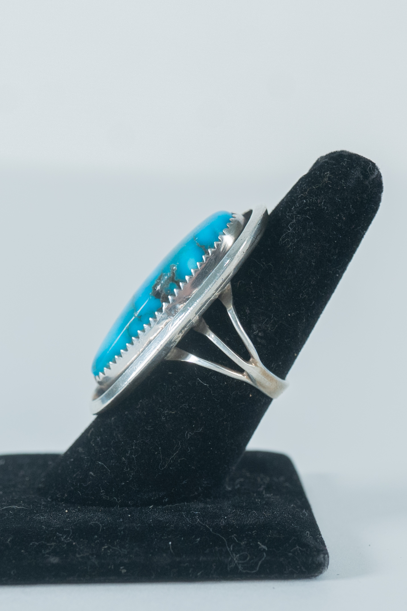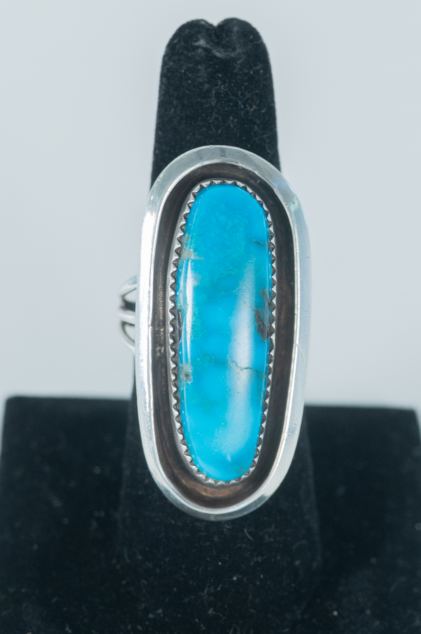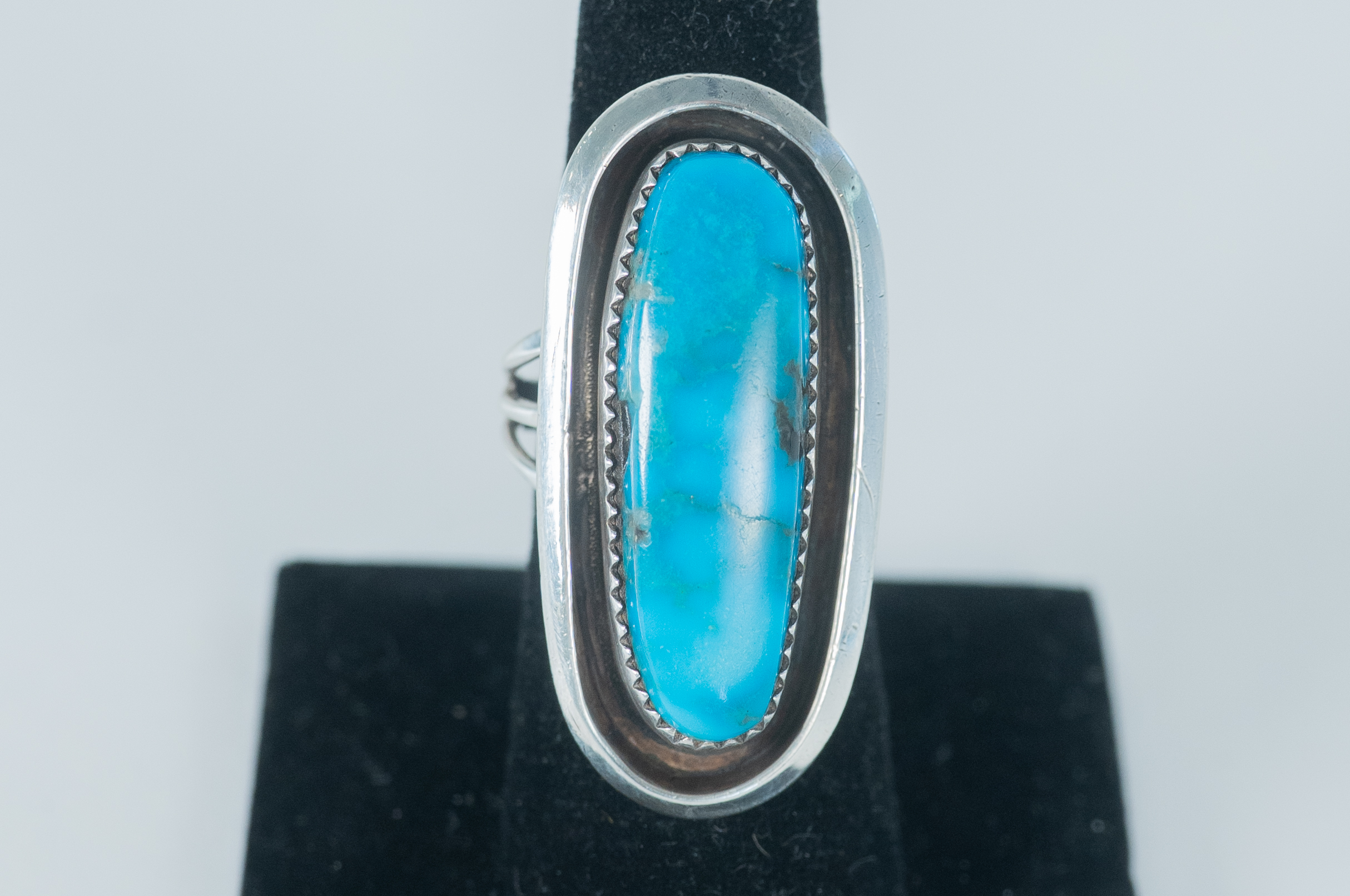 Native American Navajo vintage sterling silver ring featuring a AAAAA rare Tyrone Turquoise gemstone L 1 1/4″ x 3/8″ W set in an oxidized channel setting. Size 7 L 1 5/8″ x 3/4″ W.