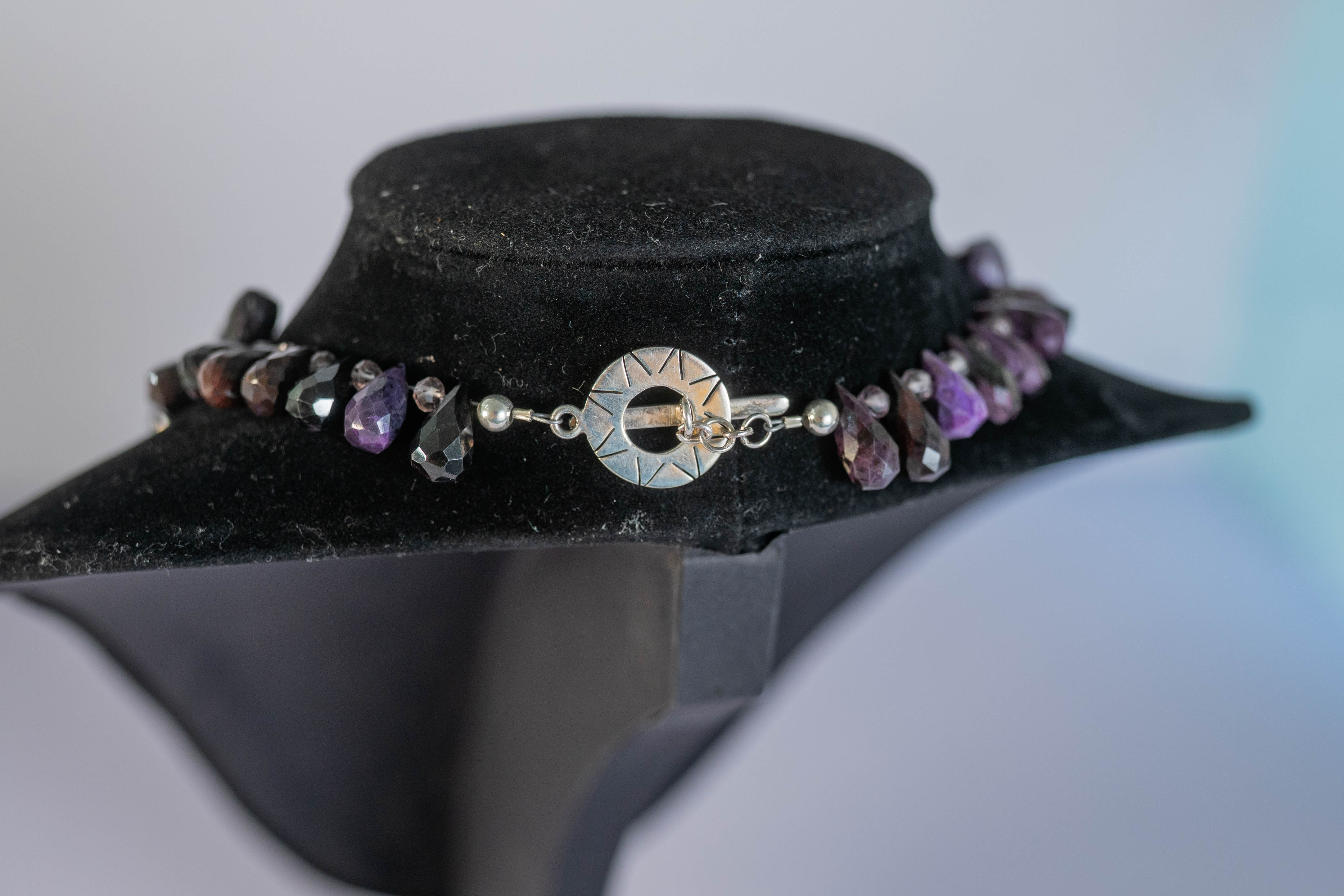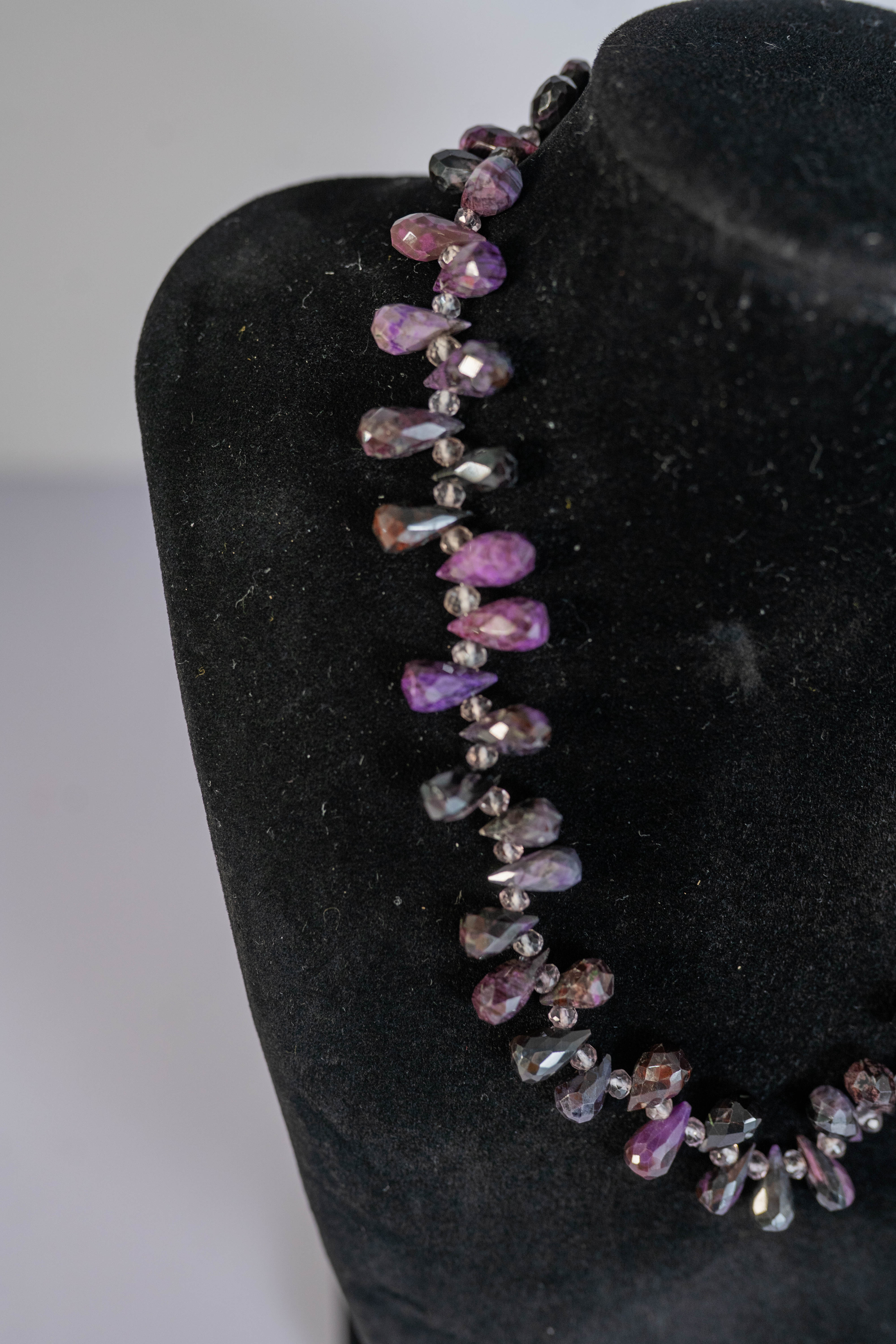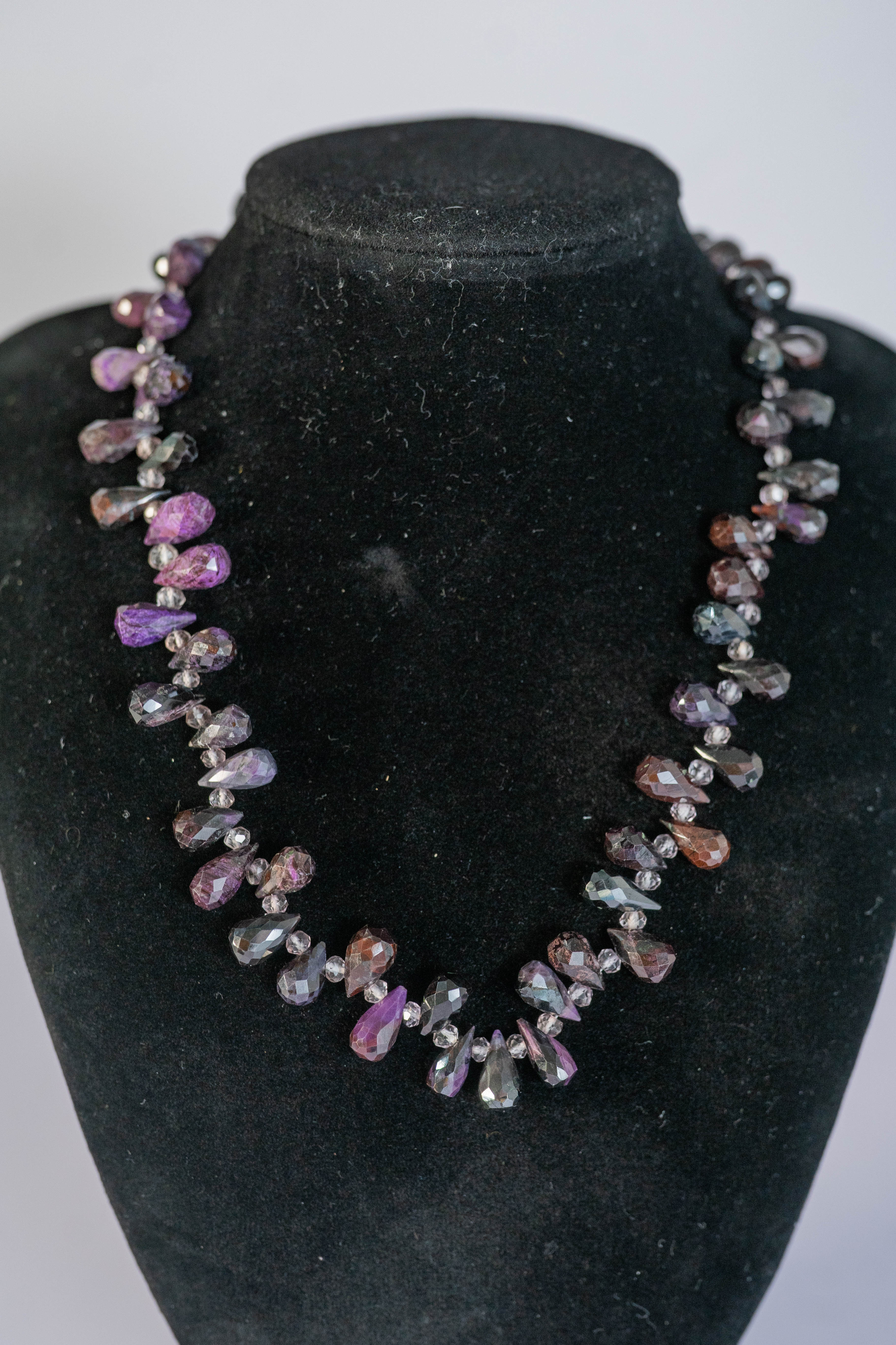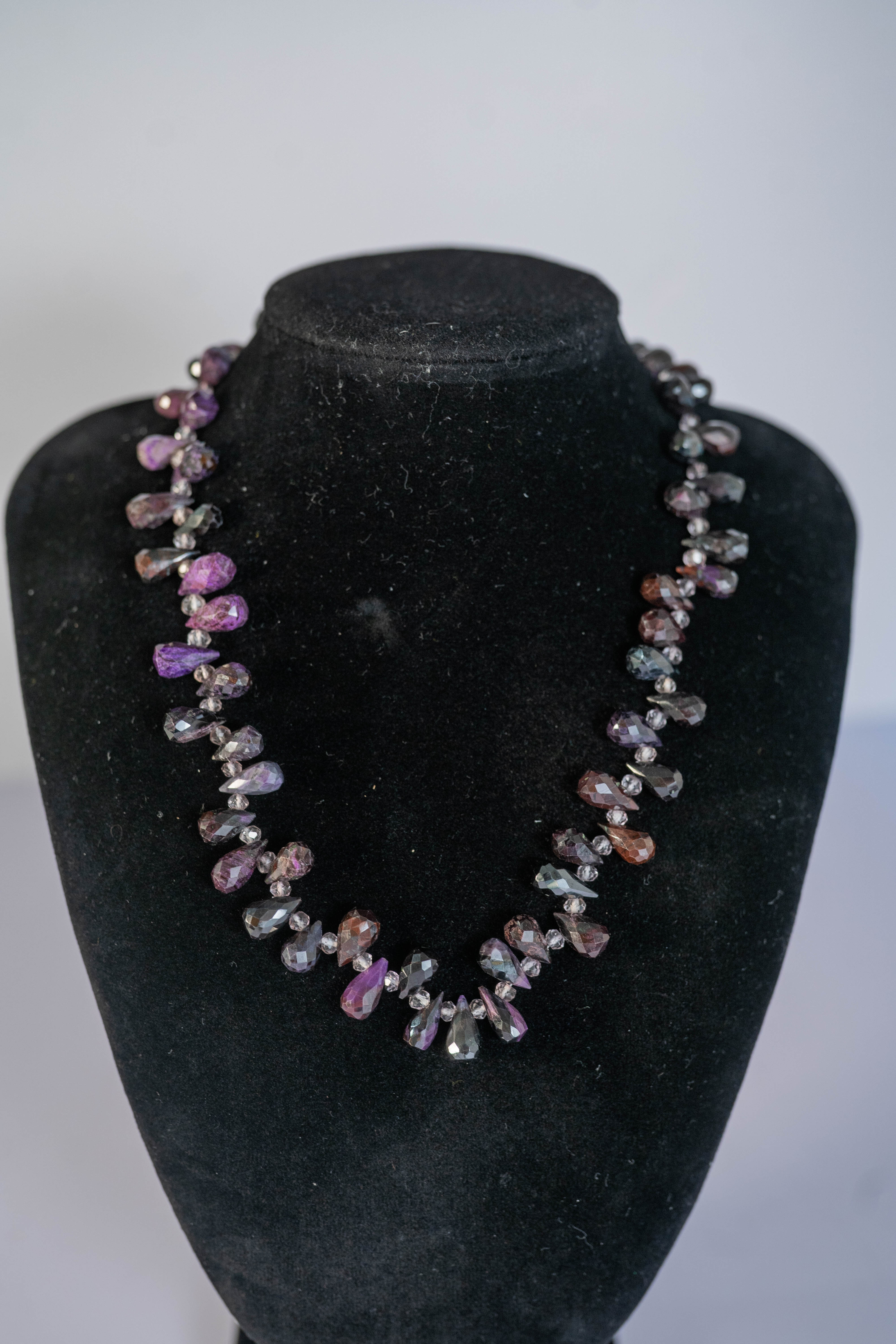 Lovely Amethyst necklace featuring AAAAA faceted teardrop gemstones with faceted crystal spacer beads and a sterling silver toggle clasp. L 17″.
