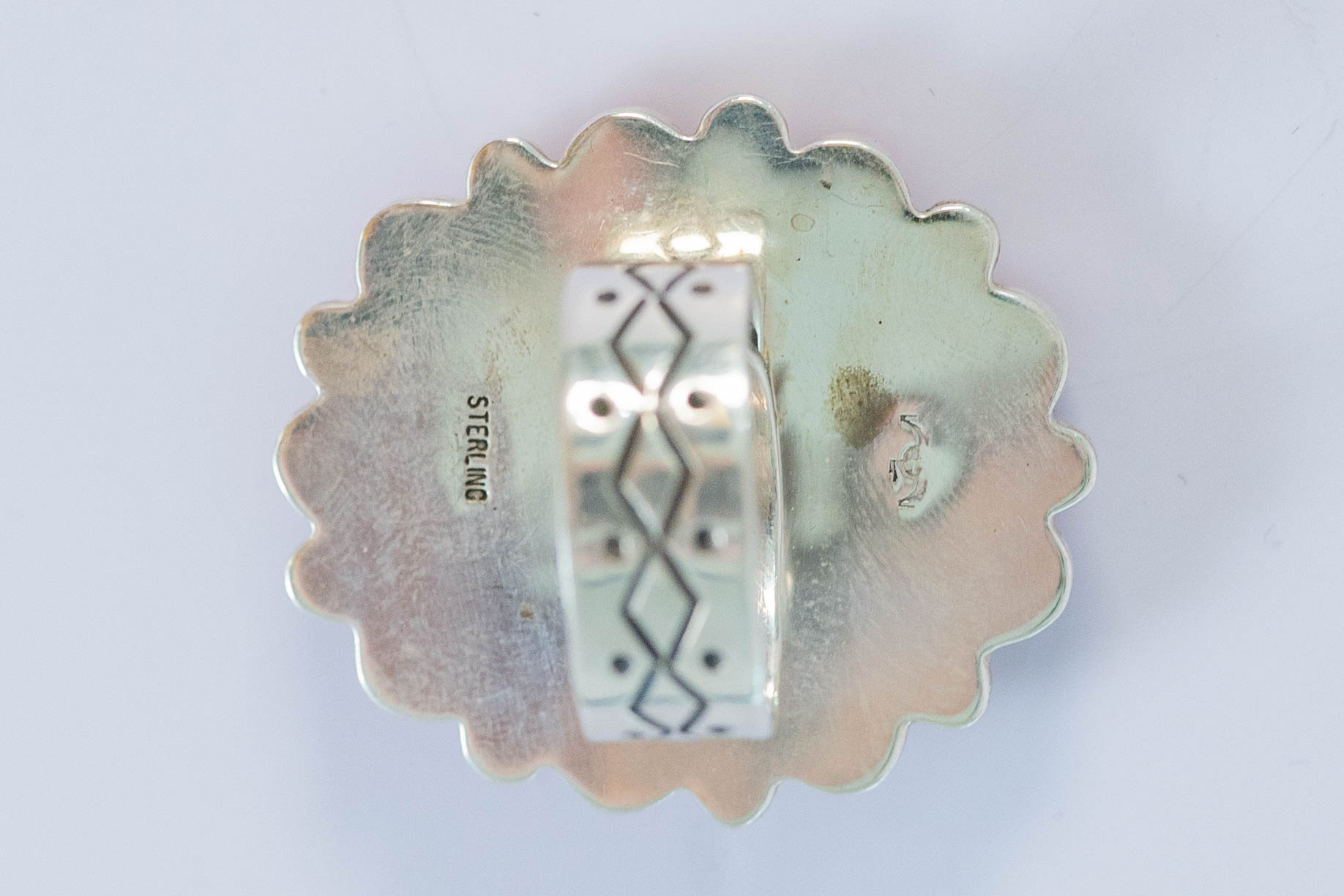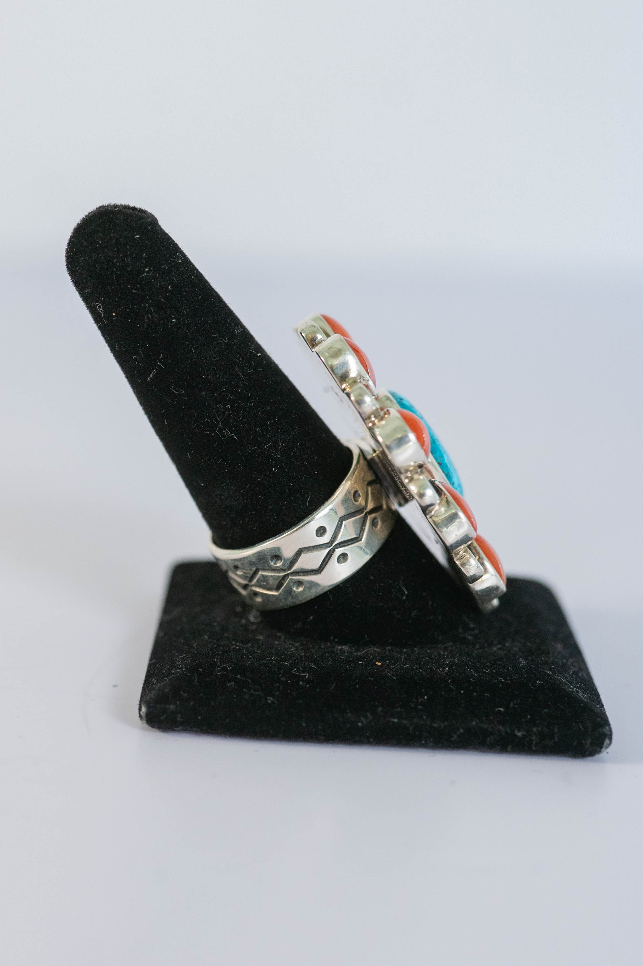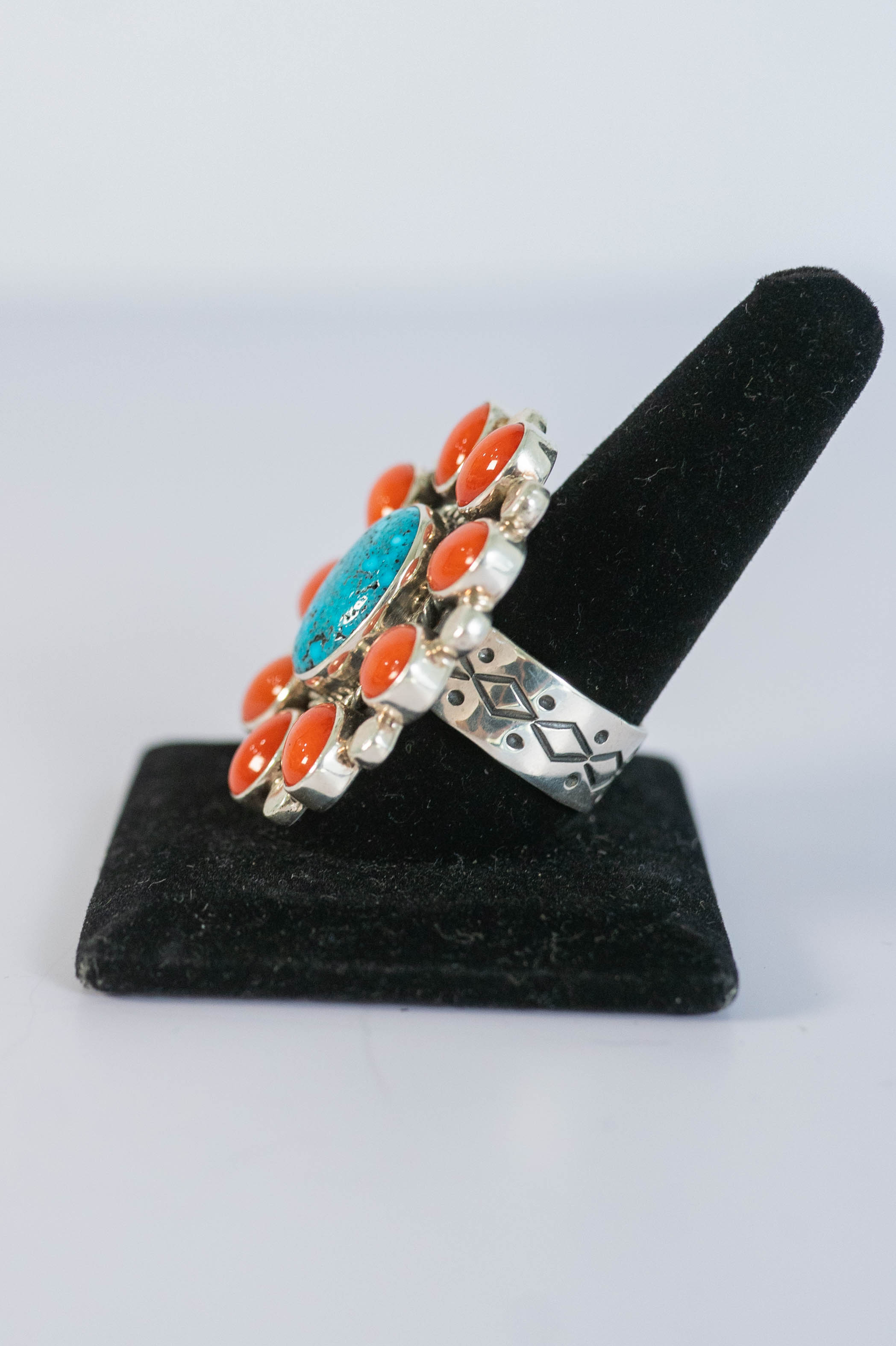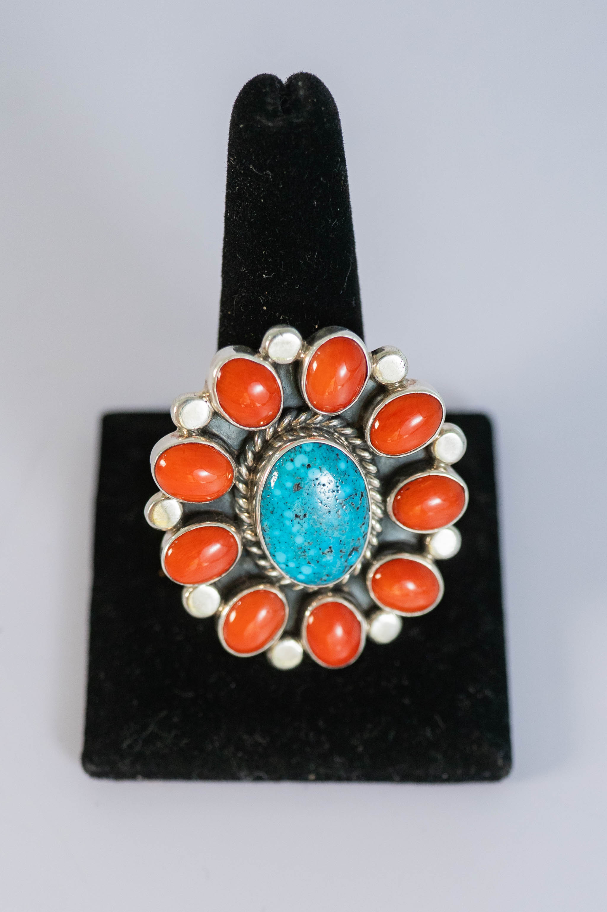 Native American Navajo sterling silver ring featuring (1) AAAAA Spiderweb Turquoise oval center gemstone L 5/8″ x 1/2″ W, surrounded by twisted wire and (9) AAAAA Mediterranean Coral gemstones with sterling silver spacer beads and a hand stamped adjustable comfort band. Size 9 1/4″ adjustable L 1 1/2 ” x 1 3/8″W.