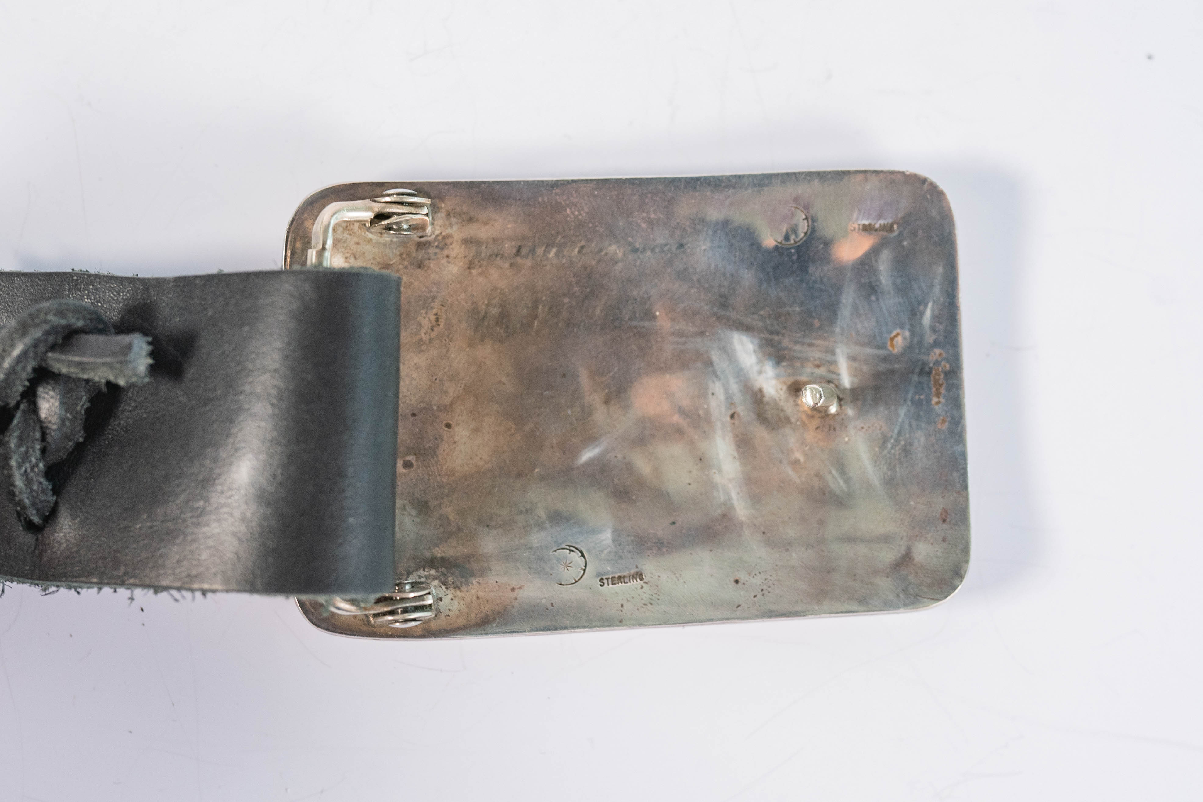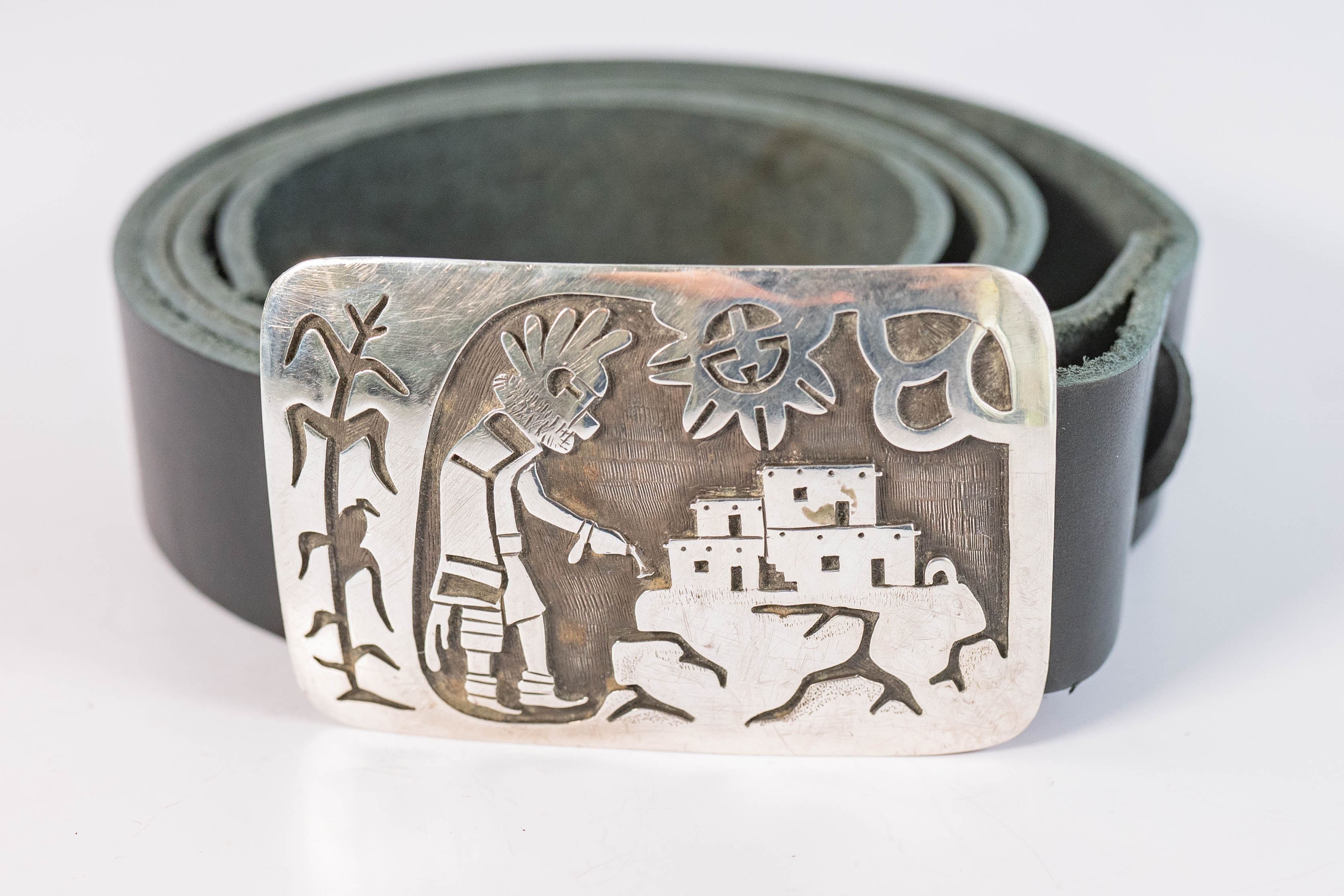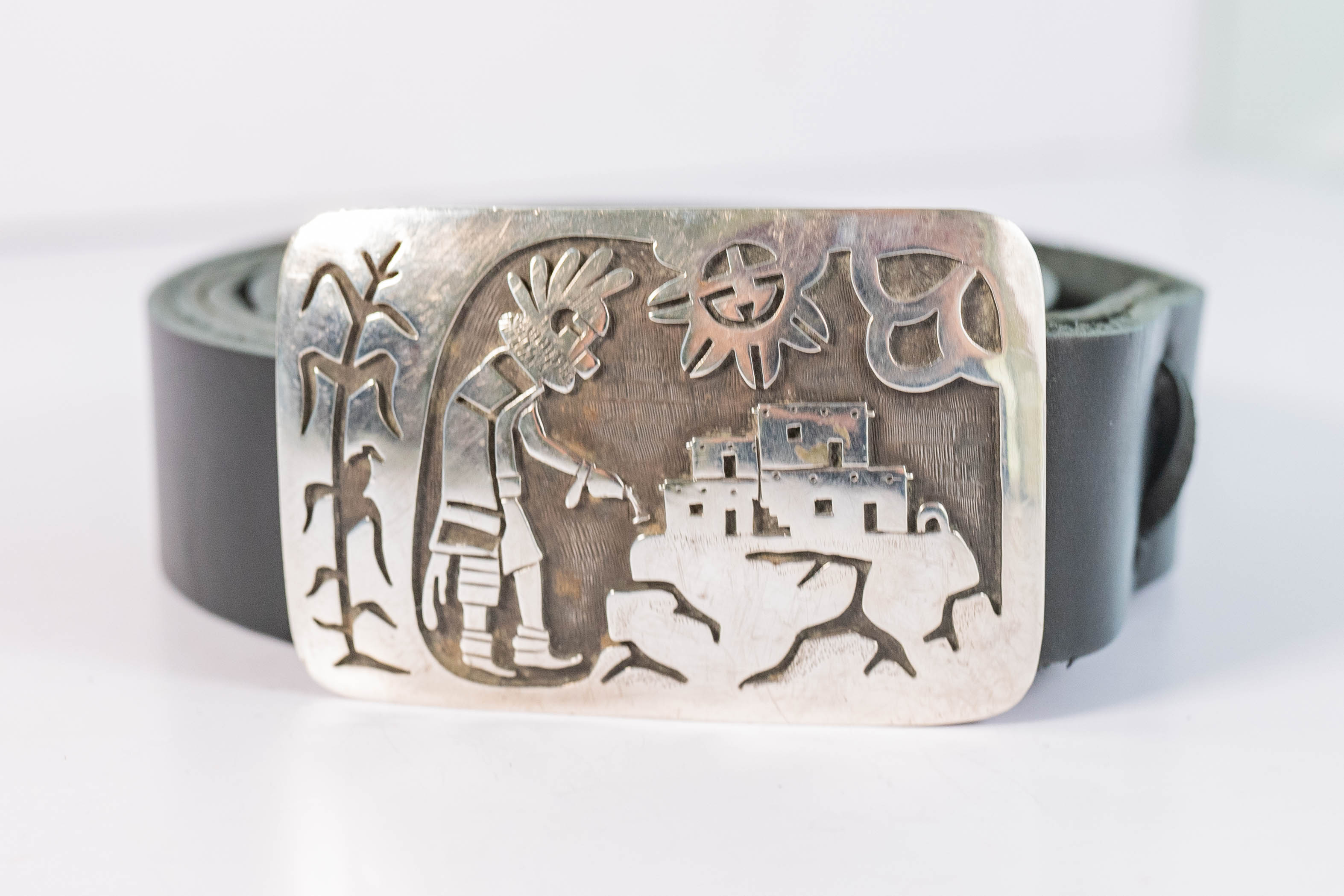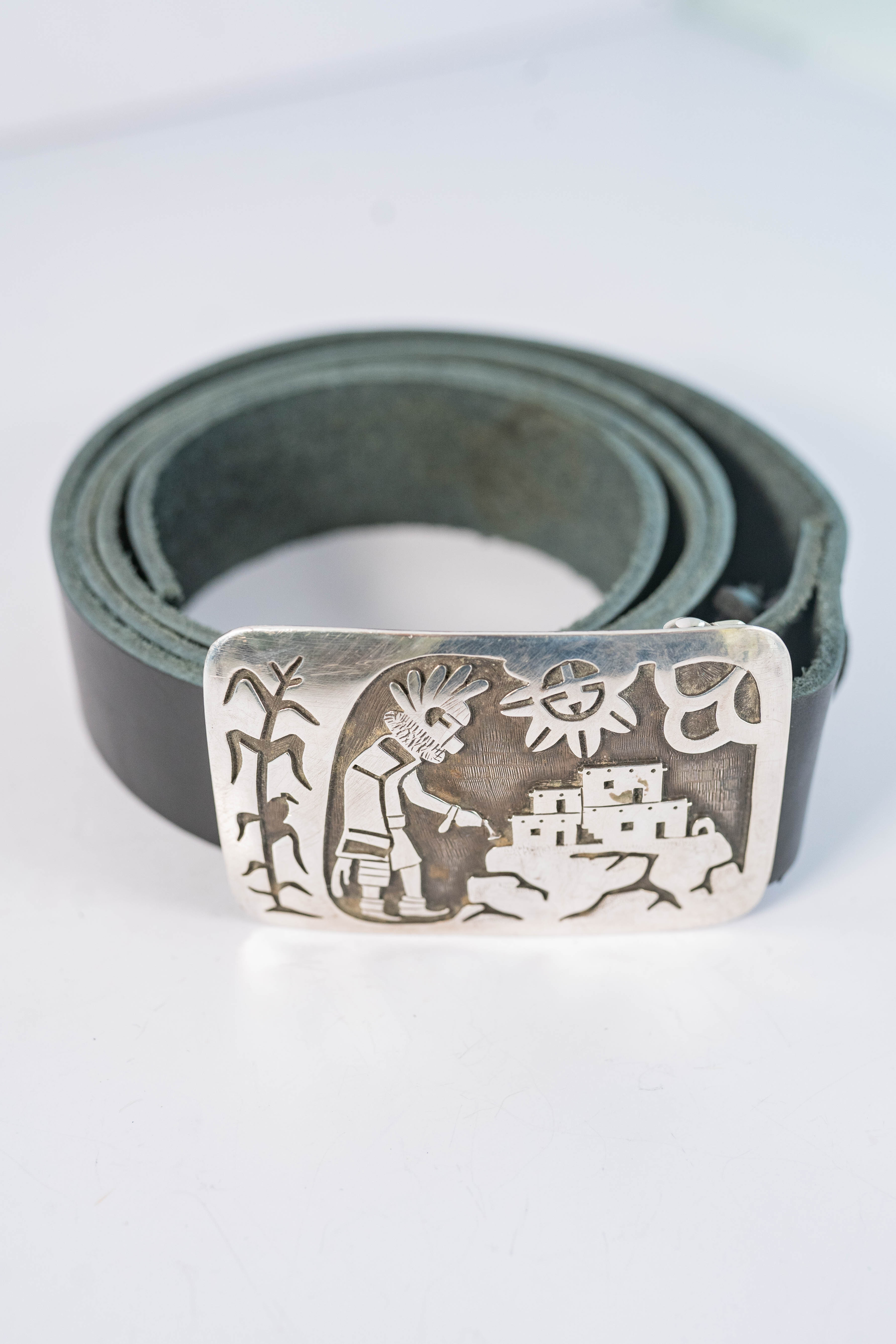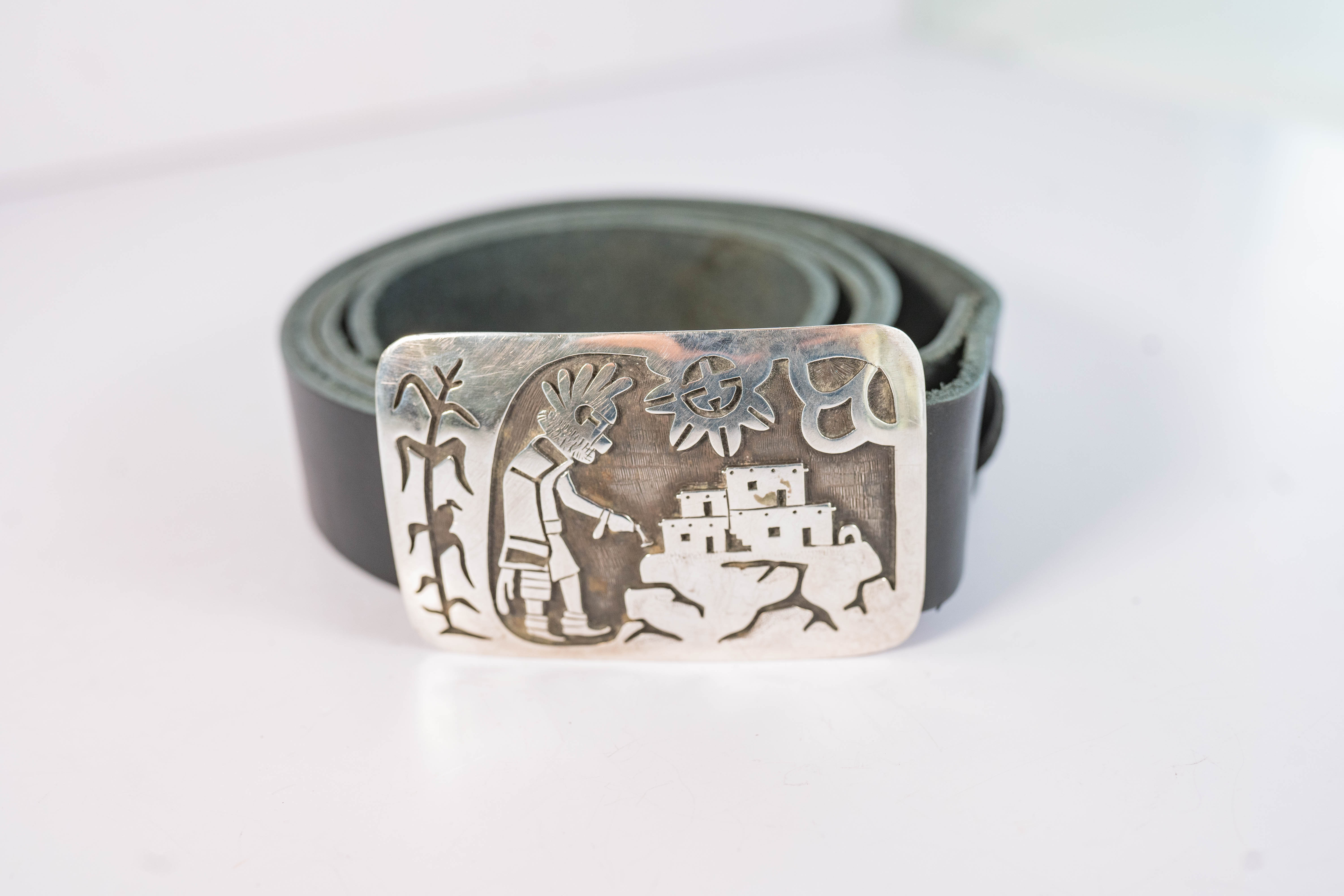Native American Hopi vintage sterling silver belt buckle with an intricately detailed overlay design with a bird sitting on a corn husk stalk, a Kachina Dancer, a Pueblo village, and sun and clouds. The black leather strap is 1 1/4″ wide, 49 inches long, and can be cut to size. The buckle is L 2″ x 3″ W. Signed with a round arrow an star hallmark.